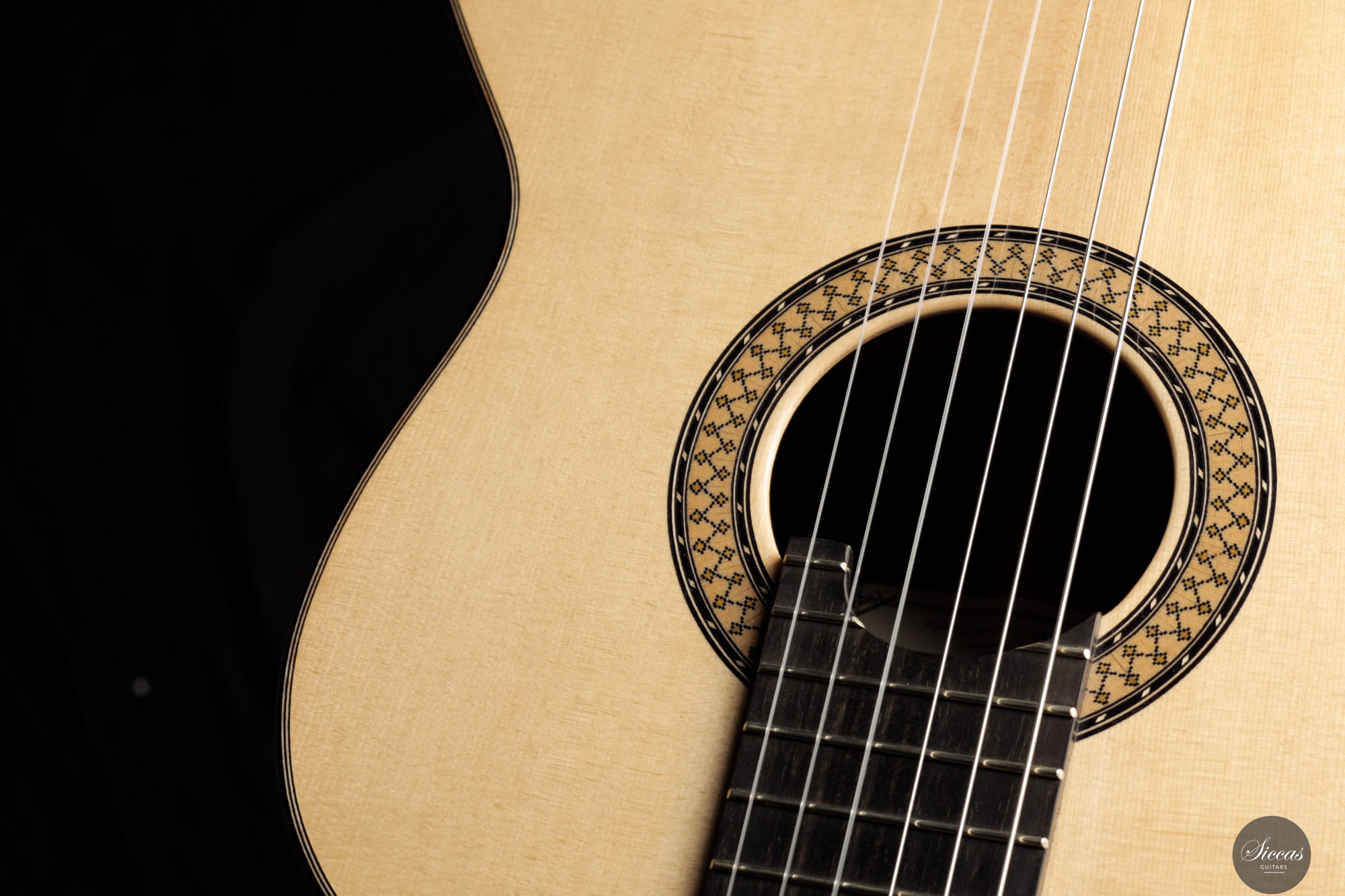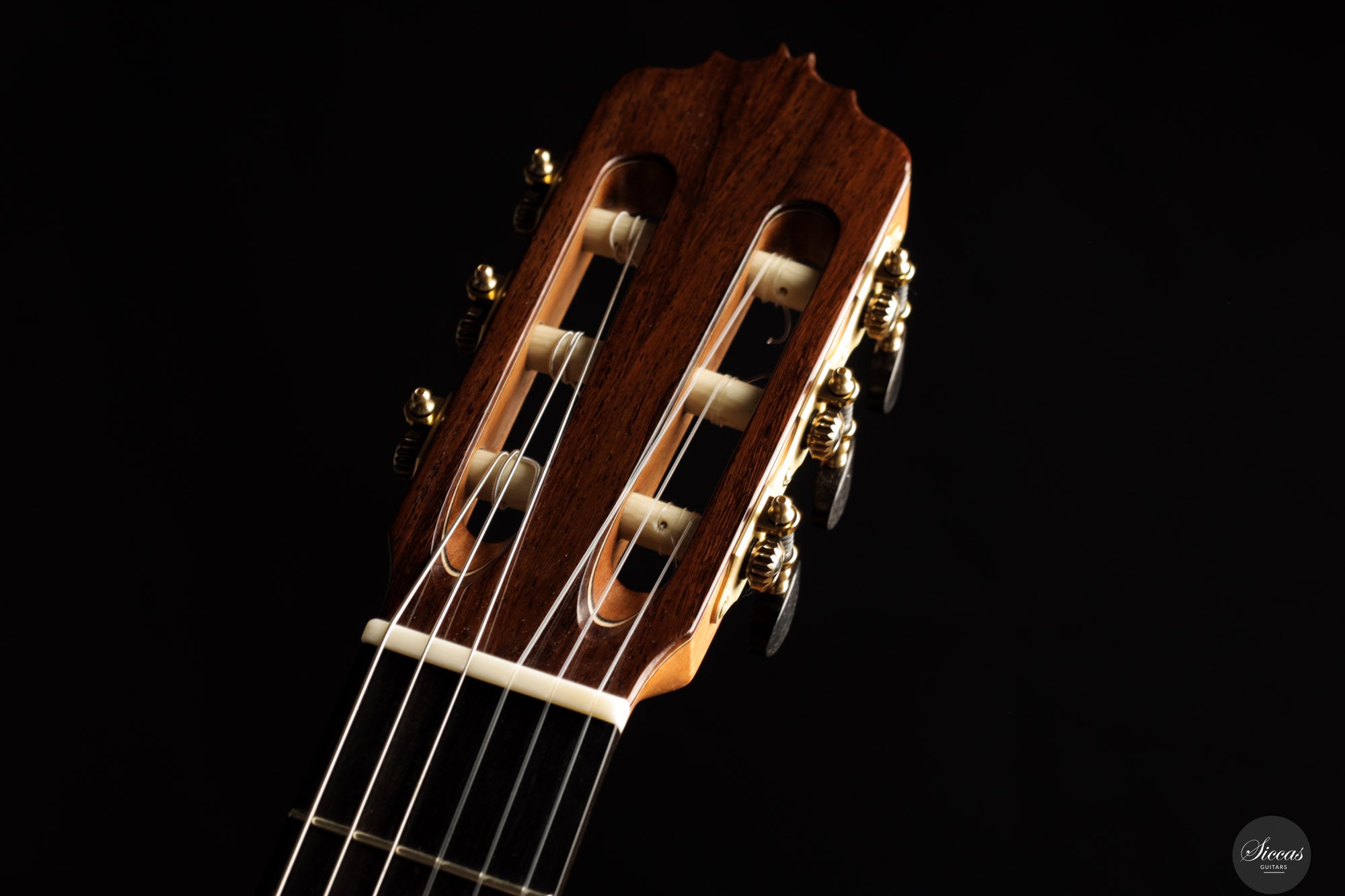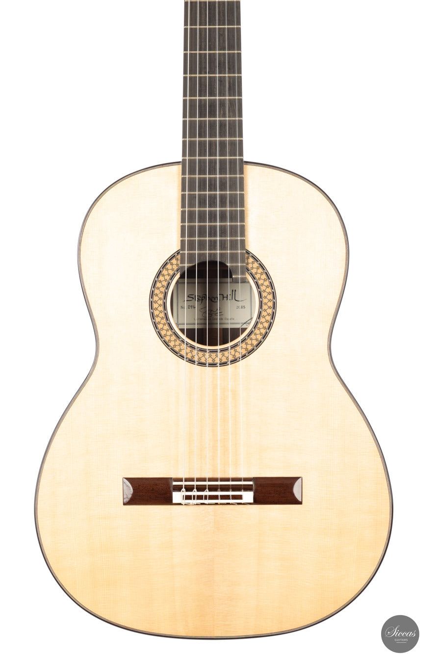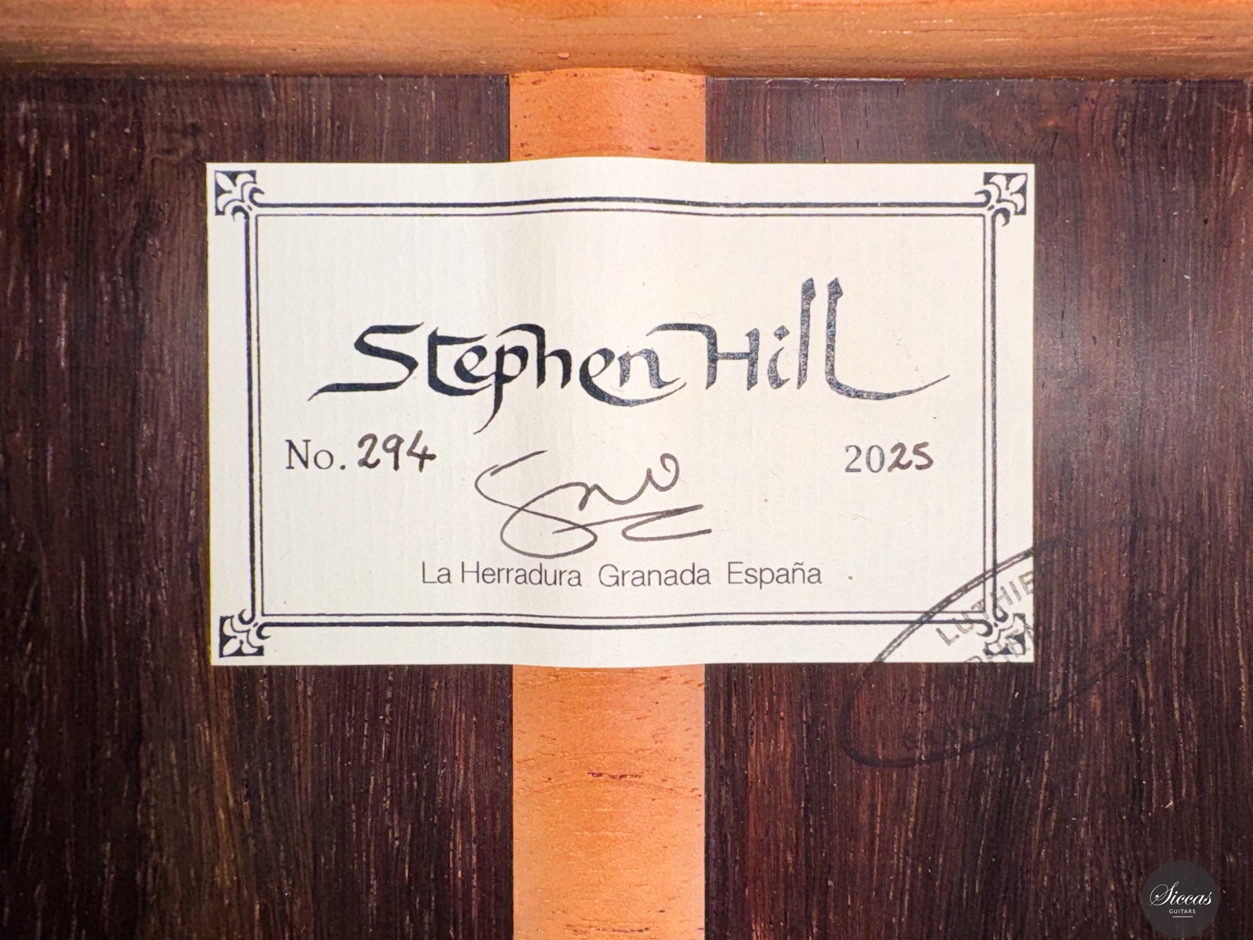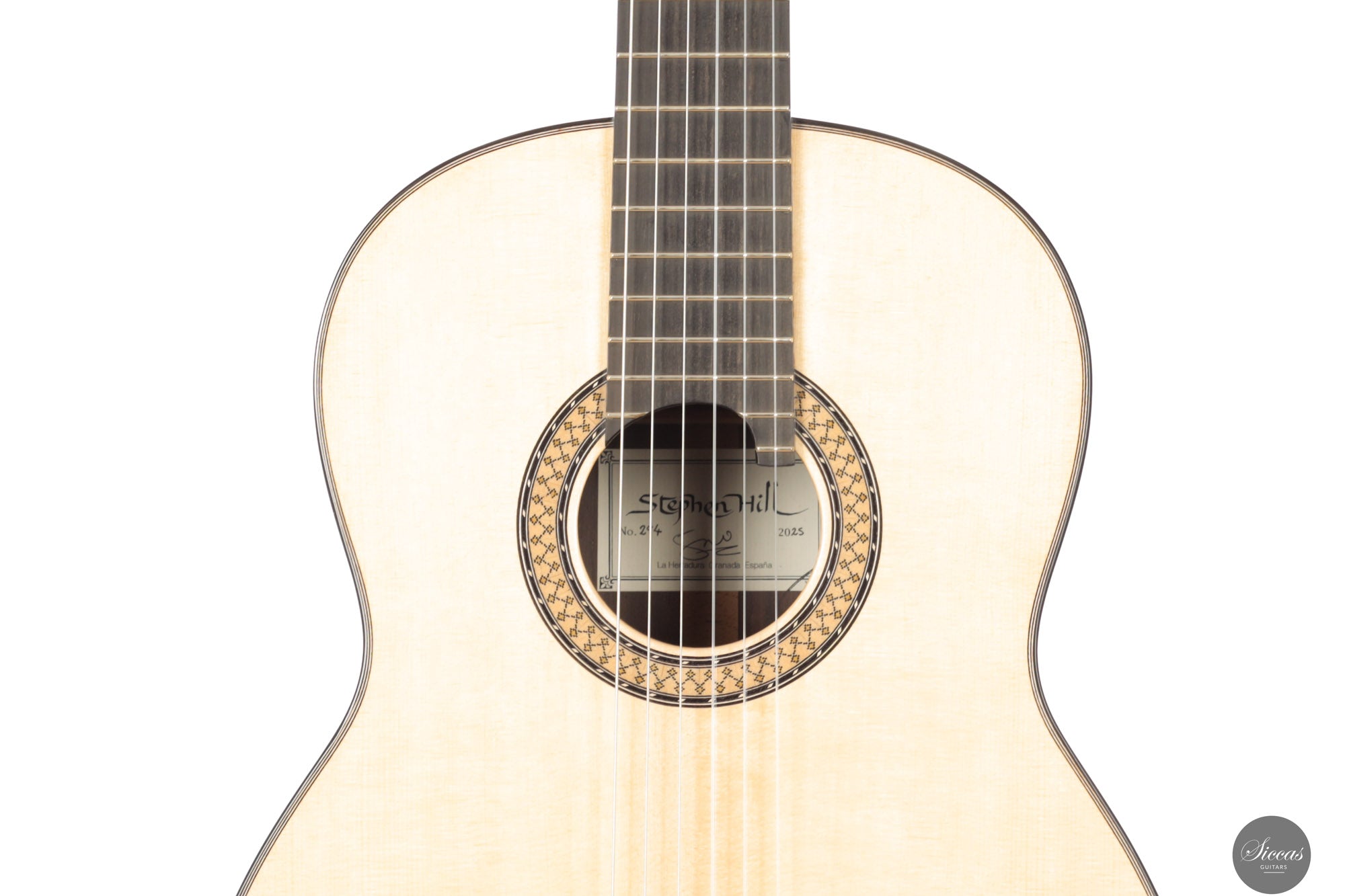 Stephen Hill is a British guitar maker based in La Herradura, near Granada in southern Spain. He began his musical life as a flamenco guitarist and later trained as a luthier under the influence of masters such as Antonio Marín Montero and Manuel Reyes. Over the years, Hill has become one of the most respected contemporary builders of Spanish-style guitars. He combines deep traditional knowledge with an openness to new methods and ideas, and has mentored a number of successful luthiers through his teaching. After decades dedicated to traditional construction, Hill has recently expanded into the world of modern concert guitars, particularly double-top instruments. His double-top models are distinguished by their elegant tonal character, exceptional responsiveness, and a strong underlying Spanish identity. This development demonstrates his ability to balance innovation with a deep respect for traditional guitar-making aesthetics.About the guitar