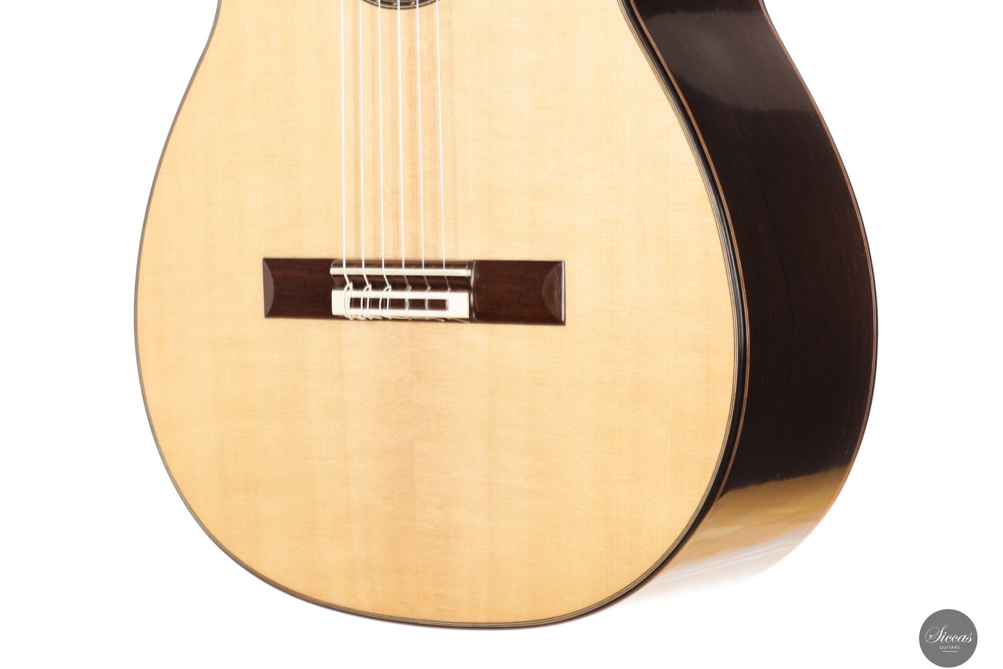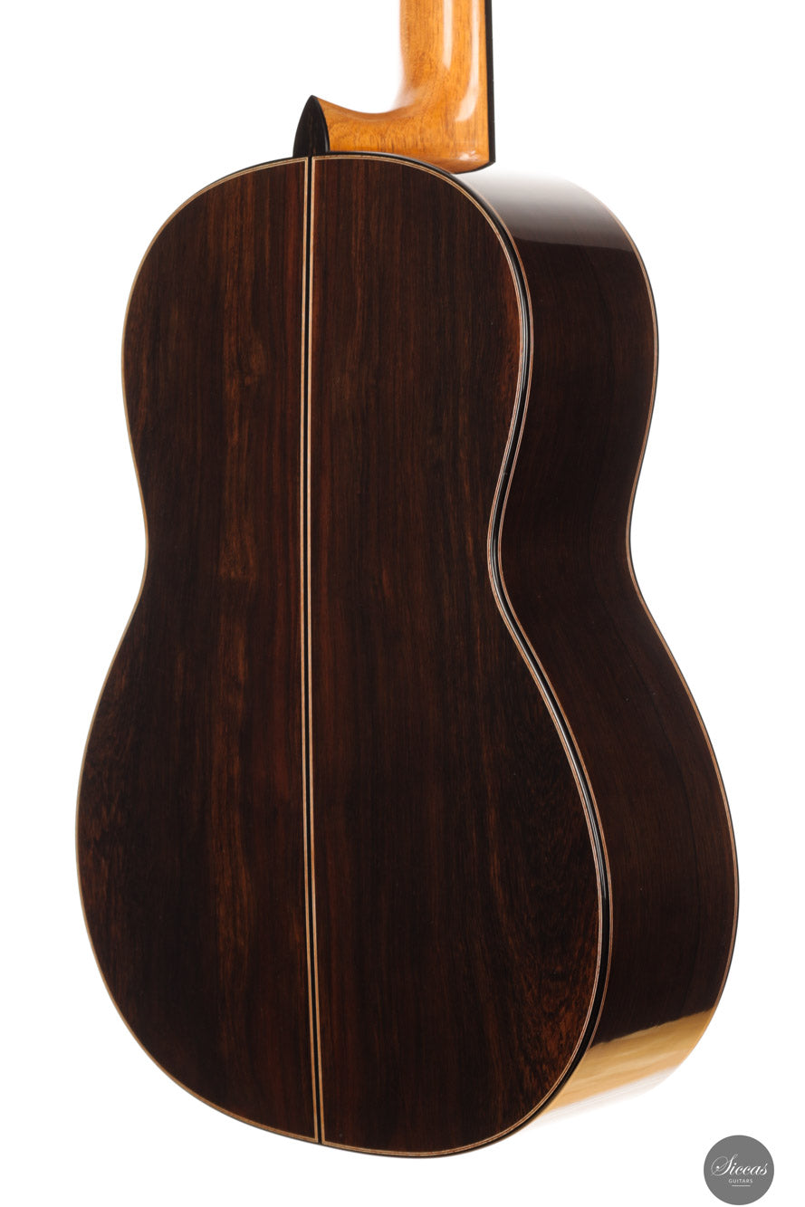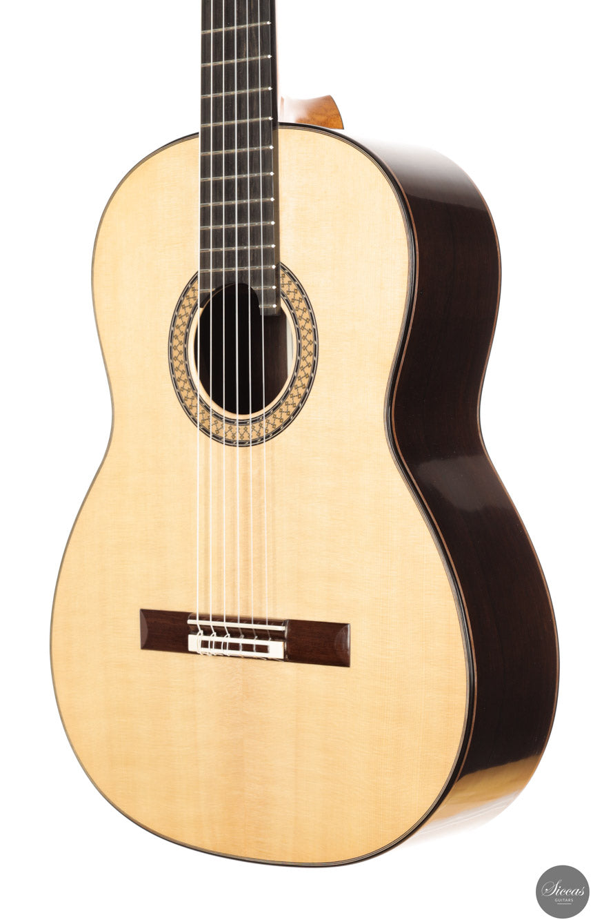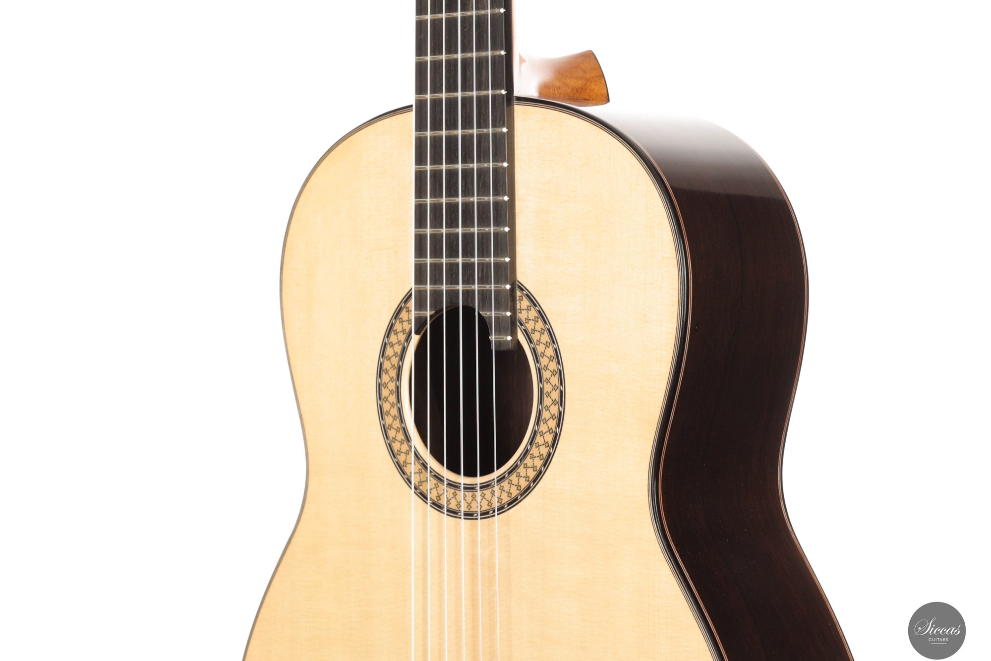 This guitar, No. 294 from 2025, is Stephen Hill’s latest double-top concert model. It features a spruce outer top from Switzerland, seasoned for over 25 years and stored in the Sierra Nevada’s Alpujarras region, laminated over a cedar inner layer with a Nomex core. The bracing is a 5×5 wood lattice system, offering both lightness and structural integrity while preserving tonal subtlety. The back and sides are made from beautifully figured Madagascar rosewood, and the entire guitar is finished with French polish. Tonally, the instrument blends a modern response with a refined Spanish voice. It projects with clarity and power, featuring a slightly nasal core in the midrange that creates a distinctive tonal signature and invites complex color shaping. The trebles are vibrant and responsive, with impressive sustain and excellent separation. Players will notice the guitar’s remarkable playability and immediacy, qualities that allow for nuanced dynamics and articulation, especially in fast passages. An elegant, warm, and expressive instrument that offers the best of both worlds: modern power and traditional beauty.Regular care extends the life of the instrument