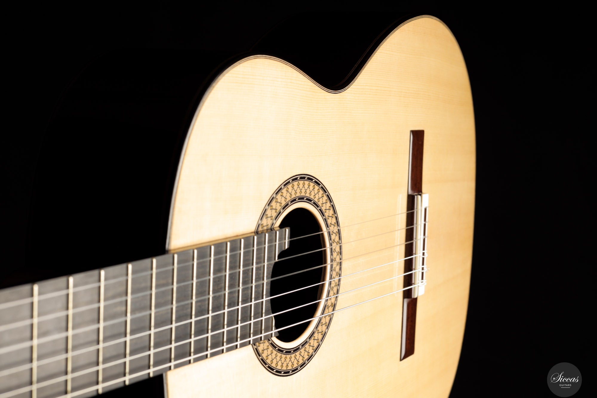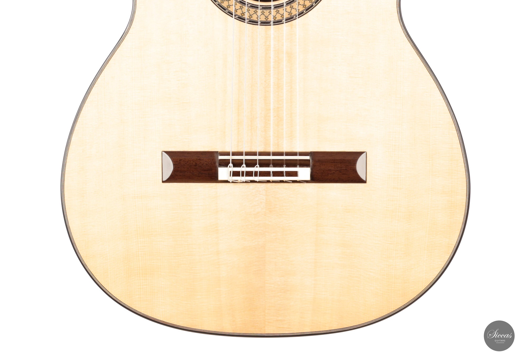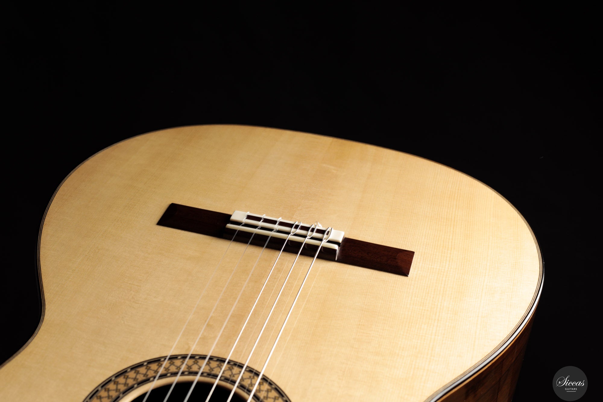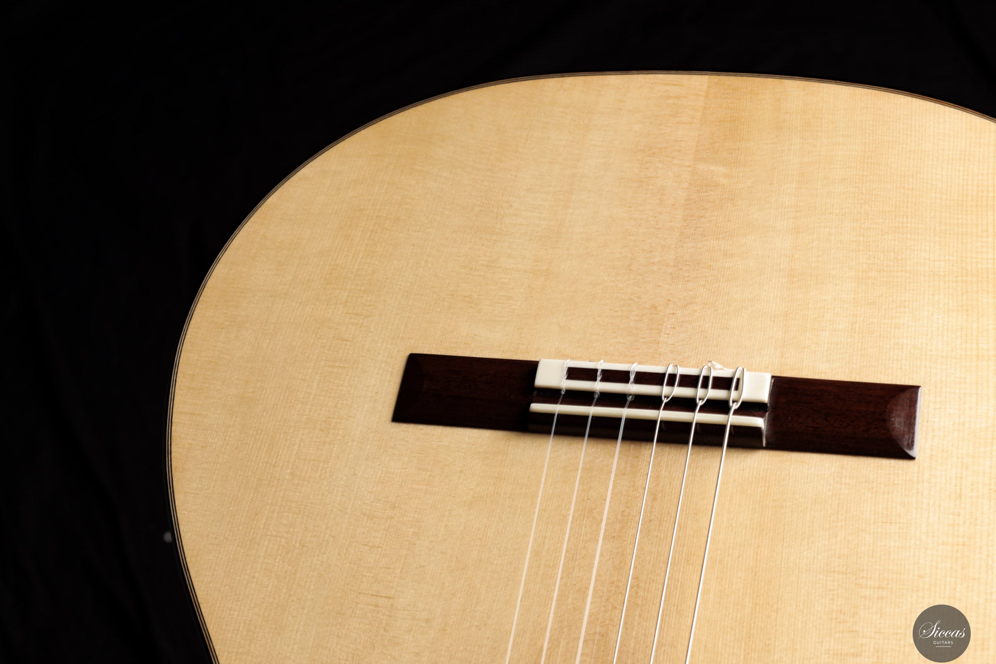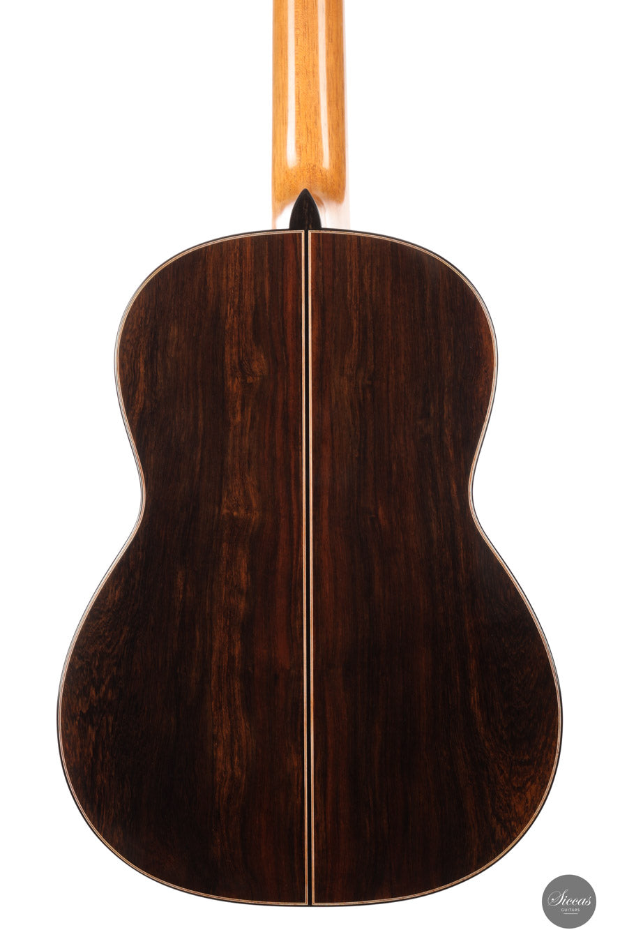 This guitar, No. 294 from 2025, is Stephen Hill’s latest double-top concert model. It features a spruce outer top from Switzerland, seasoned for over 25 years and stored in the Sierra Nevada’s Alpujarras region, laminated over a cedar inner layer with a Nomex core. The bracing is a 5×5 wood lattice system, offering both lightness and structural integrity while preserving tonal subtlety. The back and sides are made from beautifully figured Madagascar rosewood, and the entire guitar is finished with French polish. Tonally, the instrument blends a modern response with a refined Spanish voice. It projects with clarity and power, featuring a slightly nasal core in the midrange that creates a distinctive tonal signature and invites complex color shaping. The trebles are vibrant and responsive, with impressive sustain and excellent separation. Players will notice the guitar’s remarkable playability and immediacy, qualities that allow for nuanced dynamics and articulation, especially in fast passages. An elegant, warm, and expressive instrument that offers the best of both worlds: modern power and traditional beauty.Regular care extends the life of the instrument