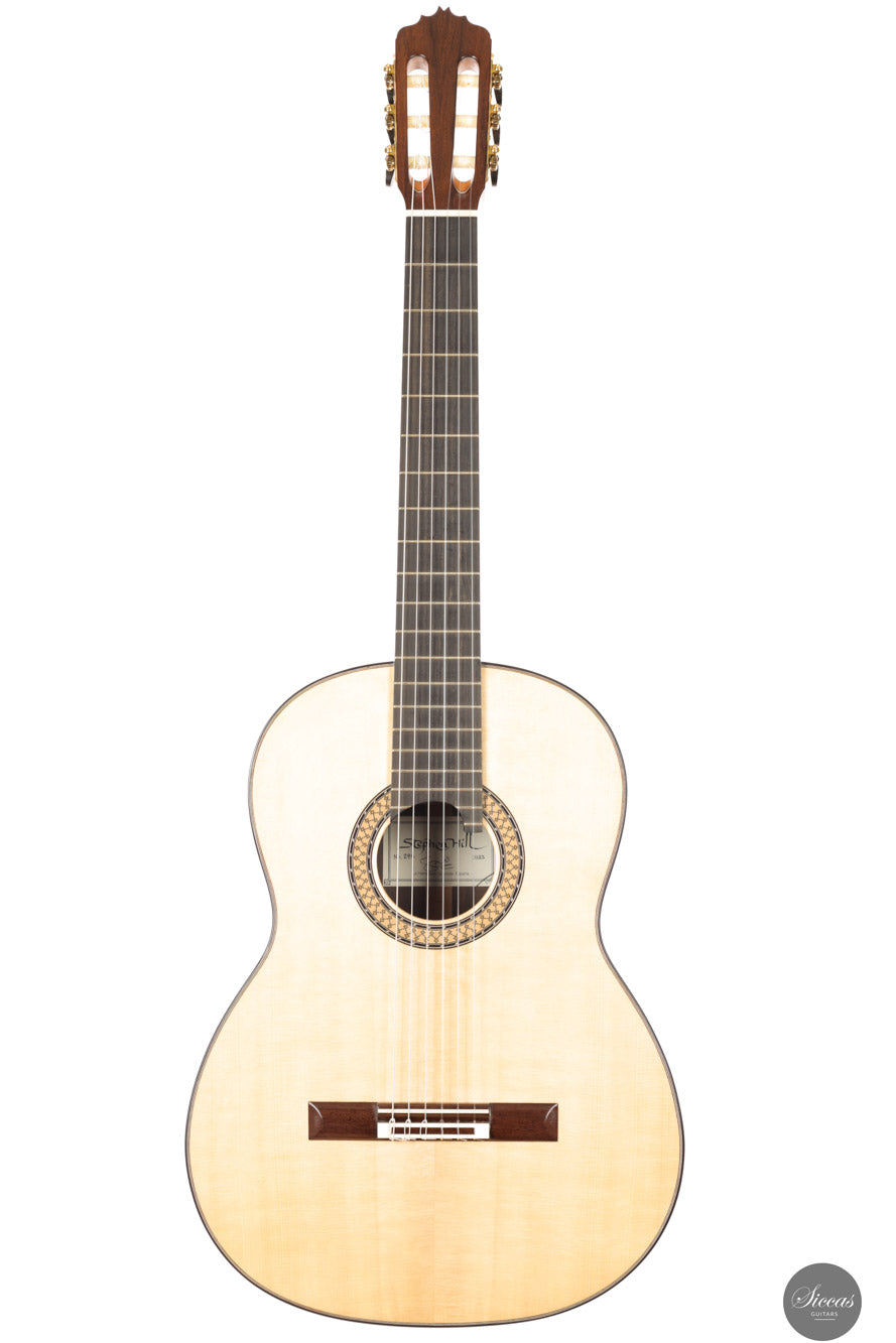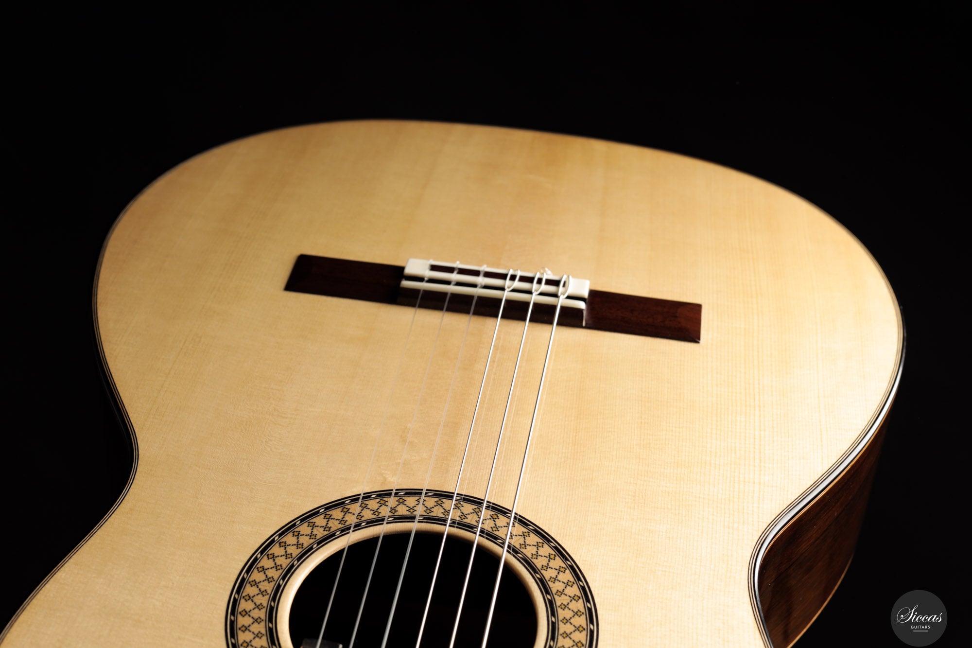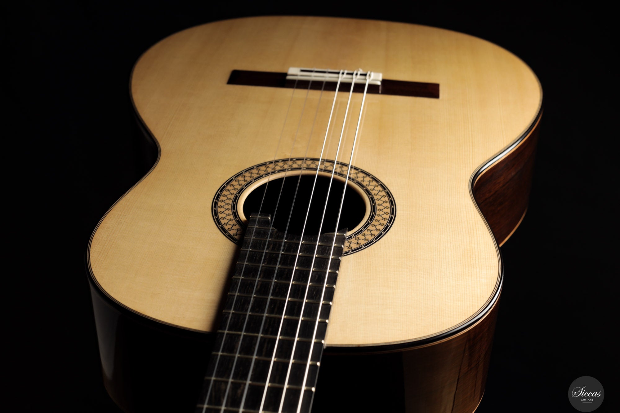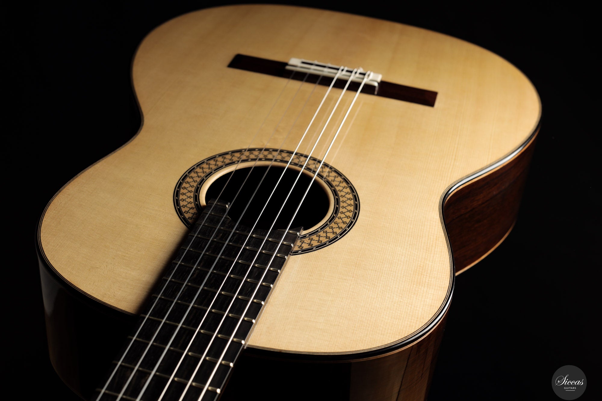 This guitar, No. 294 from 2025, is Stephen Hill’s latest double-top concert model. It features a spruce outer top from Switzerland, seasoned for over 25 years and stored in the Sierra Nevada’s Alpujarras region, laminated over a cedar inner layer with a Nomex core. The bracing is a 5×5 wood lattice system, offering both lightness and structural integrity while preserving tonal subtlety. The back and sides are made from beautifully figured Madagascar rosewood, and the entire guitar is finished with French polish. Tonally, the instrument blends a modern response with a refined Spanish voice. It projects with clarity and power, featuring a slightly nasal core in the midrange that creates a distinctive tonal signature and invites complex color shaping. The trebles are vibrant and responsive, with impressive sustain and excellent separation. Players will notice the guitar’s remarkable playability and immediacy, qualities that allow for nuanced dynamics and articulation, especially in fast passages. An elegant, warm, and expressive instrument that offers the best of both worlds: modern power and traditional beauty.Regular care extends the life of the instrument
