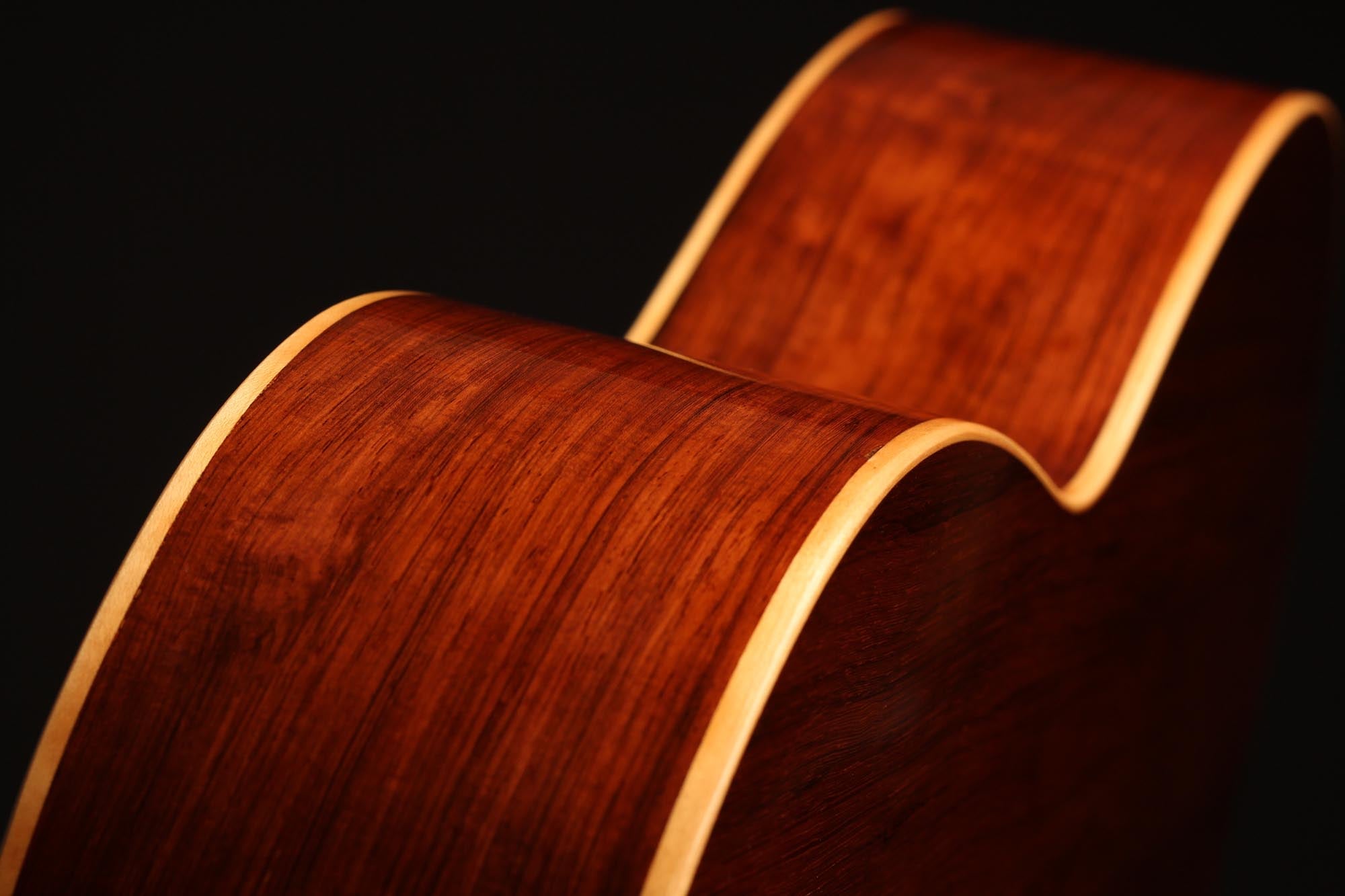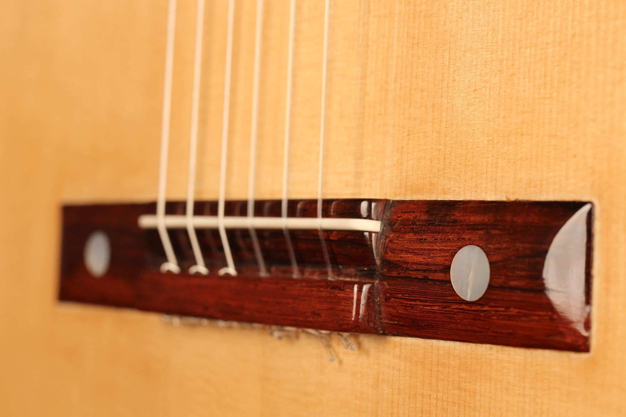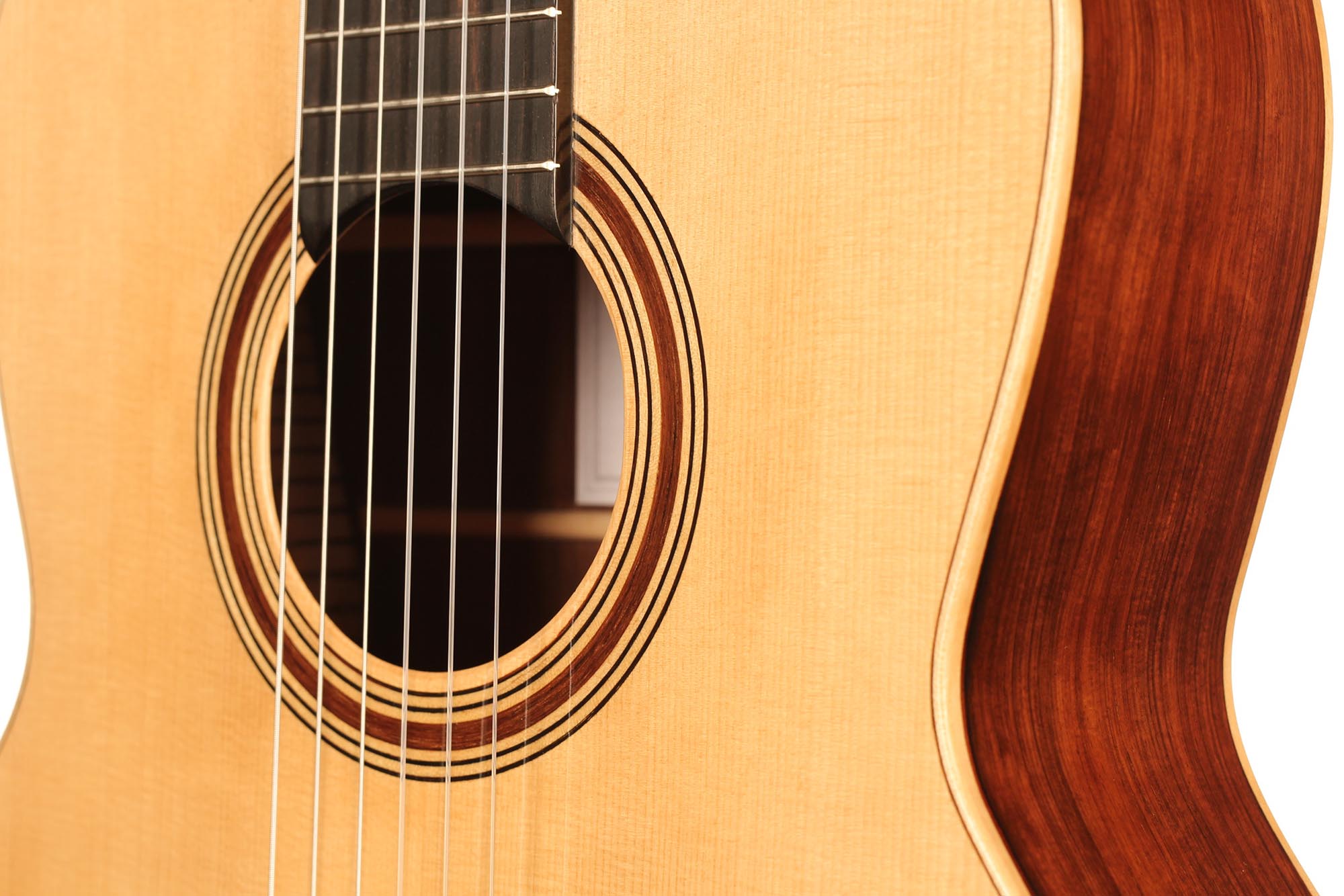 This beautiful guitar has a very traditional Spanish appearance, and one must say that the very mature tone also reminds of the warm singing Spanish guitars of the late nineteenth / early twentieth century. The round sweet trebles are very spontaneous and go very well along with the sustain-full traditional basses. A thinly worked neck as well as a 50 mm wide nut enhance the playability of this guitar and make it both a very comfortable and generously sounding instrument.