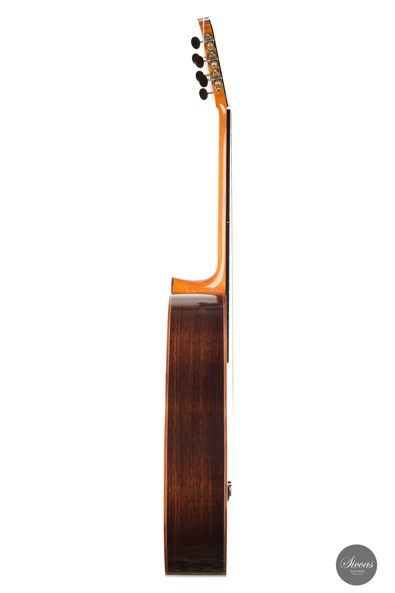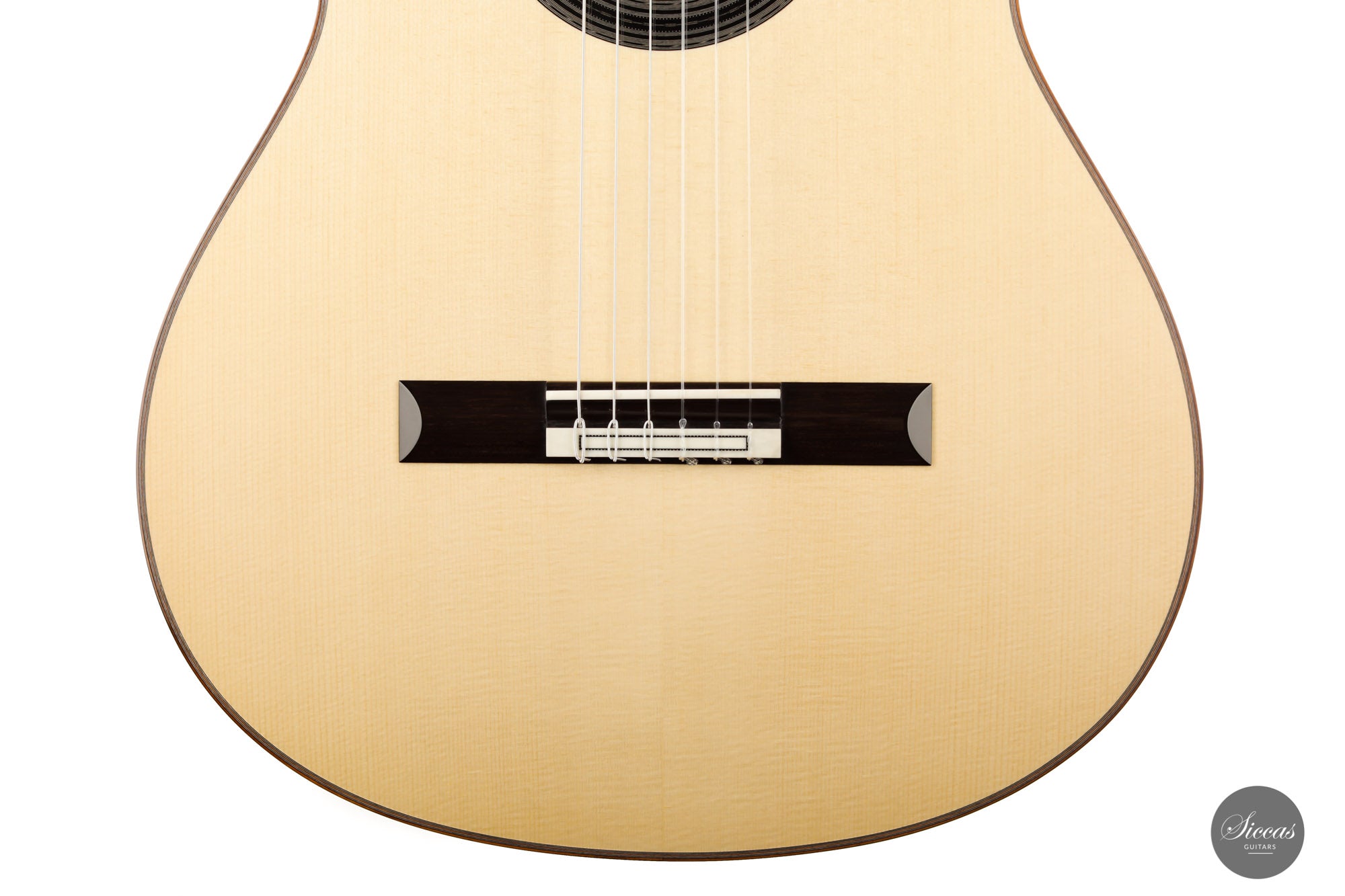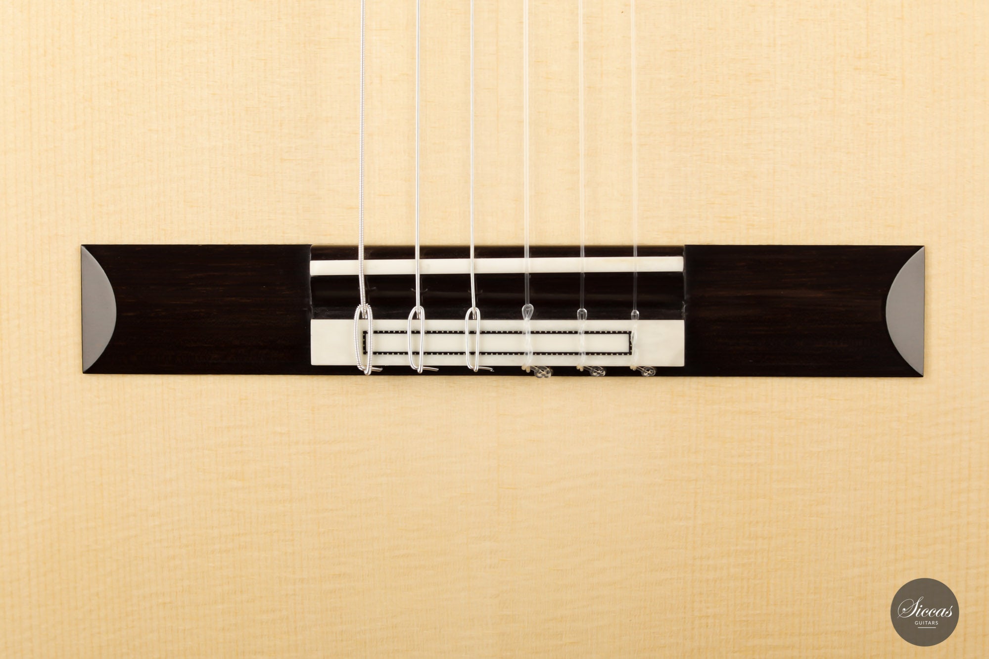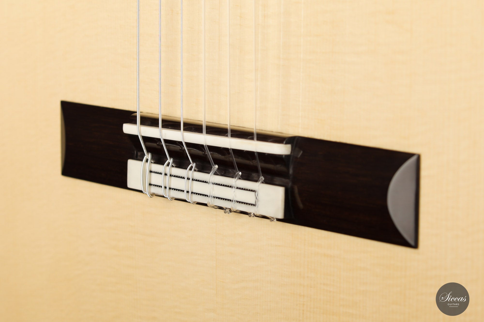 This guitar is a highlight and comes directly from Sylvain's Alpine workshop. The craftsmanship is amazing, and the sound is just as impressive. This 2021 model has velvety deep Basses with astounding smoothness. Bell-like trebles project crystal clear into the room and develop an inspiring series of overtones. In addition, the playing feel is exactly what you would expect from a premium classical guitar. Tone production is immediate, playing comfort for the left hand is at the highest level, and the tonal palette is almost limitless. In short, this instrument is a magnificent and impressive example of the famous French traditional guitar making.