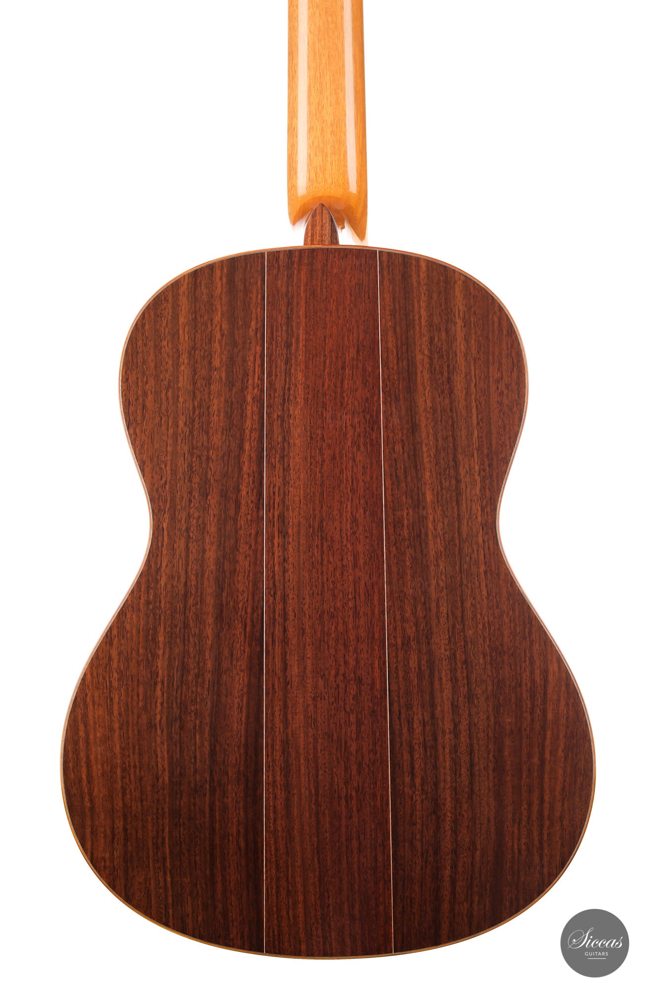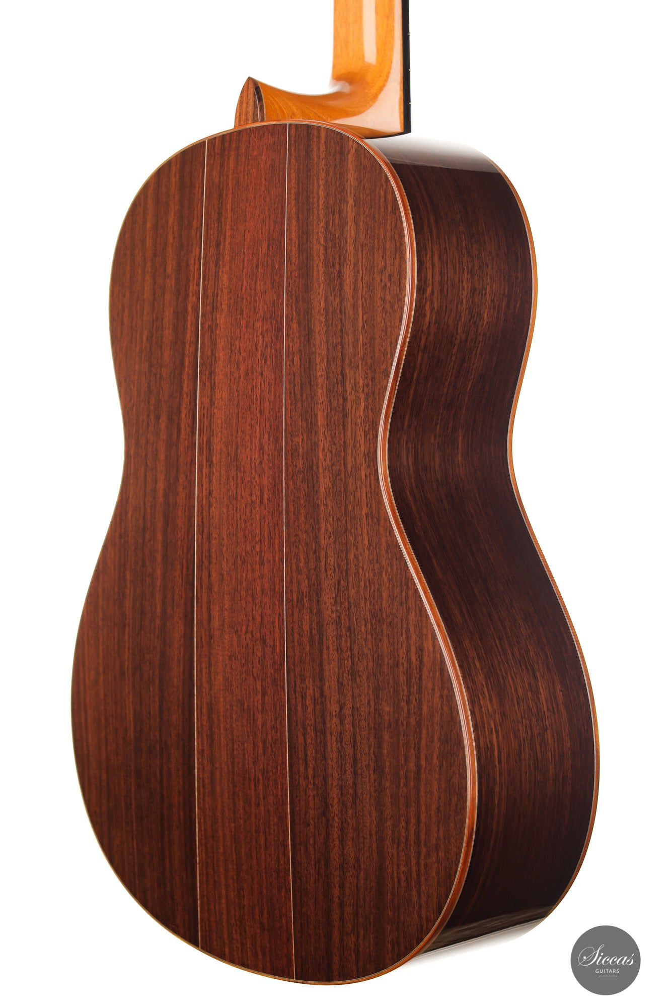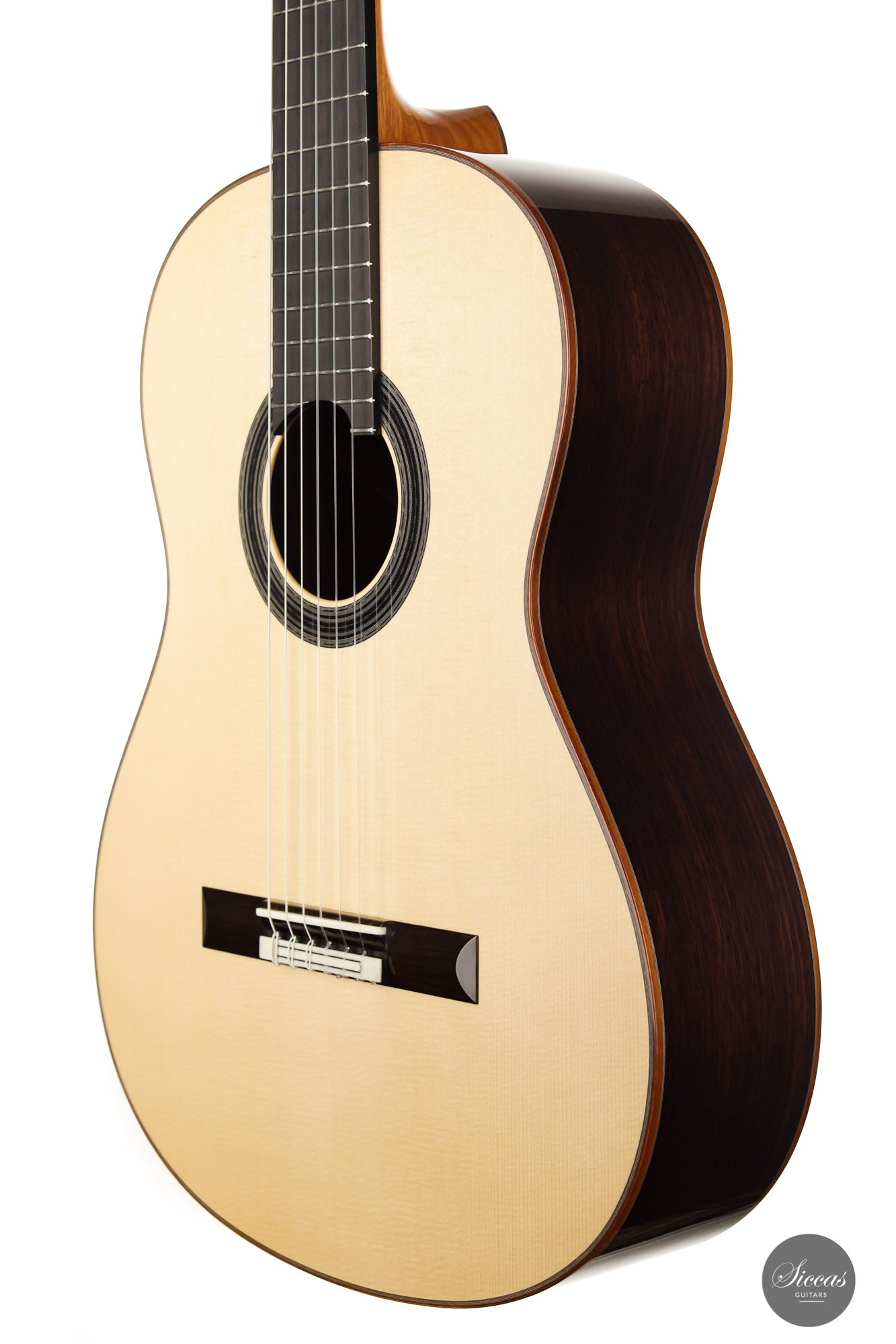 This guitar is a highlight and comes directly from Sylvain's Alpine workshop. The craftsmanship is amazing, and the sound is just as impressive. This 2021 model has velvety deep Basses with astounding smoothness. Bell-like trebles project crystal clear into the room and develop an inspiring series of overtones. In addition, the playing feel is exactly what you would expect from a premium classical guitar. Tone production is immediate, playing comfort for the left hand is at the highest level, and the tonal palette is almost limitless. In short, this instrument is a magnificent and impressive example of the famous French traditional guitar making.