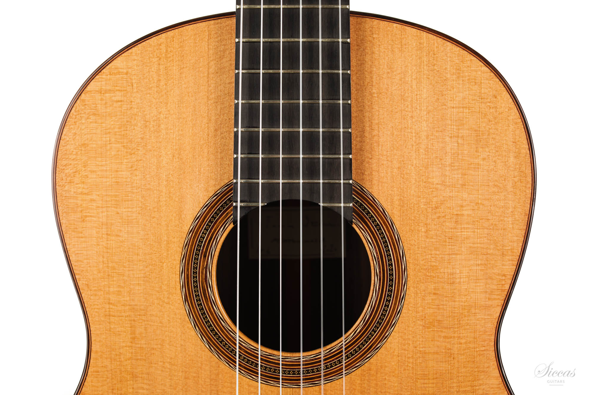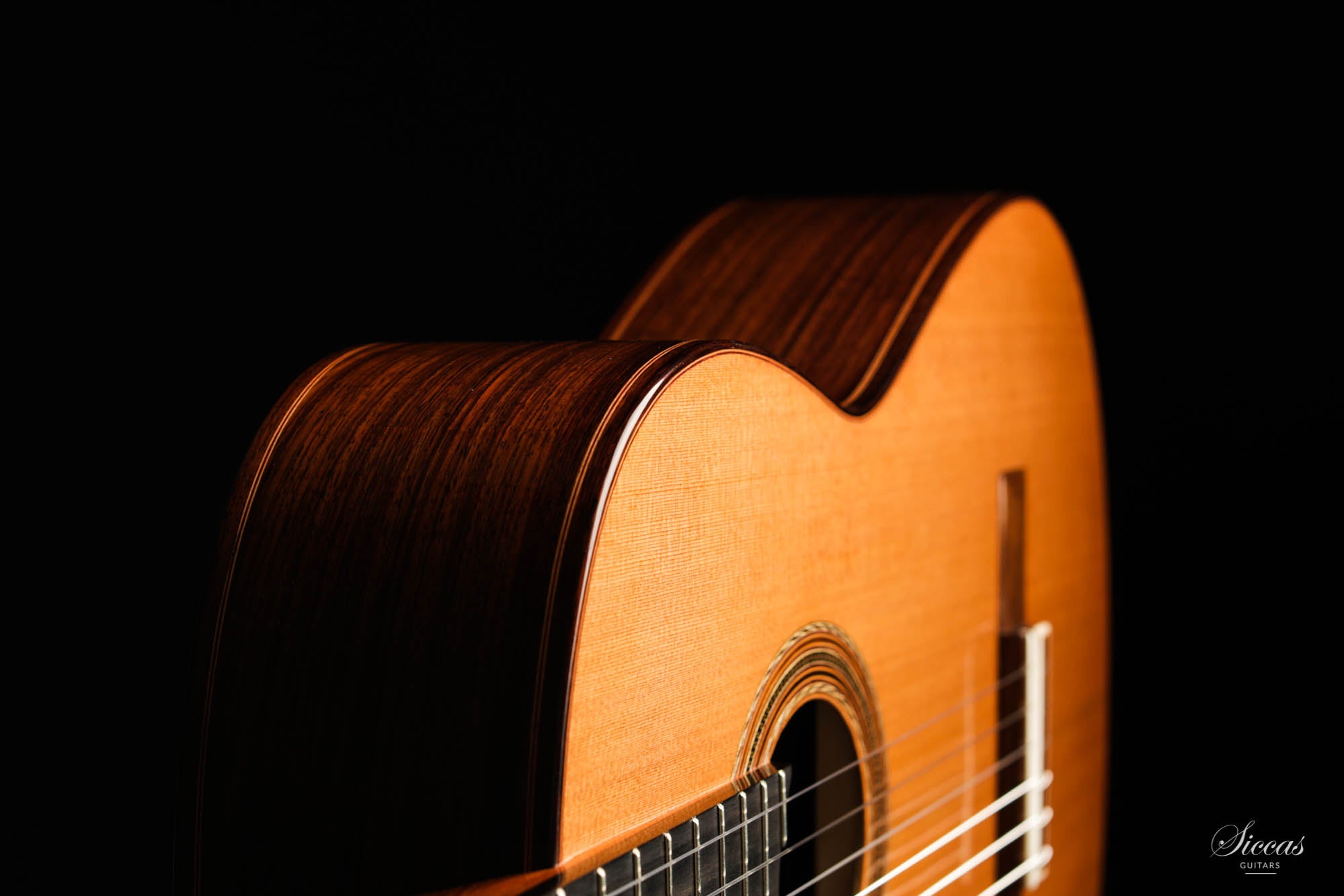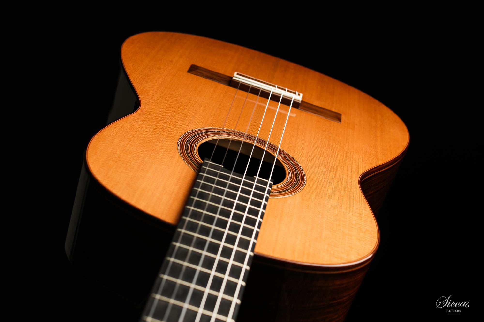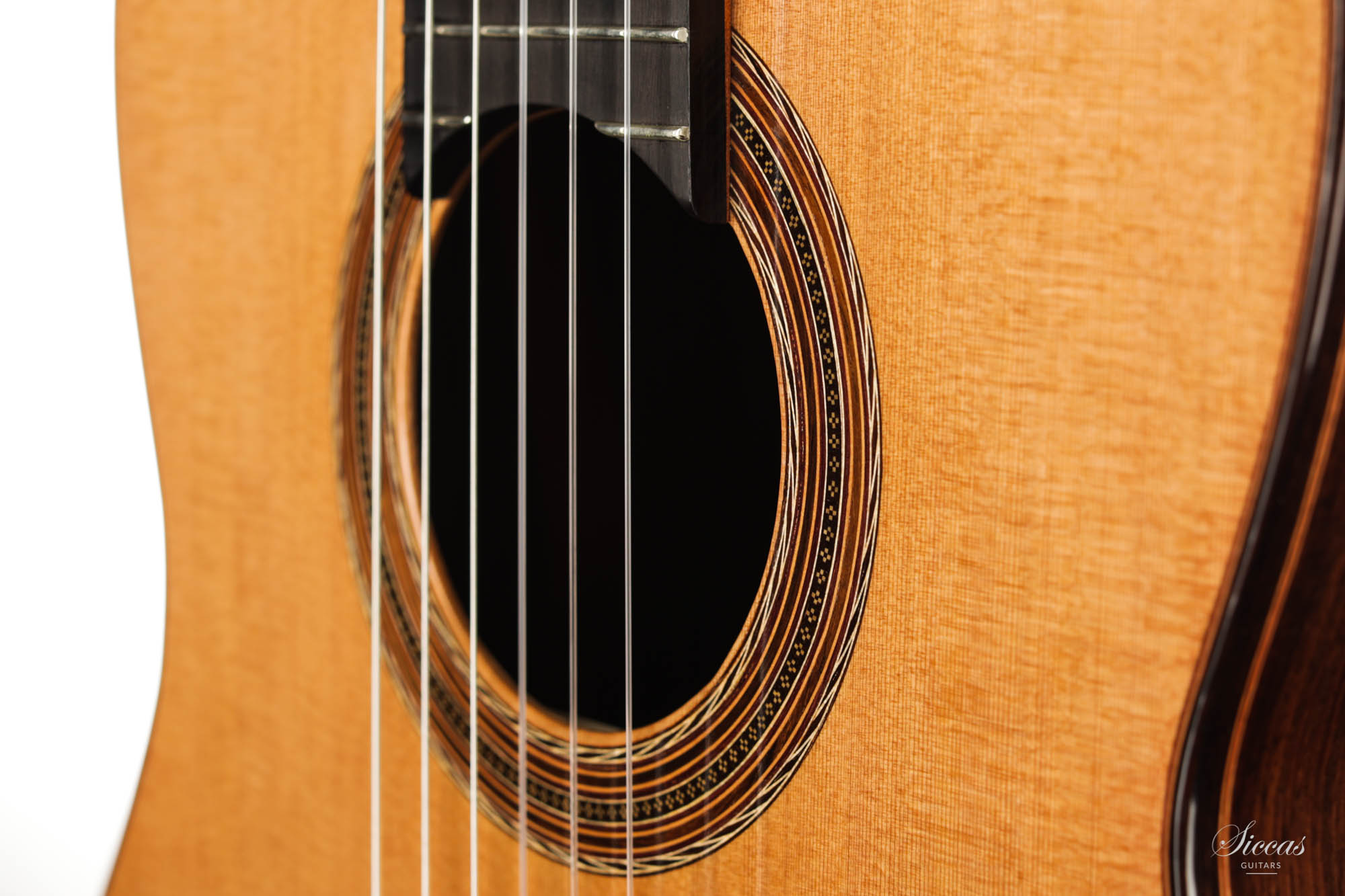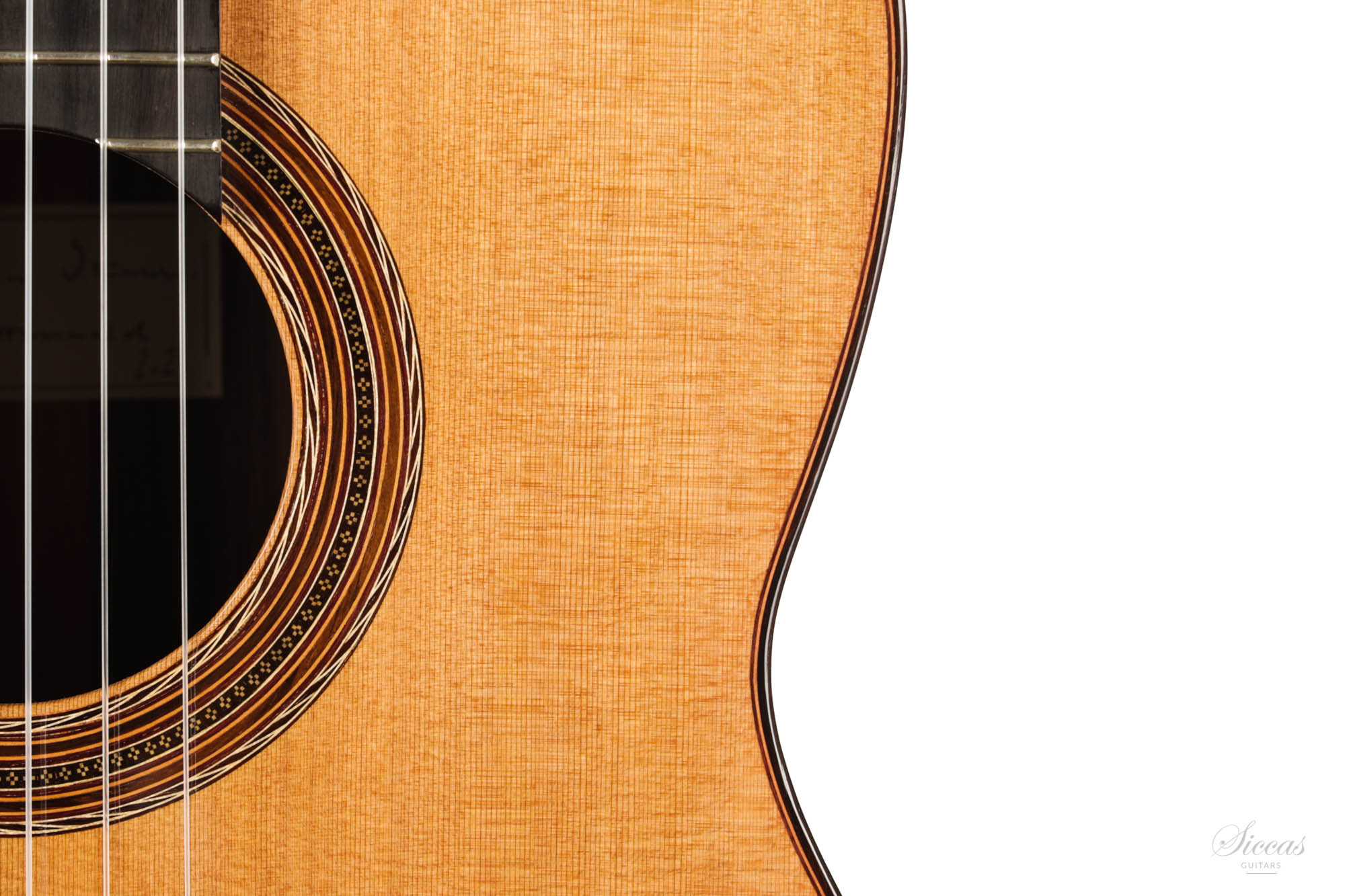 Bei ihrem Modell handelt es sich um eine Klassikgitarre, die durch die Erfahrungen mit verschiedenen Gitarrenbauern und das Studieren verschiedenster Instrumente entstand. Es handelt sich um eine 7-Fächer beleistete Gitarre mit Fichtendecke (Zederndecke) und einer durchgehenden Deckenwölbung, die der dünn ausgearbeiteten Decke die nötige Steifigkeit verleiht und optisch in Einklang mit dem erhöhten Griffbrett steht. Dieses erleichtert das Spielen in den hohen Lagen und sorgt für eine einfache Bespielbarkeit des Instruments. Boden und Zargen bestehen aus Ostindischem Palisander und der Hals aus Cedro.