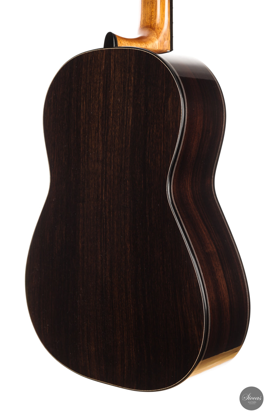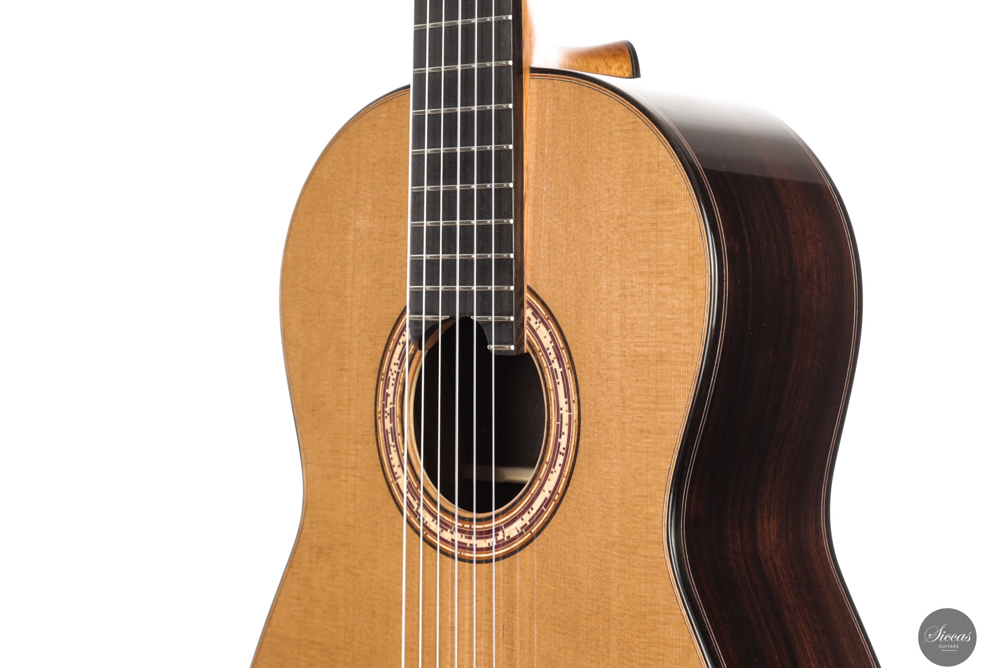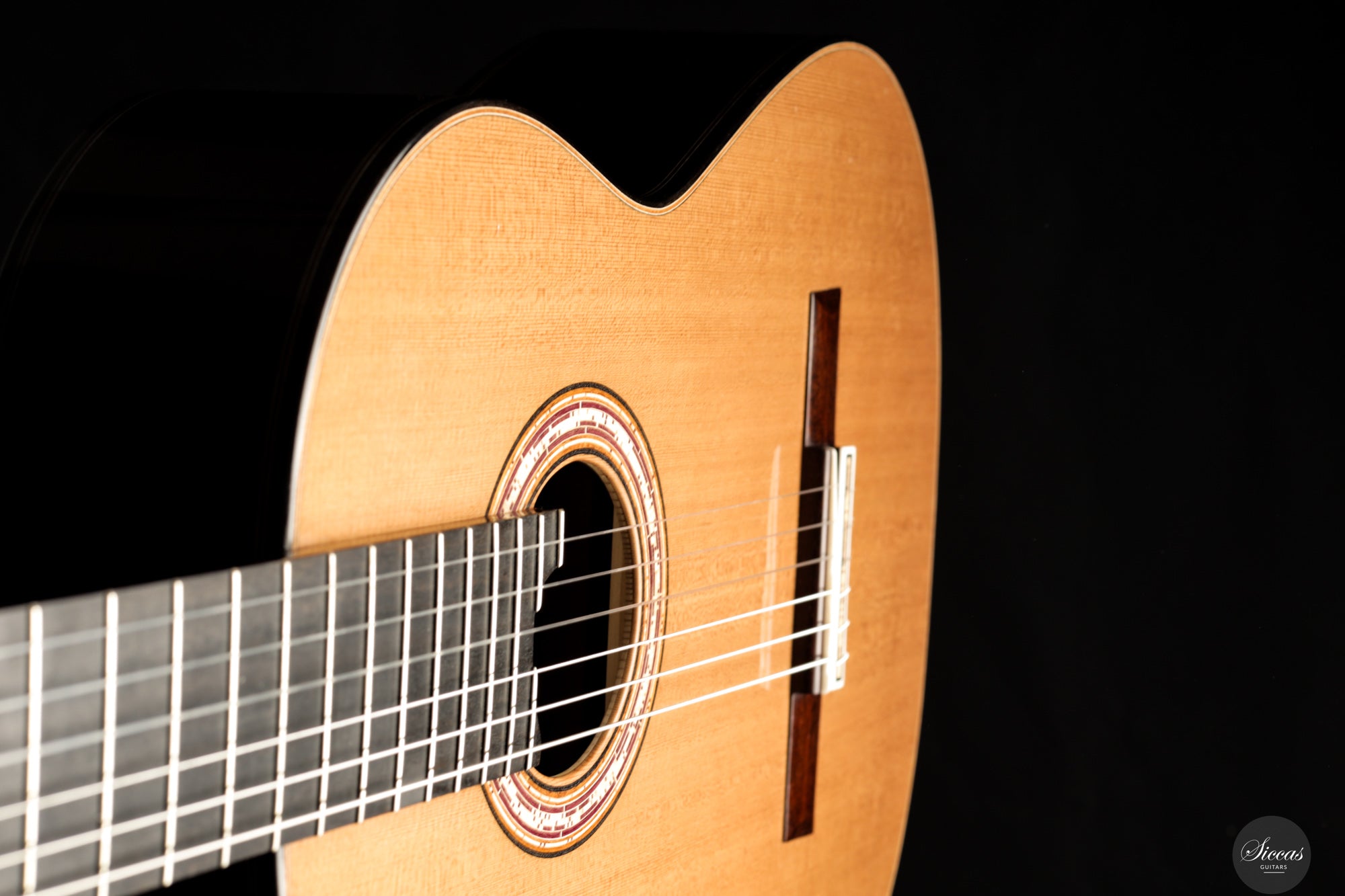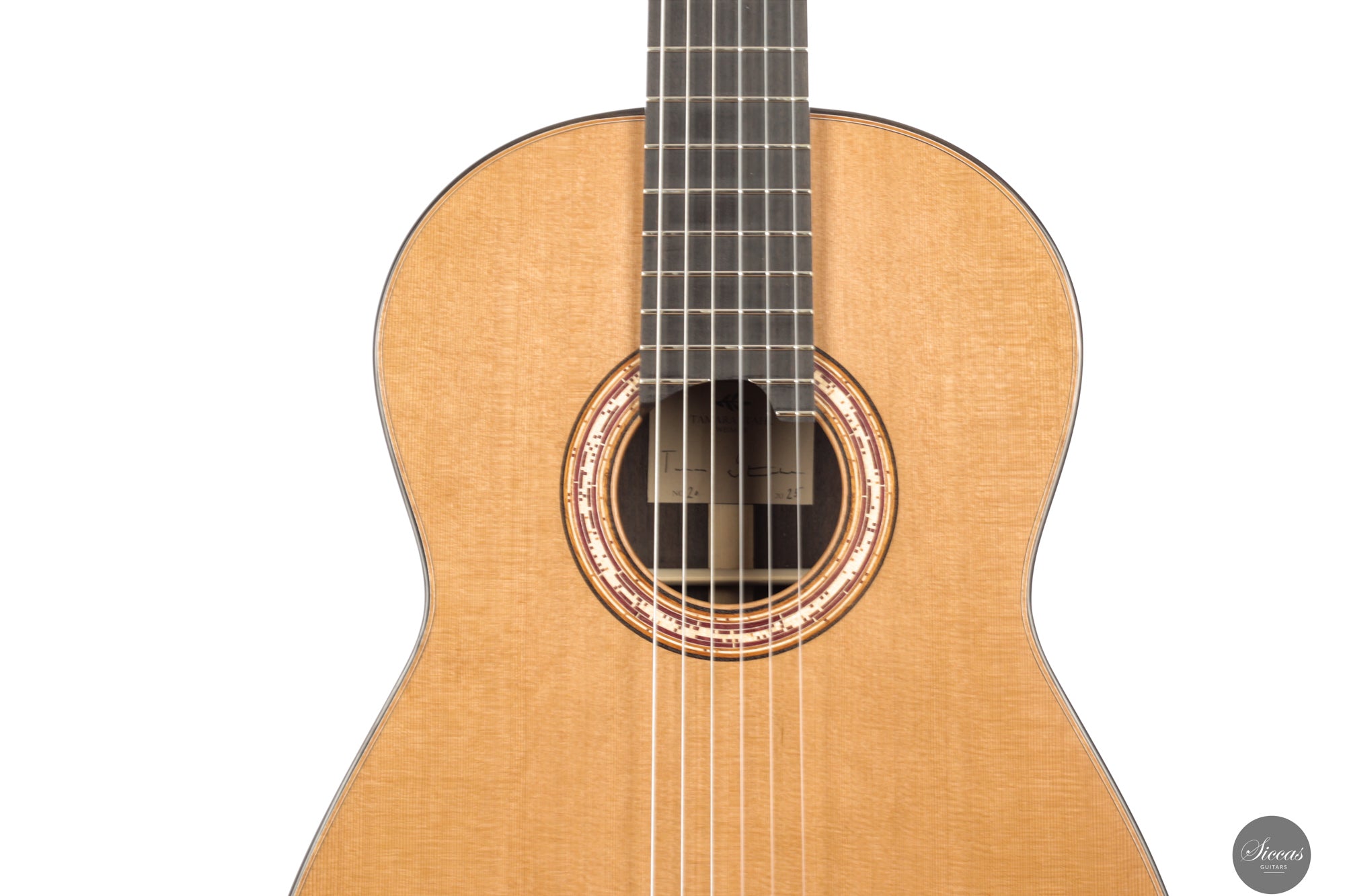 The guitar produces a tone that is airy and full bodied. The character is slightly dark yet always open and round. The notes carry a noticeable weight and the sound has an appealing sense of depth. The instrument responds quickly across all registers and sustains with ease. The trebles are clear and smooth and the basses are present and supportive without dominating the texture. The result is a guitar that blends the intimacy found in traditional instruments with the headroom needed for concert playing. It encourages expressive shaping of lines and offers a wide range of colours with subtle gradations of tone.