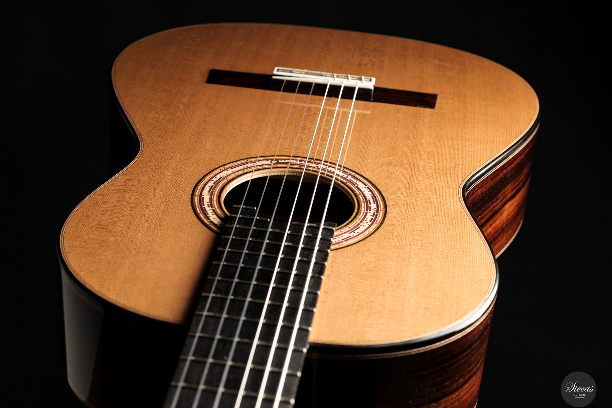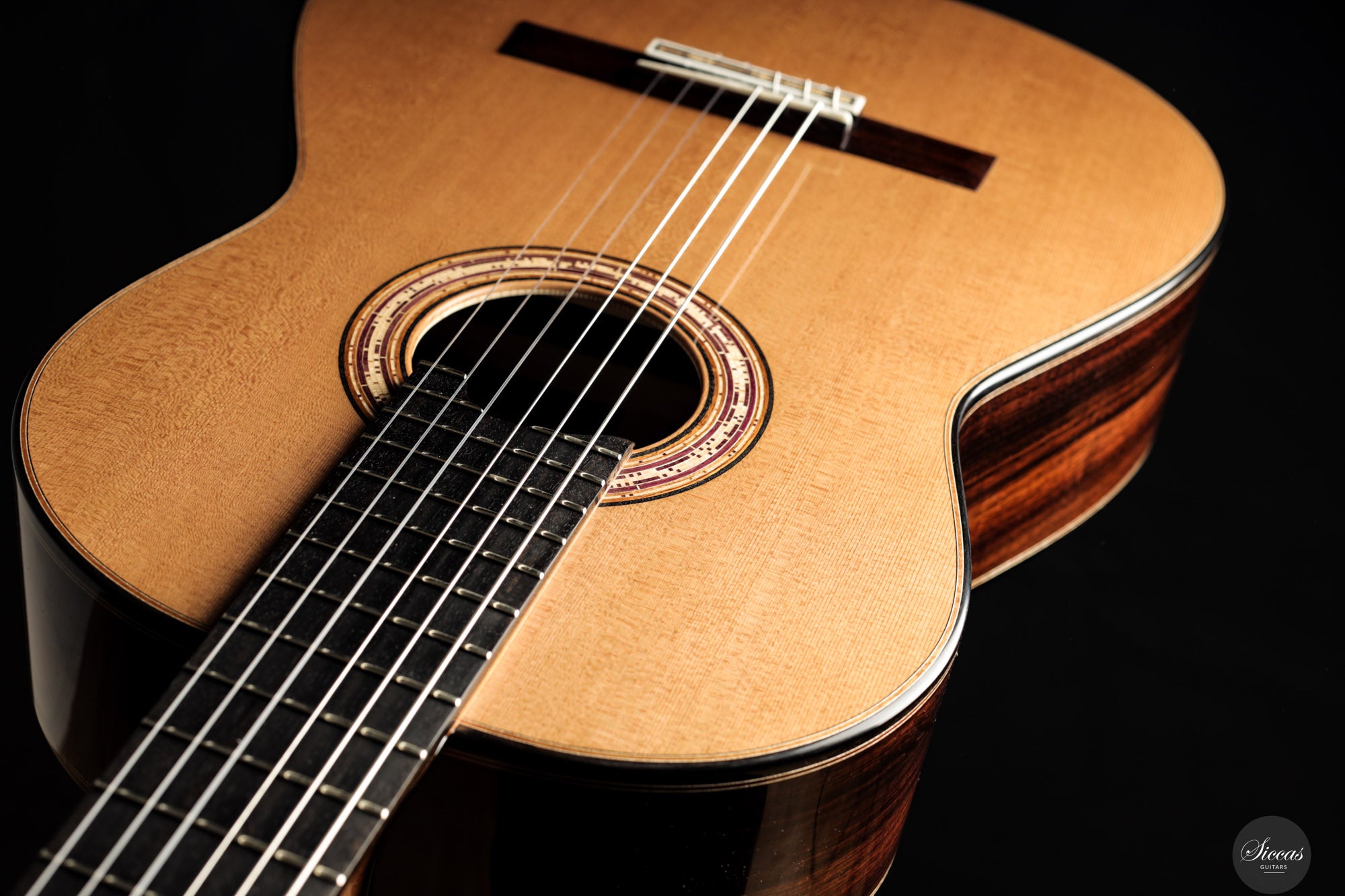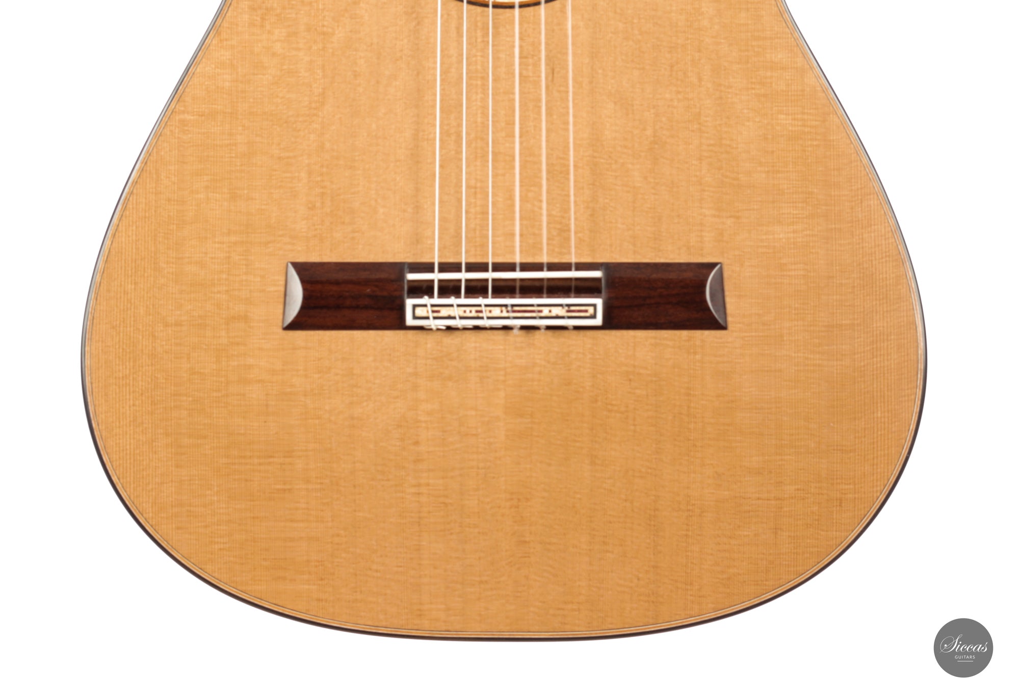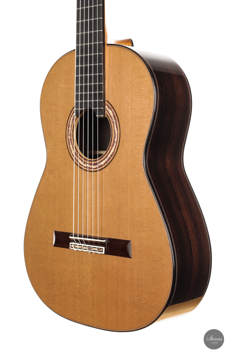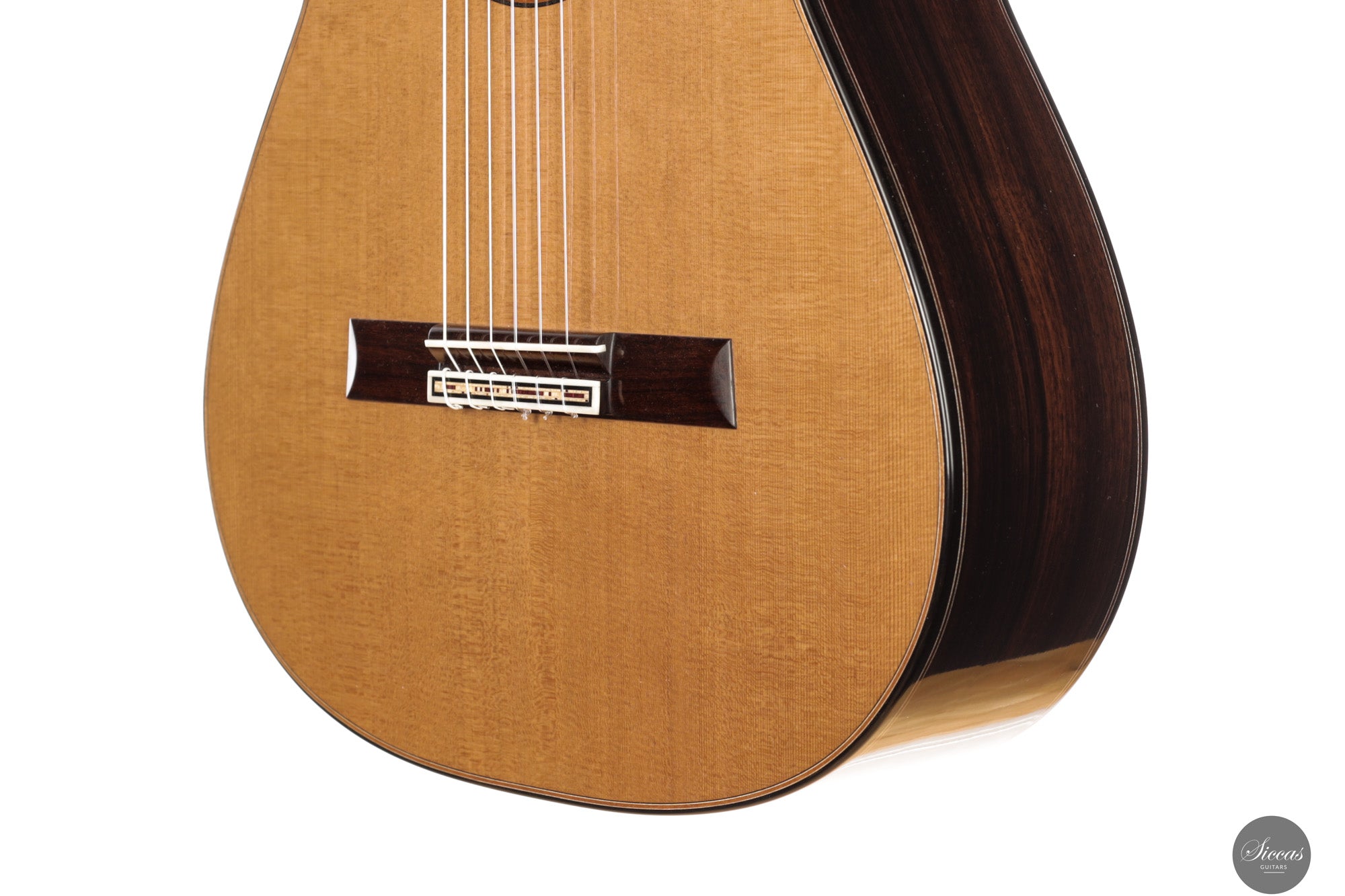 The guitar produces a tone that is airy and full bodied. The character is slightly dark yet always open and round. The notes carry a noticeable weight and the sound has an appealing sense of depth. The instrument responds quickly across all registers and sustains with ease. The trebles are clear and smooth and the basses are present and supportive without dominating the texture. The result is a guitar that blends the intimacy found in traditional instruments with the headroom needed for concert playing. It encourages expressive shaping of lines and offers a wide range of colours with subtle gradations of tone.