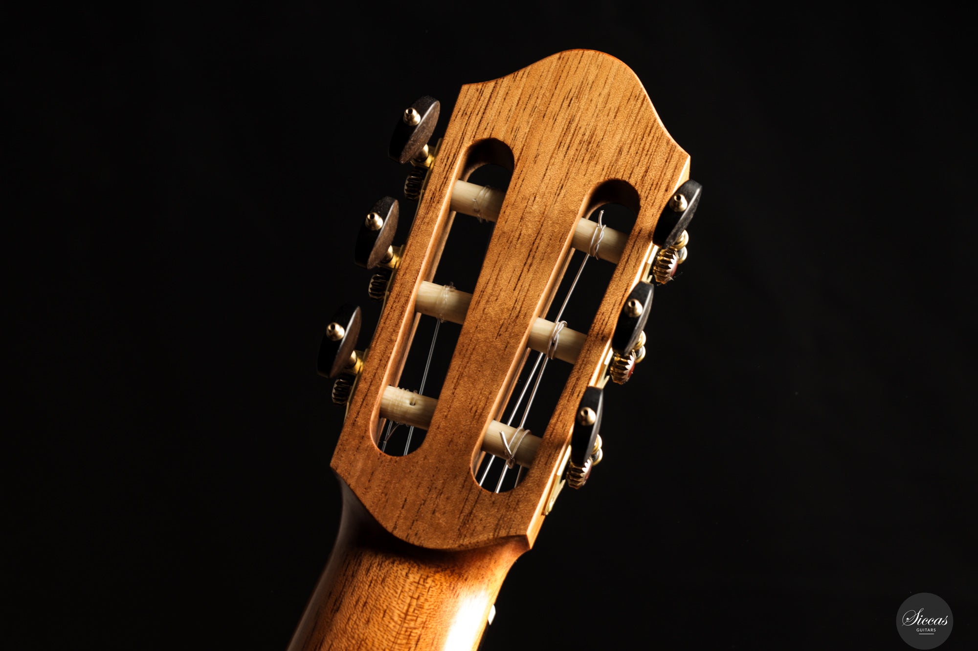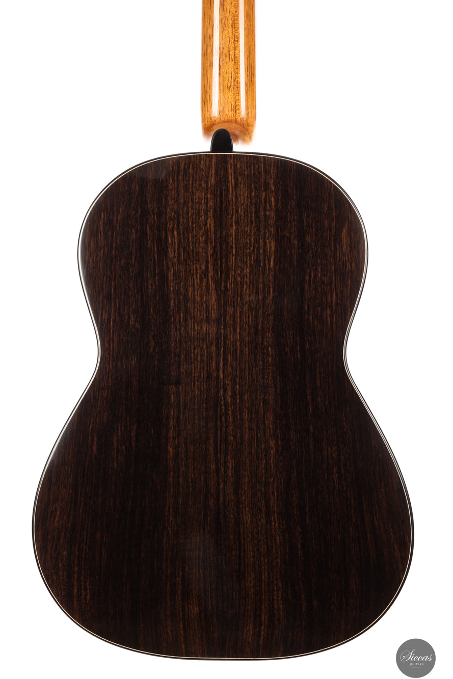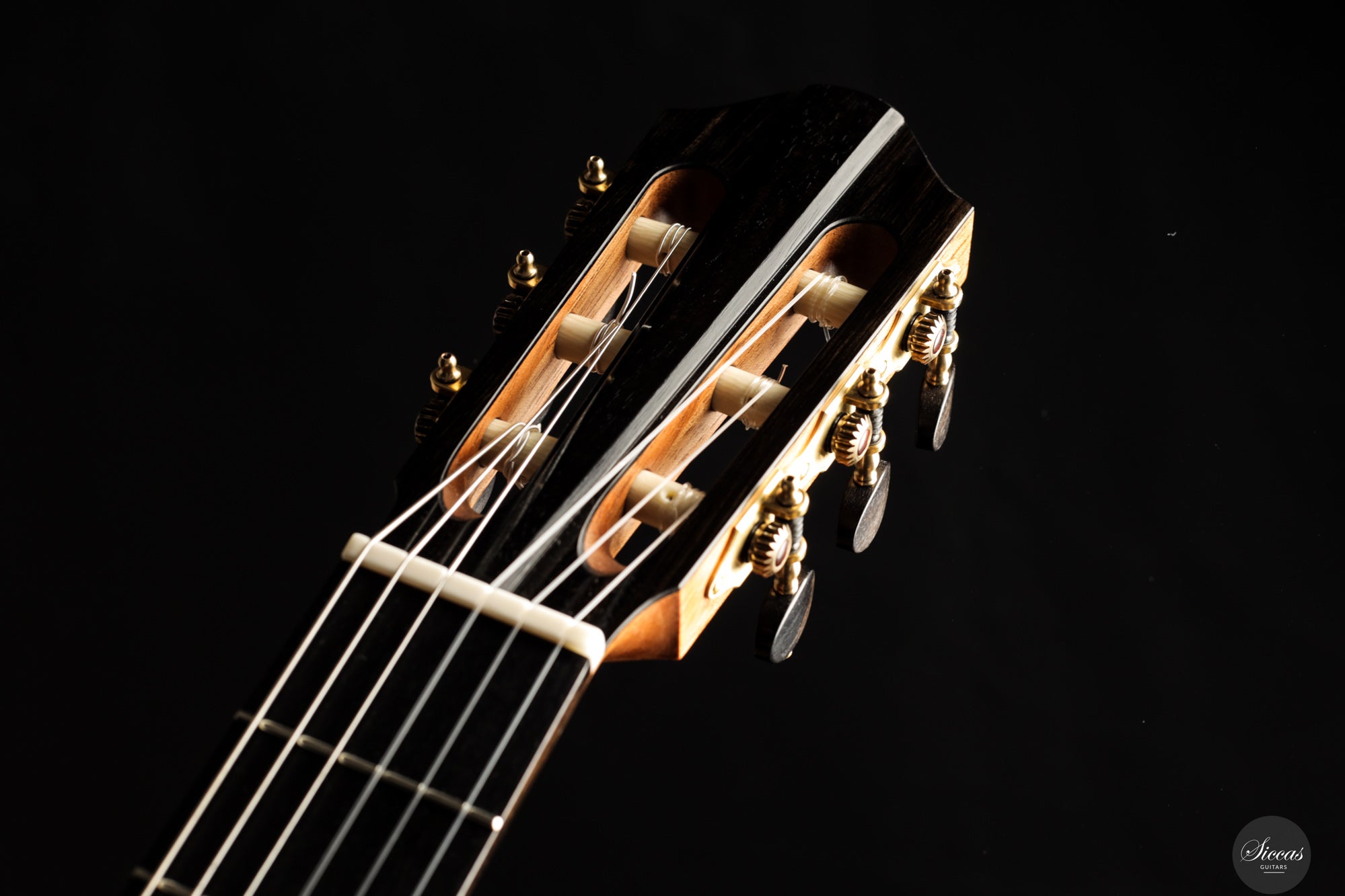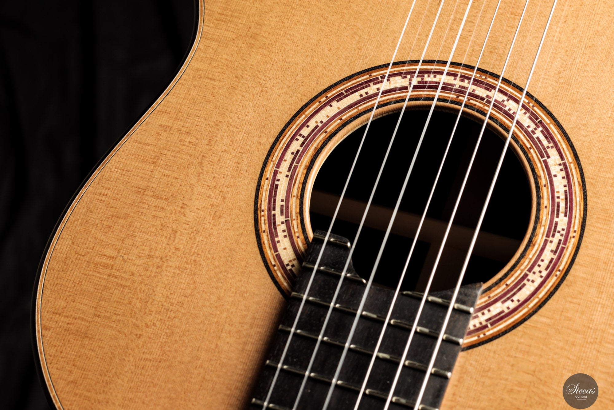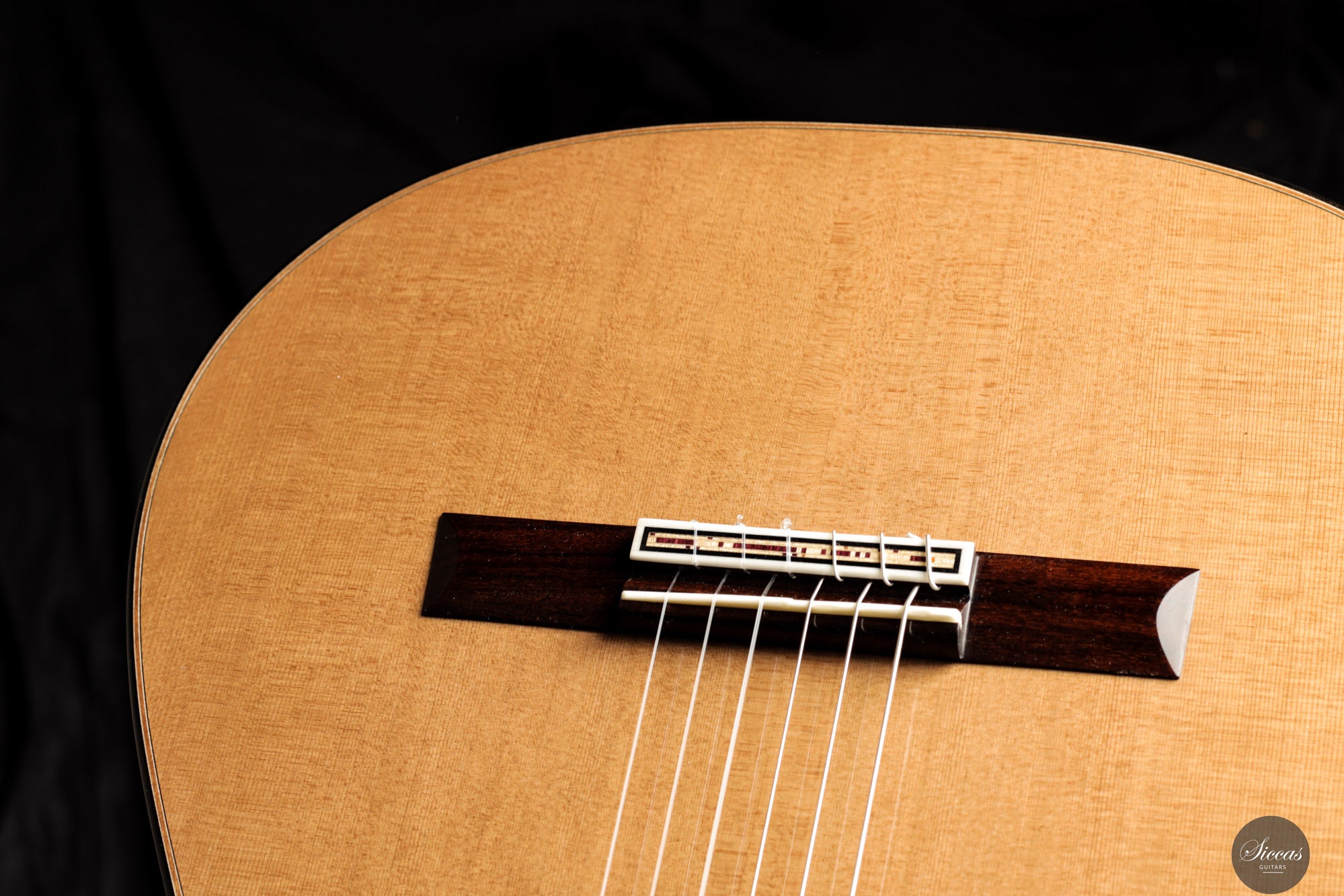This instrument from 2025 with the number 20 reflects the evolution of Tamara Stahl’s mature building style. It is constructed in a traditional manner with a cedar top and Indian rosewood body, finished throughout with French polish. The doubled sides and the carefully weighted bridge contribute to increased projection and stability. The overall build feels compact and solid while remaining sensitive to the lightest touch. Kris Barnett tuning machines provide smooth and steady tuning.