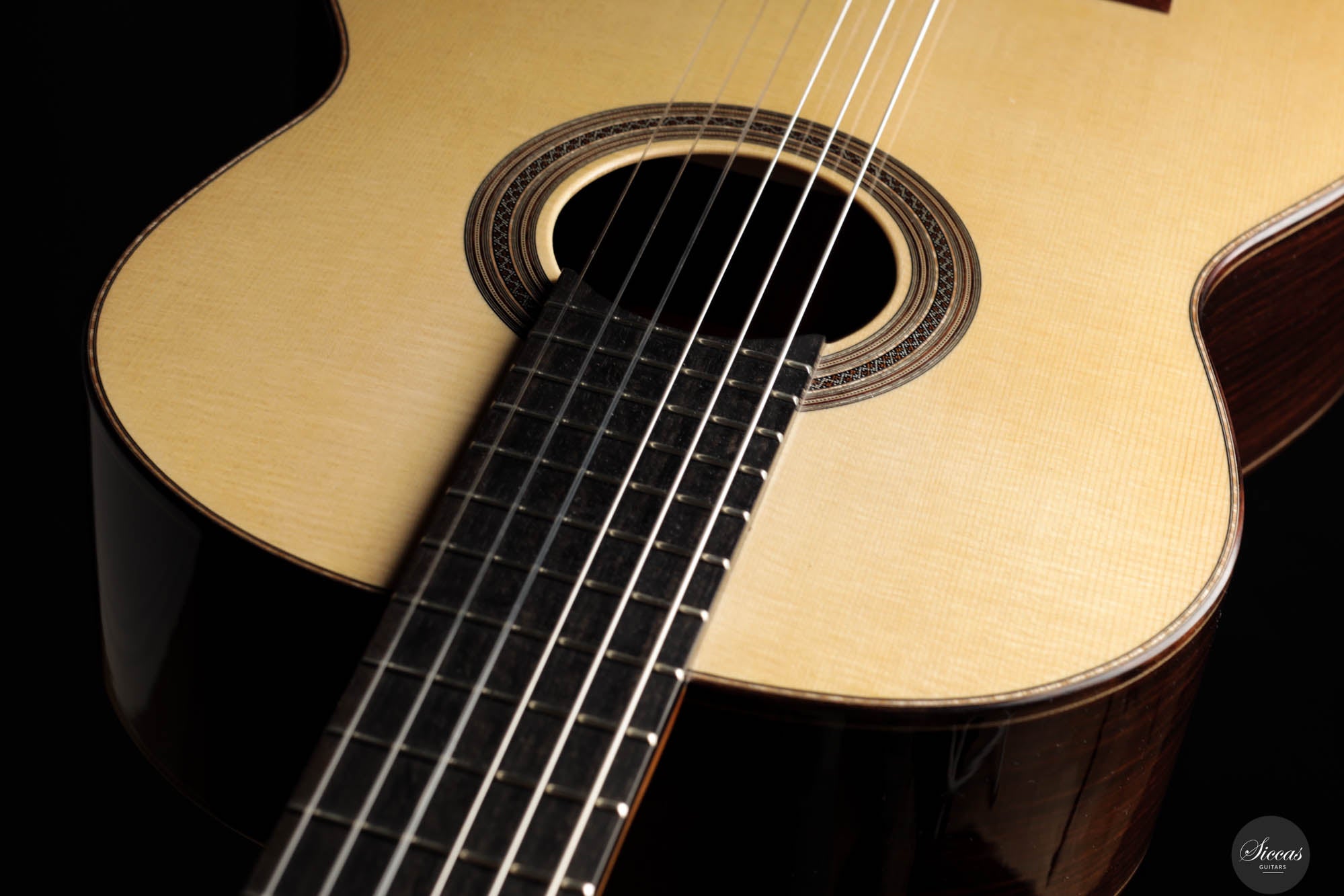 The sound produced by this guitar is nothing short of spectacular—rich in overtones, with a robust and firm tonality that maintains clarity and definition across all notes. Each note is delivered with a dense overtone structure that complements rather than overwhelms the fundamental, making the guitar ideal for articulate legato playing due to its exceptional sustain and distinct note separation. Players who prefer a substantial D-shaped neck will find this guitar exceptionally comfortable, and its dynamic range is a boon for expressive right-hand techniques. Whether used in a solo performance or within an ensemble, this guitar stands out in any professional setting, effortlessly filling any venue with its powerful sound. Beyond its sonic excellence, the guitar is also a testament to meticulous craftsmanship, styled with elegance and constructed from exquisitely selected materials. It represents a harmonious marriage of aesthetic beauty and acoustic power, catering to the demanding needs of contemporary concert and recording artists.