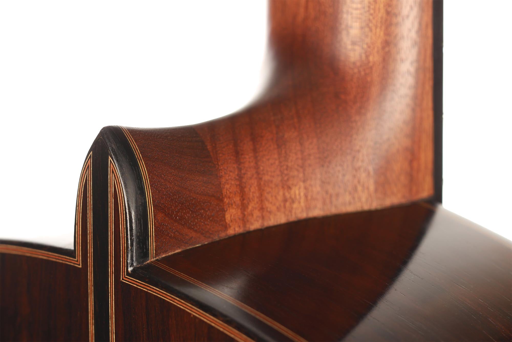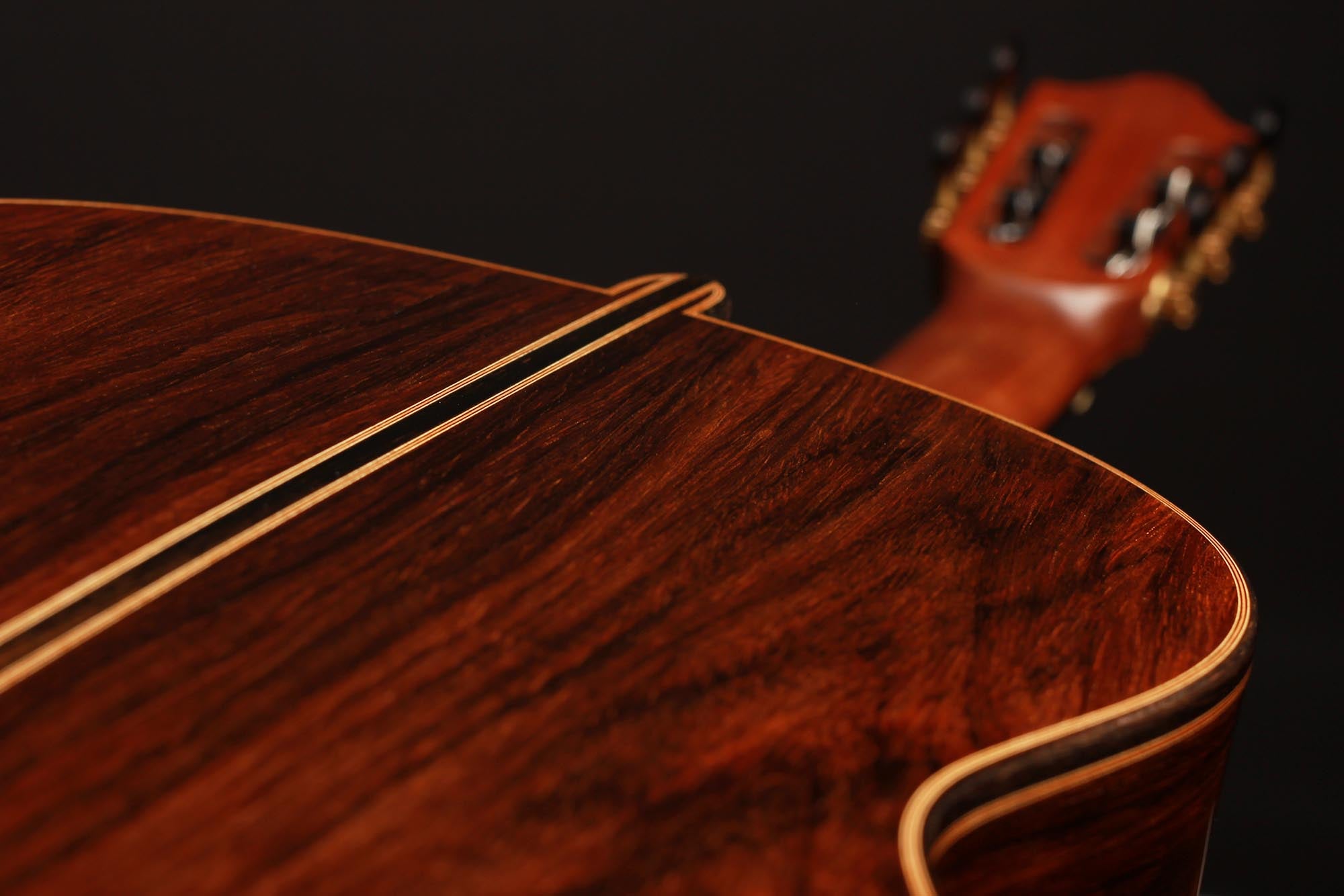 The spruce top has a traditional symmetrical seven-fan bracing and both top and back are slightly arched. A gorgeous Madagascar rosewood set with a deep dark colour and lovely figured grain was chosen for this guitar. The ornaments are classy elegant, with a rosette of solid wood inlays that are distinctive of Thomas Ochs guitars.