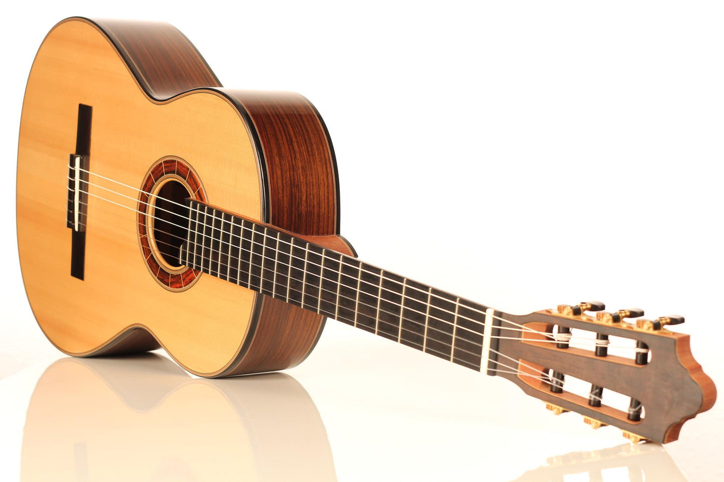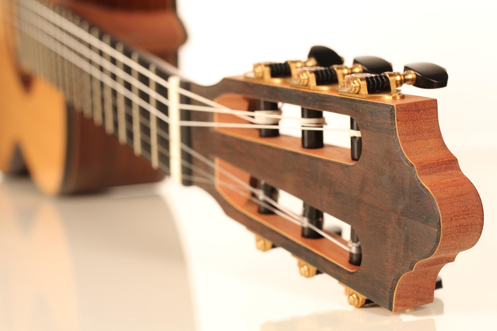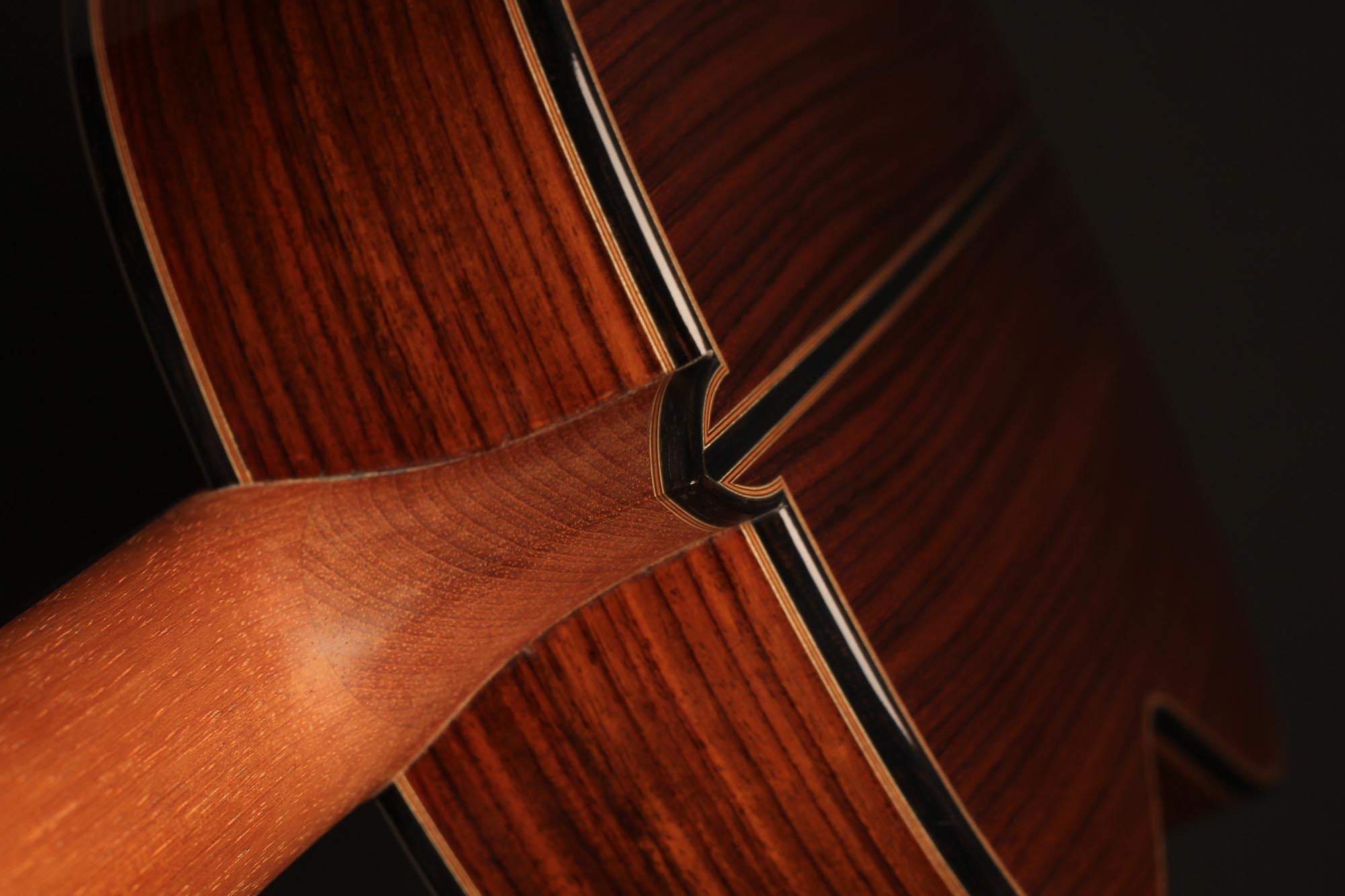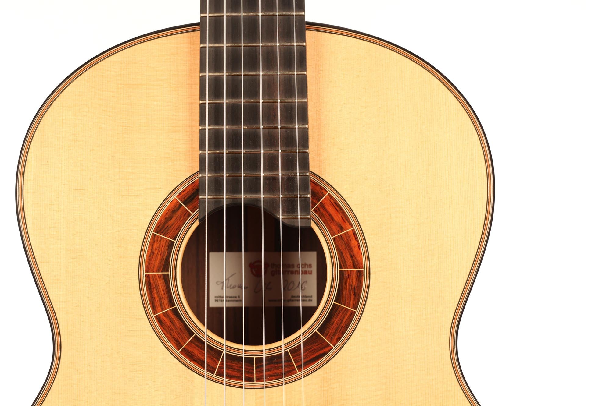 The construction of the spruce top with its seven symmetrical and fan-like arranged struts and a transverse batten beneath the sound hole transposes the sustain of the sound reflection and the volume of basses. A stiffening of the guitar’s top above the sound hole supports the tone duration in the descant. Both, the top as well as the back, which is made of Indian rosewood, are arched. Four transverse struts stiffen the back and together with the stiffened ribs, they ensure that the top is able to swing like a firmly clamped membrane. Those characteristics of construction increase the instrument’s projection. The neck, which is stiffened with carbon rods, consists of cedro with a shafted headstock. It is connected with the guitar’s body in Spanish design. The top nut made of bone is not located directly at the end of the fingerboard, but is inserted into the fingerboard. By this technique, Thomas Ochs gets a stiffer neck-head junction. The ornamentation of the instrument is classically elegant and it is kept very simple. A handmade sound hole inlay surrounds the sound hole and the body is framed by decorative purfling with precious woods, which harmonize with the sound hole inlay.