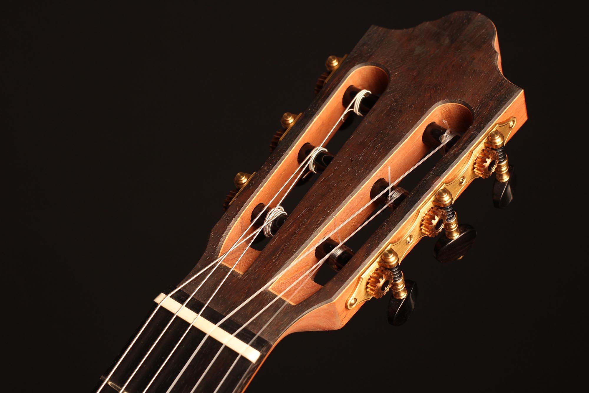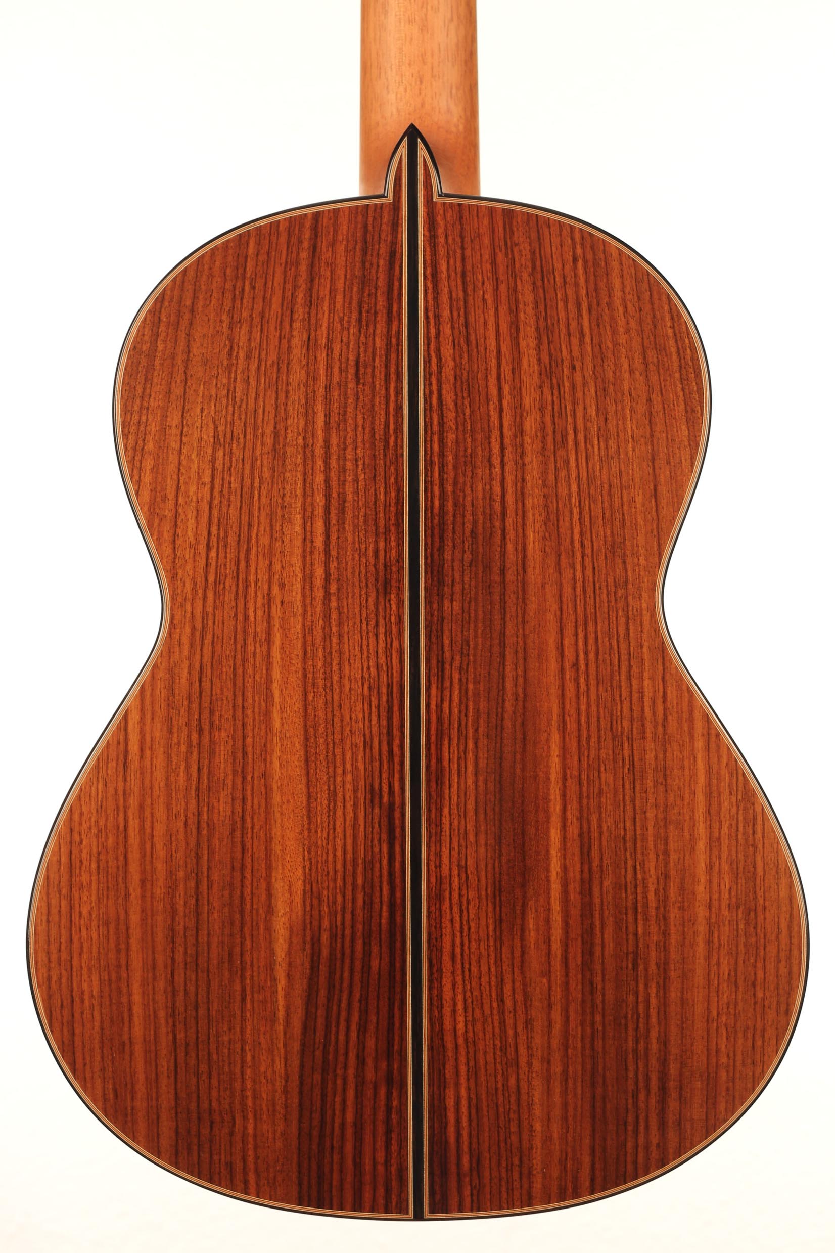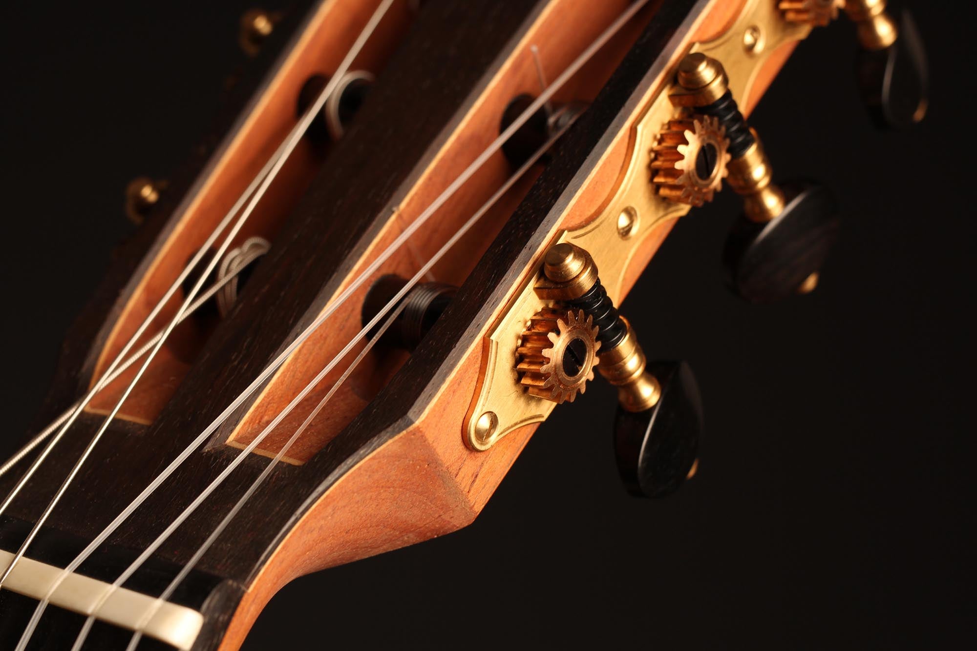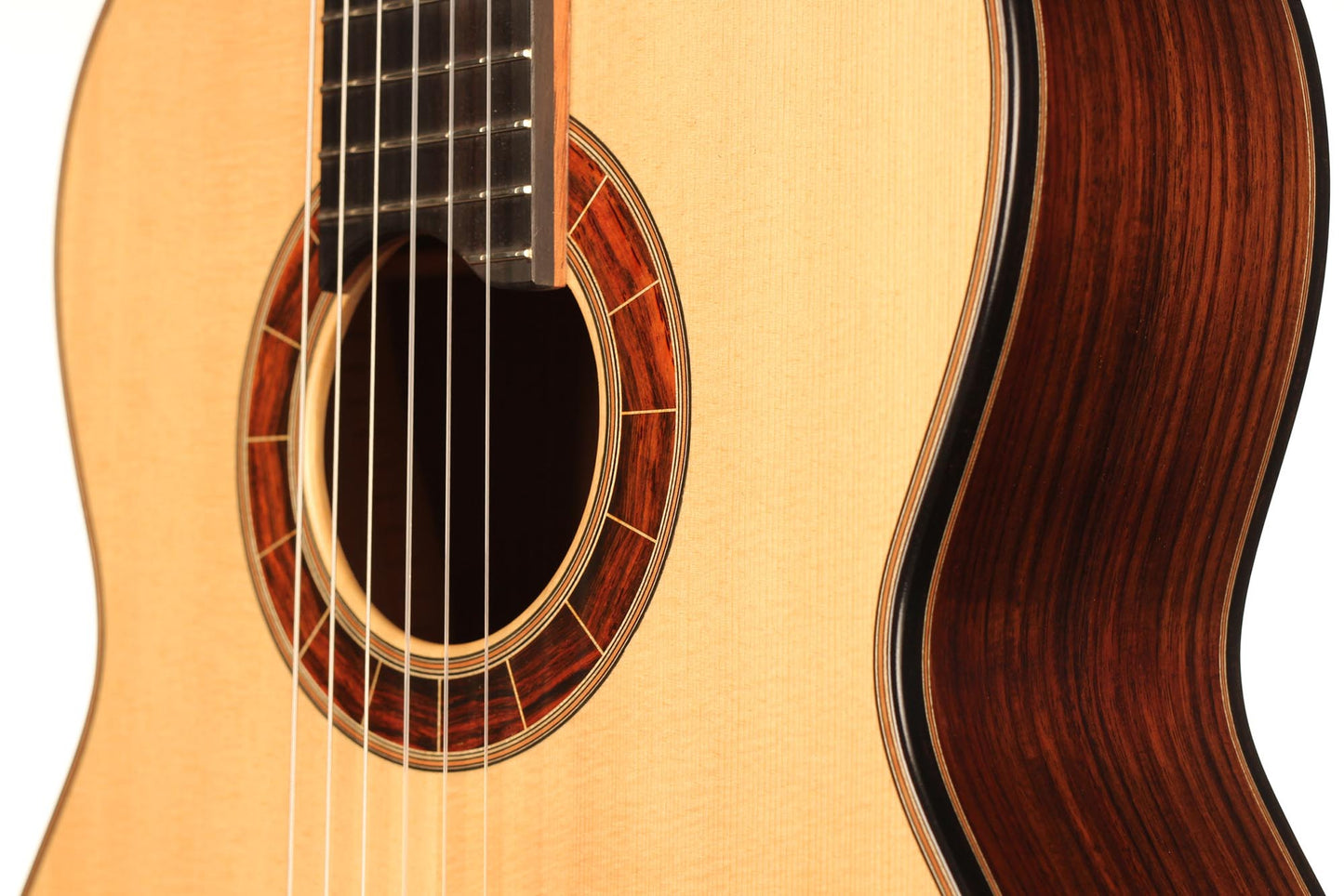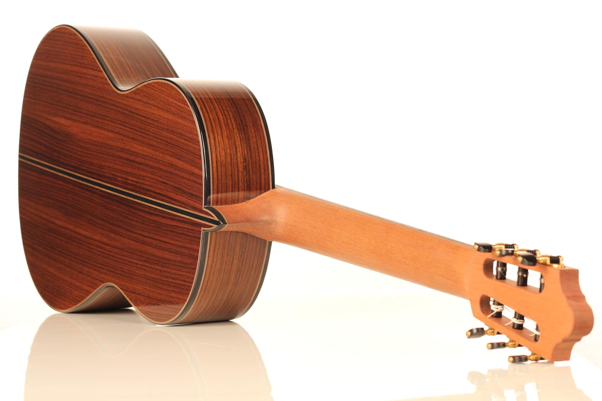 The construction of the spruce top with its seven symmetrical and fan-like arranged struts and a transverse batten beneath the sound hole transposes the sustain of the sound reflection and the volume of basses. A stiffening of the guitar’s top above the sound hole supports the tone duration in the descant. Both, the top as well as the back, which is made of Indian rosewood, are arched. Four transverse struts stiffen the back and together with the stiffened ribs, they ensure that the top is able to swing like a firmly clamped membrane. Those characteristics of construction increase the instrument’s projection. The neck, which is stiffened with carbon rods, consists of cedro with a shafted headstock. It is connected with the guitar’s body in Spanish design. The top nut made of bone is not located directly at the end of the fingerboard, but is inserted into the fingerboard. By this technique, Thomas Ochs gets a stiffer neck-head junction. The ornamentation of the instrument is classically elegant and it is kept very simple. A handmade sound hole inlay surrounds the sound hole and the body is framed by decorative purfling with precious woods, which harmonize with the sound hole inlay.