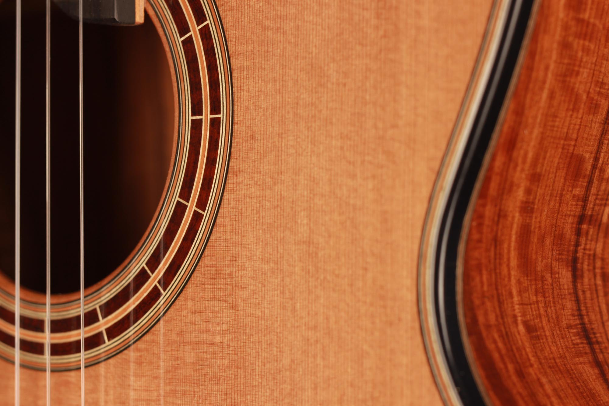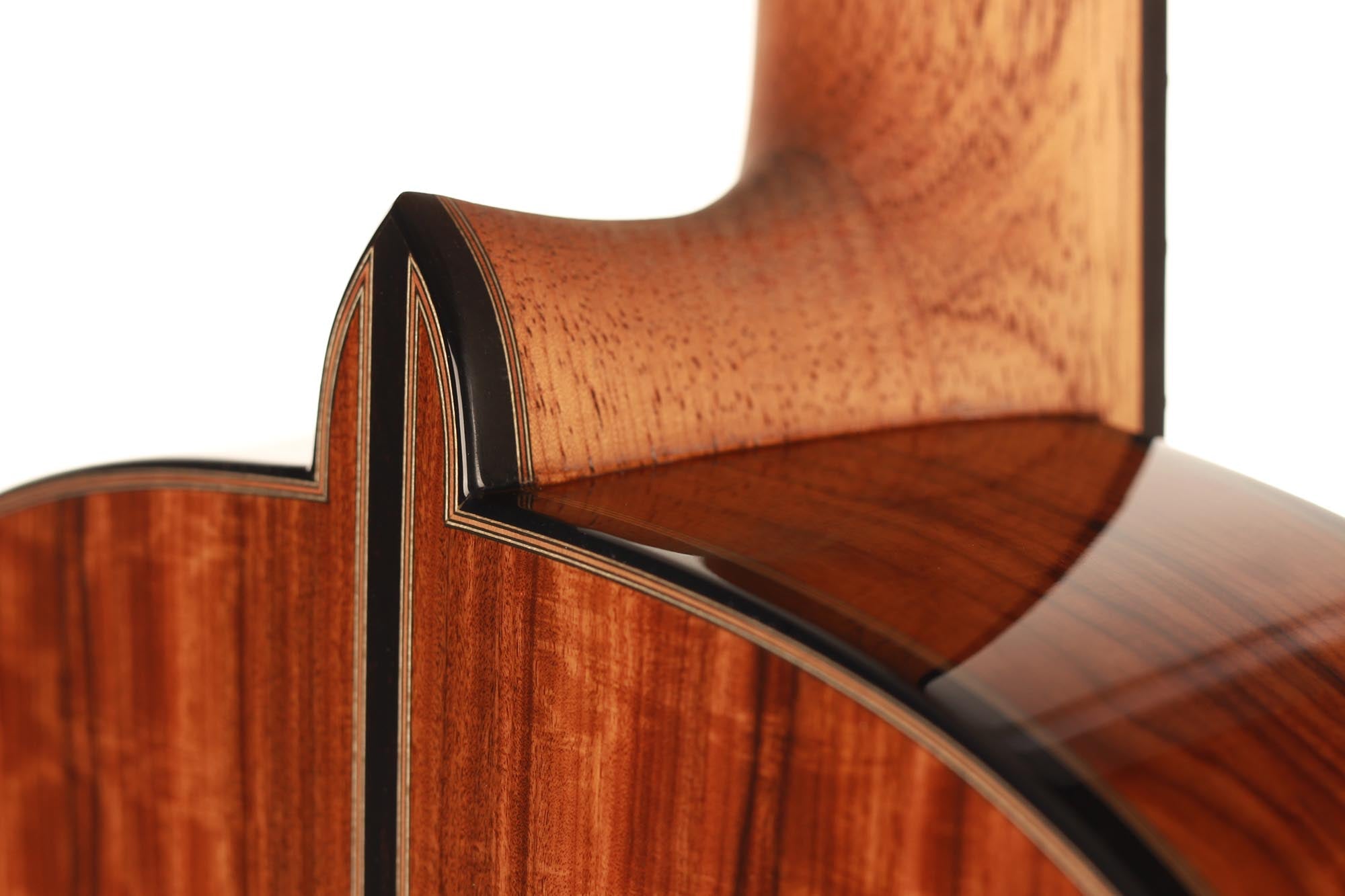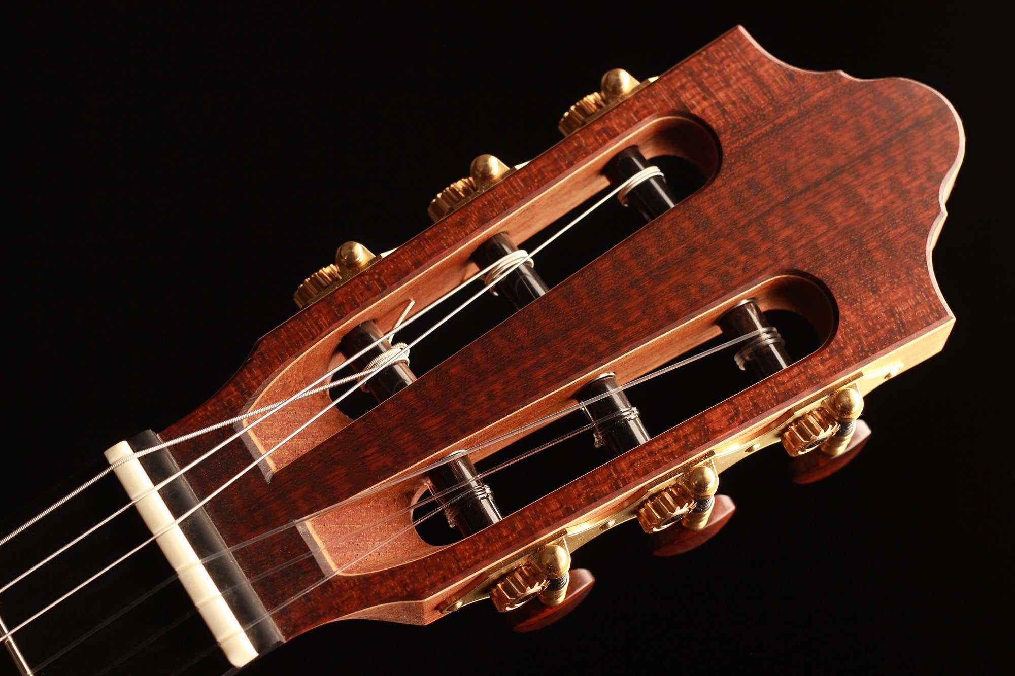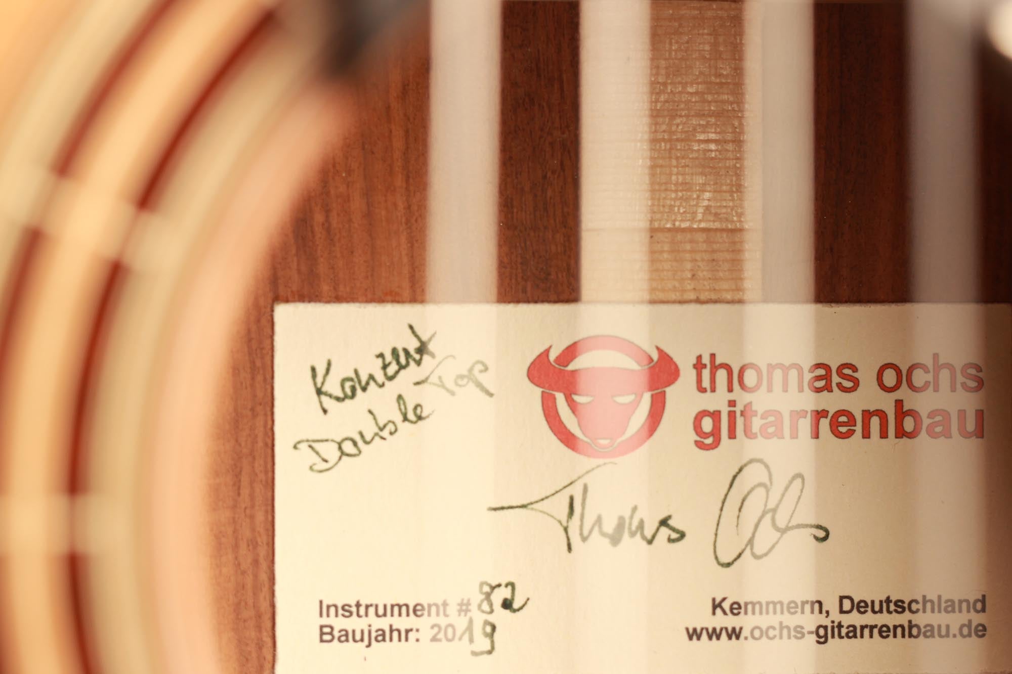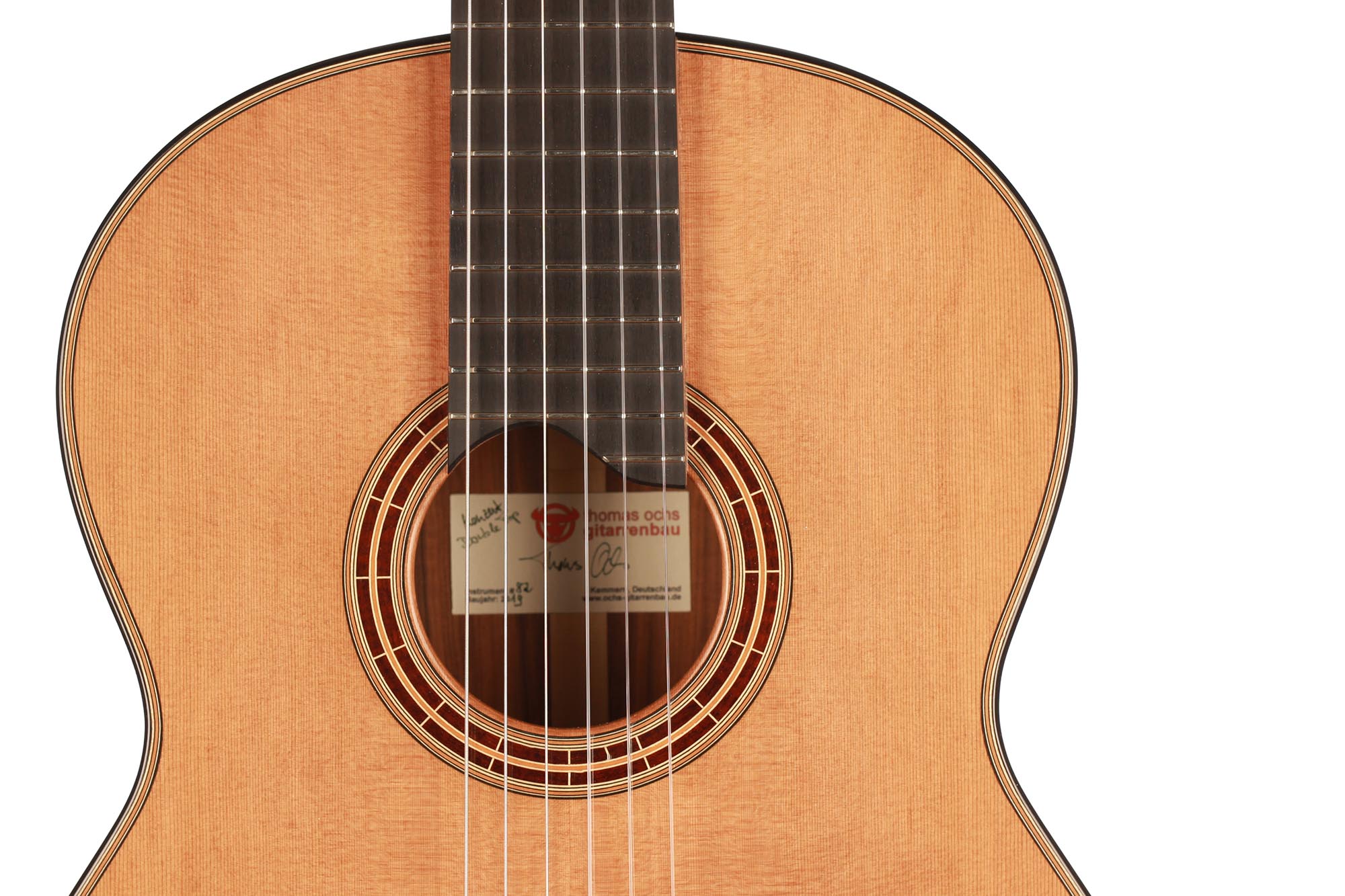 Thomas Ochs is an excellent German luthier from whom we have received many guitars in the past few years. His guitars are extremely well built, and his technical know-how is perfect. This CITES free doubletop model has amazing acoustic qualities and its playing comfort is fantastic. This guitar has a double cedar / cedar top that gives it agreat power as well as a round and warm sound. The clarity and precision of each note is surprising. The fingerboard is elevated, which makes it easier for the left hand to access the treble and the playing comfort for the right hand is impressive, due to the top's freedom of vibration.