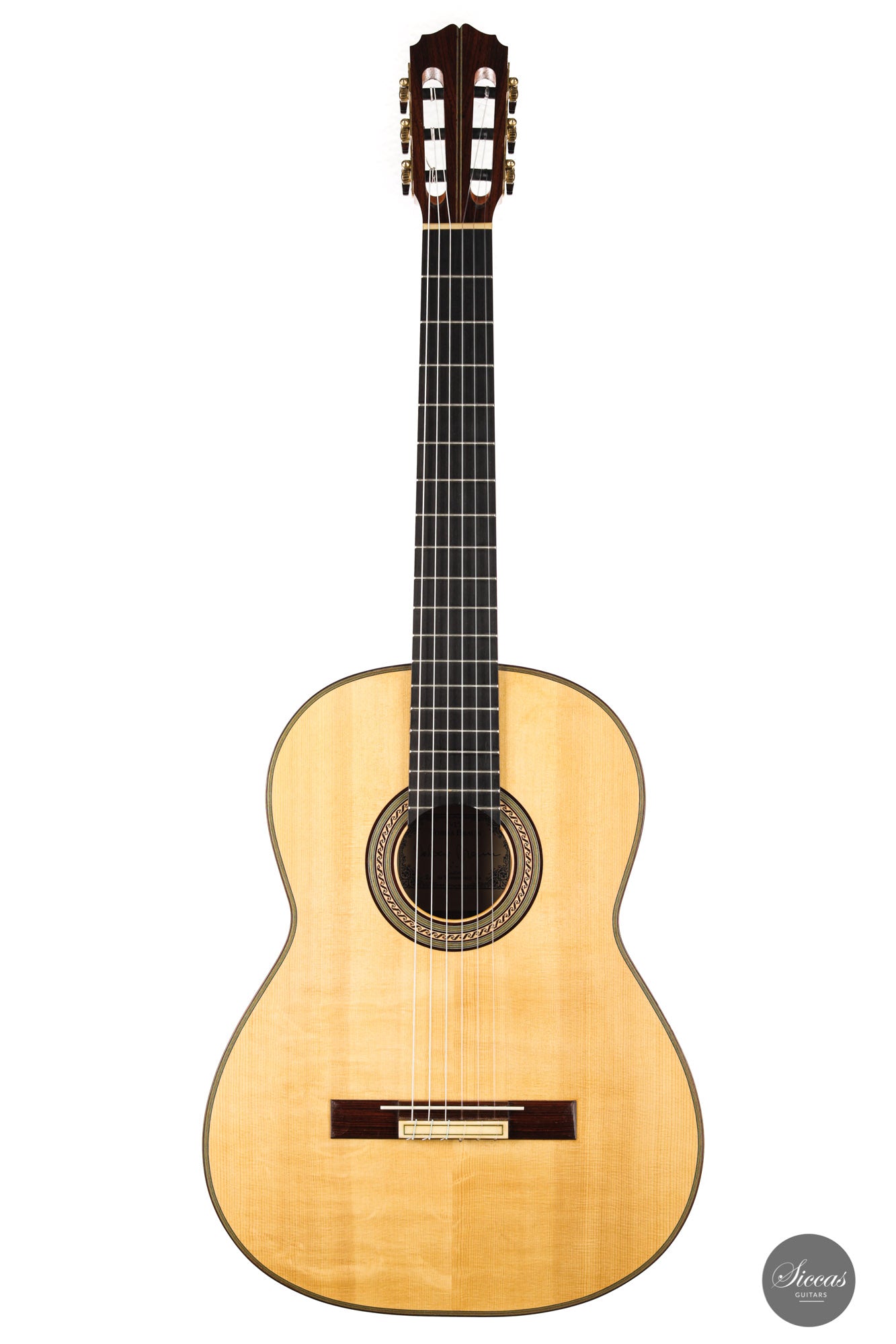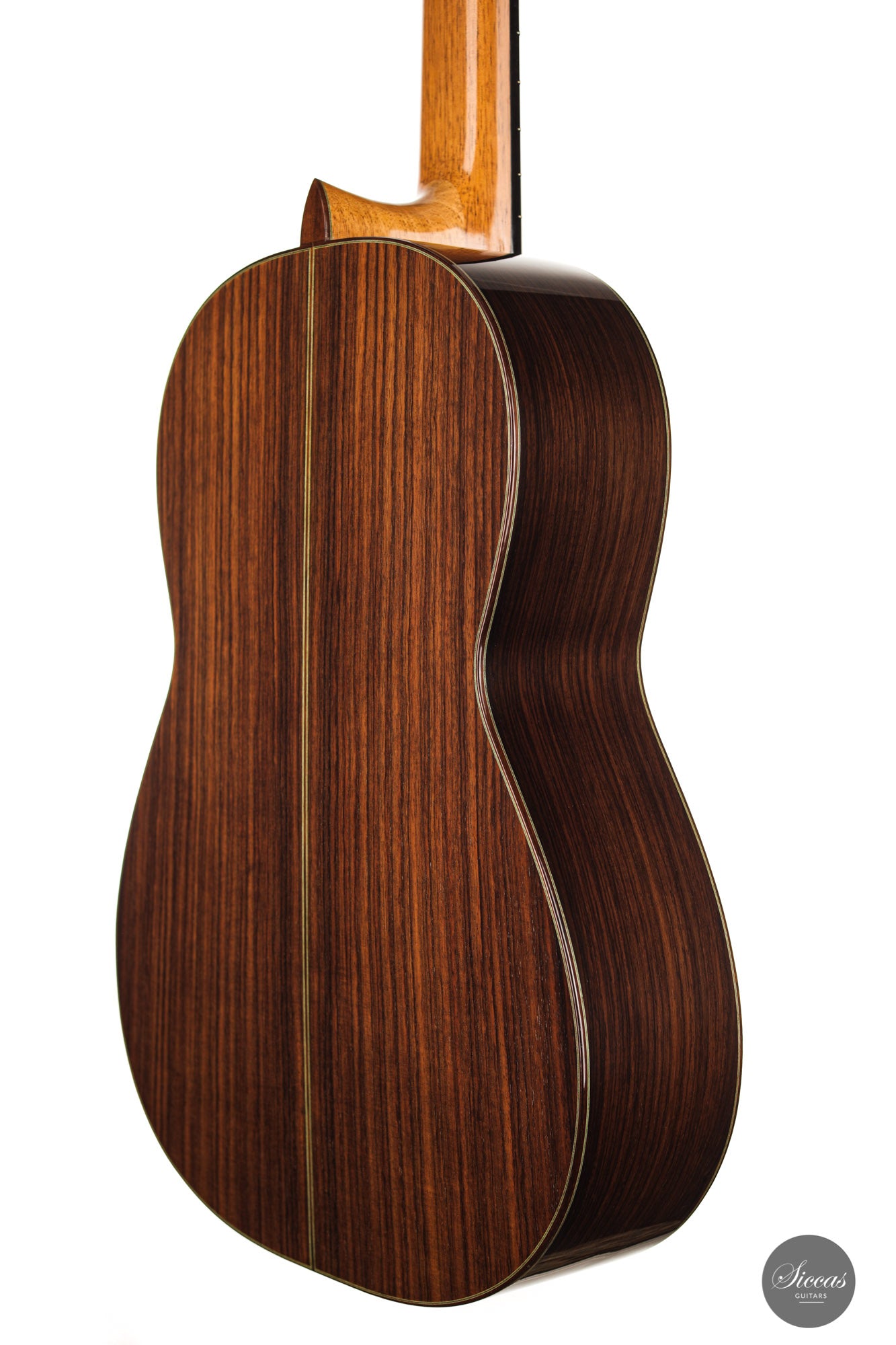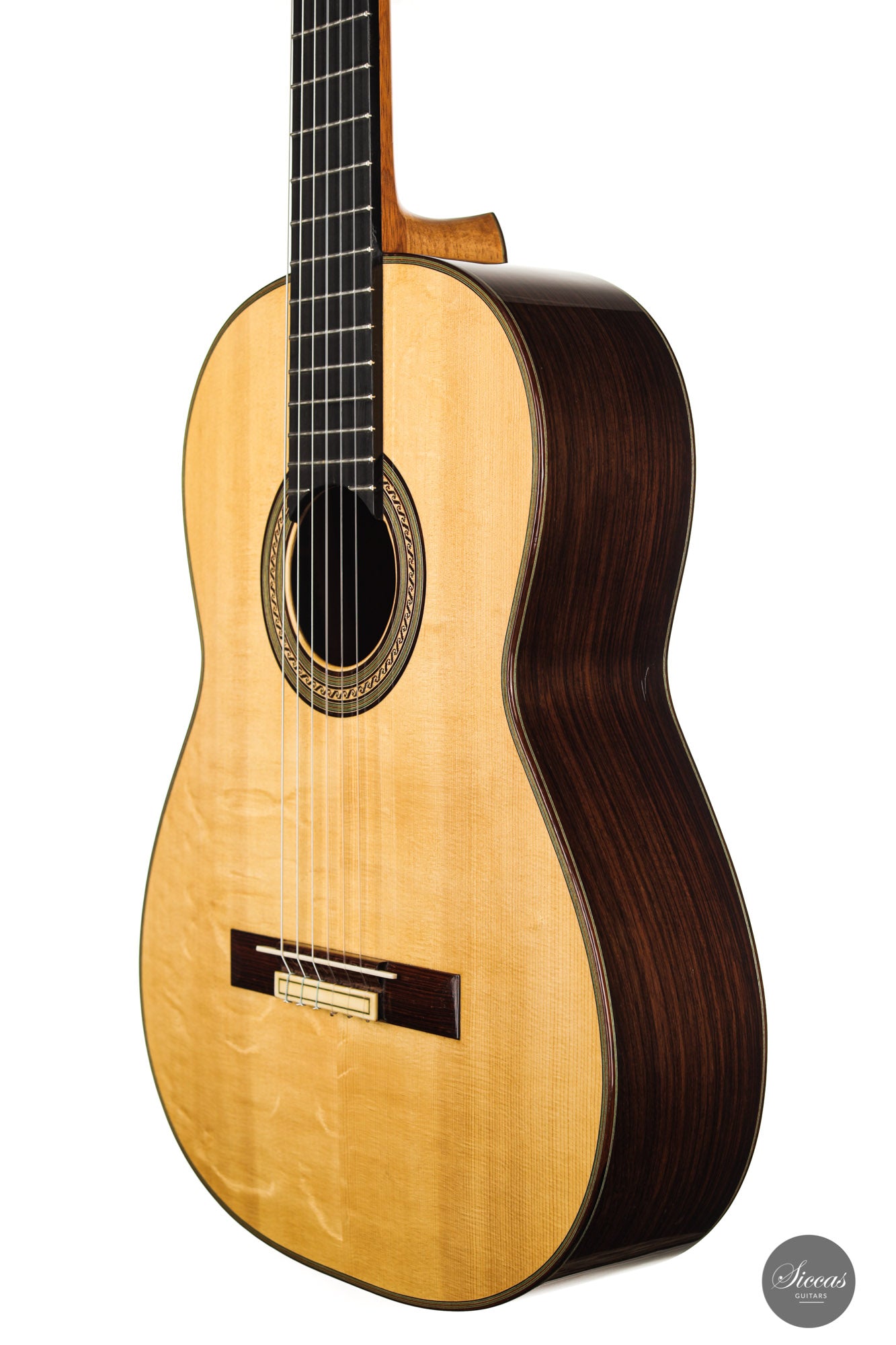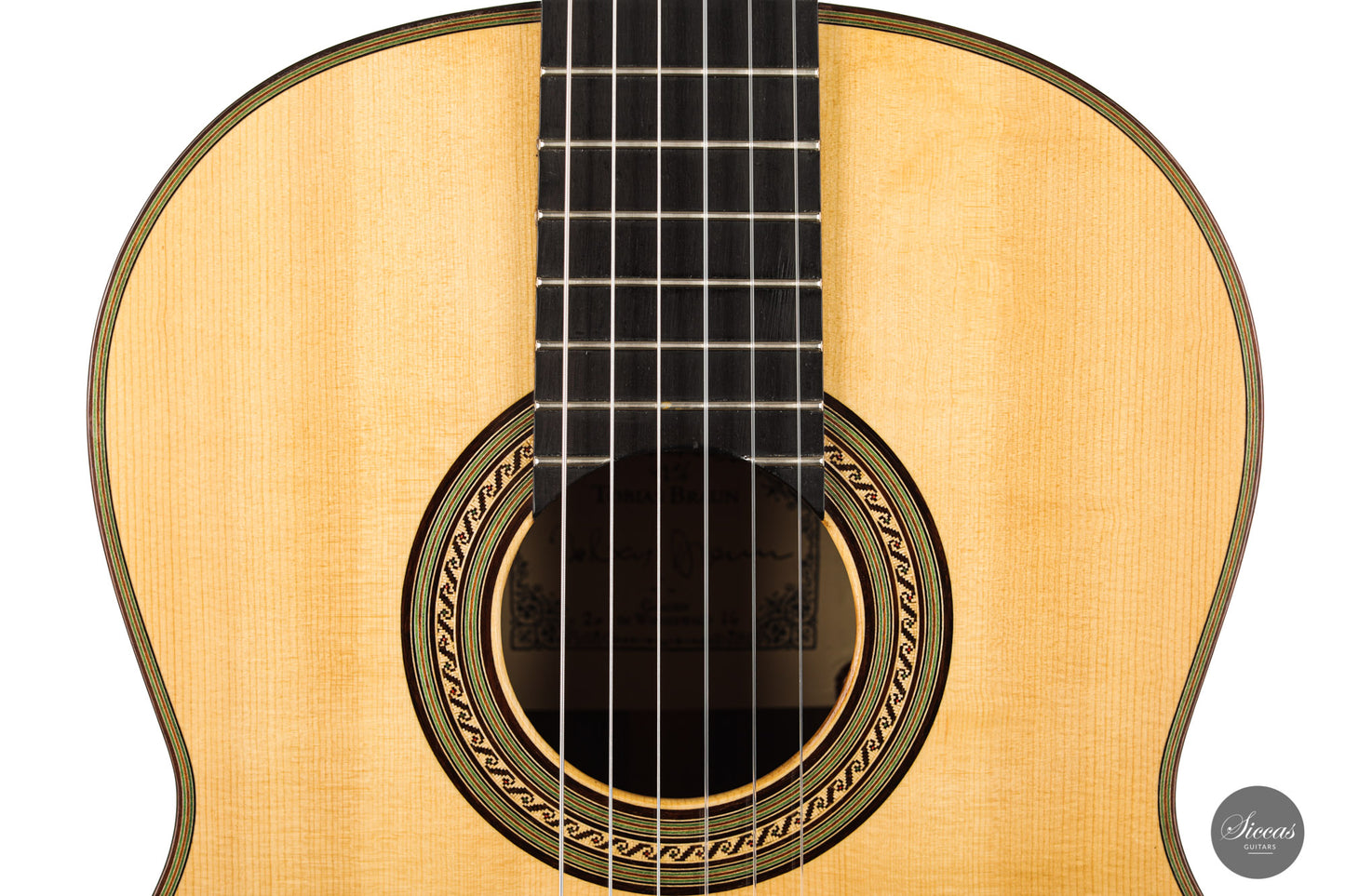 The original guitar which this instrument is a copy of was owned by the guitarist Luise Walker. Her teacher, Miguel Llobet, personally brought the guitar from Santos Hernández’s workshop to Vienna in 1924. The basses have a wonderful warmth, and the responsiveness is fast and direct. Trebles that sing beautifully and the mids of the guitar is rich and colorful. It is an excellent guitar for performers, collectors or aficionados. There is a small repaired crack on the side where the rosewood meets the heel, it is well repaired and perfectly stable.