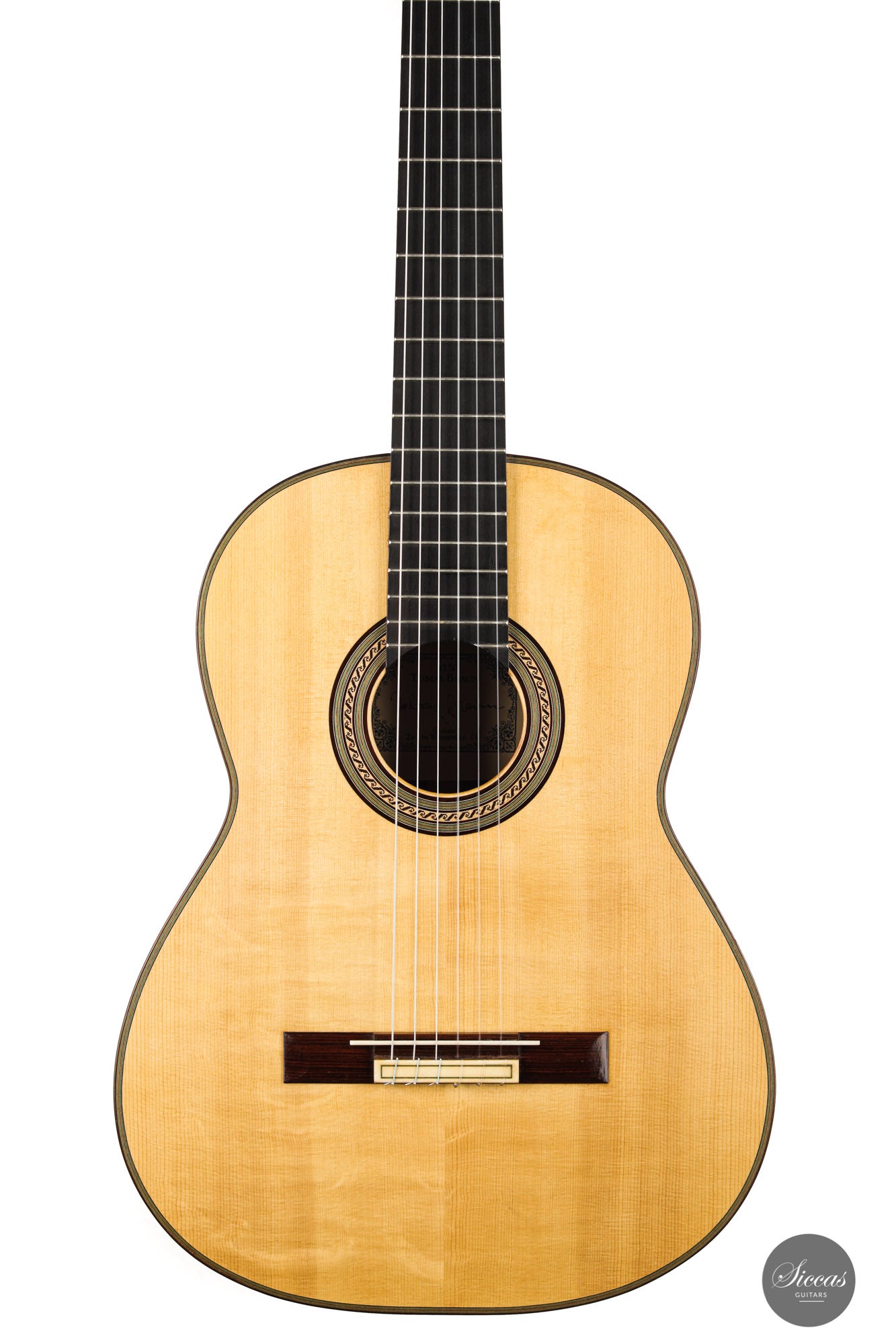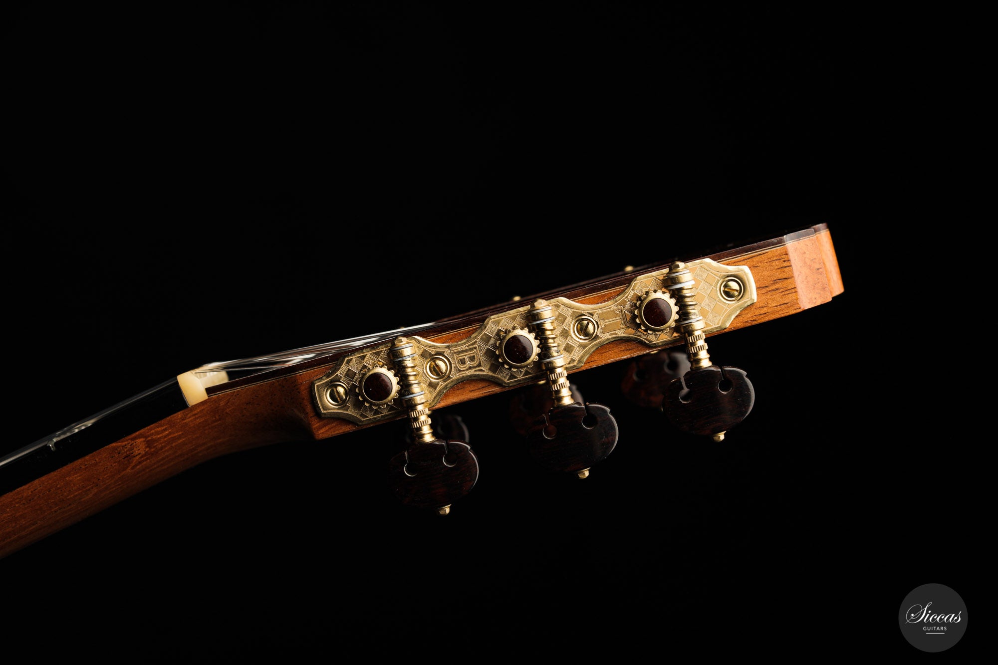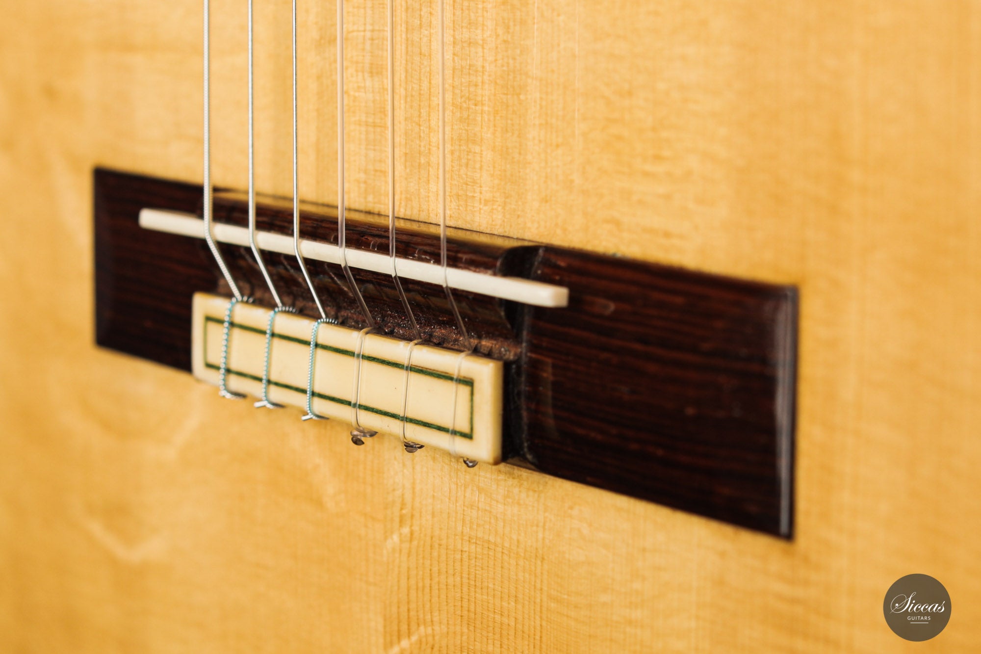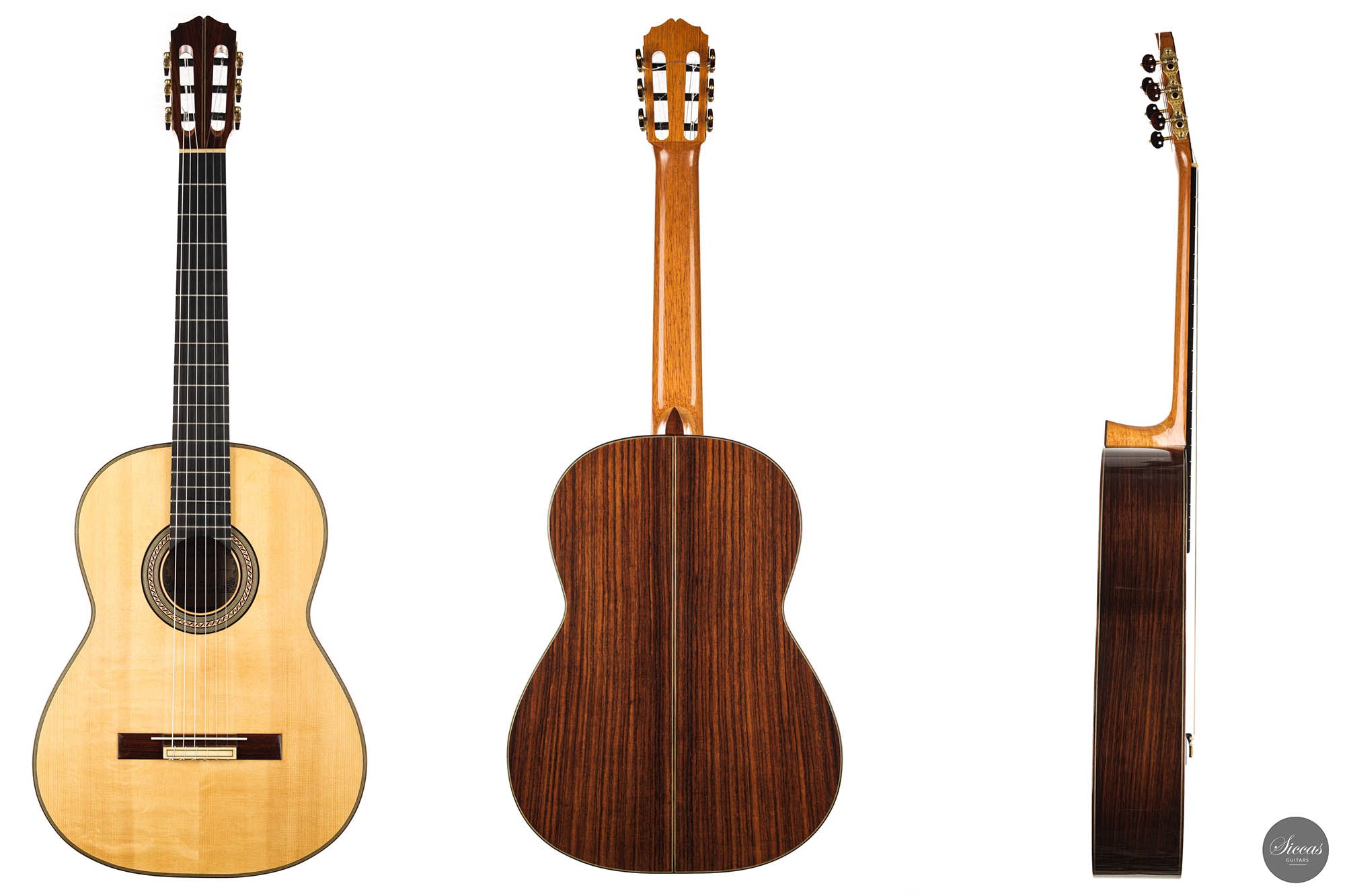 The original guitar which this instrument is a copy of was owned by the guitarist Luise Walker. Her teacher, Miguel Llobet, personally brought the guitar from Santos Hernández’s workshop to Vienna in 1924. The basses have a wonderful warmth, and the responsiveness is fast and direct. Trebles that sing beautifully and the mids of the guitar is rich and colorful. It is an excellent guitar for performers, collectors or aficionados. There is a small repaired crack on the side where the rosewood meets the heel, it is well repaired and perfectly stable.
