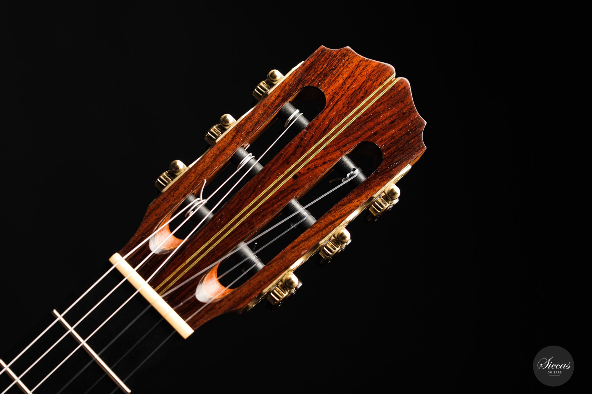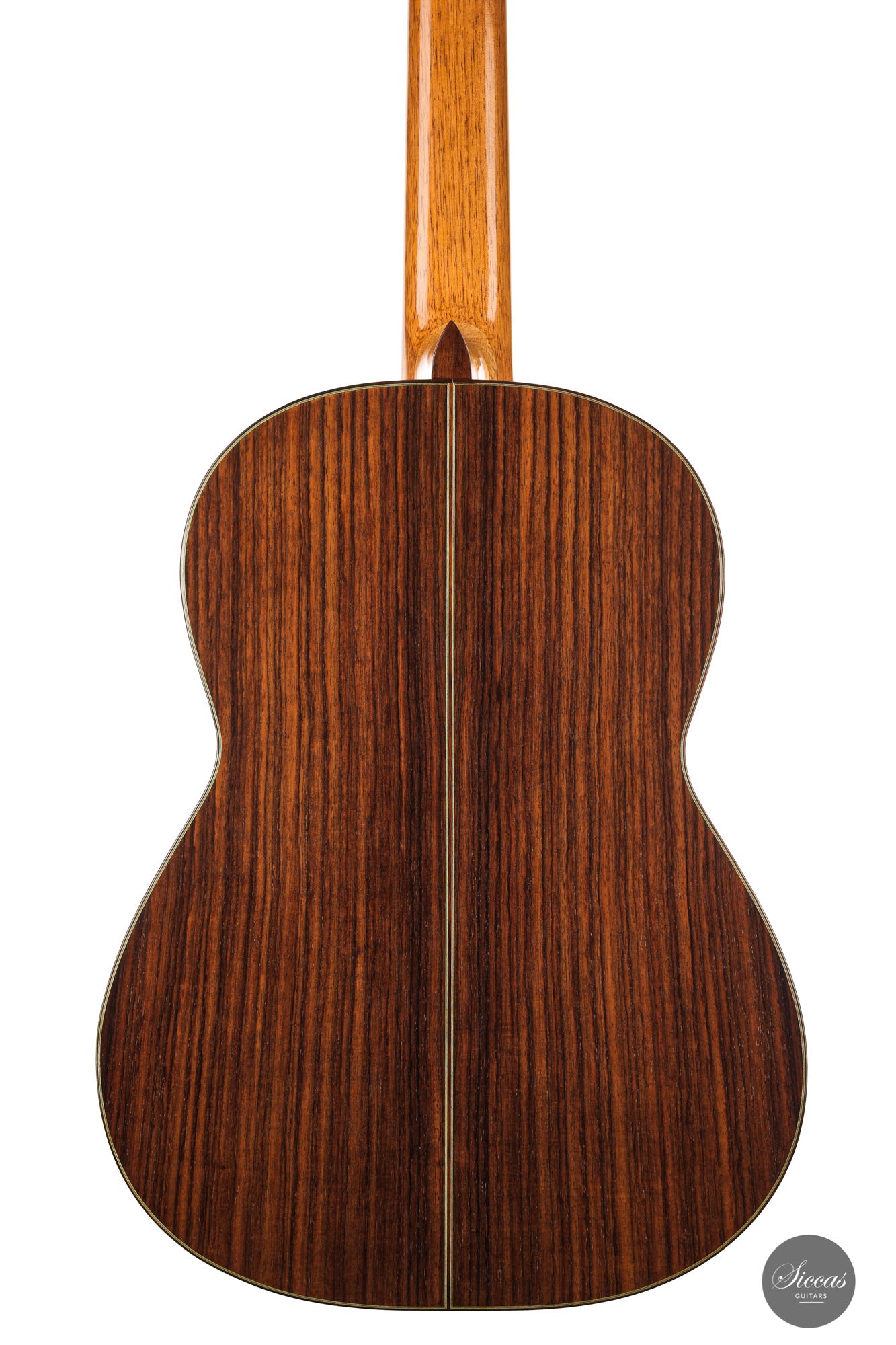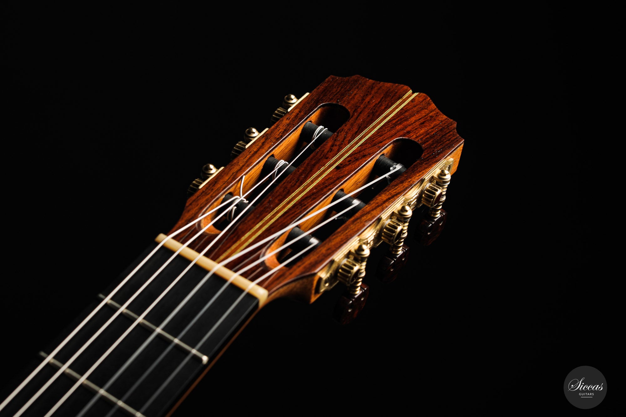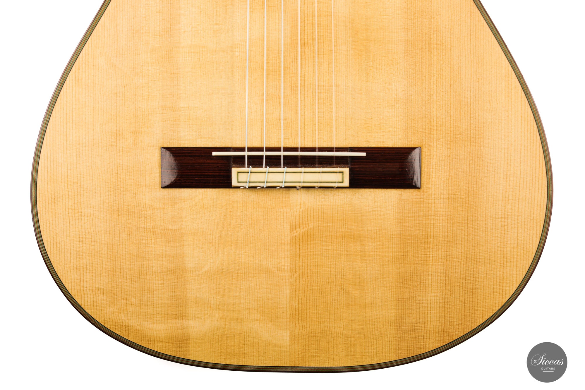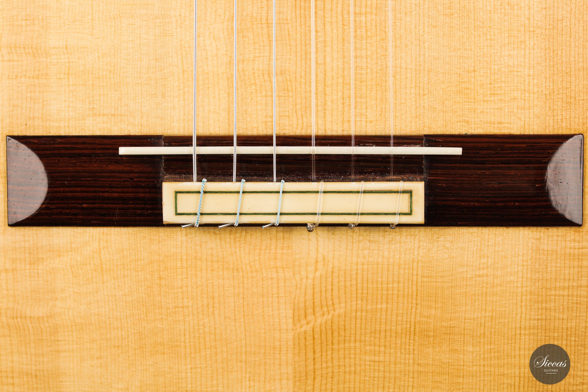The original guitar which this instrument is a copy of was owned by the guitarist Luise Walker. Her teacher, Miguel Llobet, personally brought the guitar from Santos Hernández’s workshop to Vienna in 1924. The basses have a wonderful warmth, and the responsiveness is fast and direct. Trebles that sing beautifully and the mids of the guitar is rich and colorful. It is an excellent guitar for performers, collectors or aficionados. There is a small repaired crack on the side where the rosewood meets the heel, it is well repaired and perfectly stable.