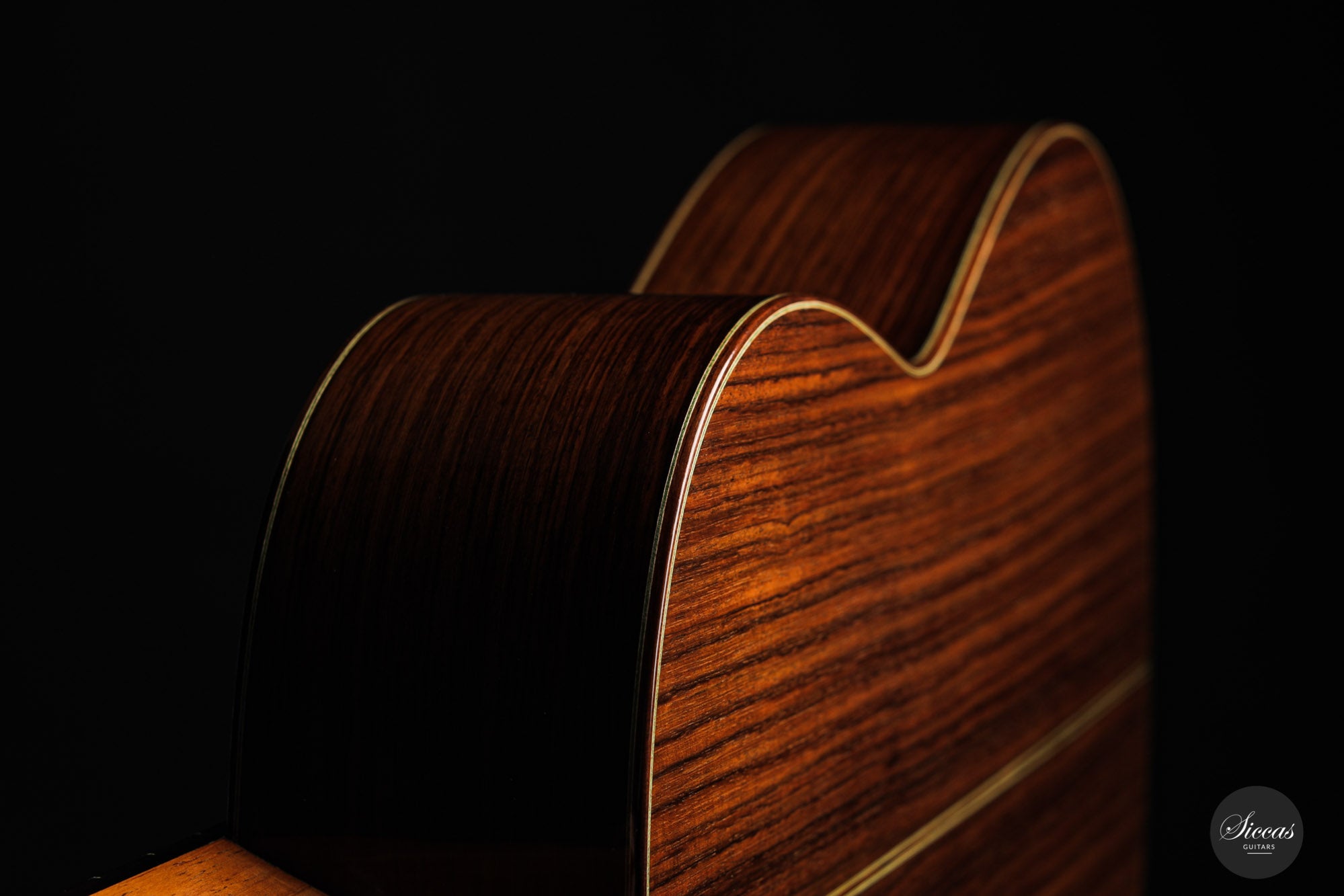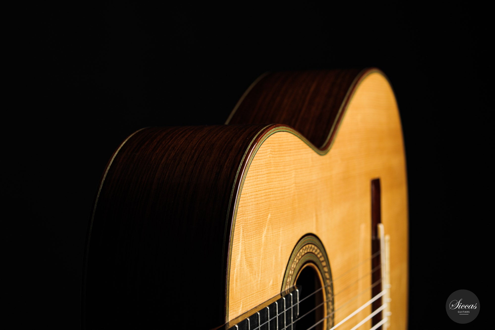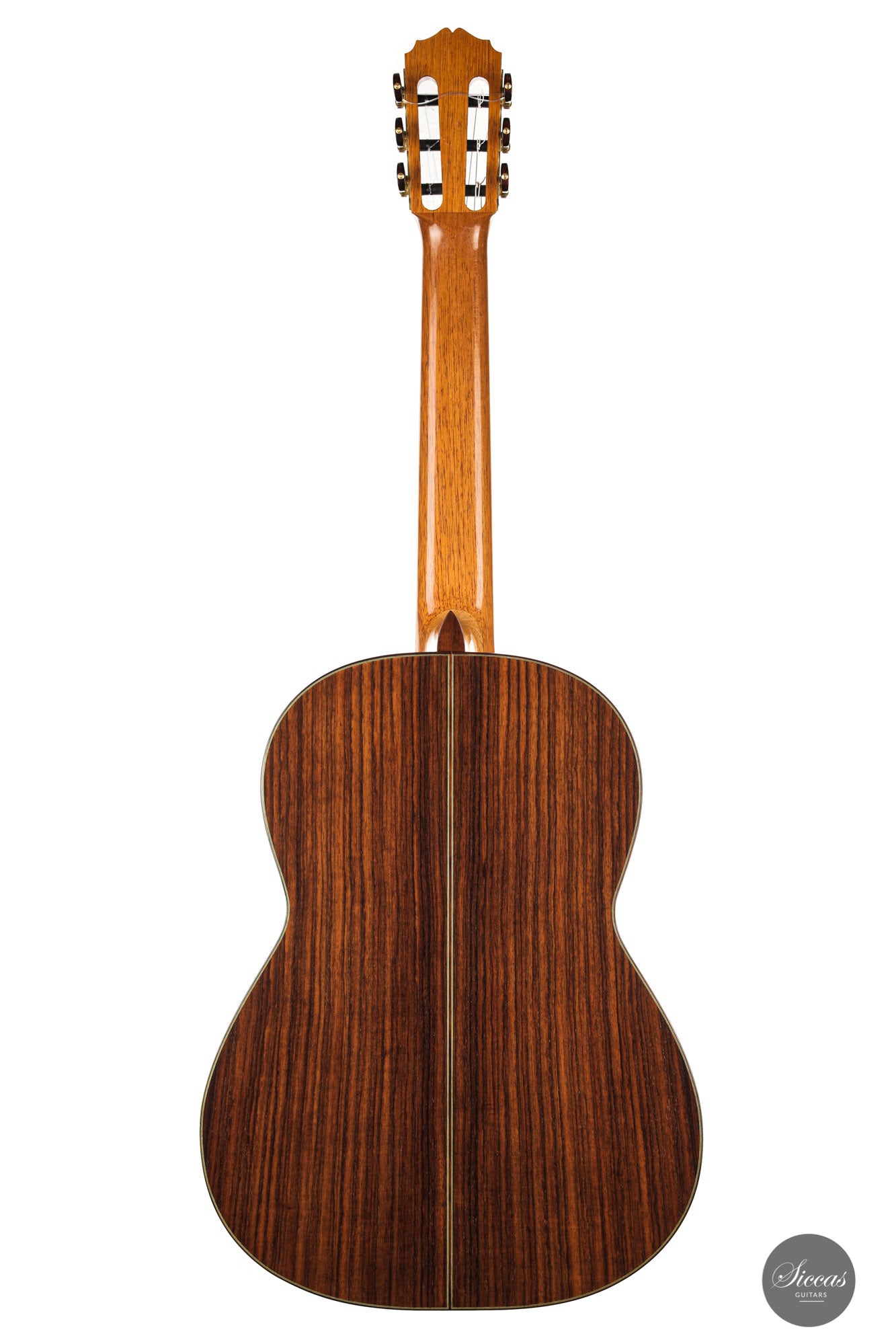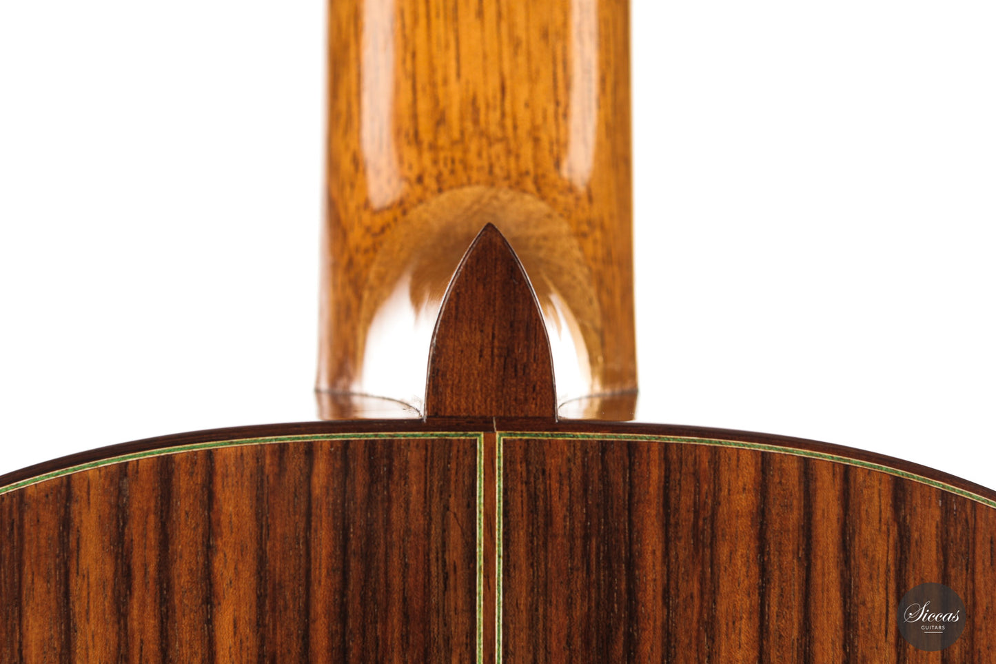 The original guitar which this instrument is a copy of was owned by the guitarist Luise Walker. Her teacher, Miguel Llobet, personally brought the guitar from Santos Hernández’s workshop to Vienna in 1924. The basses have a wonderful warmth, and the responsiveness is fast and direct. Trebles that sing beautifully and the mids of the guitar is rich and colorful. It is an excellent guitar for performers, collectors or aficionados. There is a small repaired crack on the side where the rosewood meets the heel, it is well repaired and perfectly stable.