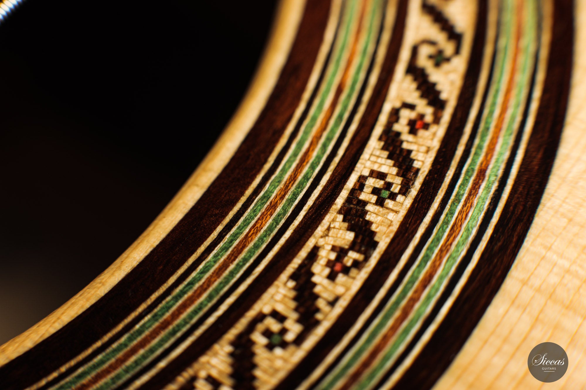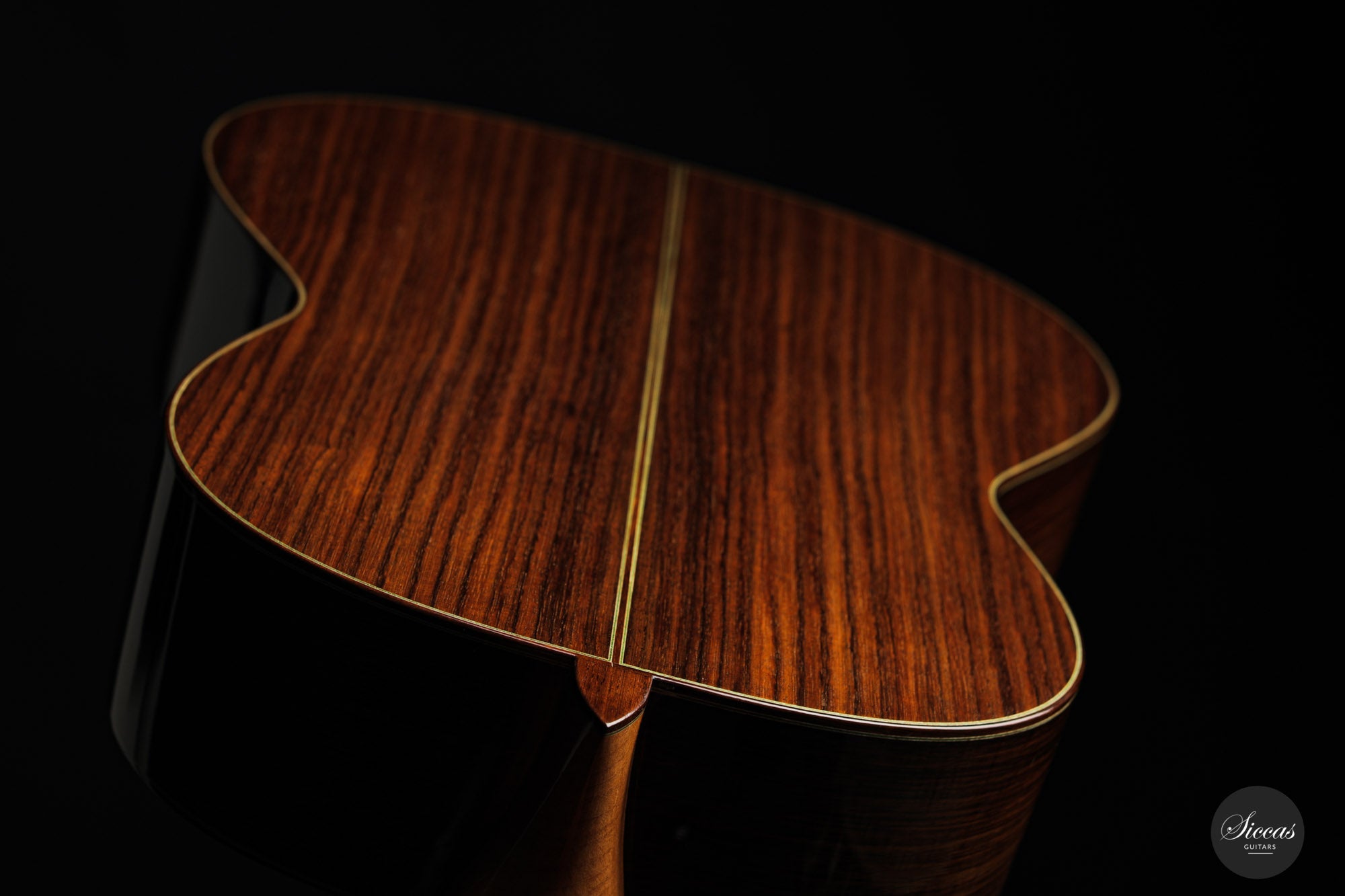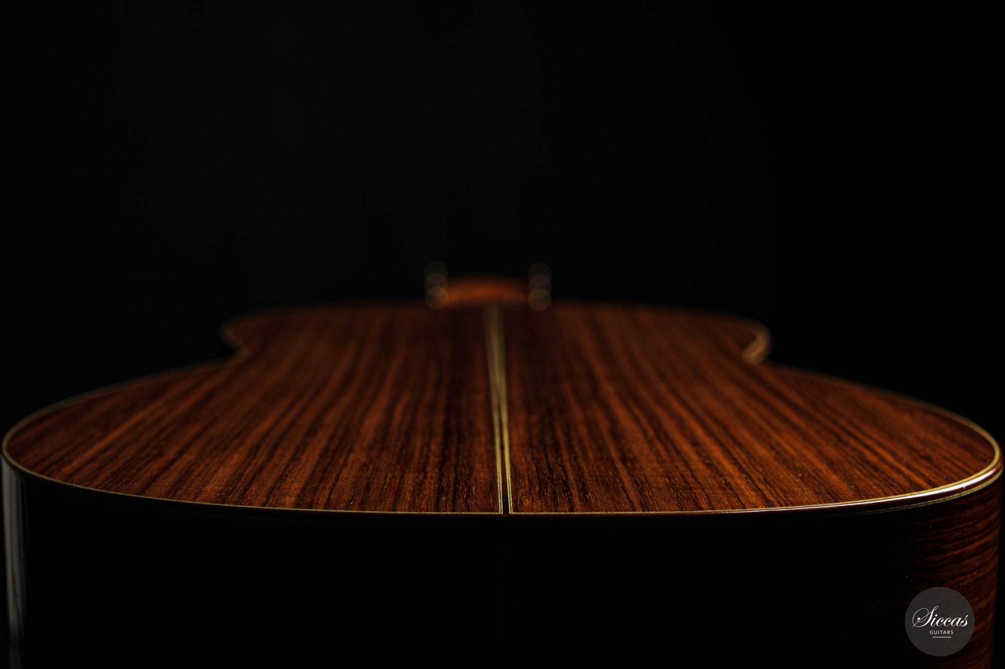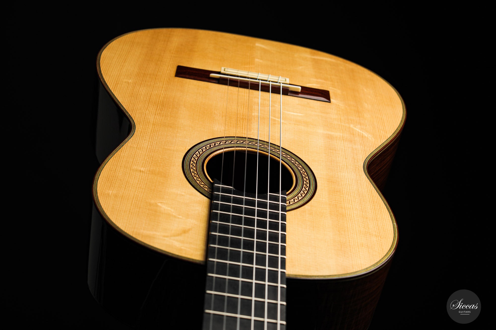The original guitar which this instrument is a copy of was owned by the guitarist Luise Walker. Her teacher, Miguel Llobet, personally brought the guitar from Santos Hernández’s workshop to Vienna in 1924. The basses have a wonderful warmth, and the responsiveness is fast and direct. Trebles that sing beautifully and the mids of the guitar is rich and colorful. It is an excellent guitar for performers, collectors or aficionados. There is a small repaired crack on the side where the rosewood meets the heel, it is well repaired and perfectly stable.