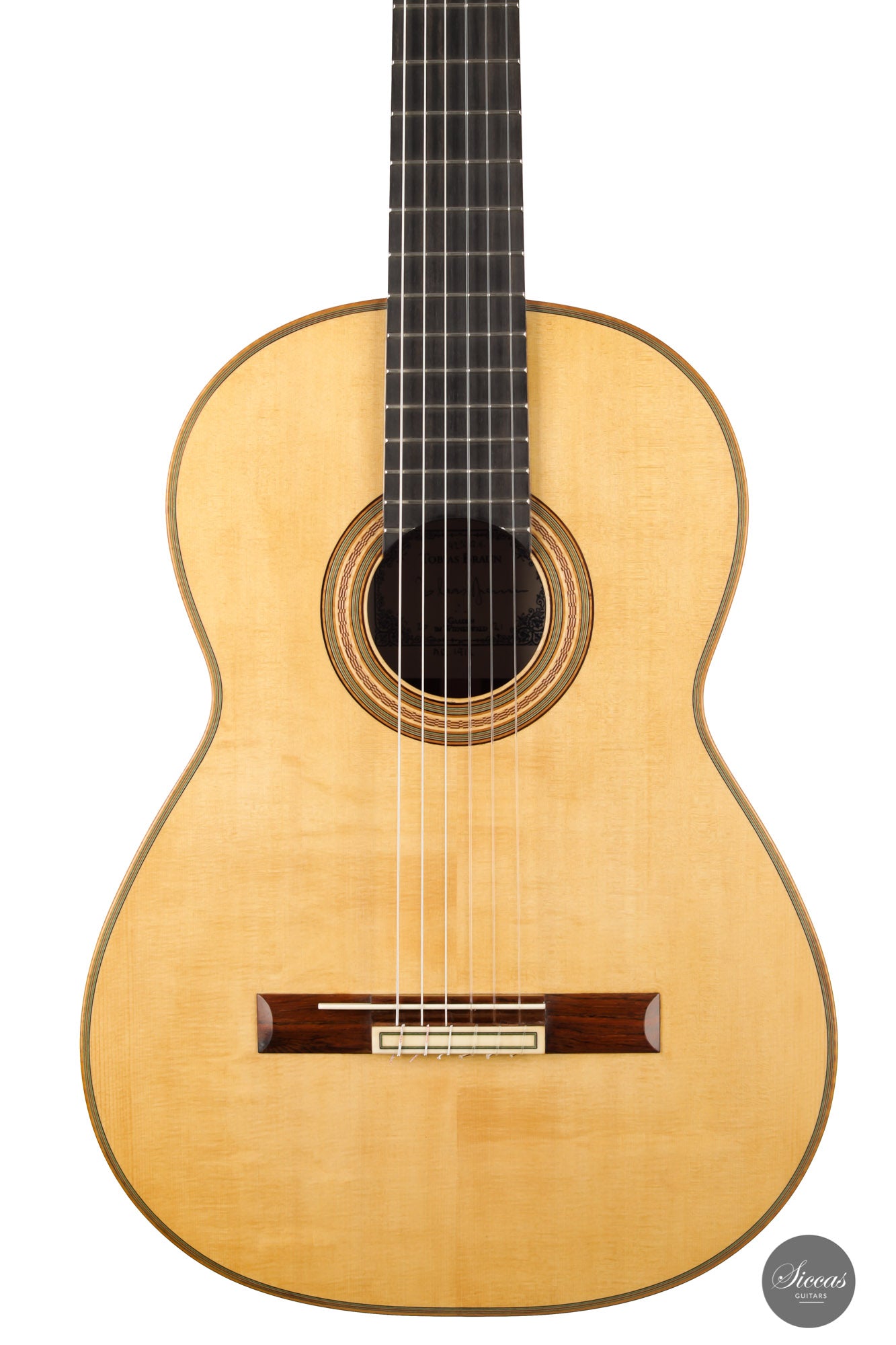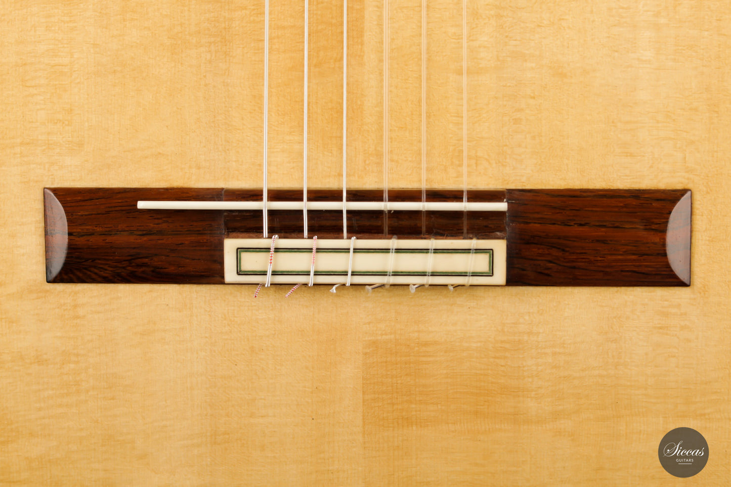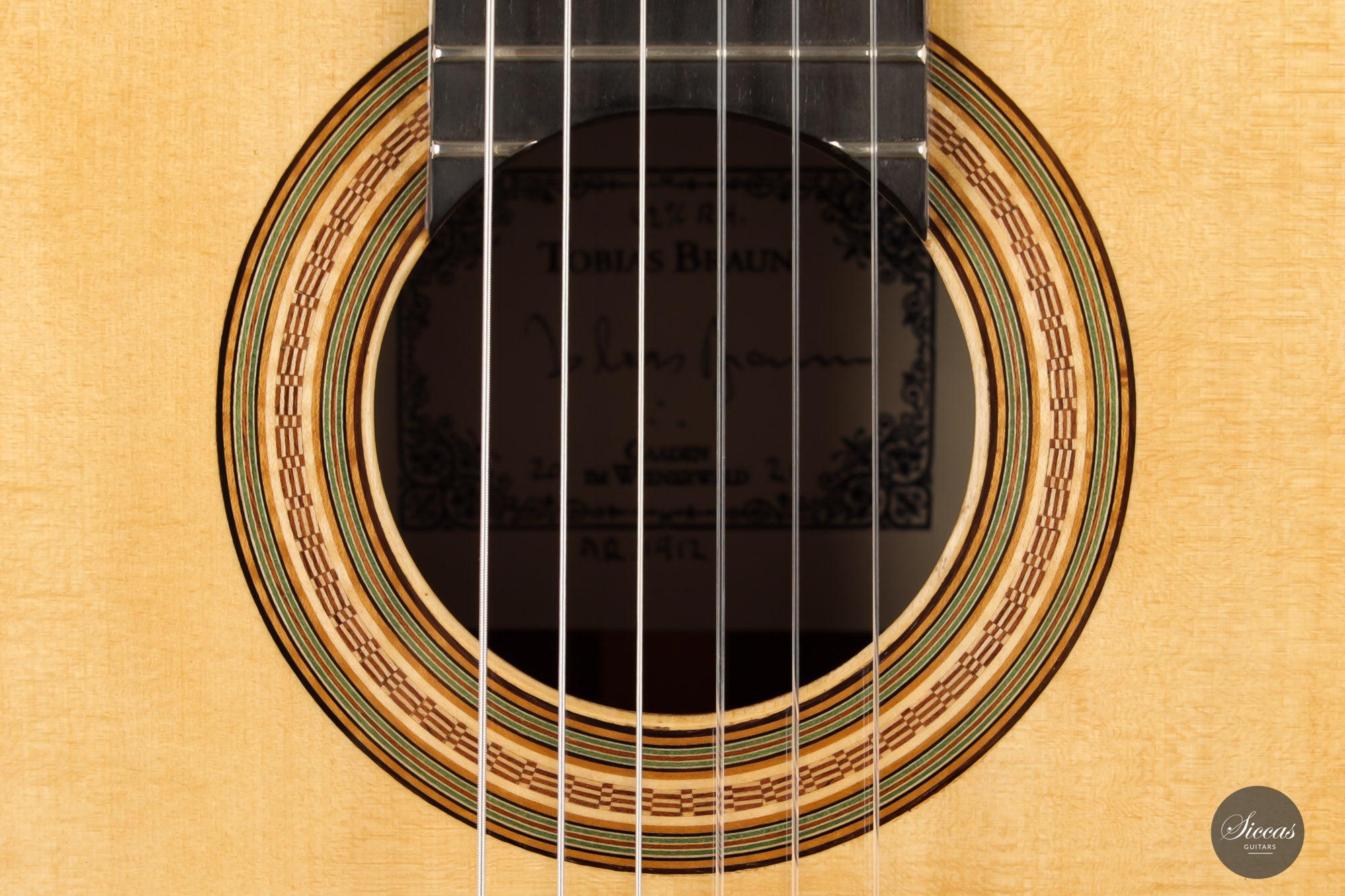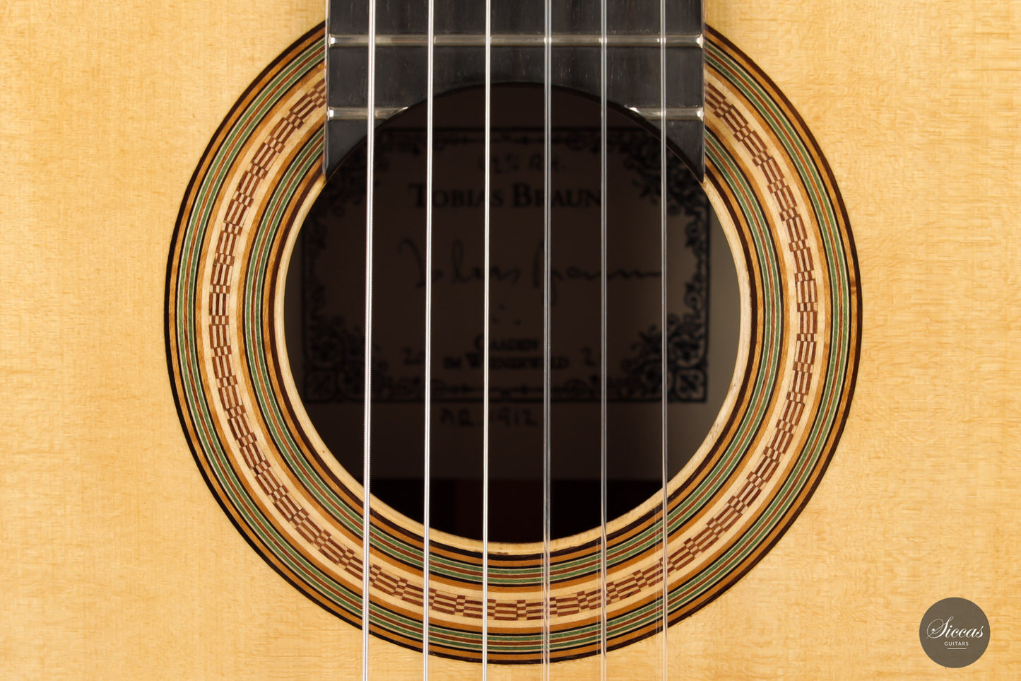 This guitar comes directly from the workshop of Tobias Braun and is strongly inspired by the guitar of Andrès Segovia, built in 1912 by Santos Hernandez for the workshop of Manuel Ramirez. One can see many beautiful reflections in the grain on this spruce, which in itself is a natural work of art. The back and sides are made of Indian rosewood and a fine maple inlay adorns the middle of the back. In addition, the rosette is decorated with green inlays. This same green colour can be found throughout the entire decoration of the guitar. An interesting detail is the very pronounced angle of the head, which is completely corresponding to the superior instruments from the famous Madrilenian workshop of Manuel Ramirez.