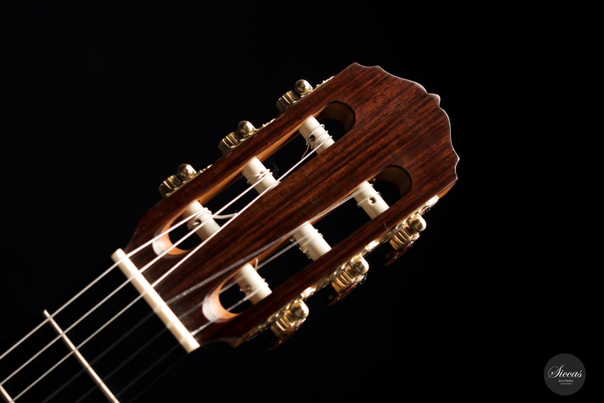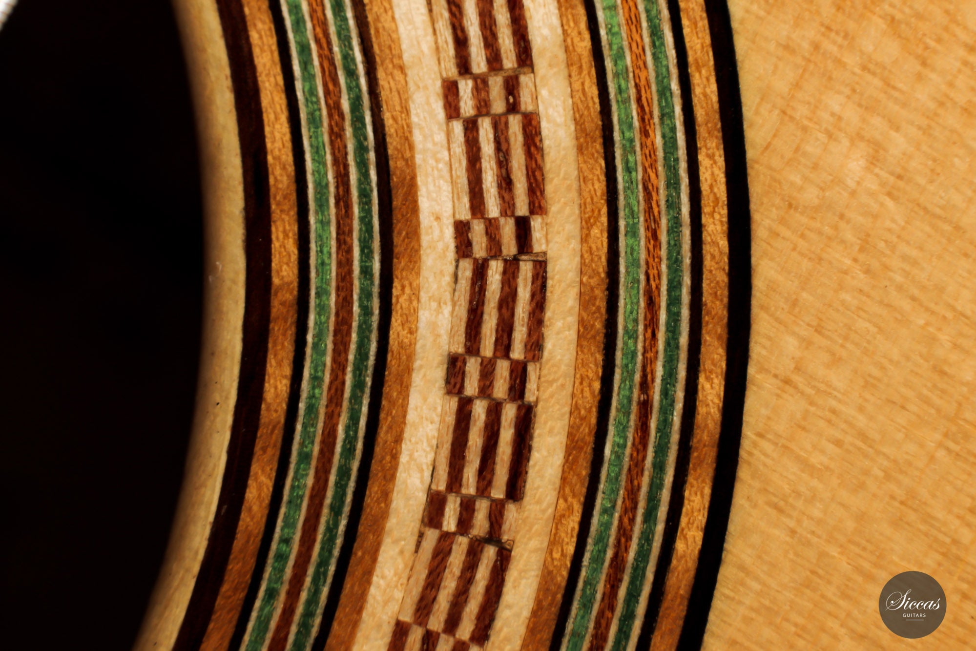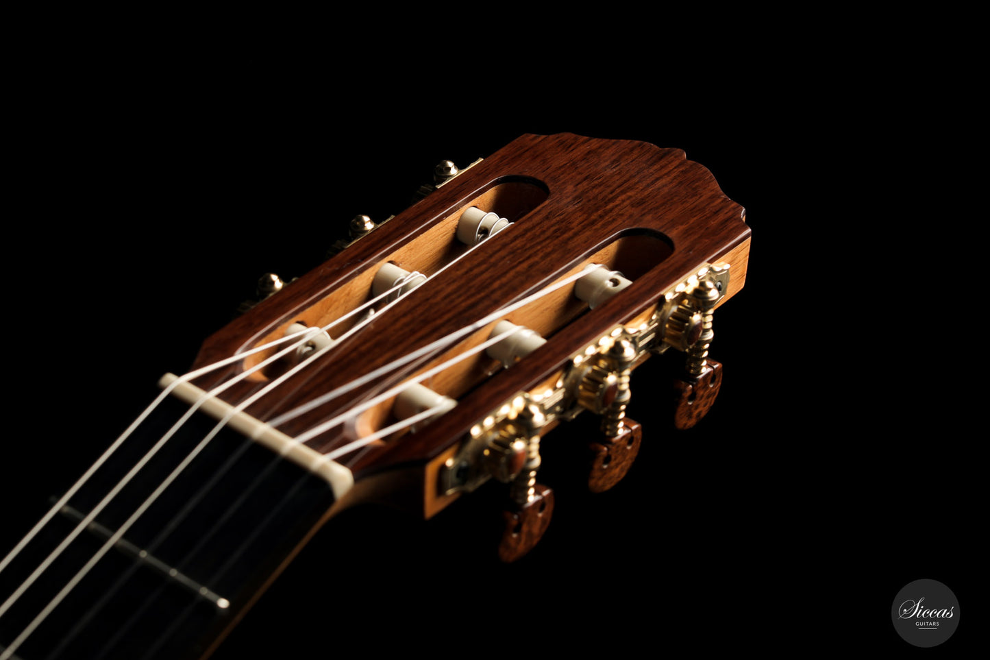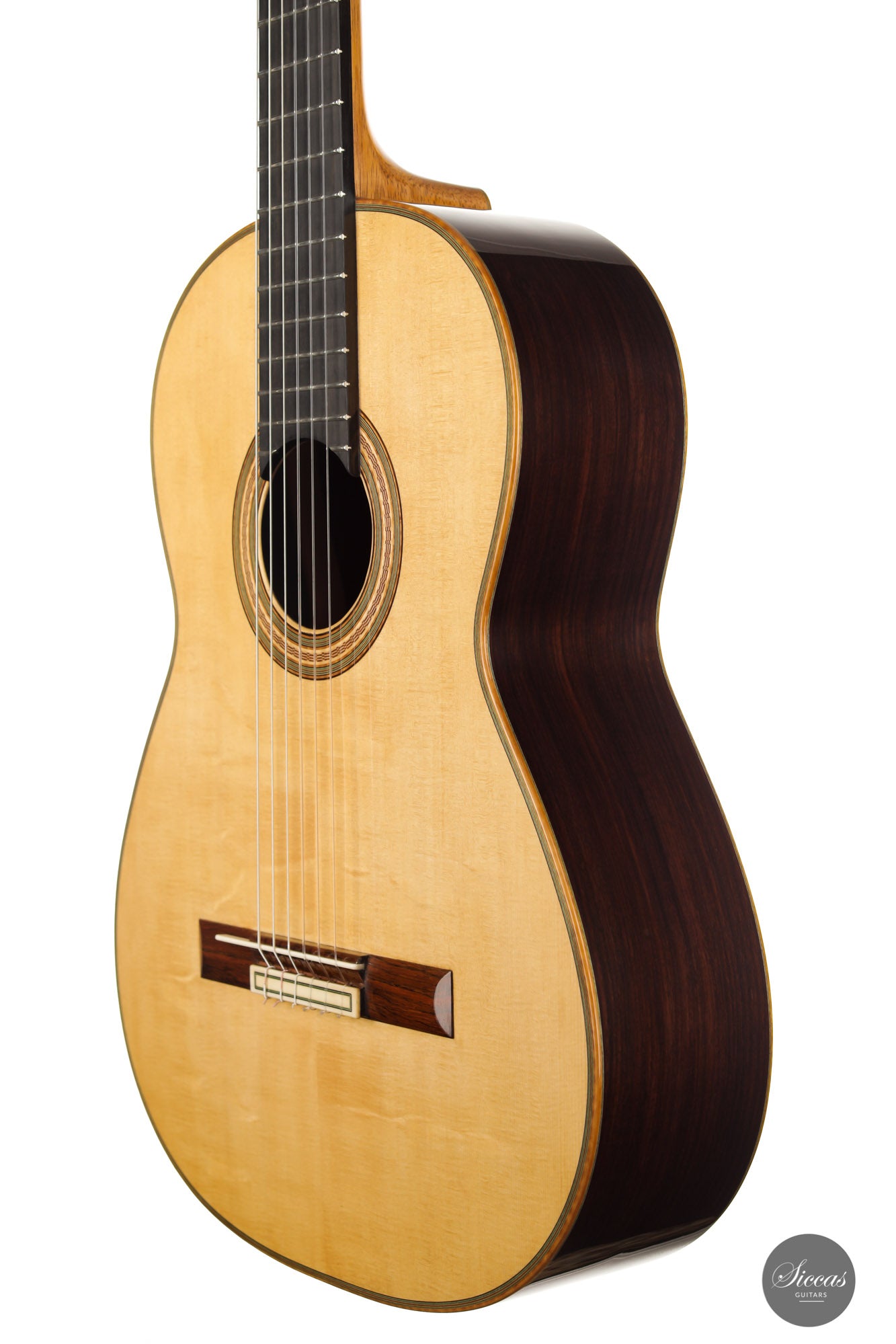 This guitar comes directly from the workshop of Tobias Braun and is strongly inspired by the guitar of Andrès Segovia, built in 1912 by Santos Hernandez for the workshop of Manuel Ramirez. One can see many beautiful reflections in the grain on this spruce, which in itself is a natural work of art. The back and sides are made of Indian rosewood and a fine maple inlay adorns the middle of the back. In addition, the rosette is decorated with green inlays. This same green colour can be found throughout the entire decoration of the guitar. An interesting detail is the very pronounced angle of the head, which is completely corresponding to the superior instruments from the famous Madrilenian workshop of Manuel Ramirez.