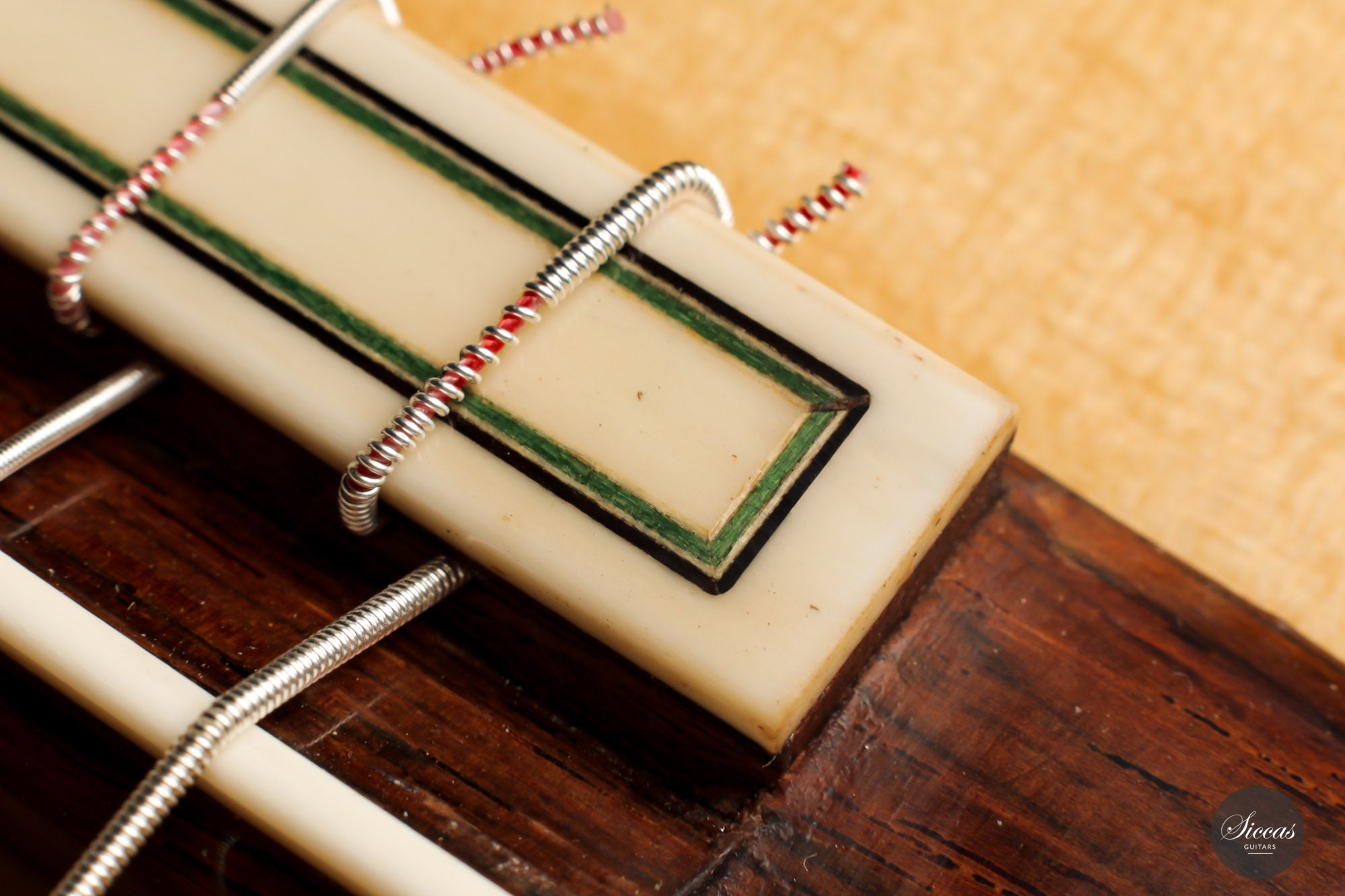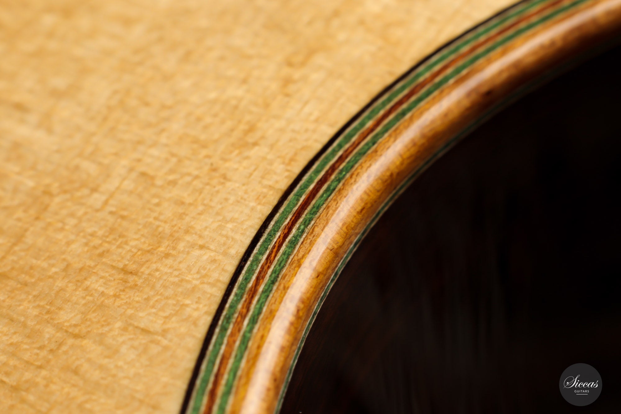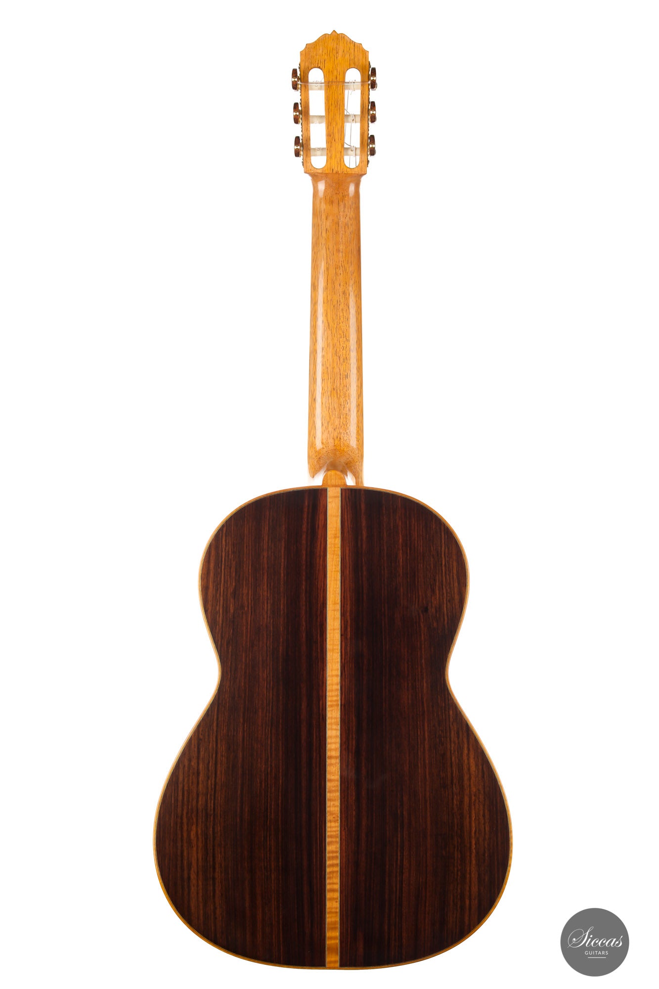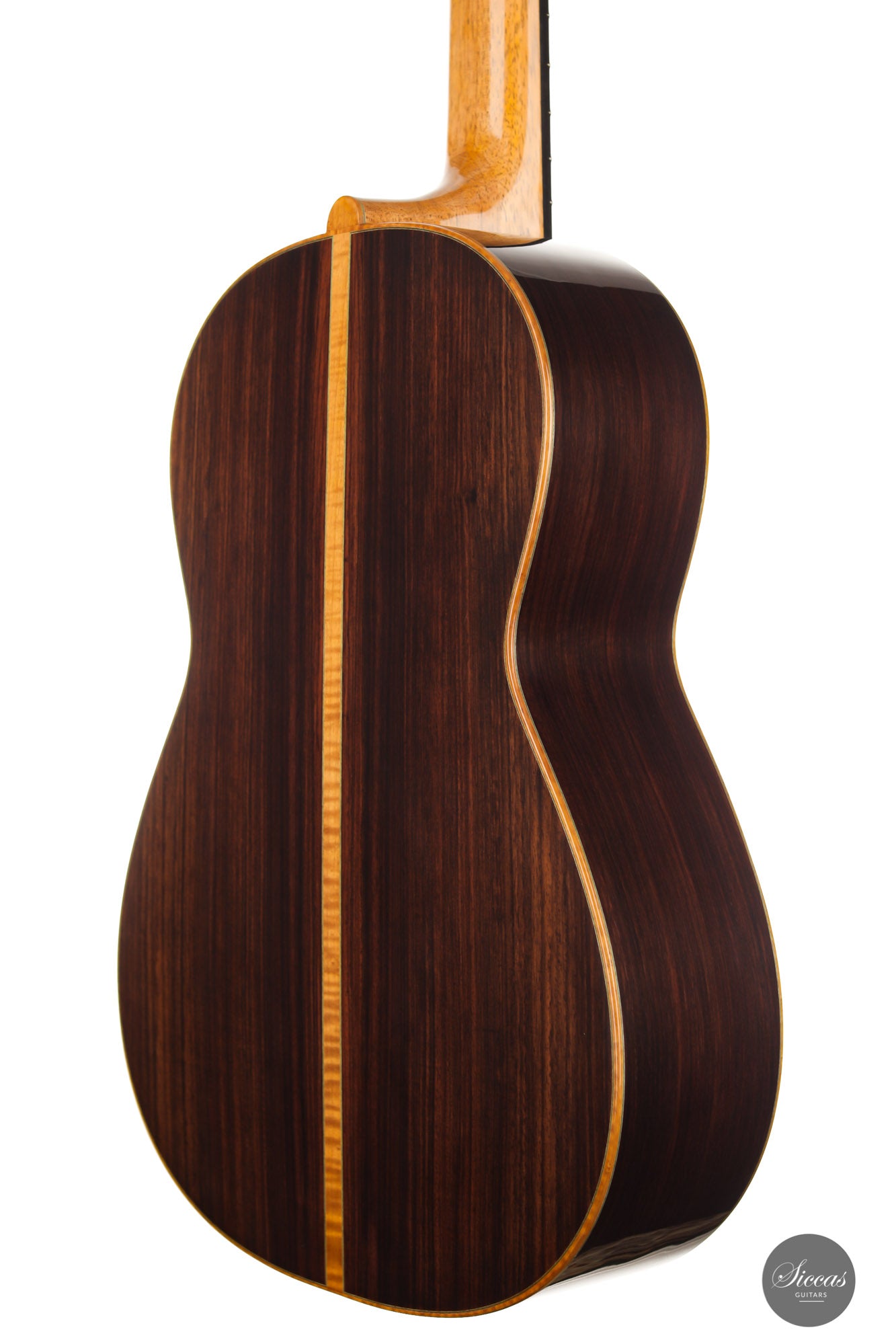 This guitar comes directly from the workshop of Tobias Braun and is strongly inspired by the guitar of Andrès Segovia, built in 1912 by Santos Hernandez for the workshop of Manuel Ramirez. One can see many beautiful reflections in the grain on this spruce, which in itself is a natural work of art. The back and sides are made of Indian rosewood and a fine maple inlay adorns the middle of the back. In addition, the rosette is decorated with green inlays. This same green colour can be found throughout the entire decoration of the guitar. An interesting detail is the very pronounced angle of the head, which is completely corresponding to the superior instruments from the famous Madrilenian workshop of Manuel Ramirez.