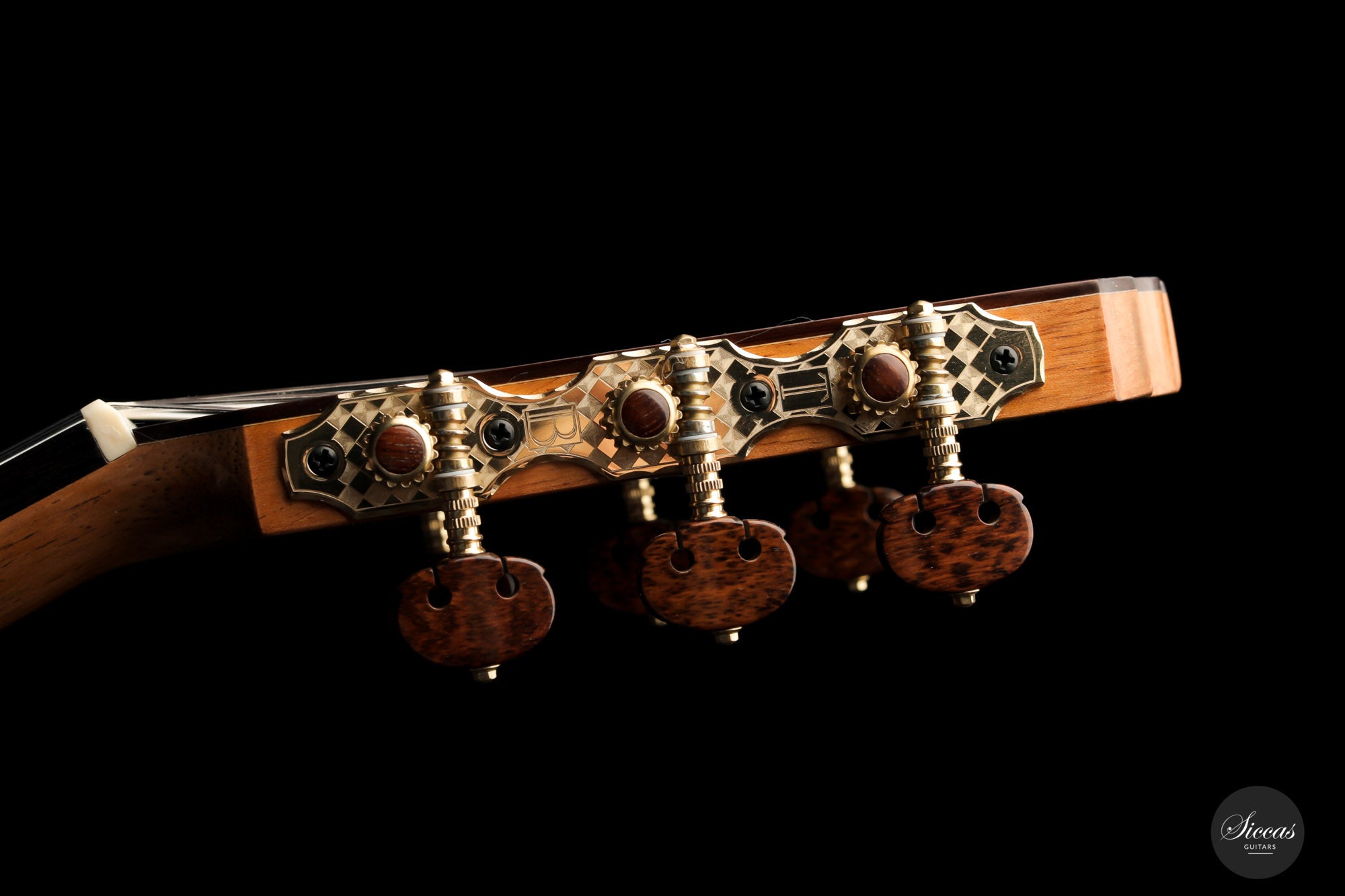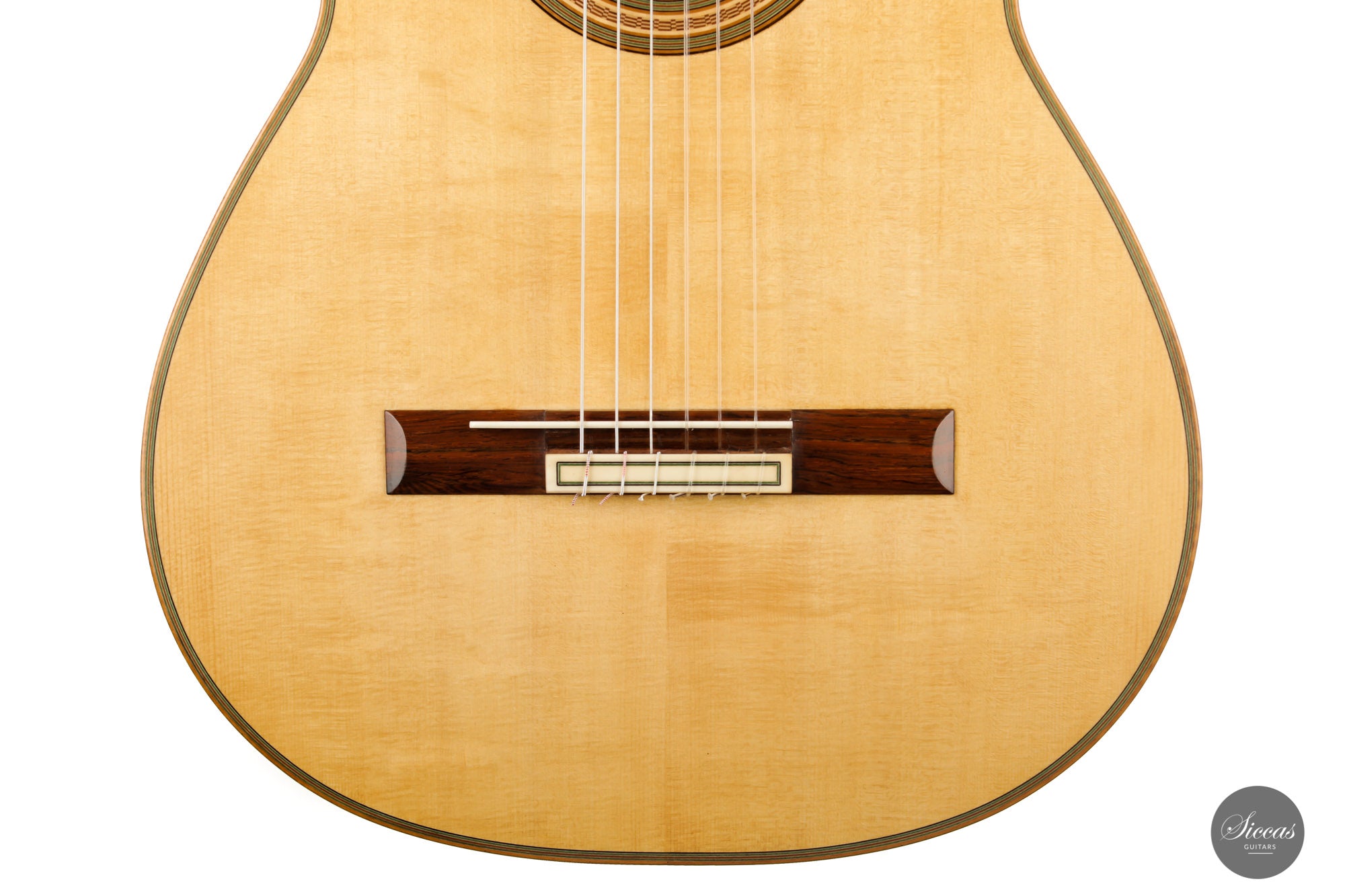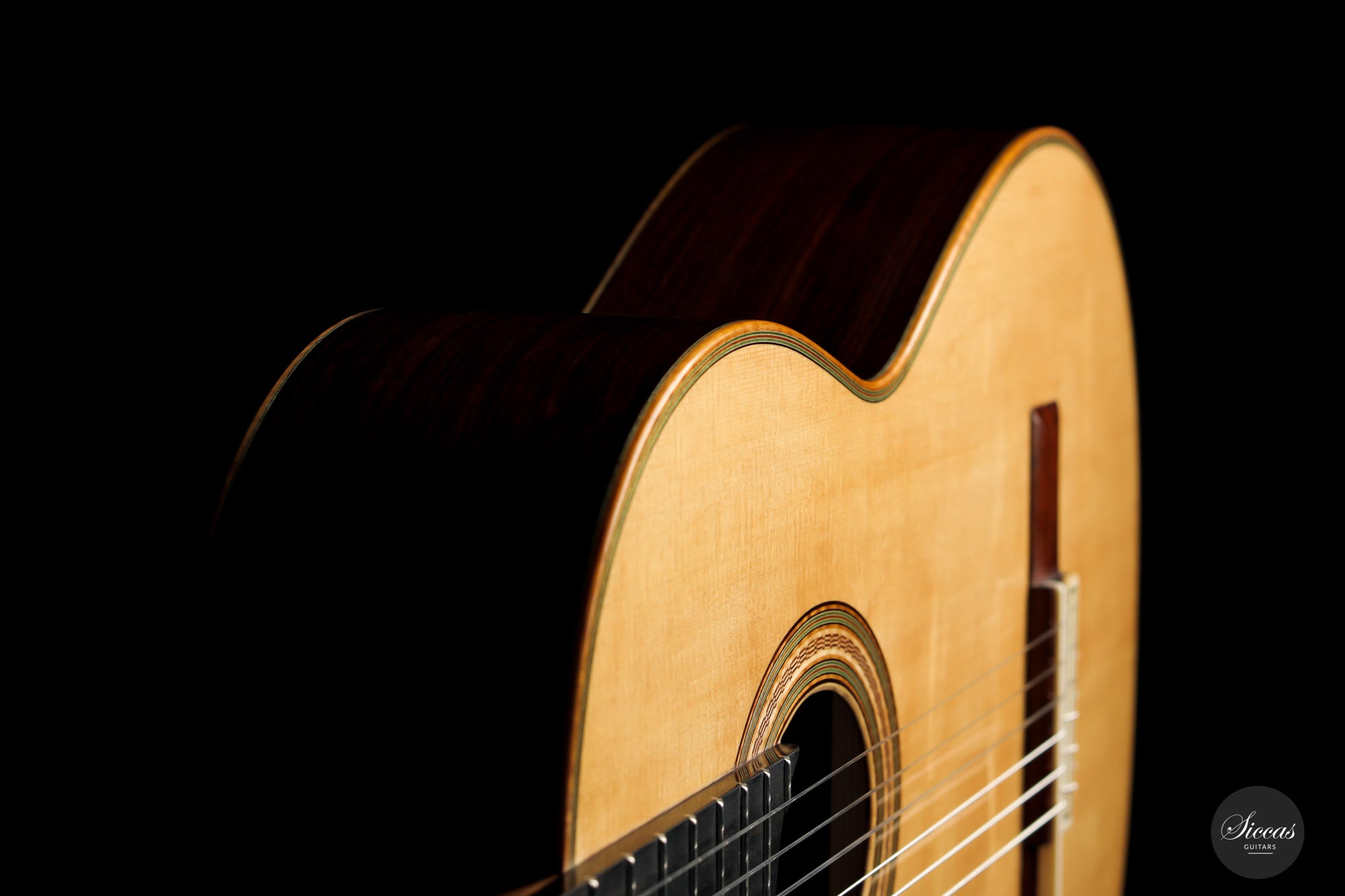 A wonderful charm and an enveloping warmth of sound emanate from this instrument. This reflects exactly the characteristics and the magic that is inherent in the early 20th century Madrilenian guitars, namely a deep, inspiring Spanish tone, whose elegant and complex melodic first string makes the guitar sing so beautifully. In addition, the basses sound warm and captivating and especially carrying, which gives this instrument an authentic character.