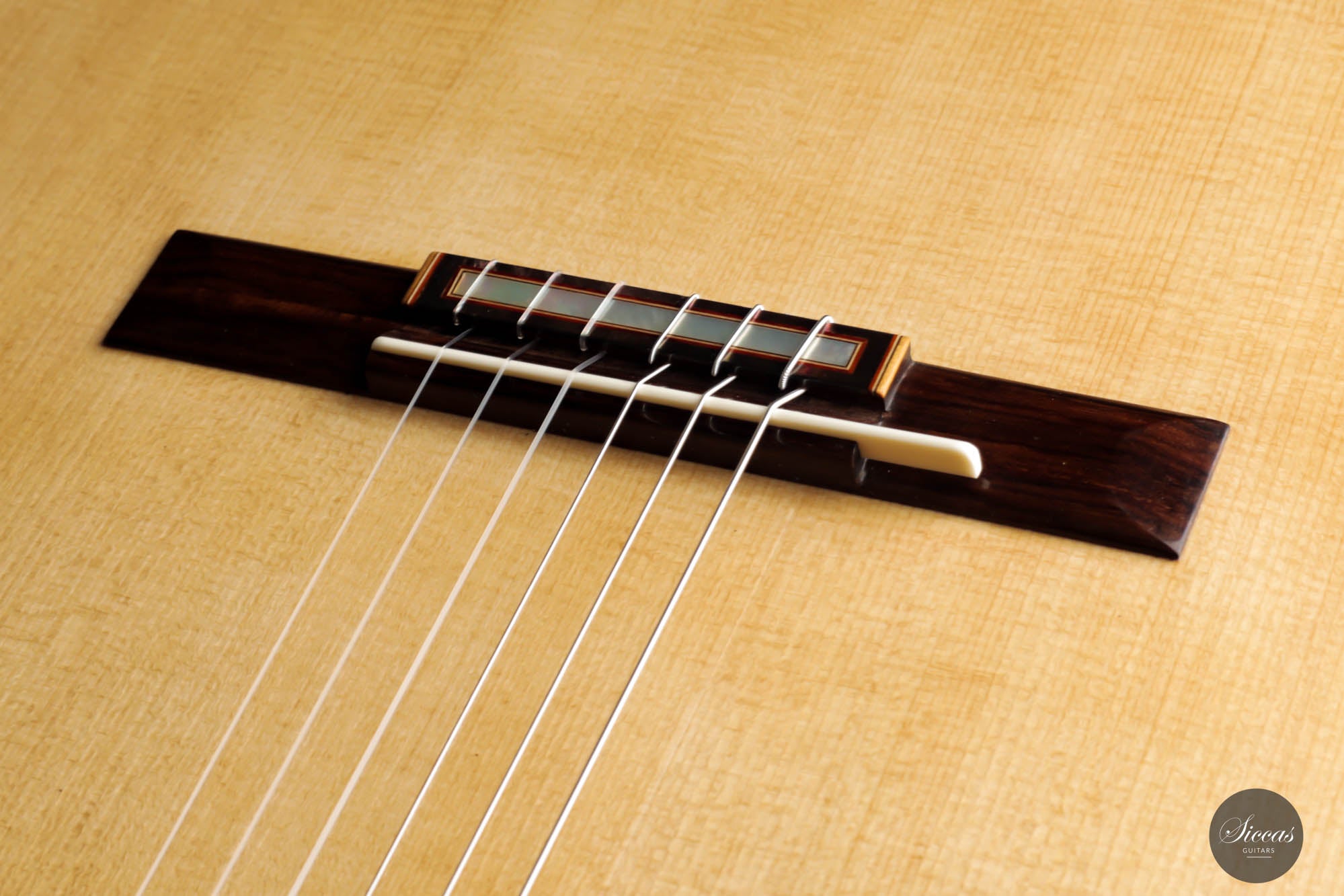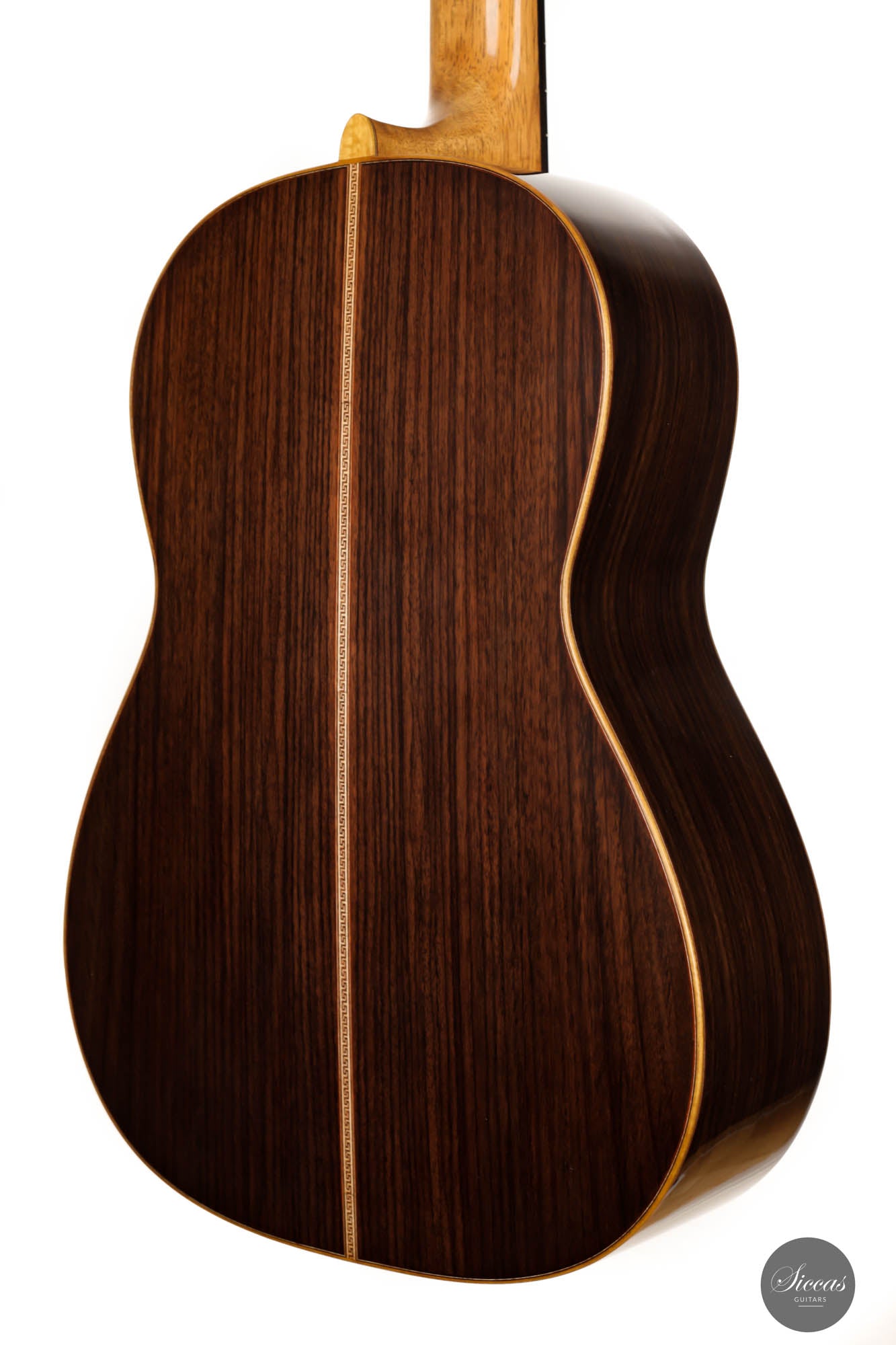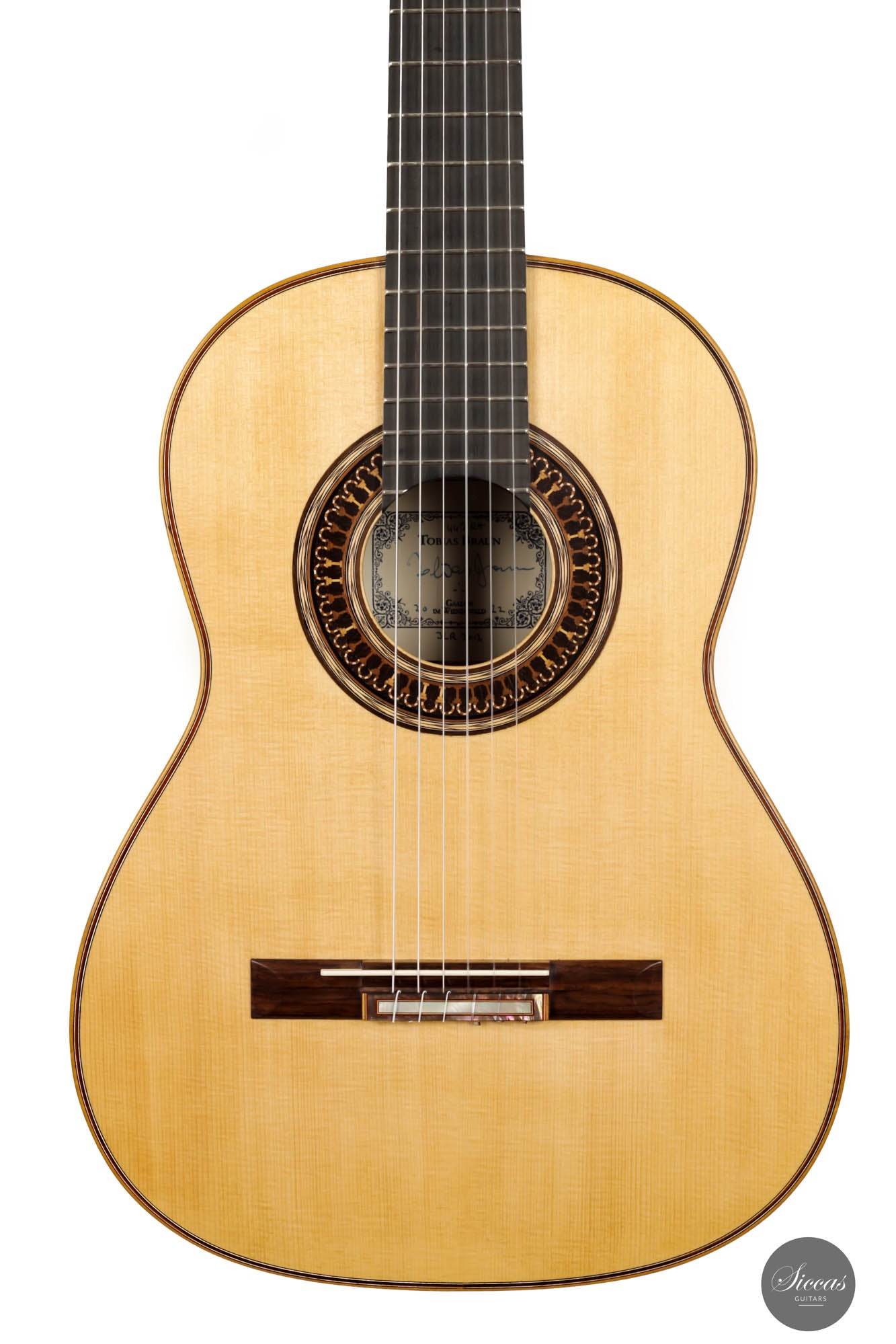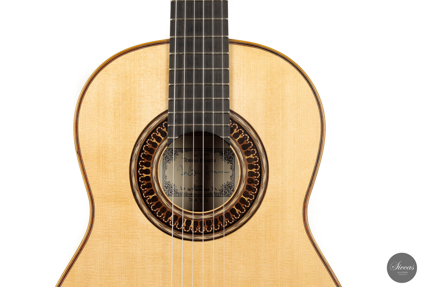 Tobias Braun is one of the few guitar makers with a long history with the Romanillos family. This instrument results from an excellent understanding of Jose's instrument, particularly the 2012 Jose L. Romanillos, on which this guitar is based. Tobias has successfully created a beautiful reminiscence of the original through this instrument. The gorgeous spruce soundboard is decorated tastefully according to Jose's guitars and executed to the highest level of craftsmanship. Meanwhile, the striking Indian Rosewood back and sides complement the look of this guitar to the next level. Acoustically, this guitar represents the broad color palette of Jose L. Romanillos' guitar. Not only that, but it also has the overall feel of the original.