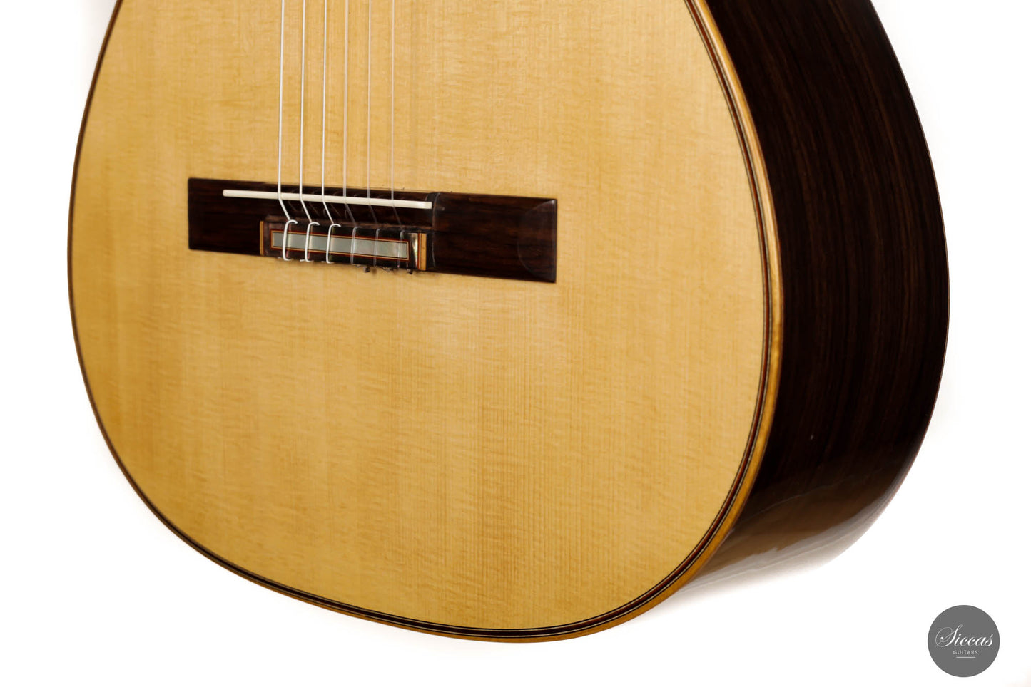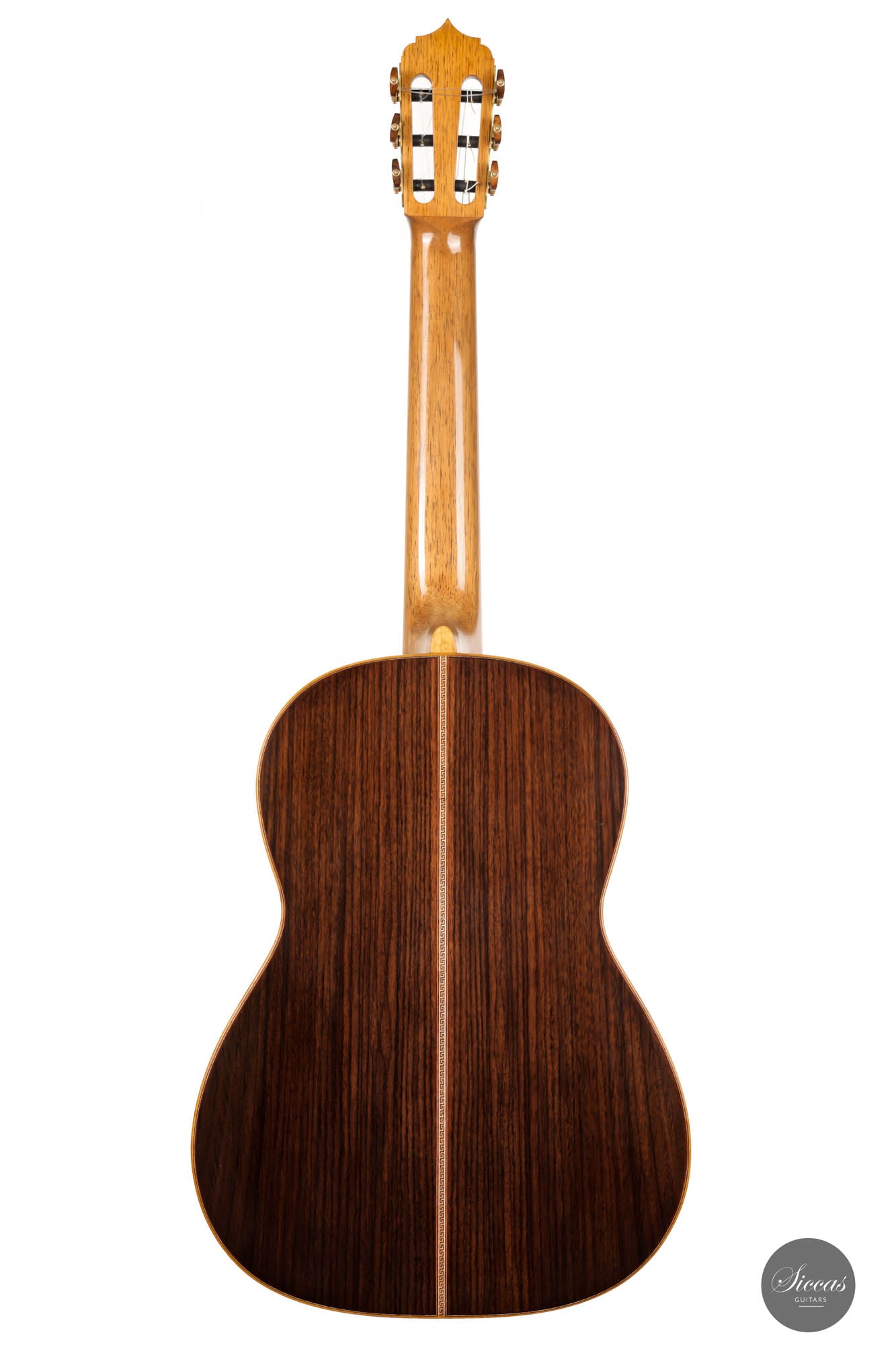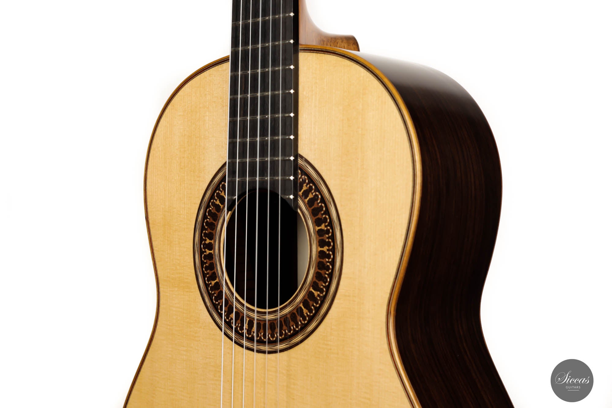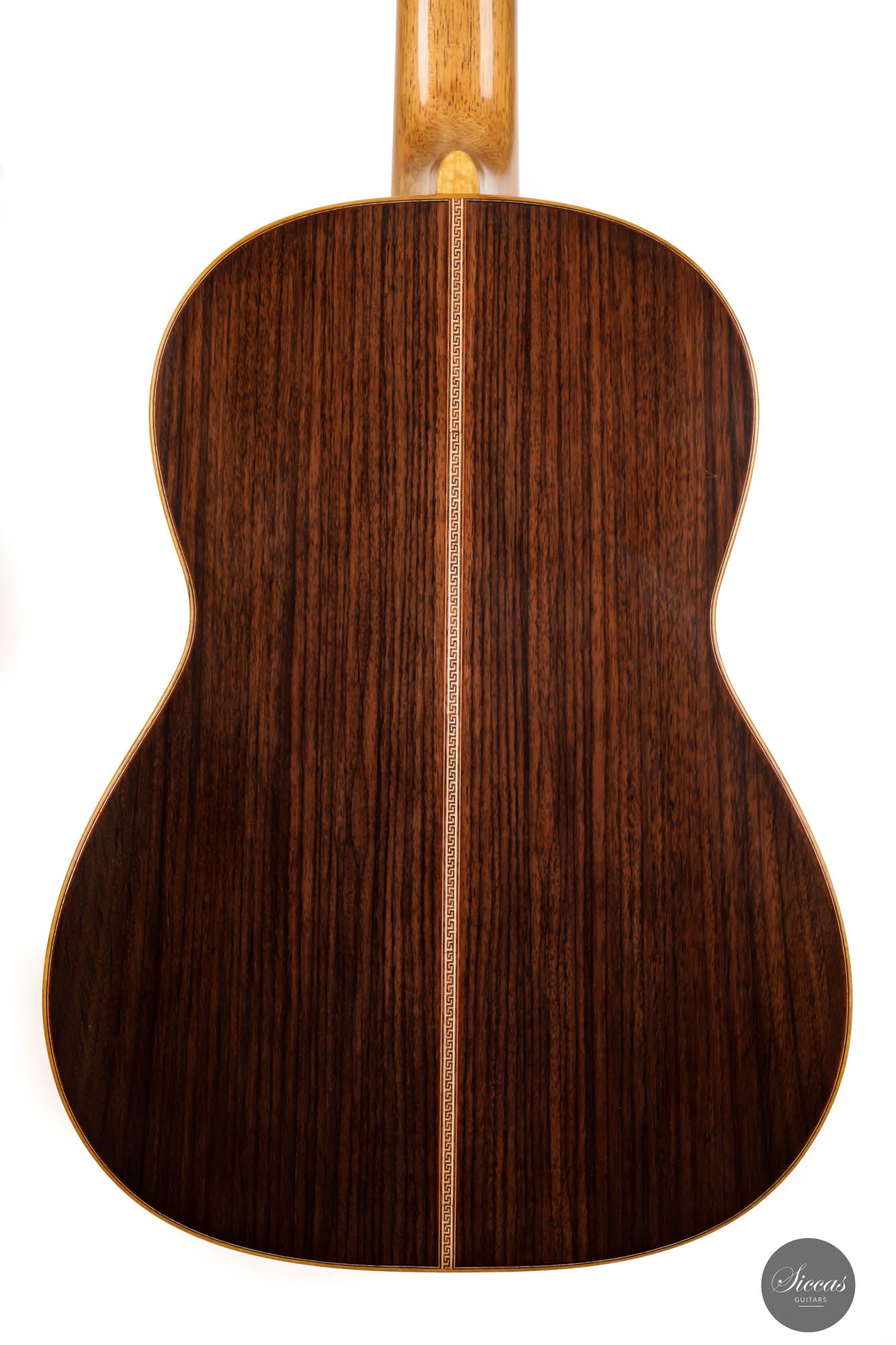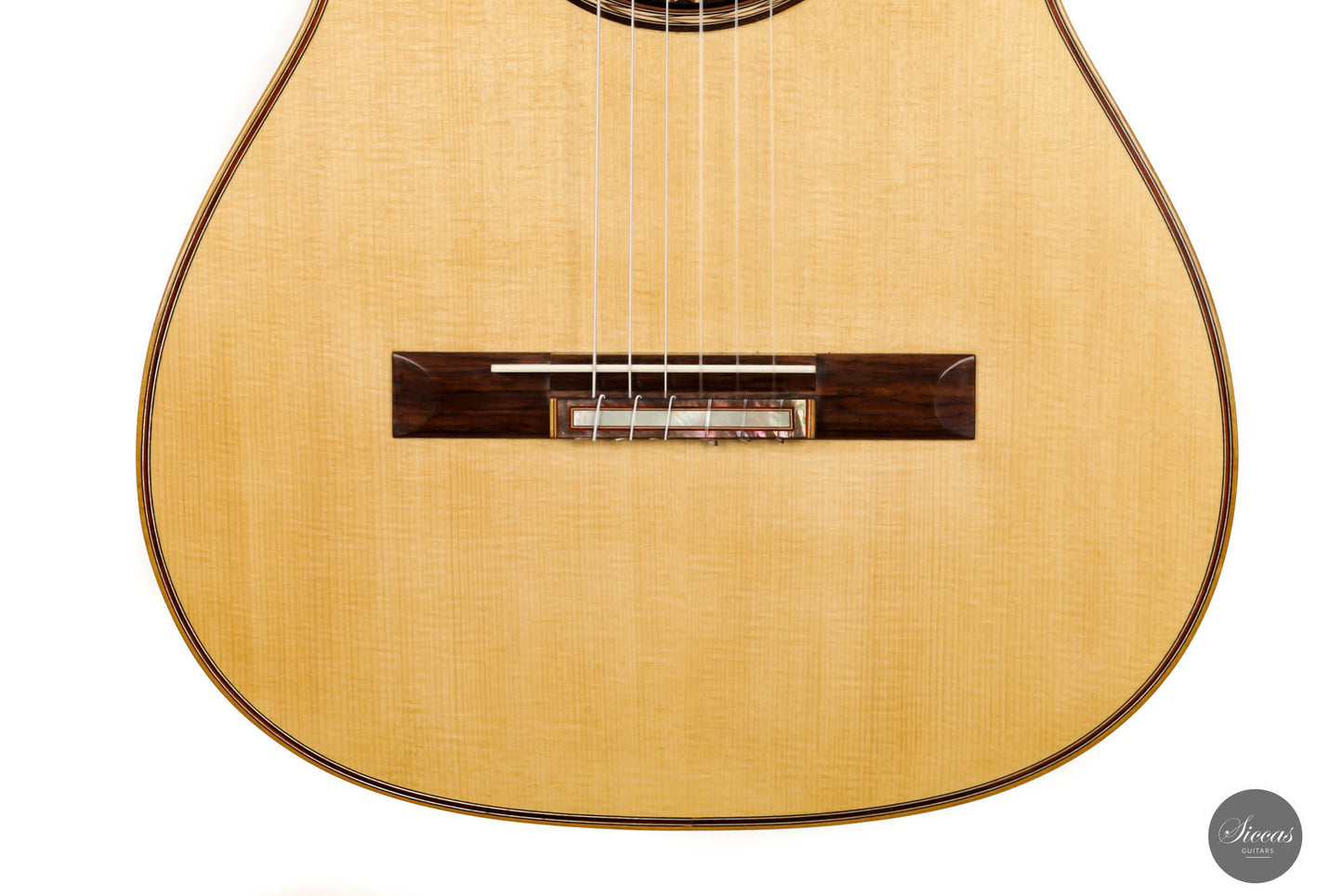 Tobias Braun is one of the few guitar makers with a long history with the Romanillos family. This instrument results from an excellent understanding of Jose's instrument, particularly the 2012 Jose L. Romanillos, on which this guitar is based. Tobias has successfully created a beautiful reminiscence of the original through this instrument. The gorgeous spruce soundboard is decorated tastefully according to Jose's guitars and executed to the highest level of craftsmanship. Meanwhile, the striking Indian Rosewood back and sides complement the look of this guitar to the next level. Acoustically, this guitar represents the broad color palette of Jose L. Romanillos' guitar. Not only that, but it also has the overall feel of the original.