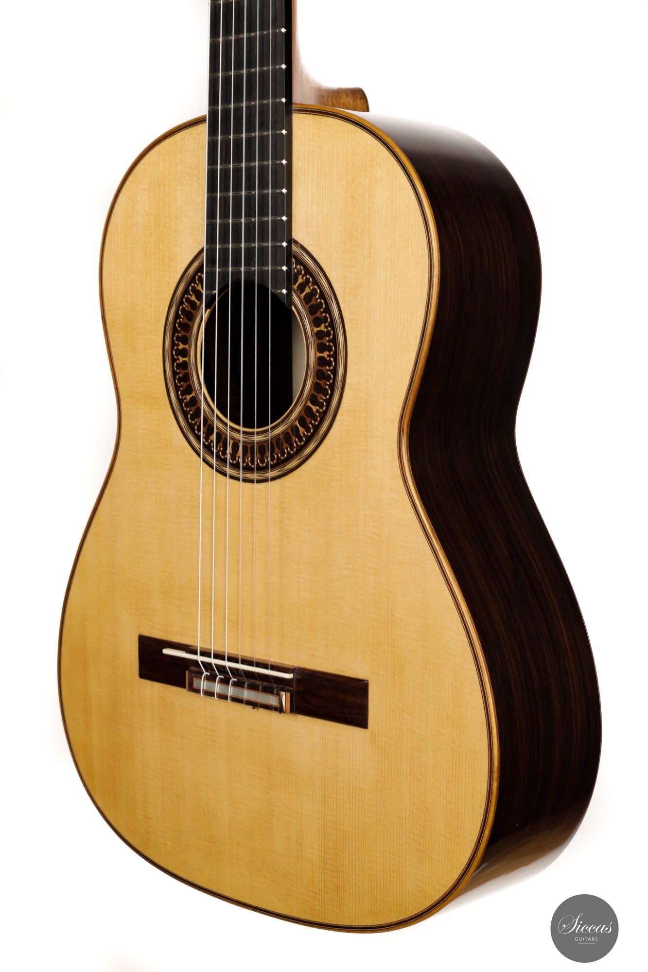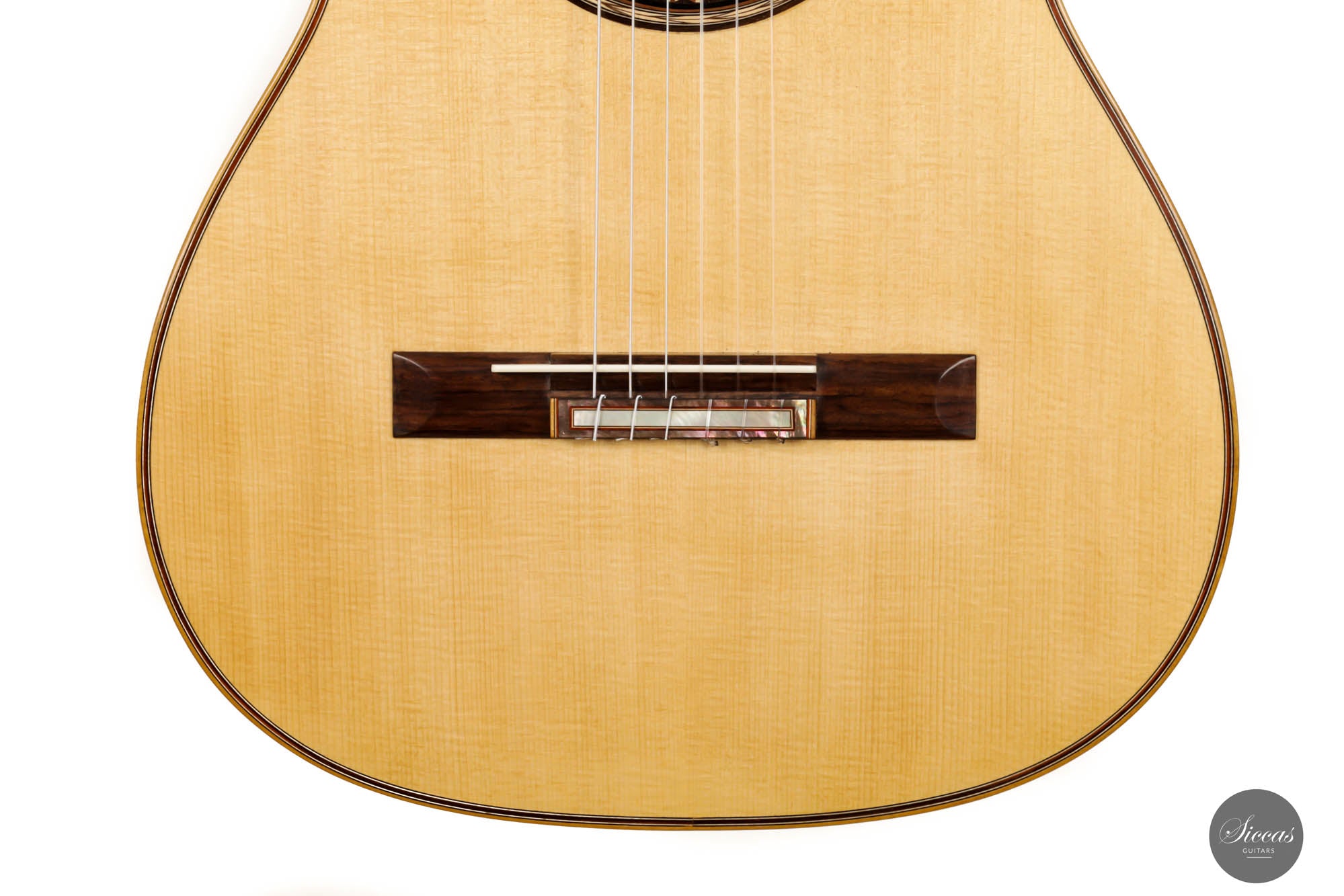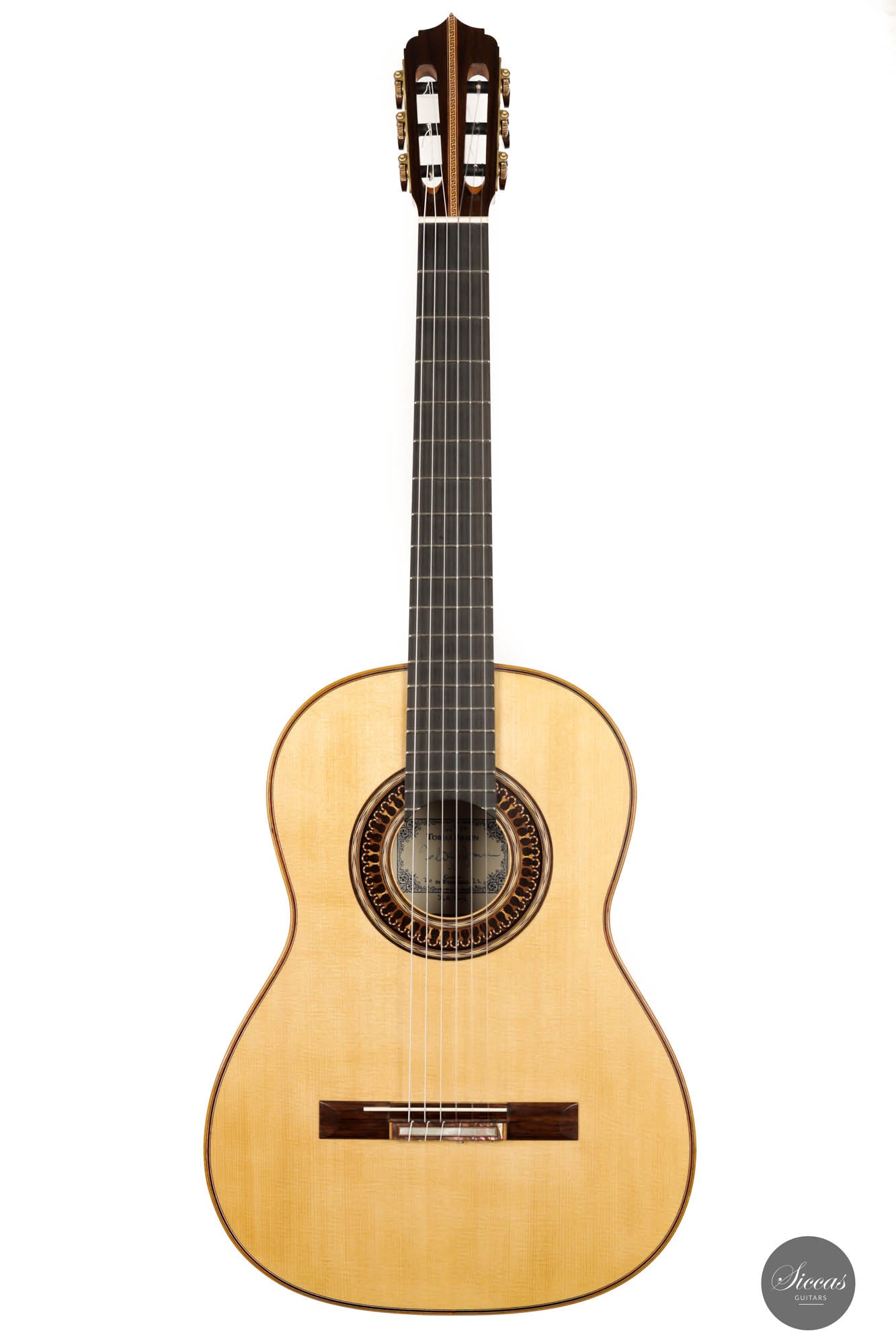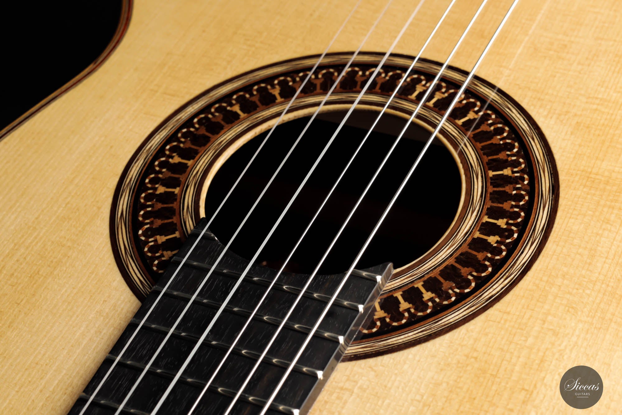 Tobias Braun is one of the few guitar makers with a long history with the Romanillos family. This instrument results from an excellent understanding of Jose's instrument, particularly the 2012 Jose L. Romanillos, on which this guitar is based. Tobias has successfully created a beautiful reminiscence of the original through this instrument. The gorgeous spruce soundboard is decorated tastefully according to Jose's guitars and executed to the highest level of craftsmanship. Meanwhile, the striking Indian Rosewood back and sides complement the look of this guitar to the next level. Acoustically, this guitar represents the broad color palette of Jose L. Romanillos' guitar. Not only that, but it also has the overall feel of the original.