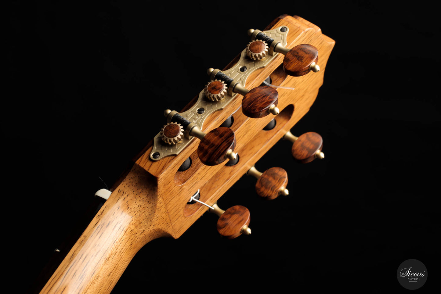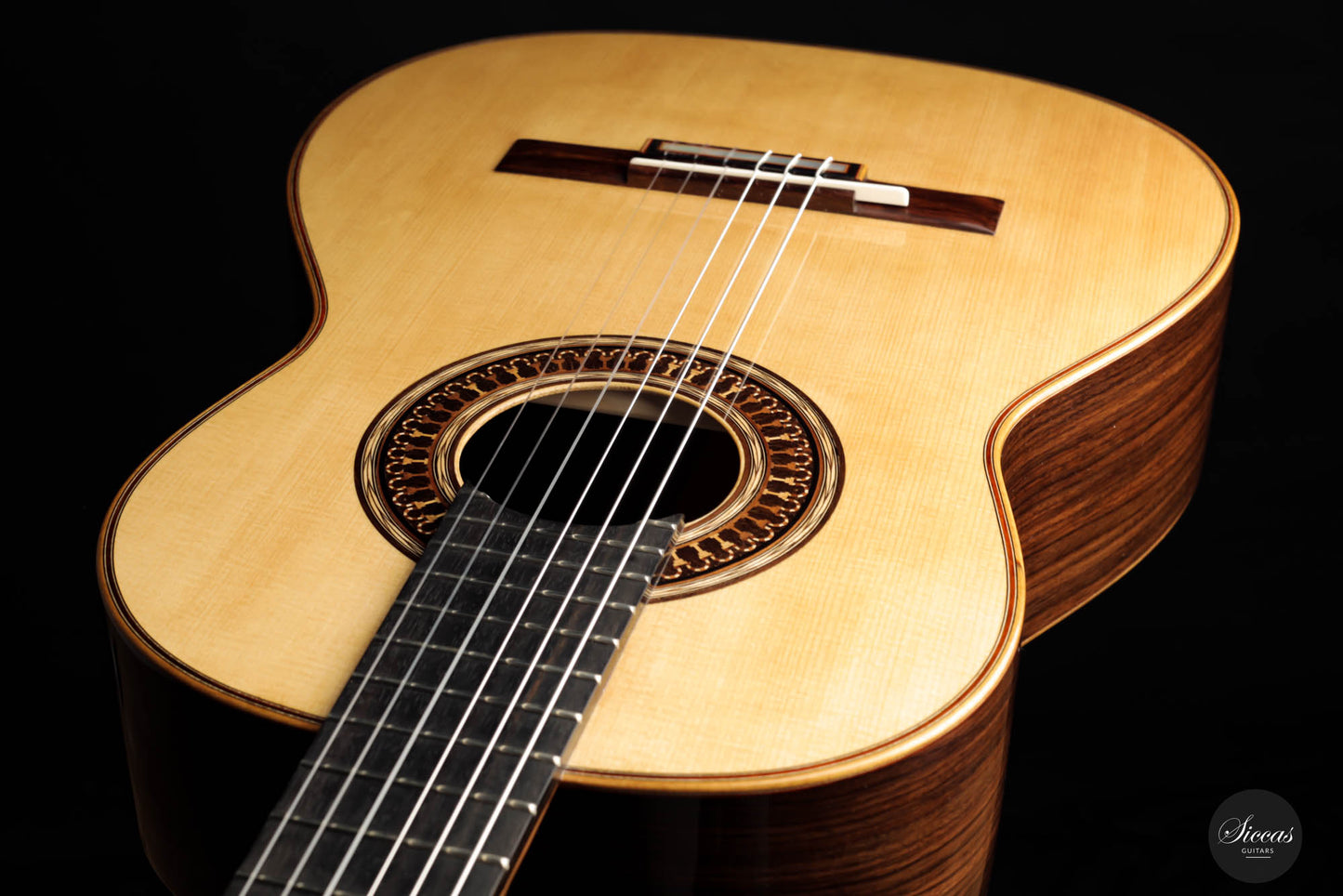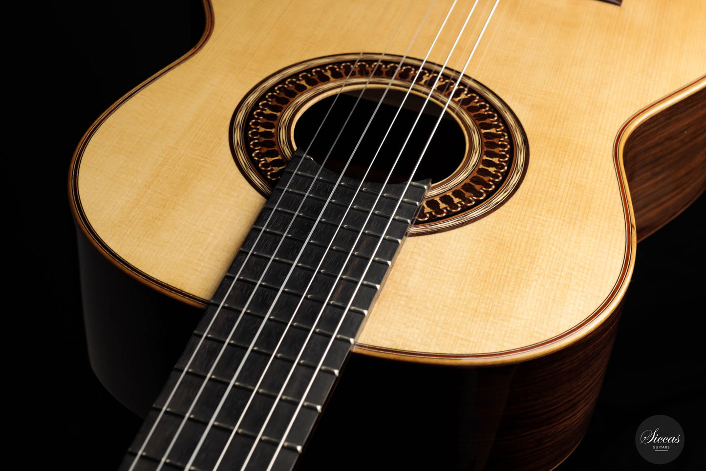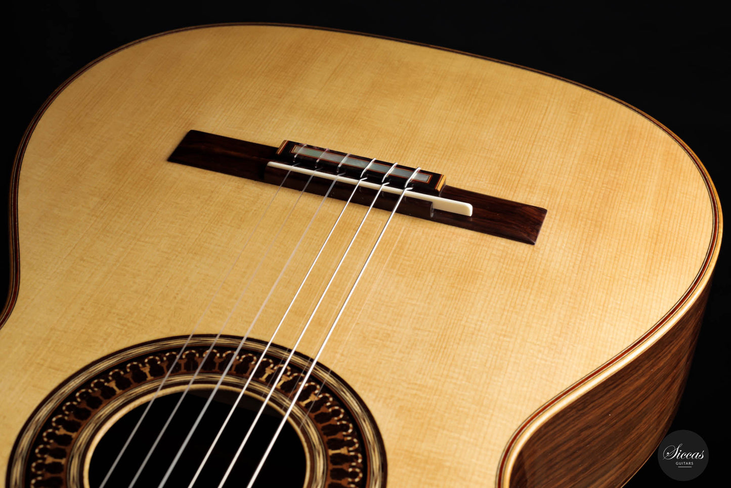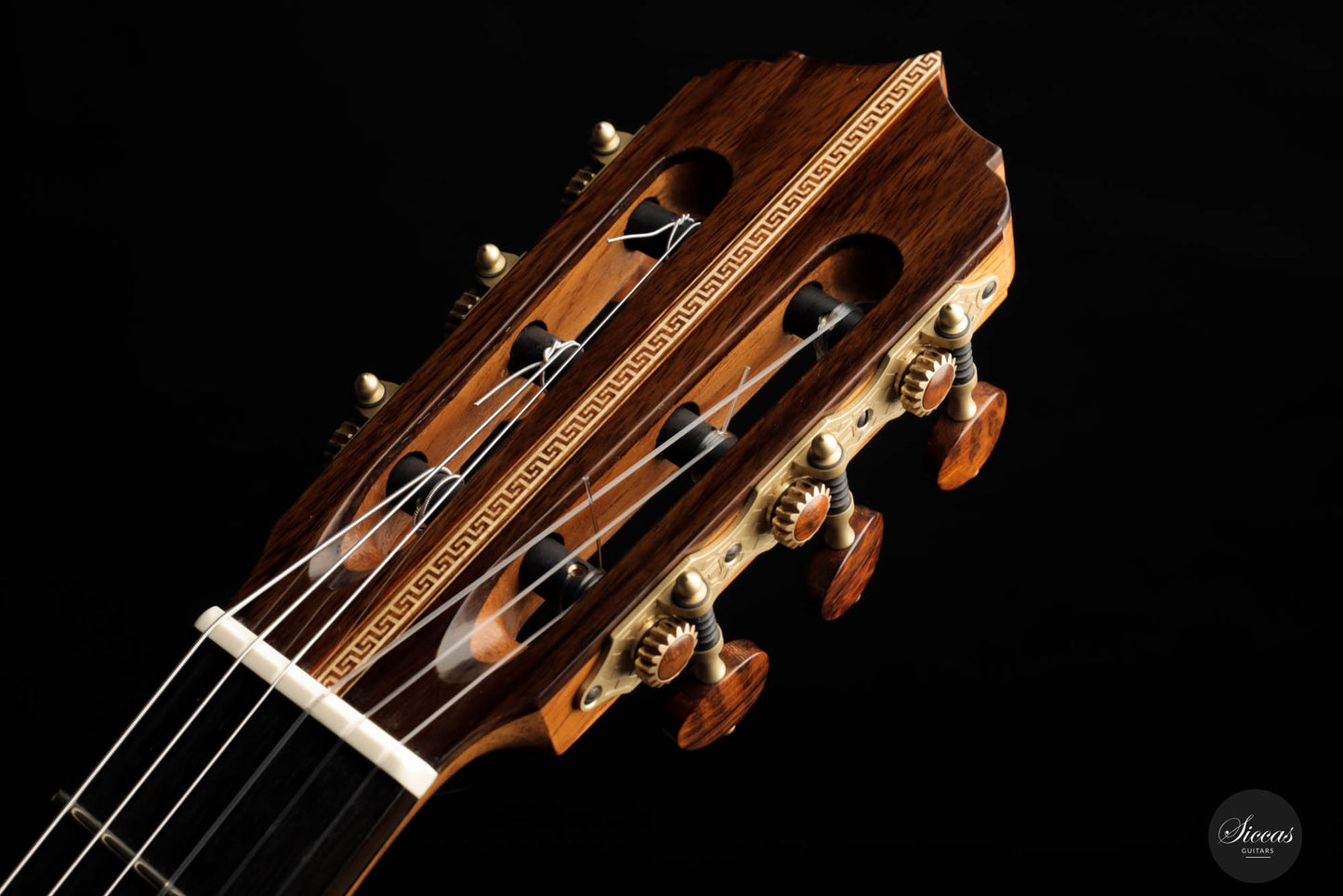 Tobias Braun is one of the few guitar makers with a long history with the Romanillos family. This instrument results from an excellent understanding of Jose's instrument, particularly the 2012 Jose L. Romanillos, on which this guitar is based. Tobias has successfully created a beautiful reminiscence of the original through this instrument. The gorgeous spruce soundboard is decorated tastefully according to Jose's guitars and executed to the highest level of craftsmanship. Meanwhile, the striking Indian Rosewood back and sides complement the look of this guitar to the next level. Acoustically, this guitar represents the broad color palette of Jose L. Romanillos' guitar. Not only that, but it also has the overall feel of the original.