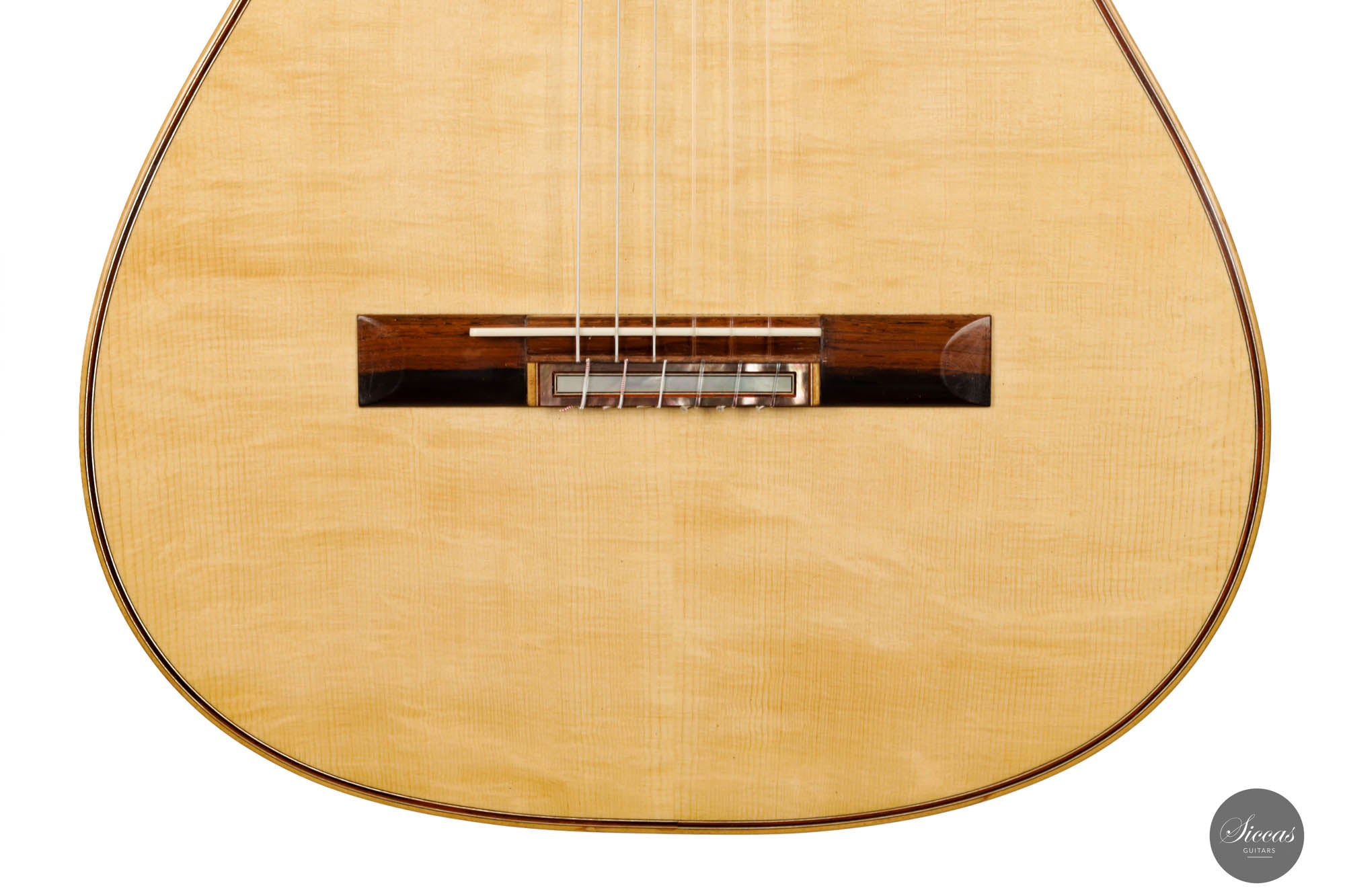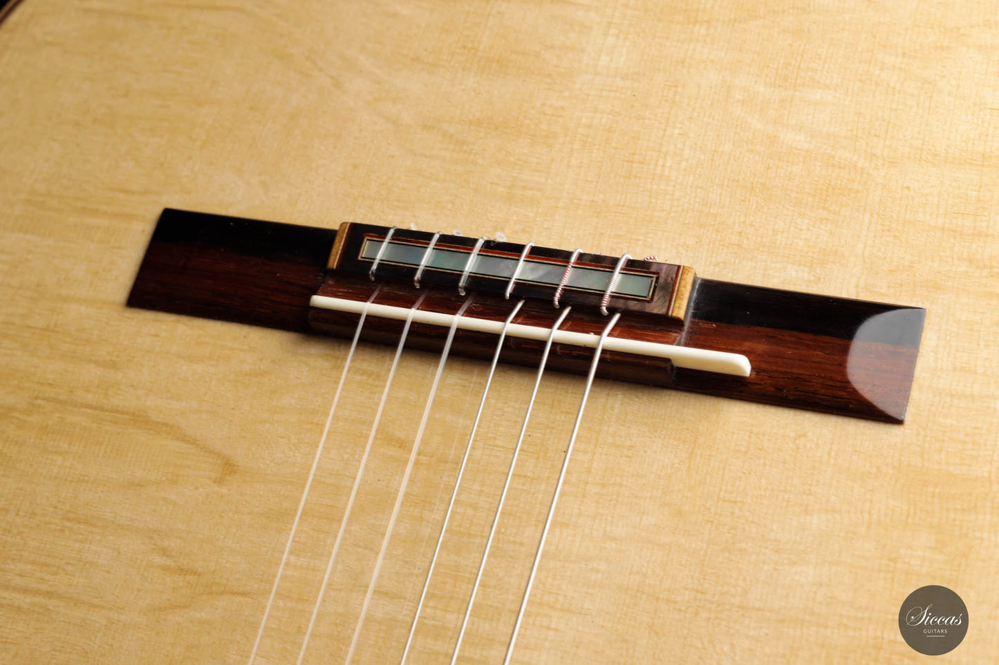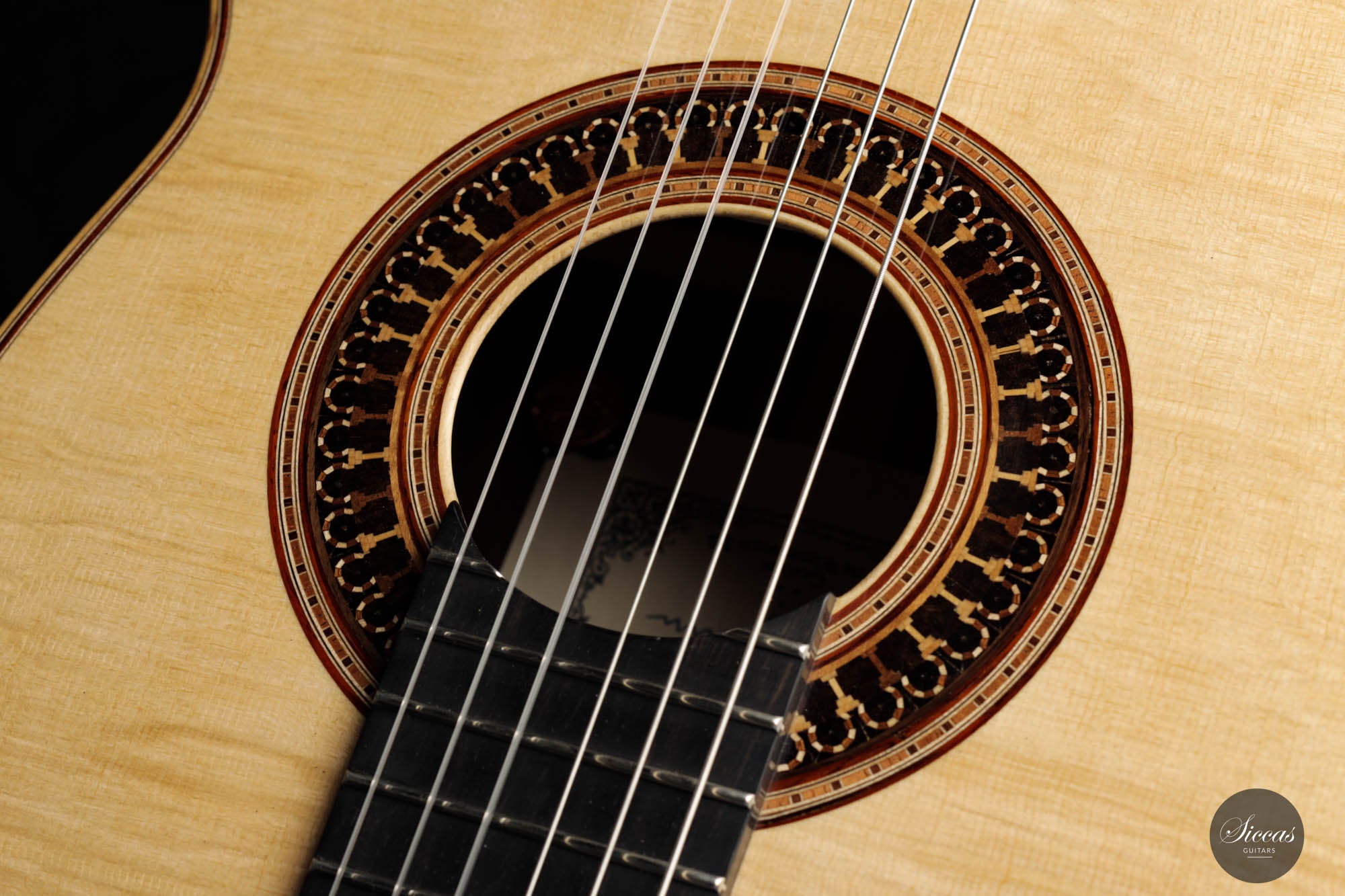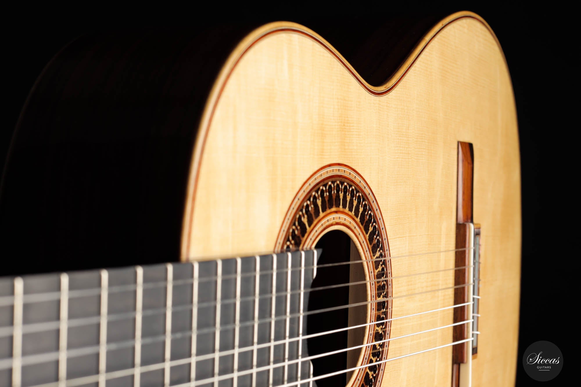 Braun's interpretation stands as an impressive tribute to Romanillos's design, reflecting an expert level of craftsmanship. The captivating spruce soundboard, adorned in a manner reminiscent of Jose's designs, enhances the guitar's visual charm while showcasing Braun's dedication to detail.