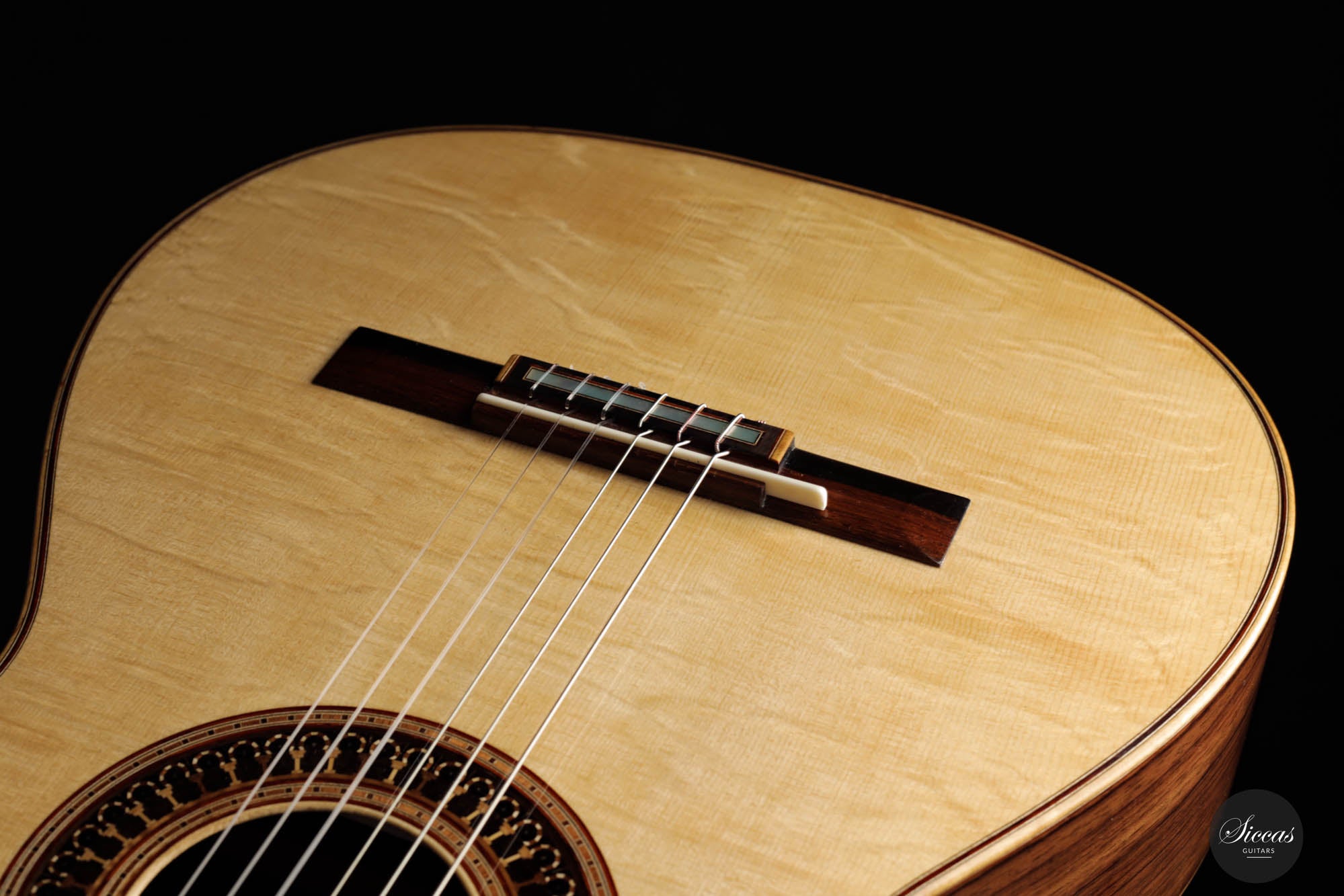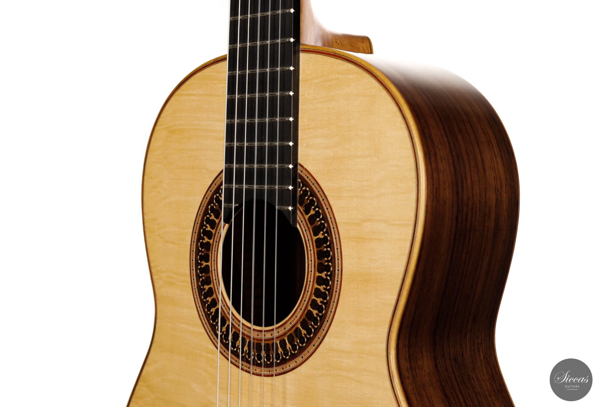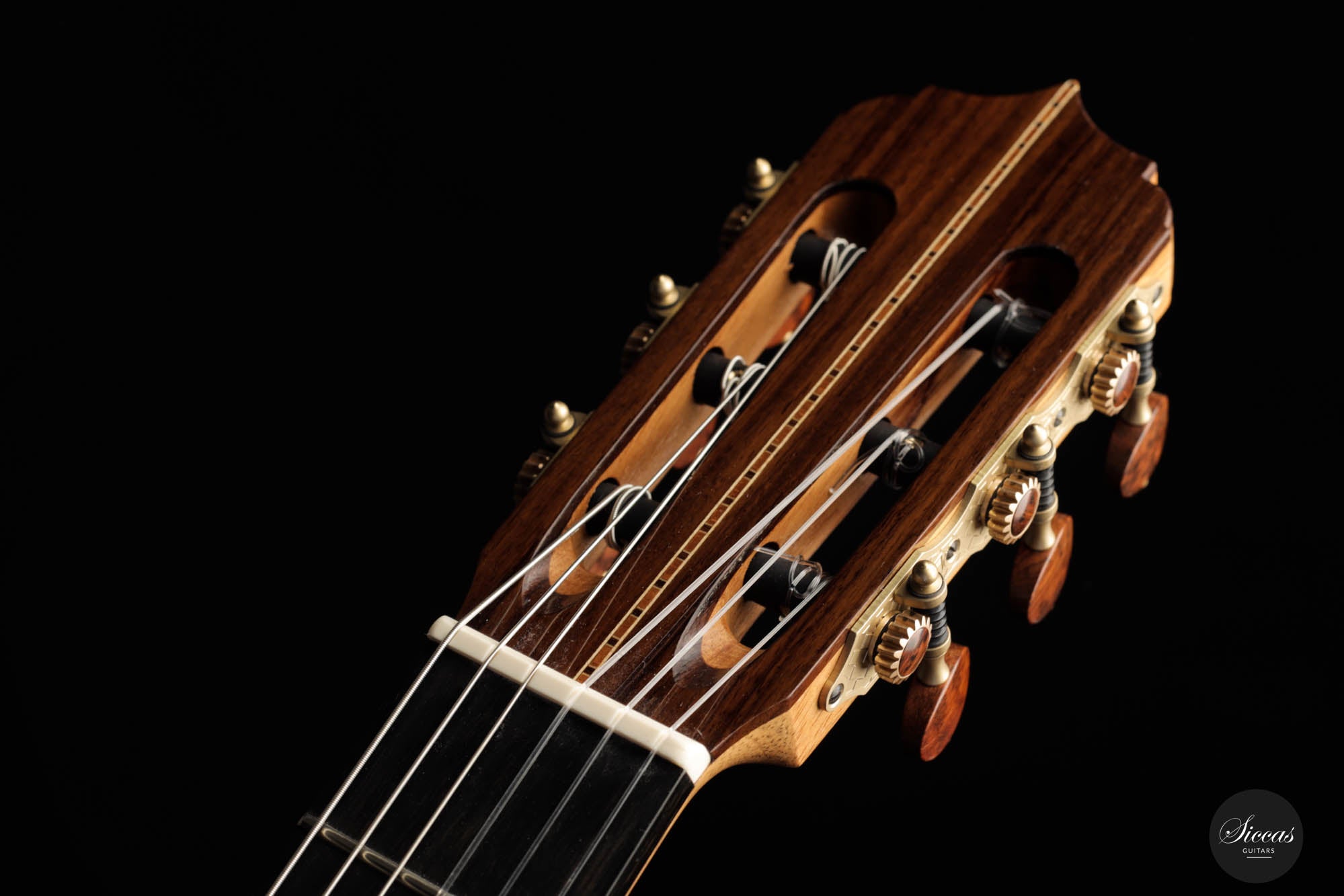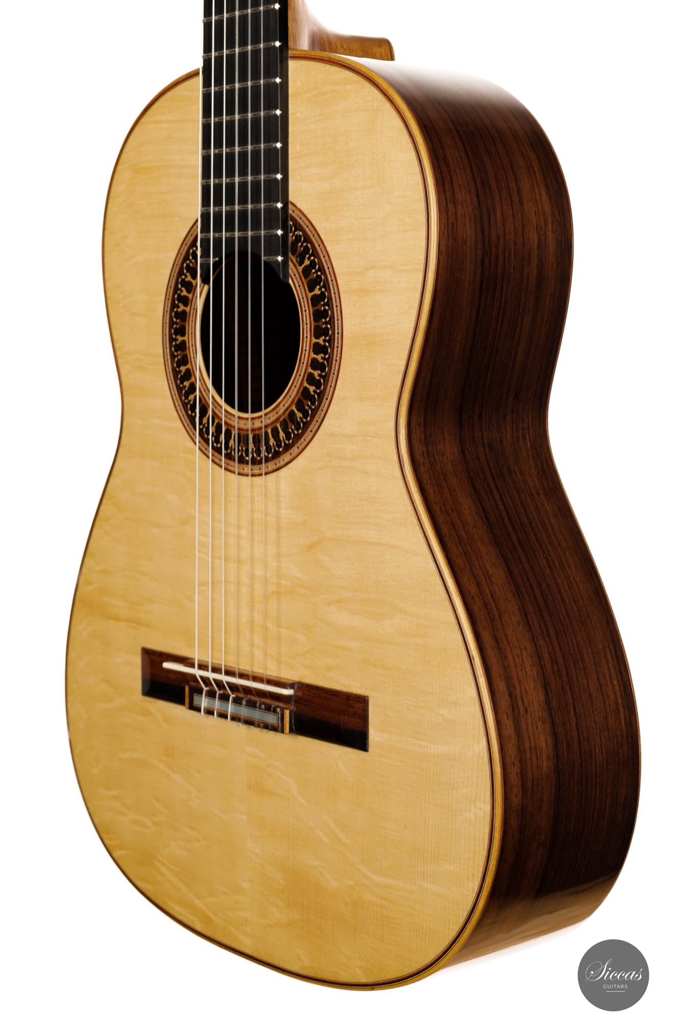Braun's interpretation stands as an impressive tribute to Romanillos's design, reflecting an expert level of craftsmanship. The captivating spruce soundboard, adorned in a manner reminiscent of Jose's designs, enhances the guitar's visual charm while showcasing Braun's dedication to detail.