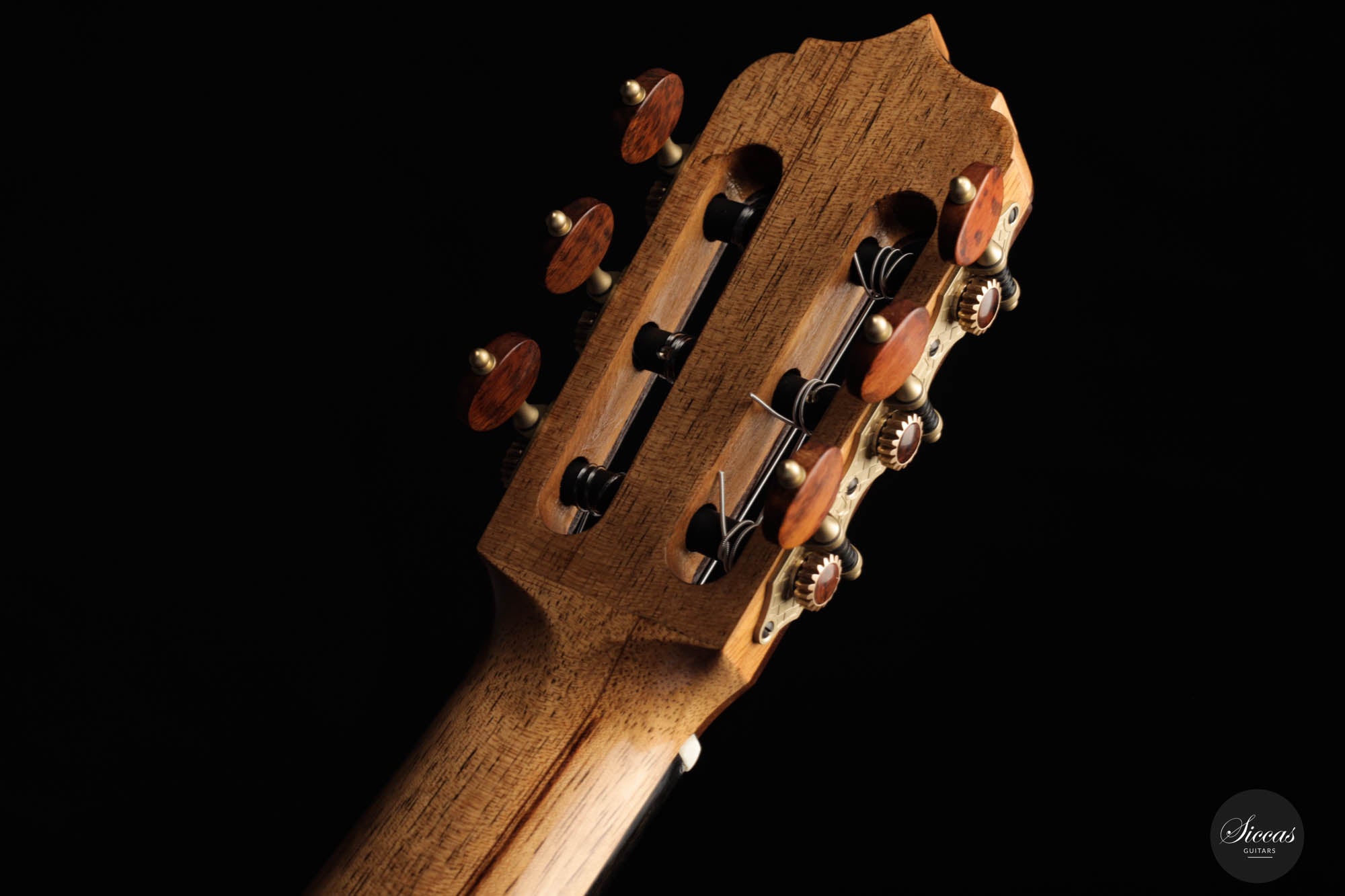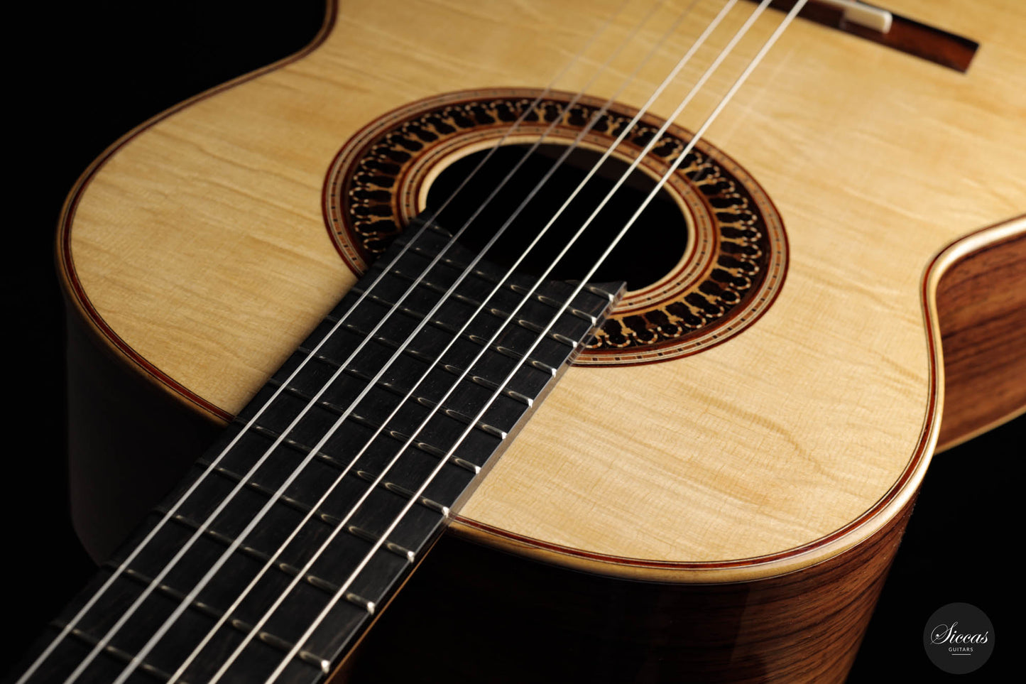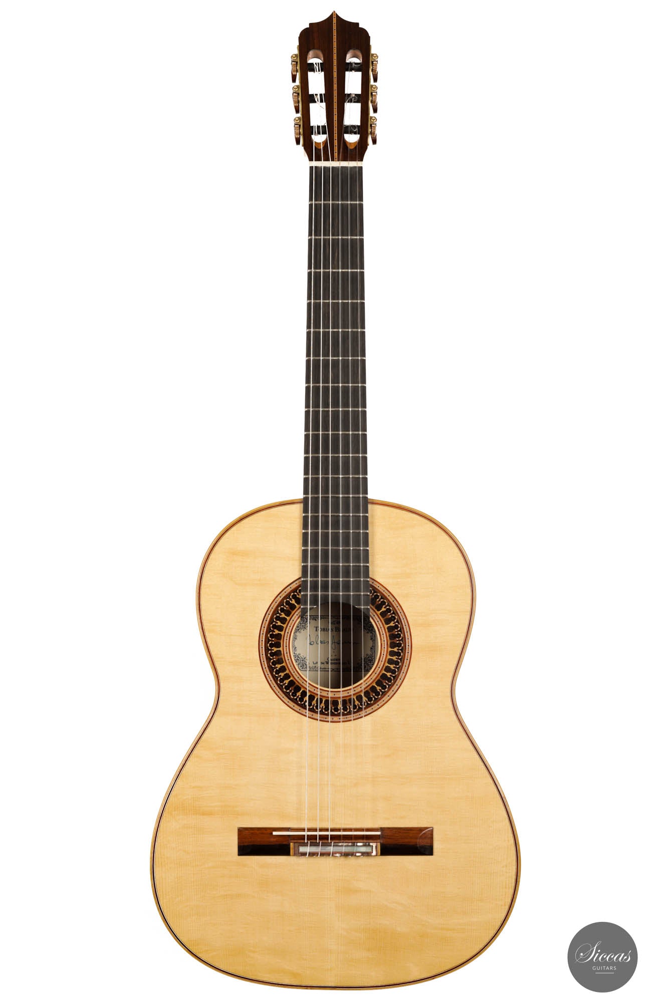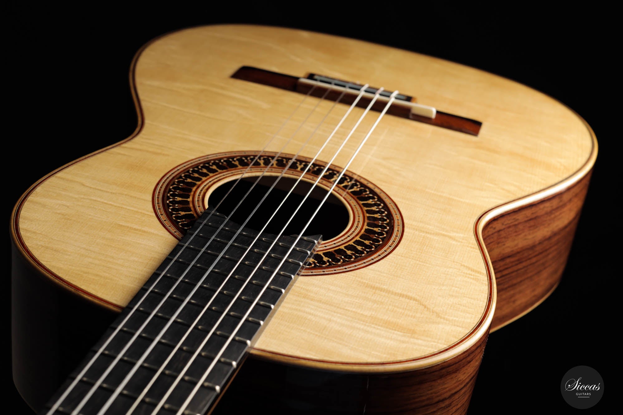 Braun's interpretation stands as an impressive tribute to Romanillos's design, reflecting an expert level of craftsmanship. The captivating spruce soundboard, adorned in a manner reminiscent of Jose's designs, enhances the guitar's visual charm while showcasing Braun's dedication to detail.