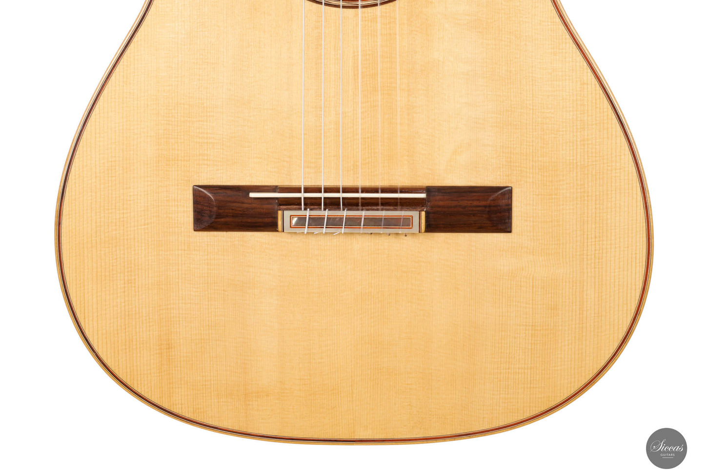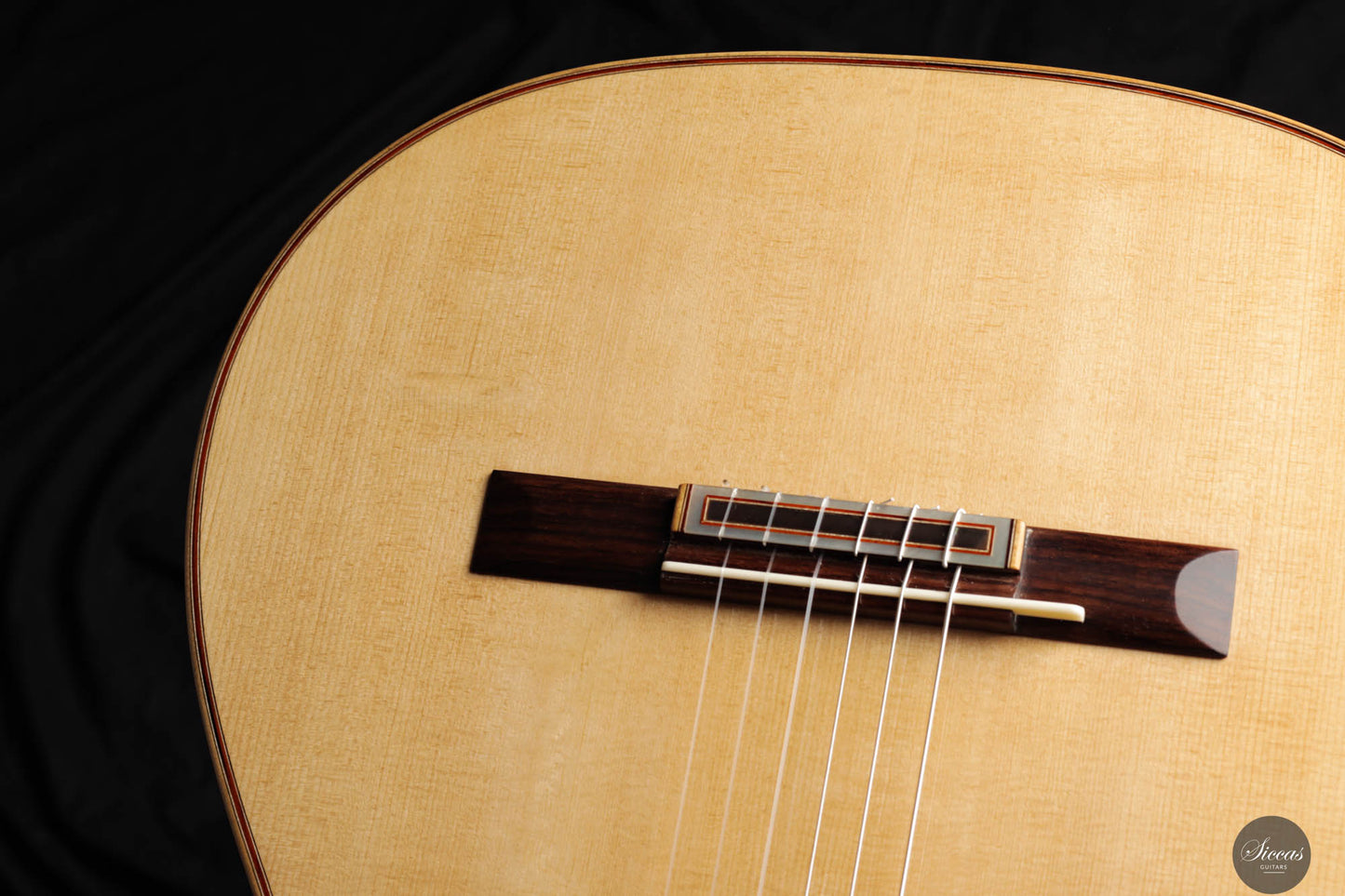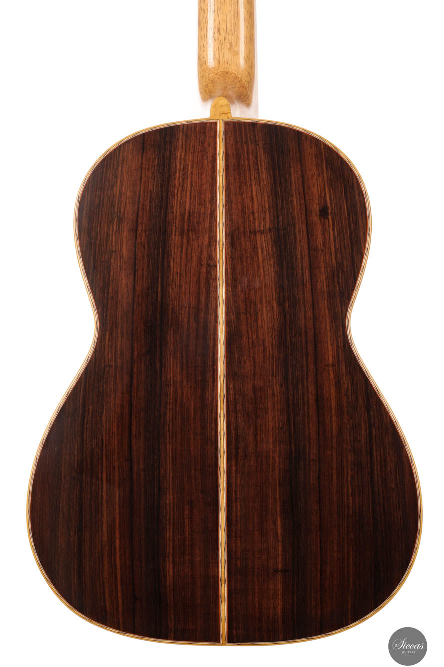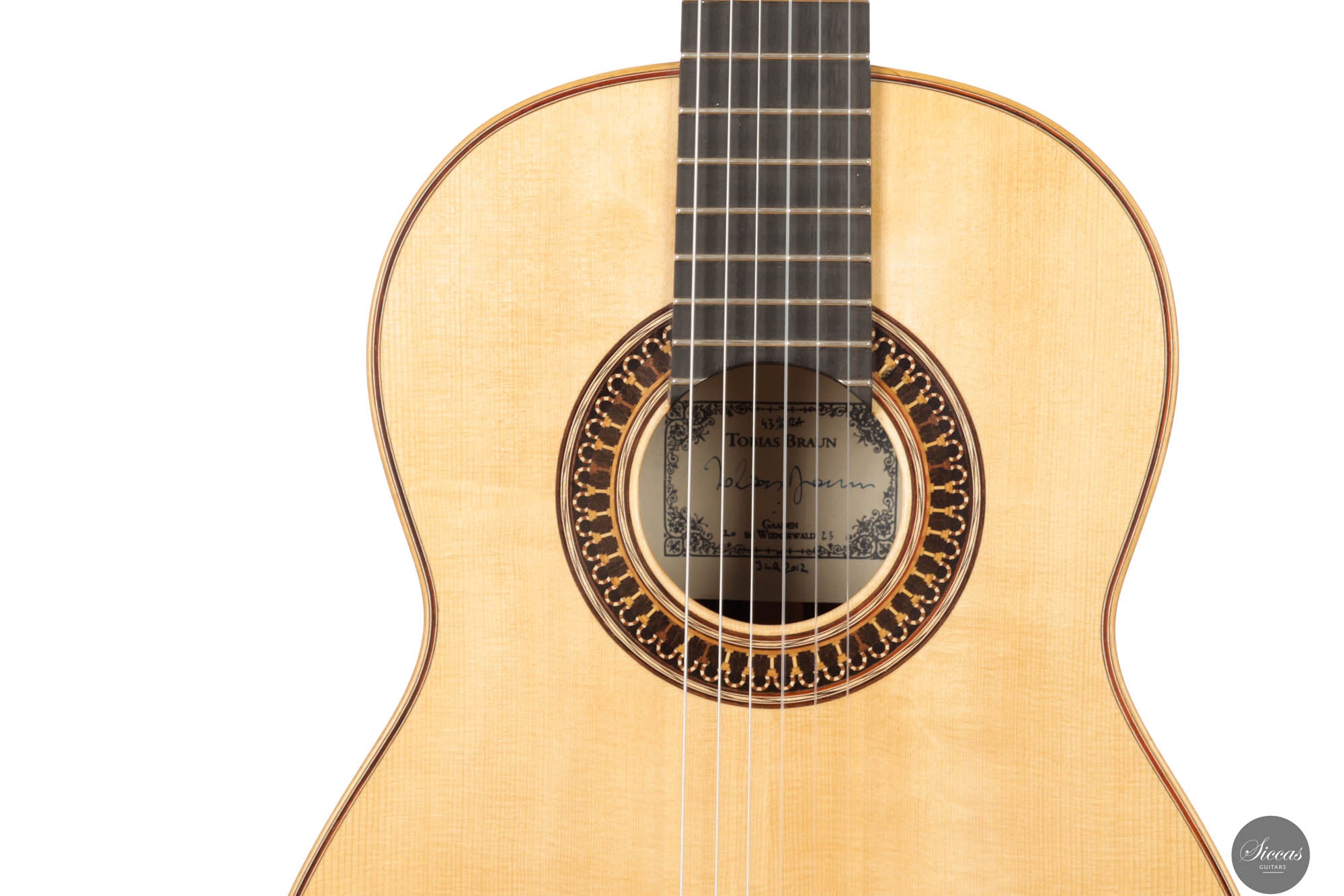 This exquisite guitar crafted by Tobias Braun is a testament to his exceptional artistry and his profound connection with the celebrated luthier Jose L. Romanillos. Drawing deeply from his relationship and admiration for Romanillos's work, Braun has created an instrument that embodies both a tribute and a continuation of the legendary craftsmanship. The spruce soundboard is a focal point, delicately adorned in a style reminiscent of Romanillos's characteristic designs, which not only enhances the visual appeal of the guitar but also reflects Braun's meticulous attention to detail. Complemented by the elegant Indian Rosewood for the back and sides, the guitar not only looks stunning but also excels in its acoustic performance, reflecting the high standards set by its inspirations.