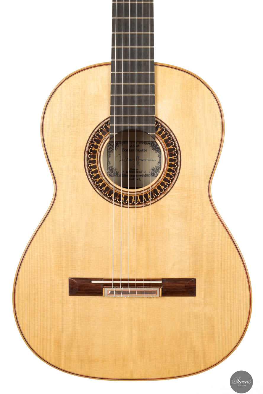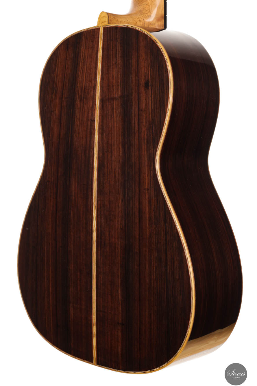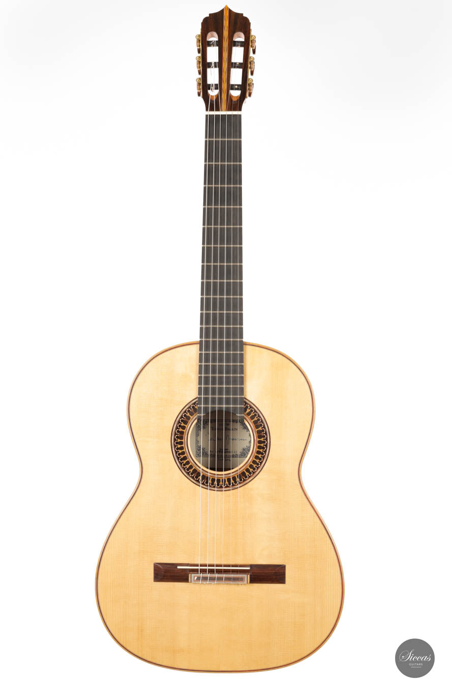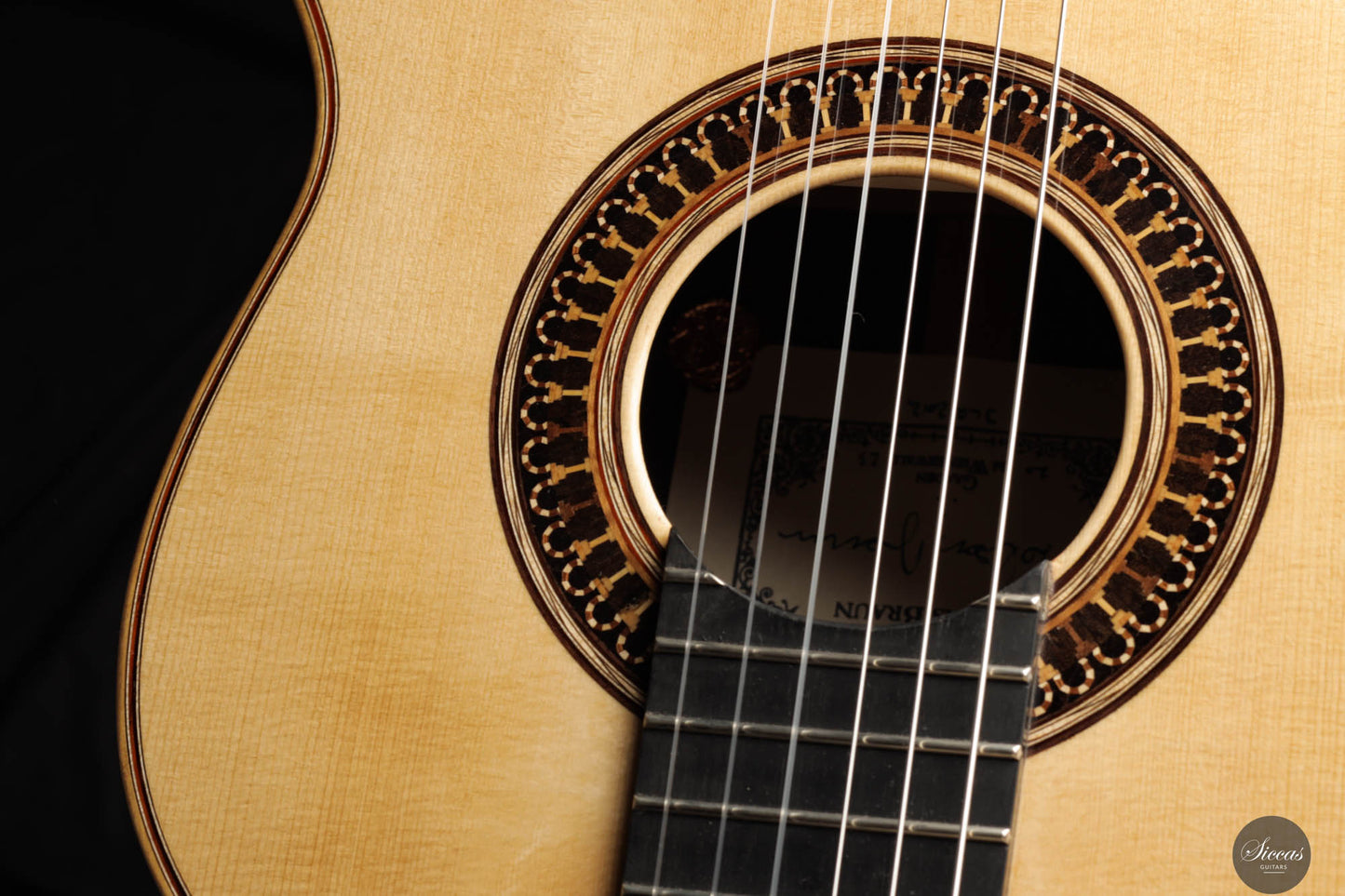 This exquisite guitar crafted by Tobias Braun is a testament to his exceptional artistry and his profound connection with the celebrated luthier Jose L. Romanillos. Drawing deeply from his relationship and admiration for Romanillos's work, Braun has created an instrument that embodies both a tribute and a continuation of the legendary craftsmanship. The spruce soundboard is a focal point, delicately adorned in a style reminiscent of Romanillos's characteristic designs, which not only enhances the visual appeal of the guitar but also reflects Braun's meticulous attention to detail. Complemented by the elegant Indian Rosewood for the back and sides, the guitar not only looks stunning but also excels in its acoustic performance, reflecting the high standards set by its inspirations.