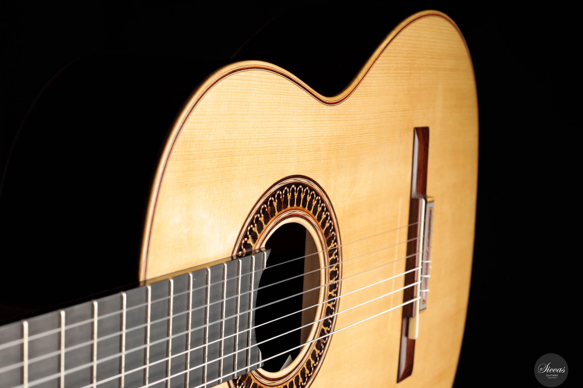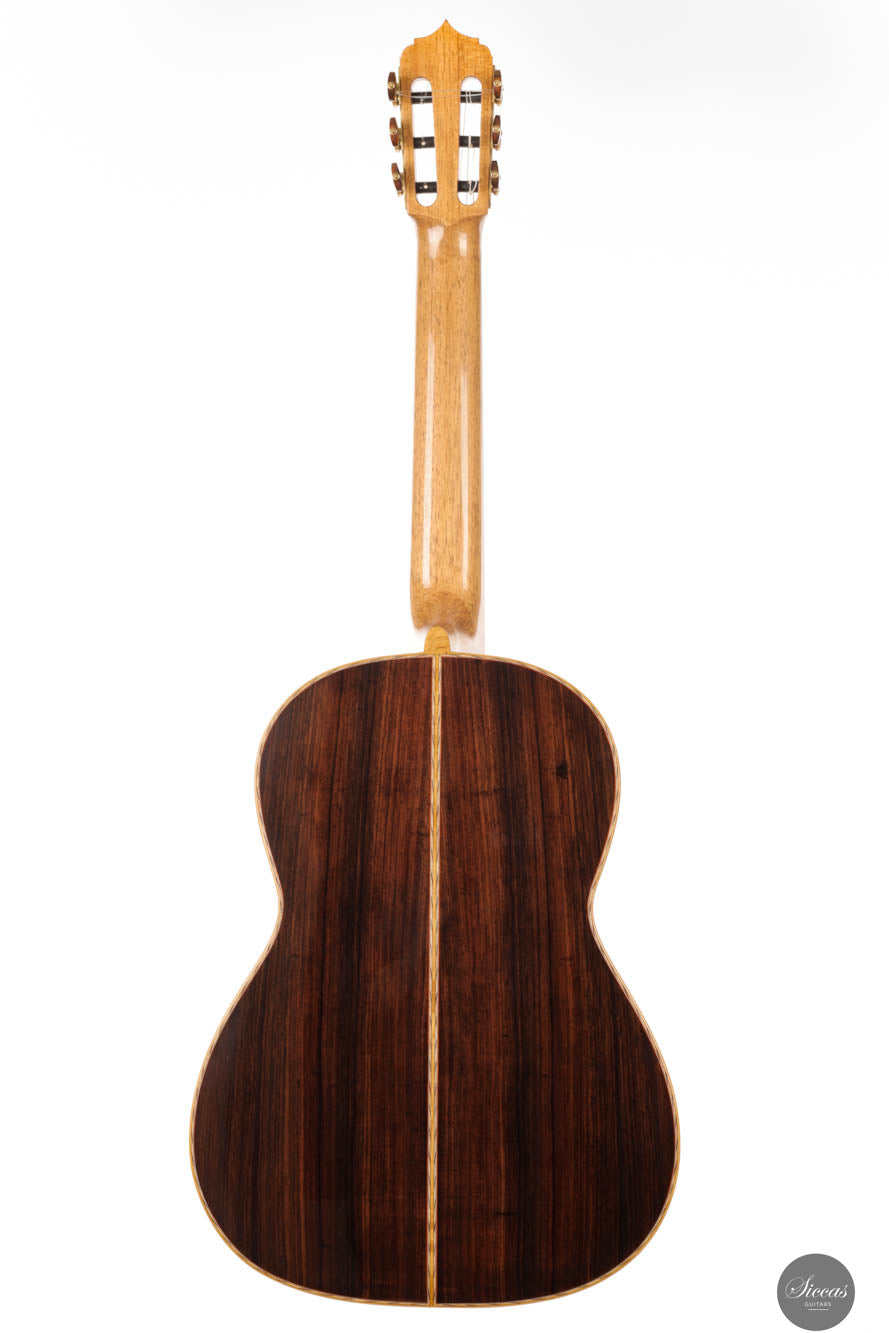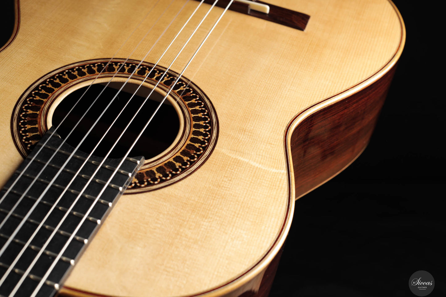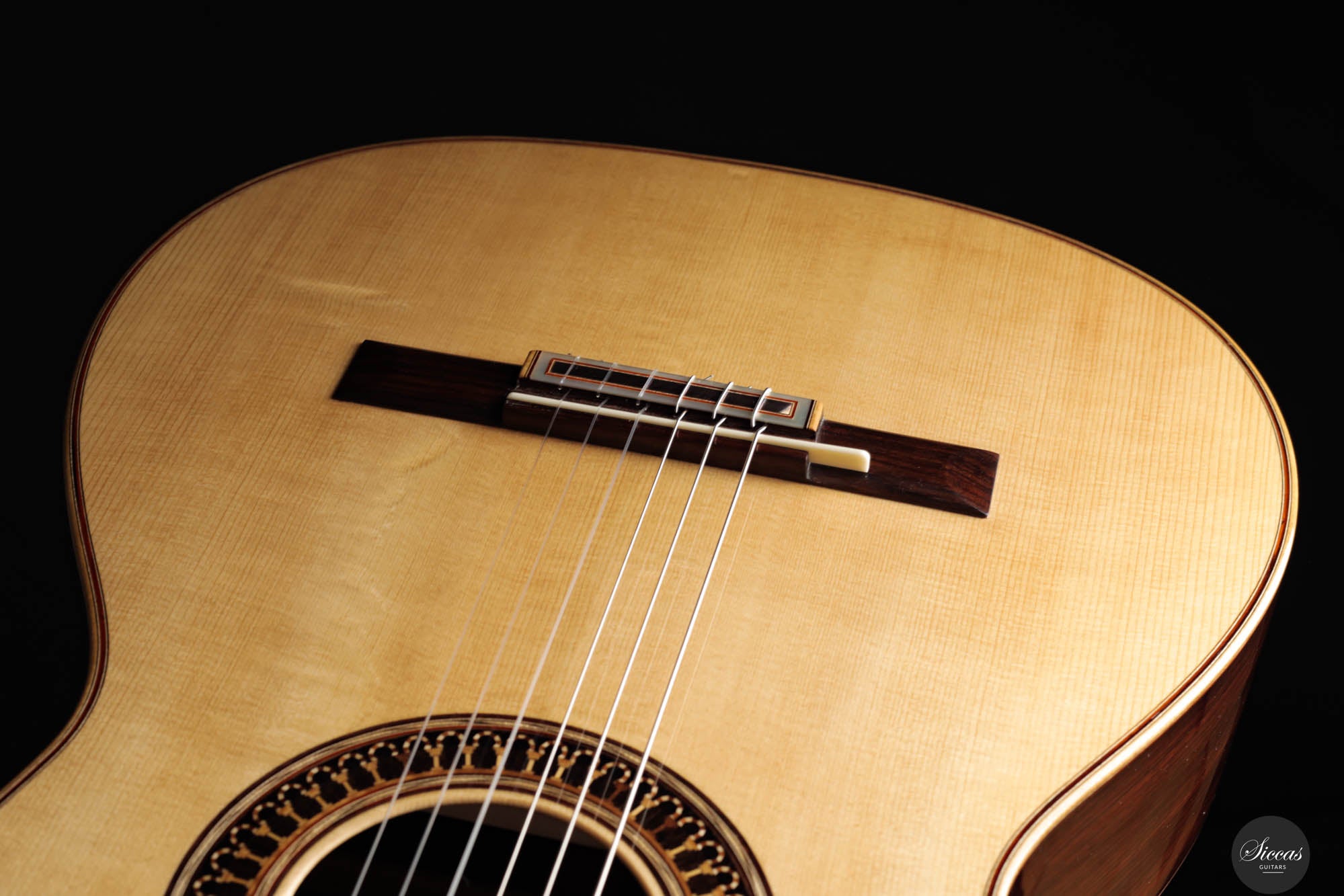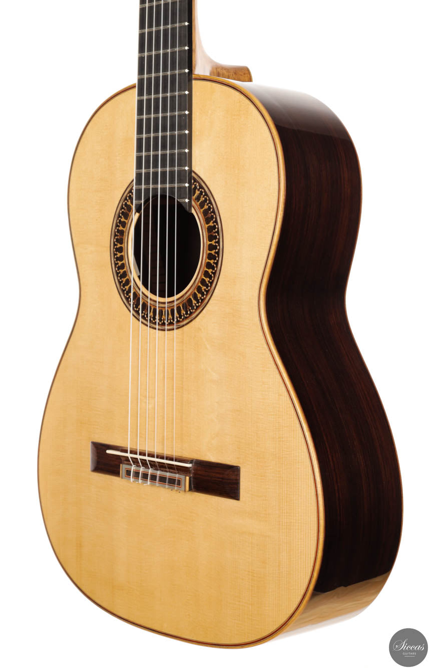 This exquisite guitar crafted by Tobias Braun is a testament to his exceptional artistry and his profound connection with the celebrated luthier Jose L. Romanillos. Drawing deeply from his relationship and admiration for Romanillos's work, Braun has created an instrument that embodies both a tribute and a continuation of the legendary craftsmanship. The spruce soundboard is a focal point, delicately adorned in a style reminiscent of Romanillos's characteristic designs, which not only enhances the visual appeal of the guitar but also reflects Braun's meticulous attention to detail. Complemented by the elegant Indian Rosewood for the back and sides, the guitar not only looks stunning but also excels in its acoustic performance, reflecting the high standards set by its inspirations.