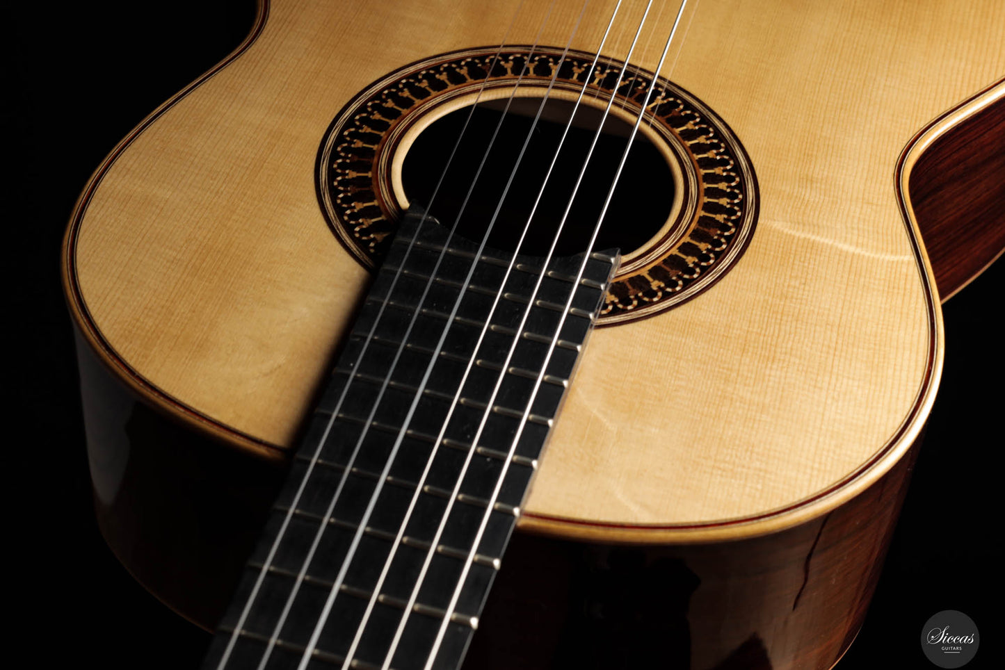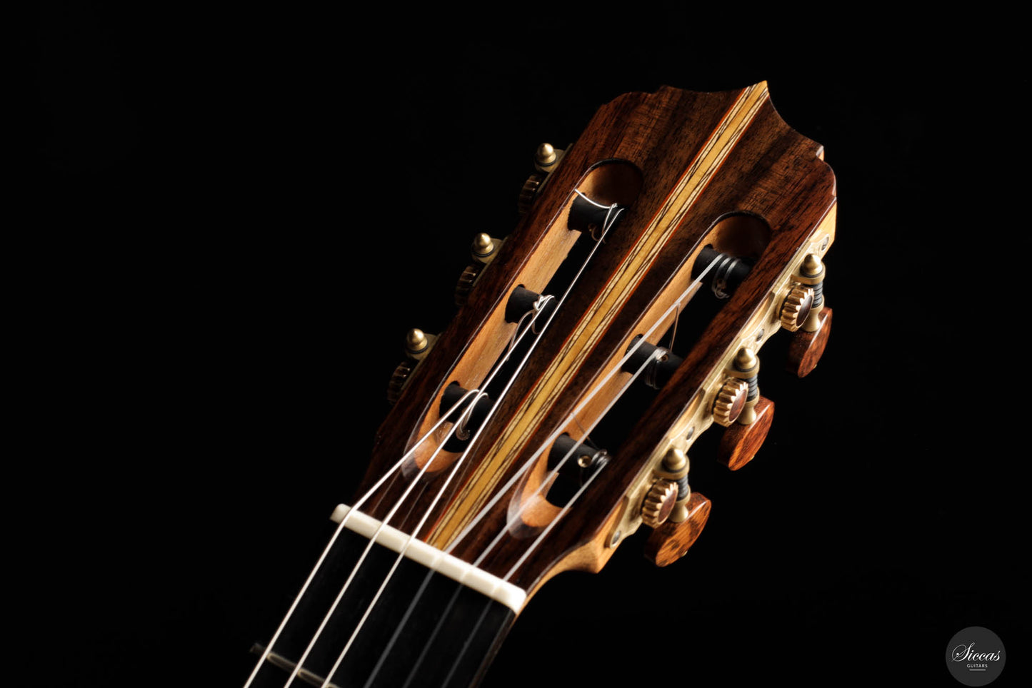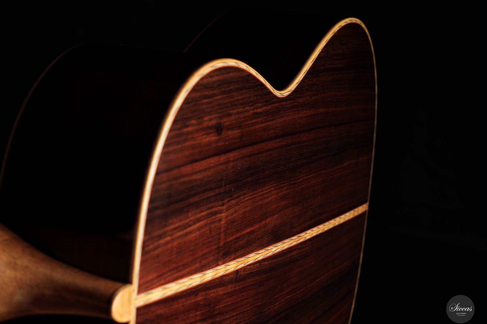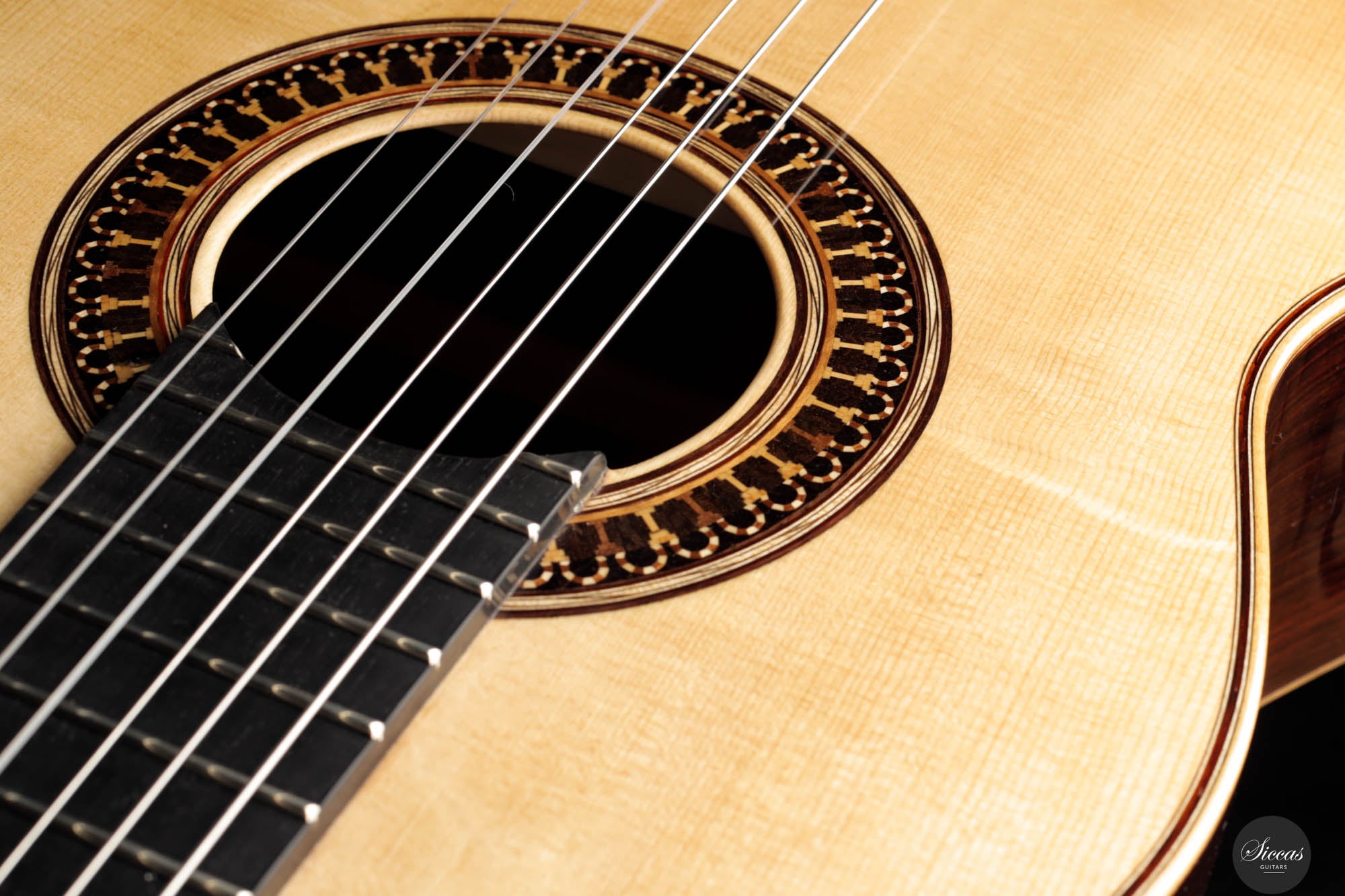 This exquisite guitar crafted by Tobias Braun is a testament to his exceptional artistry and his profound connection with the celebrated luthier Jose L. Romanillos. Drawing deeply from his relationship and admiration for Romanillos's work, Braun has created an instrument that embodies both a tribute and a continuation of the legendary craftsmanship. The spruce soundboard is a focal point, delicately adorned in a style reminiscent of Romanillos's characteristic designs, which not only enhances the visual appeal of the guitar but also reflects Braun's meticulous attention to detail. Complemented by the elegant Indian Rosewood for the back and sides, the guitar not only looks stunning but also excels in its acoustic performance, reflecting the high standards set by its inspirations.