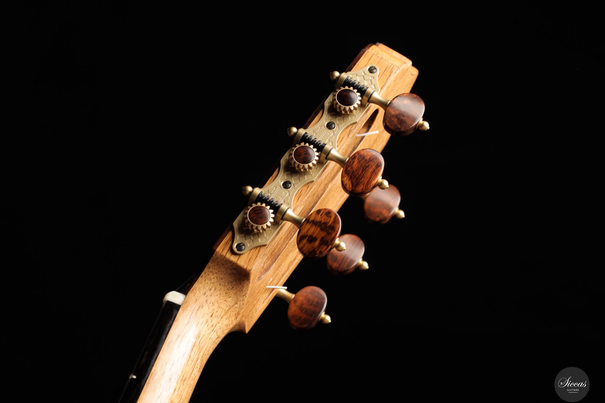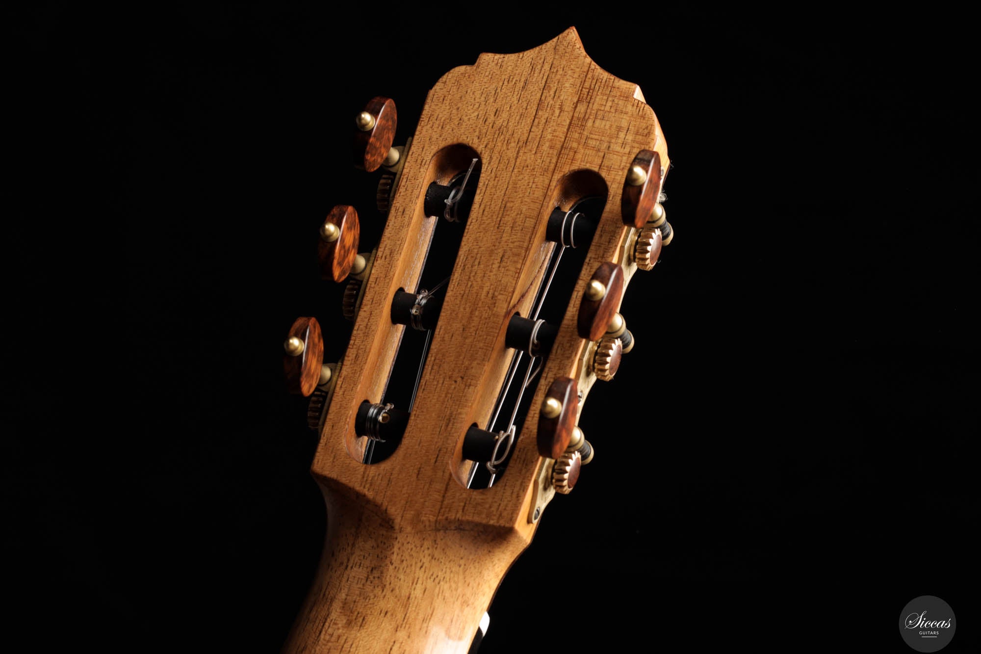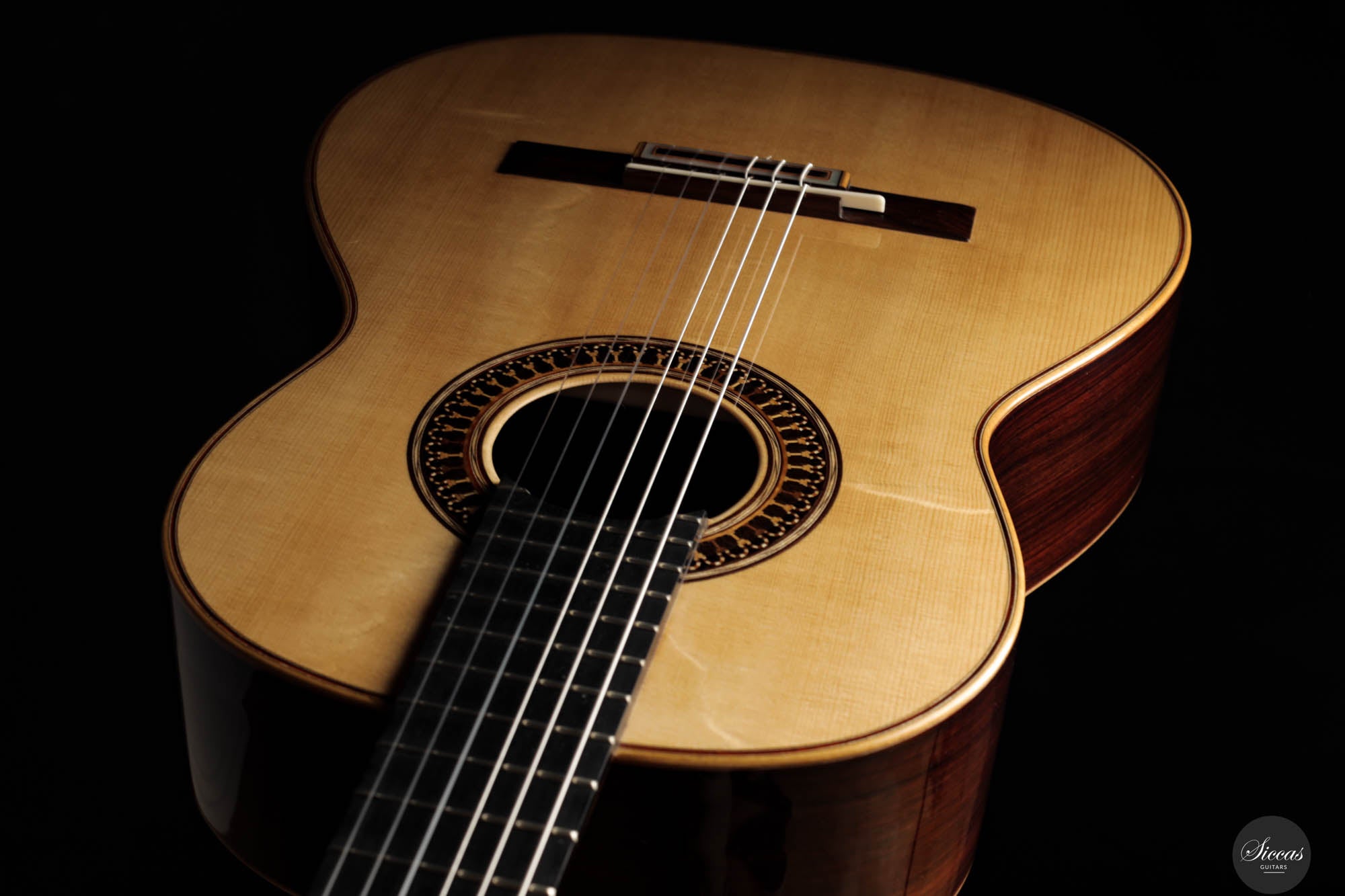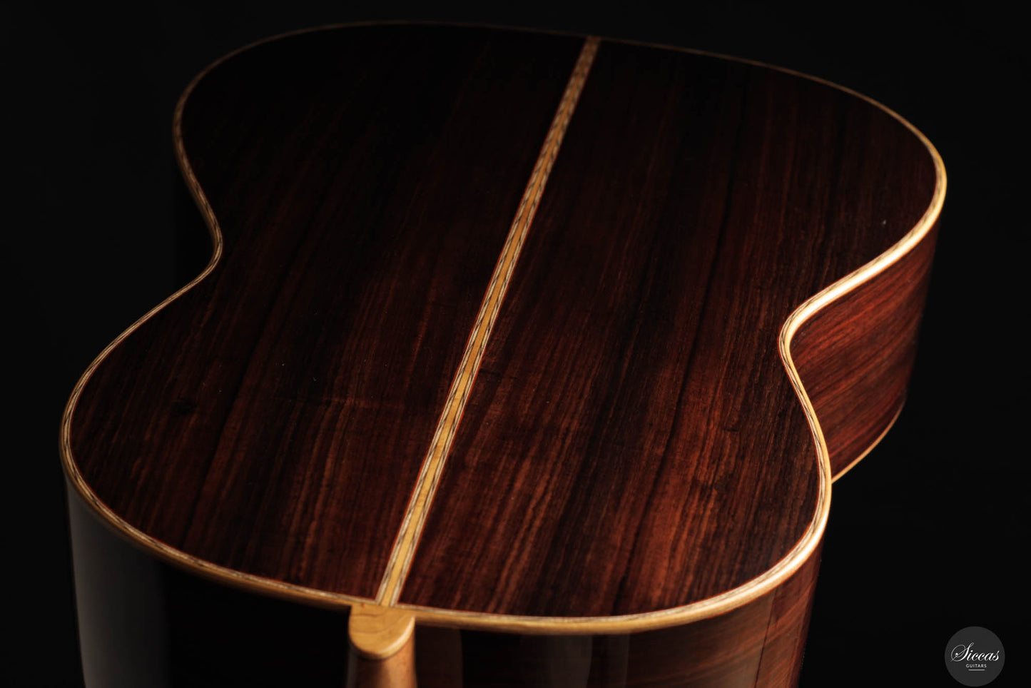 This exquisite guitar crafted by Tobias Braun is a testament to his exceptional artistry and his profound connection with the celebrated luthier Jose L. Romanillos. Drawing deeply from his relationship and admiration for Romanillos's work, Braun has created an instrument that embodies both a tribute and a continuation of the legendary craftsmanship. The spruce soundboard is a focal point, delicately adorned in a style reminiscent of Romanillos's characteristic designs, which not only enhances the visual appeal of the guitar but also reflects Braun's meticulous attention to detail. Complemented by the elegant Indian Rosewood for the back and sides, the guitar not only looks stunning but also excels in its acoustic performance, reflecting the high standards set by its inspirations.