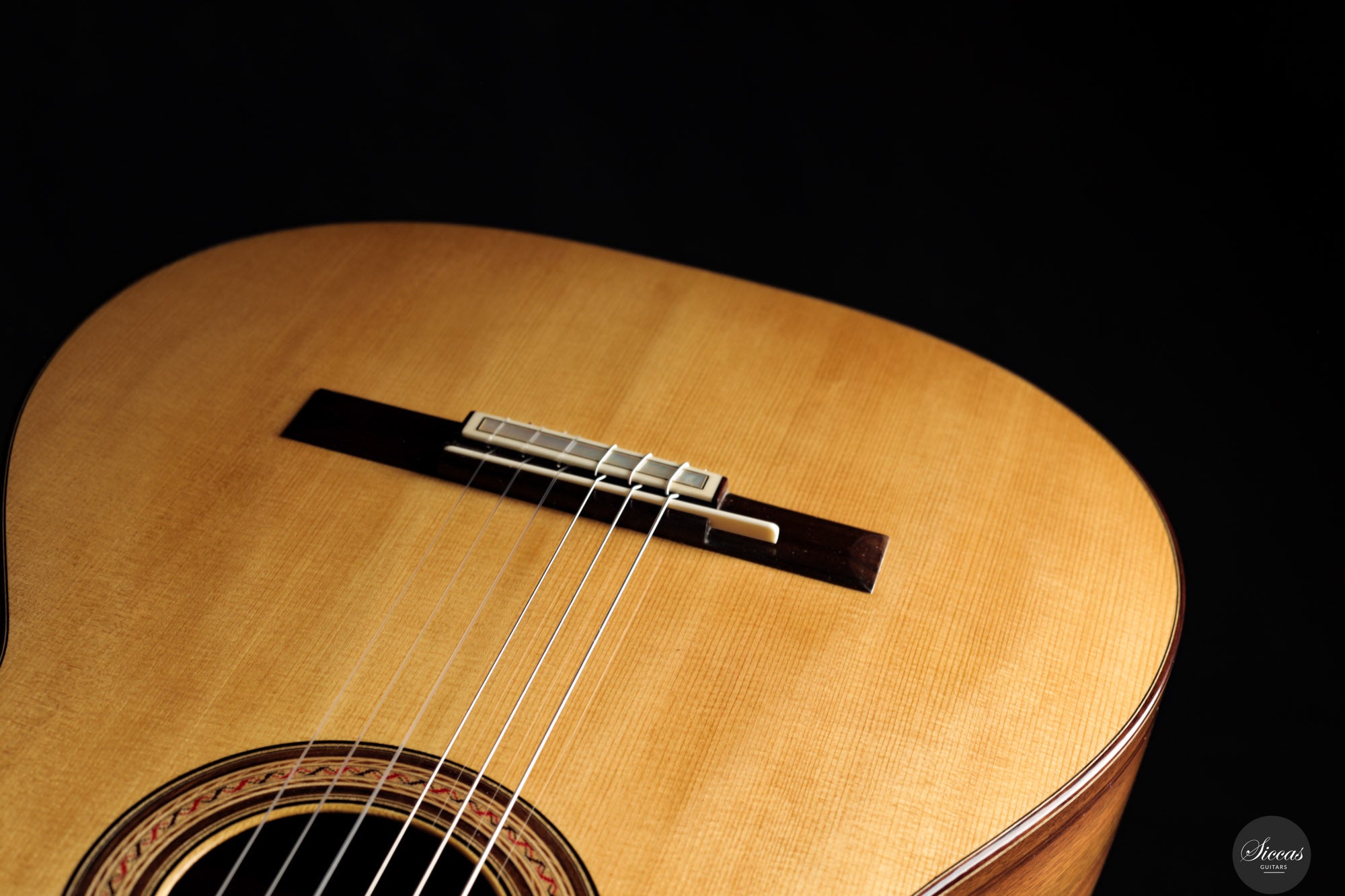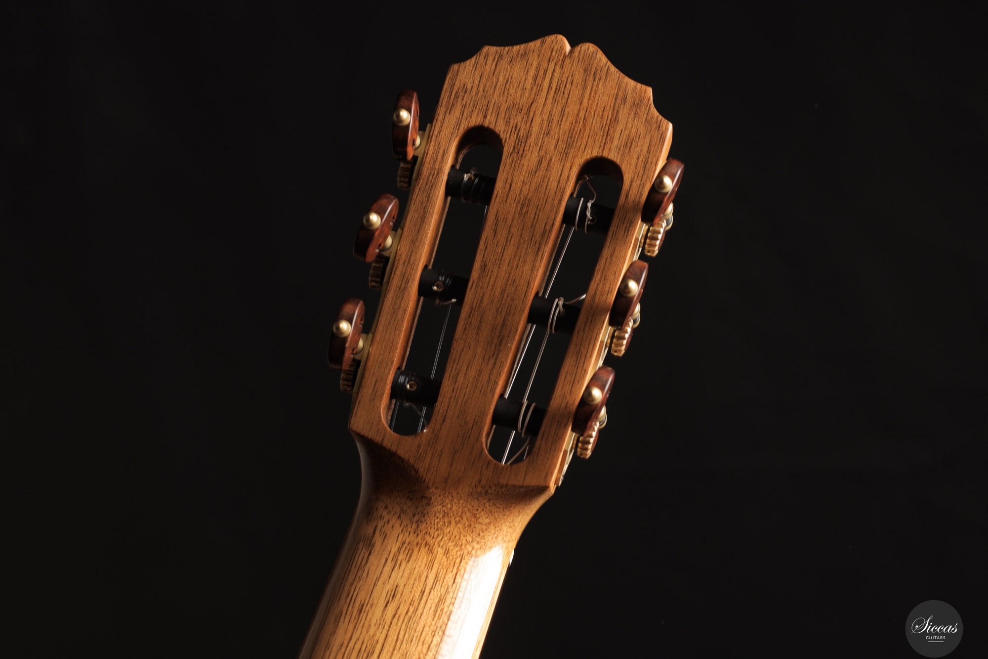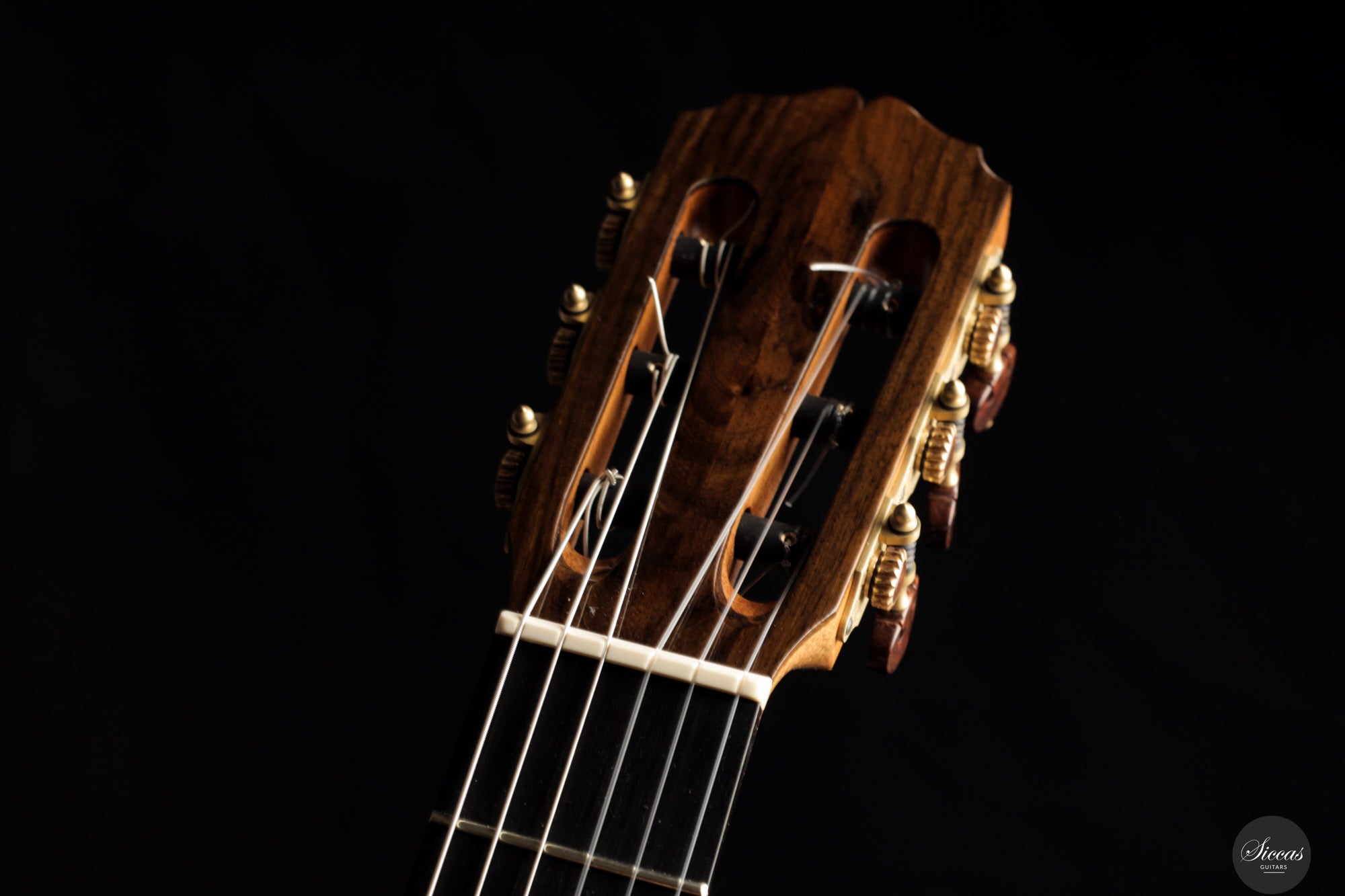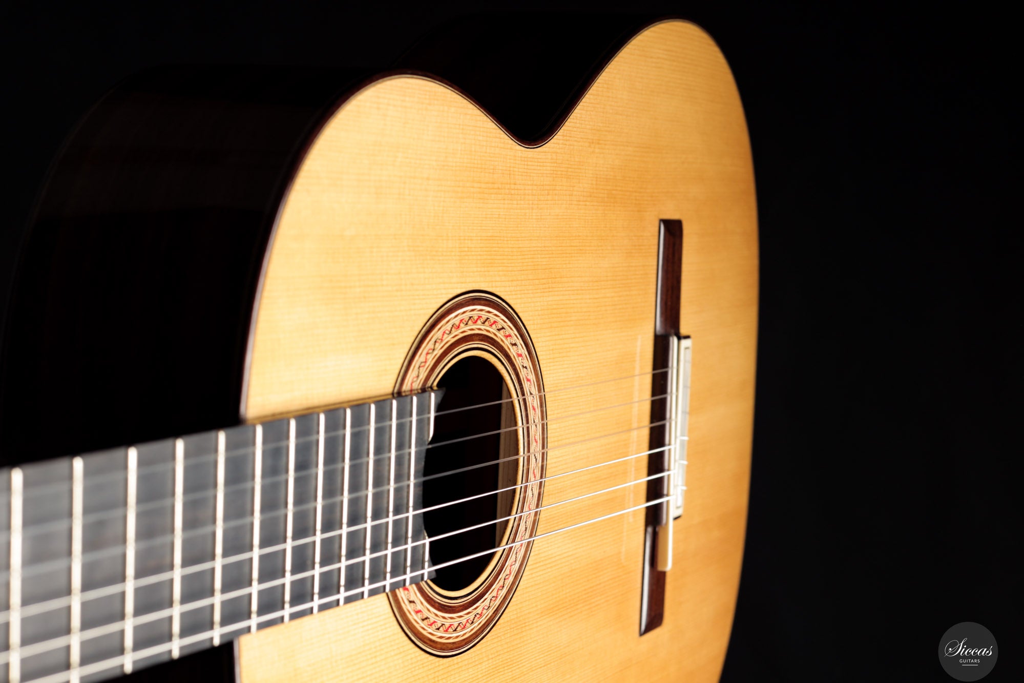 This guitar, built in 2025 by Tobias Braun, is a copy of the 1924 instrument made by Santos Hernandez that was received by Austrian guitarist Luise Walker. Her teacher, Miguel Llobet, brought it to her in Vienna directly from the workshop of Santos Hernandez. After Walker’s death, Braun repaired the original instrument and was able to create an accurate plan, which he has since used to build this model multiple times.