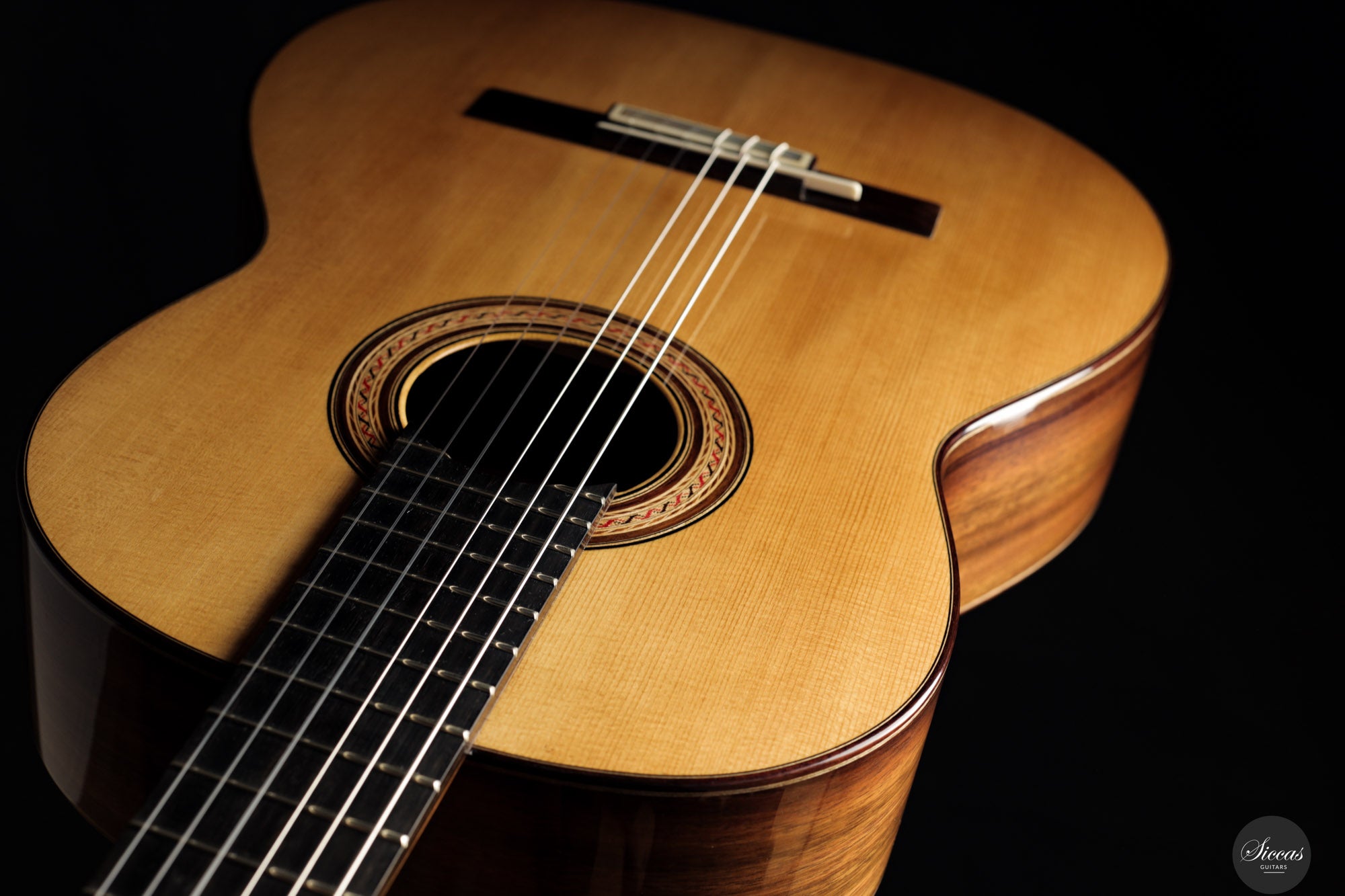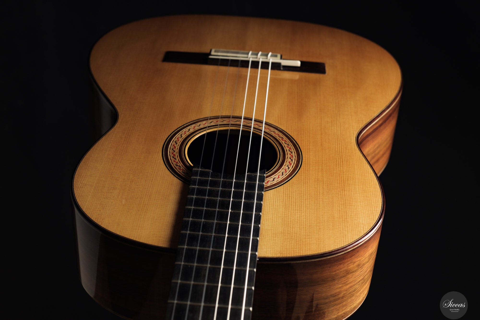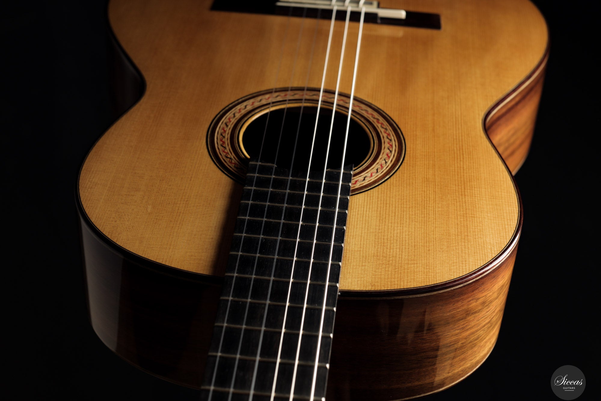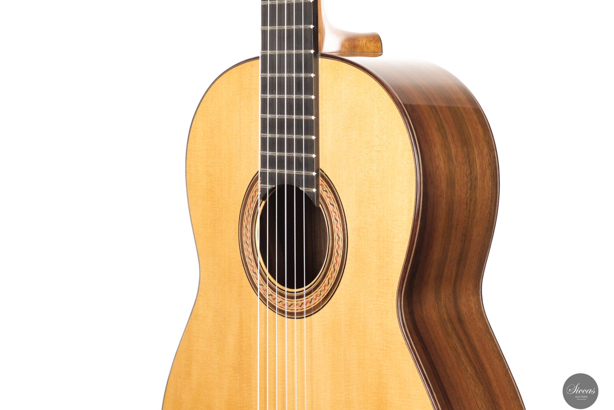 This guitar, built in 2025 by Tobias Braun, is a copy of the 1924 instrument made by Santos Hernandez that was received by Austrian guitarist Luise Walker. Her teacher, Miguel Llobet, brought it to her in Vienna directly from the workshop of Santos Hernandez. After Walker’s death, Braun repaired the original instrument and was able to create an accurate plan, which he has since used to build this model multiple times.