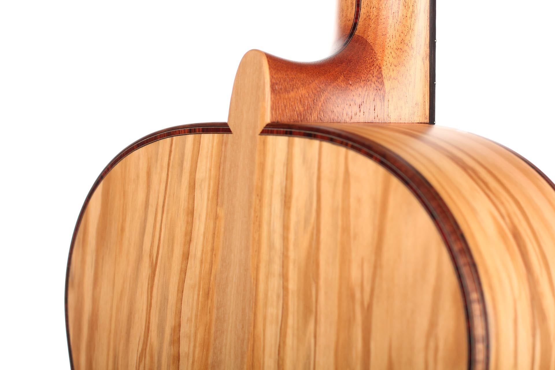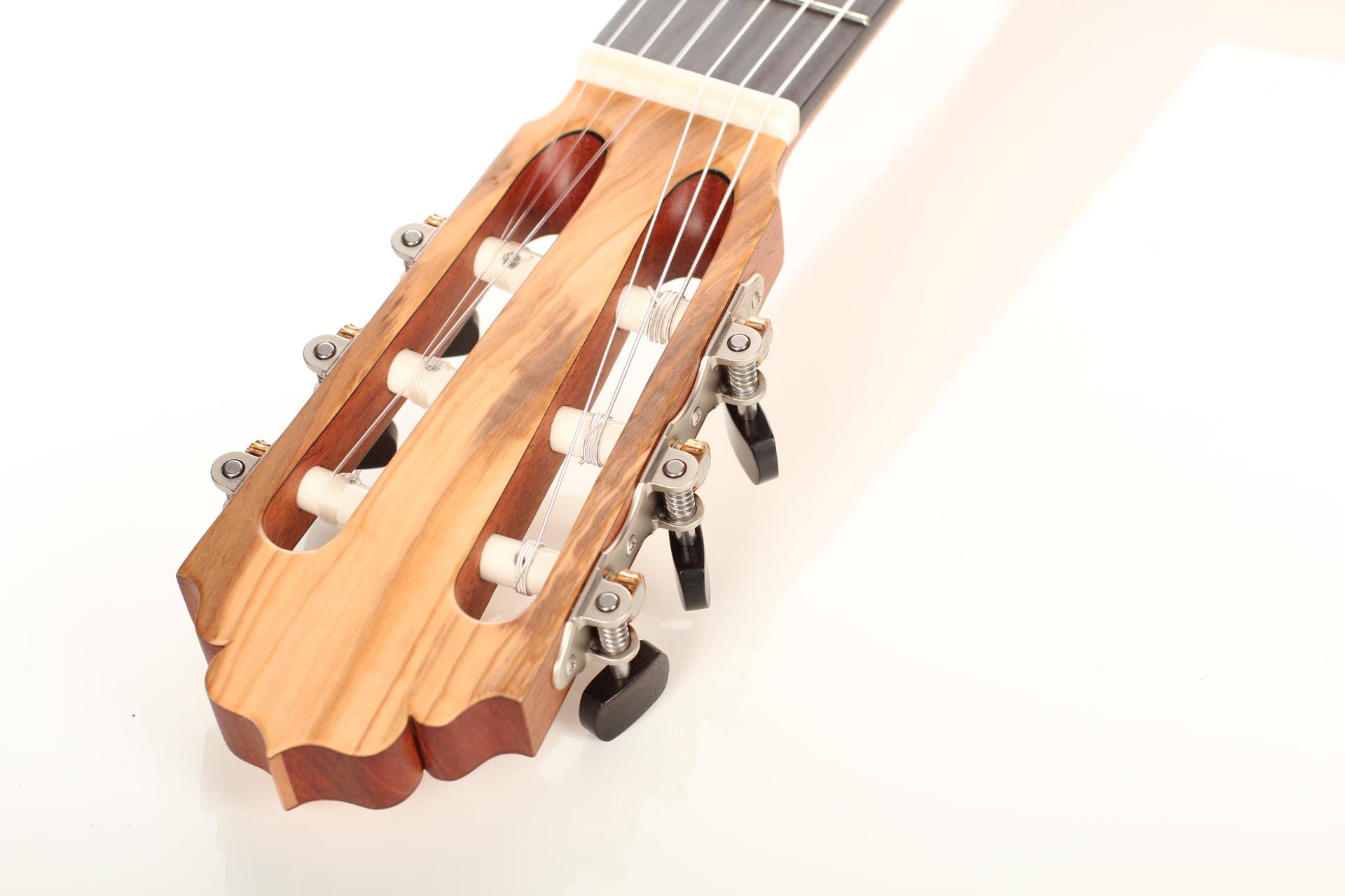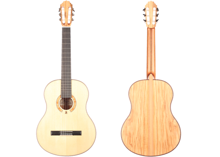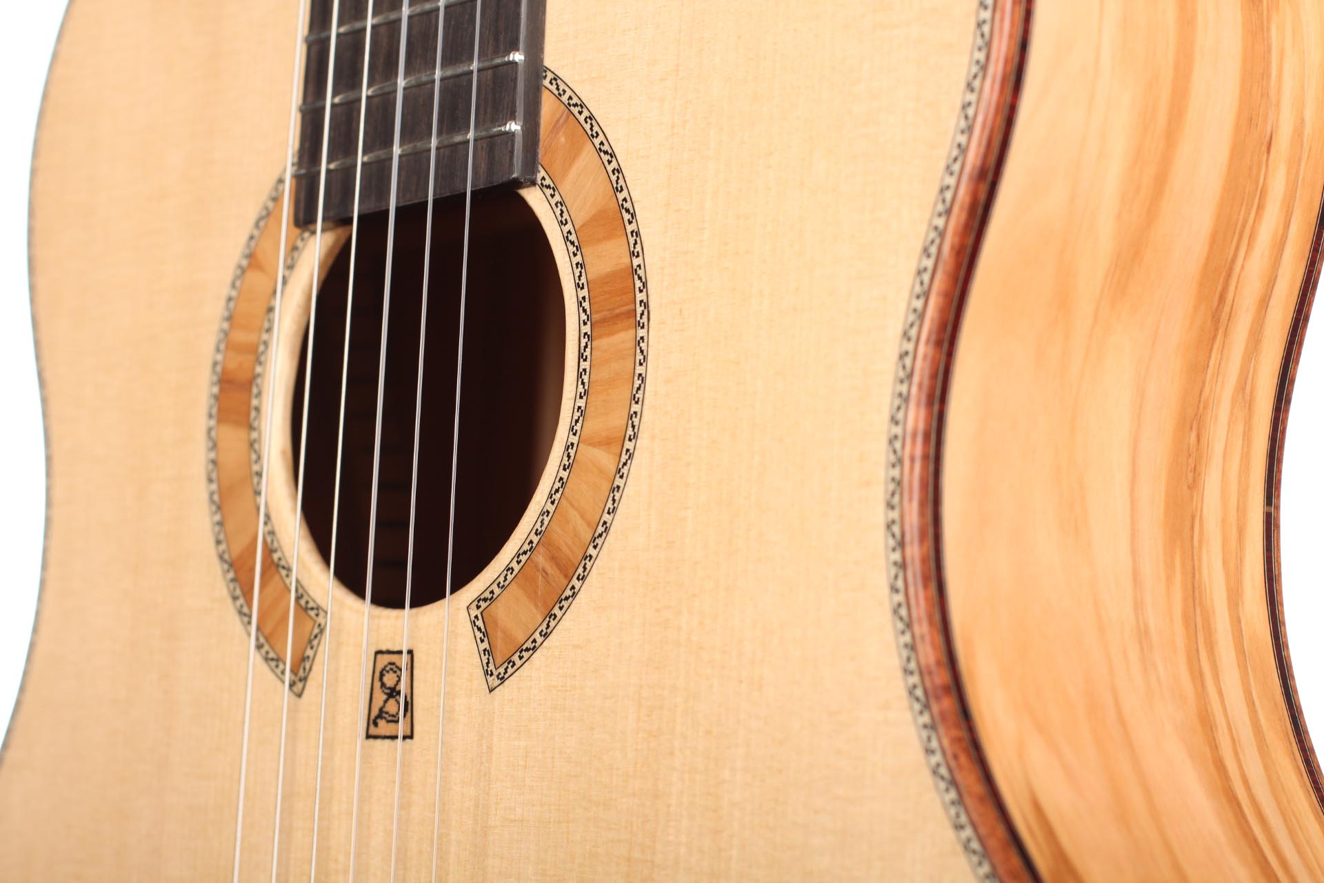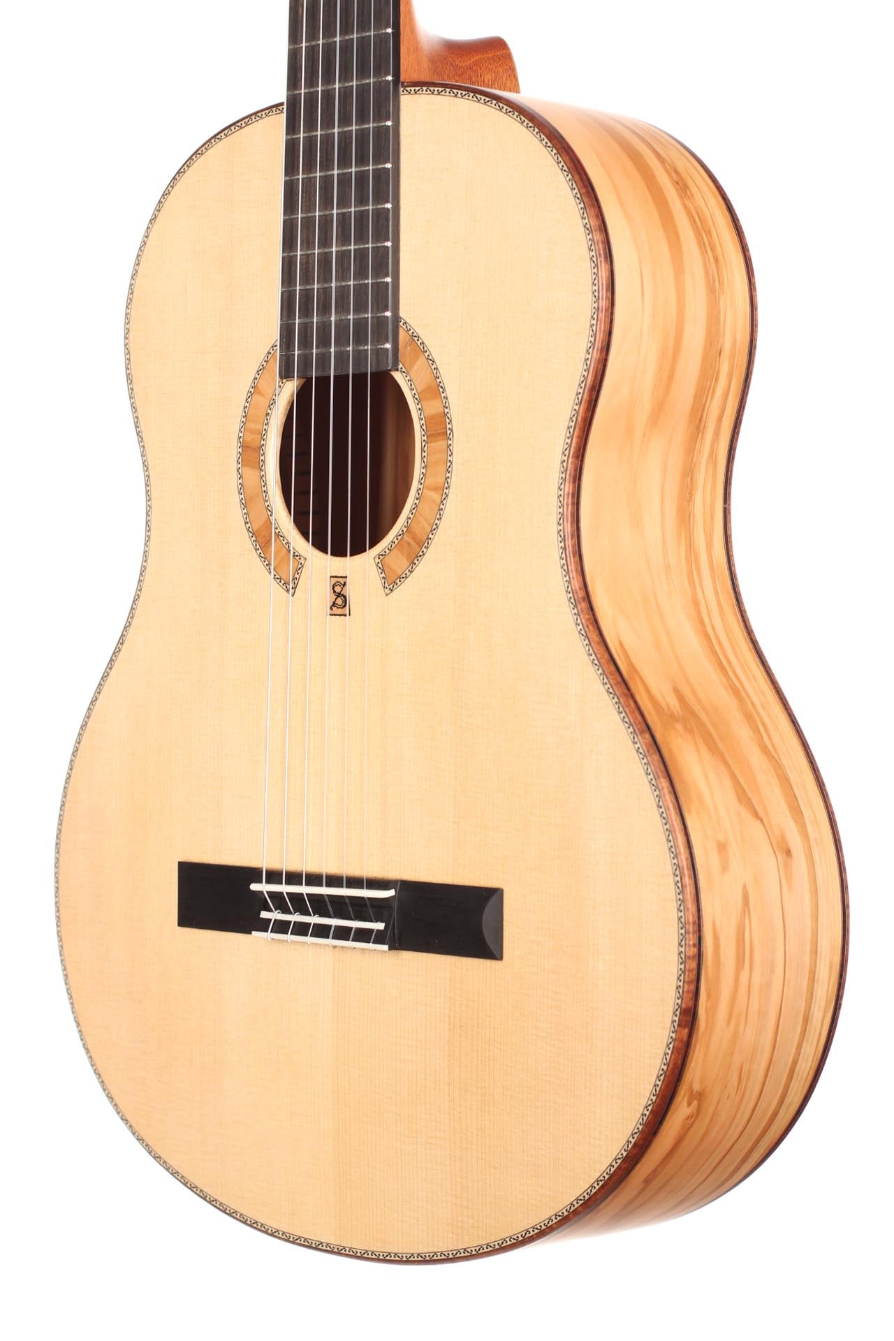 This new guitar, freshly build by Tobias Straßer and just going out from the workshop, is a beautiful example of Tobias‘ style and craftmanship. This unique guitar has exceptional olive-wood back and sides and a fine spruce top. Back and sides have a matt laquer finish while the top is French polished. The result of this ambitious combination is just stunning. The basses are full and warm, and the treble are lively singing. The body air resonance frequency lay between F# and G. It is a striking guitar in appearance and sound, and a great value for money! The tuners are made by Schaller. A Hiscox Pro II case is included.