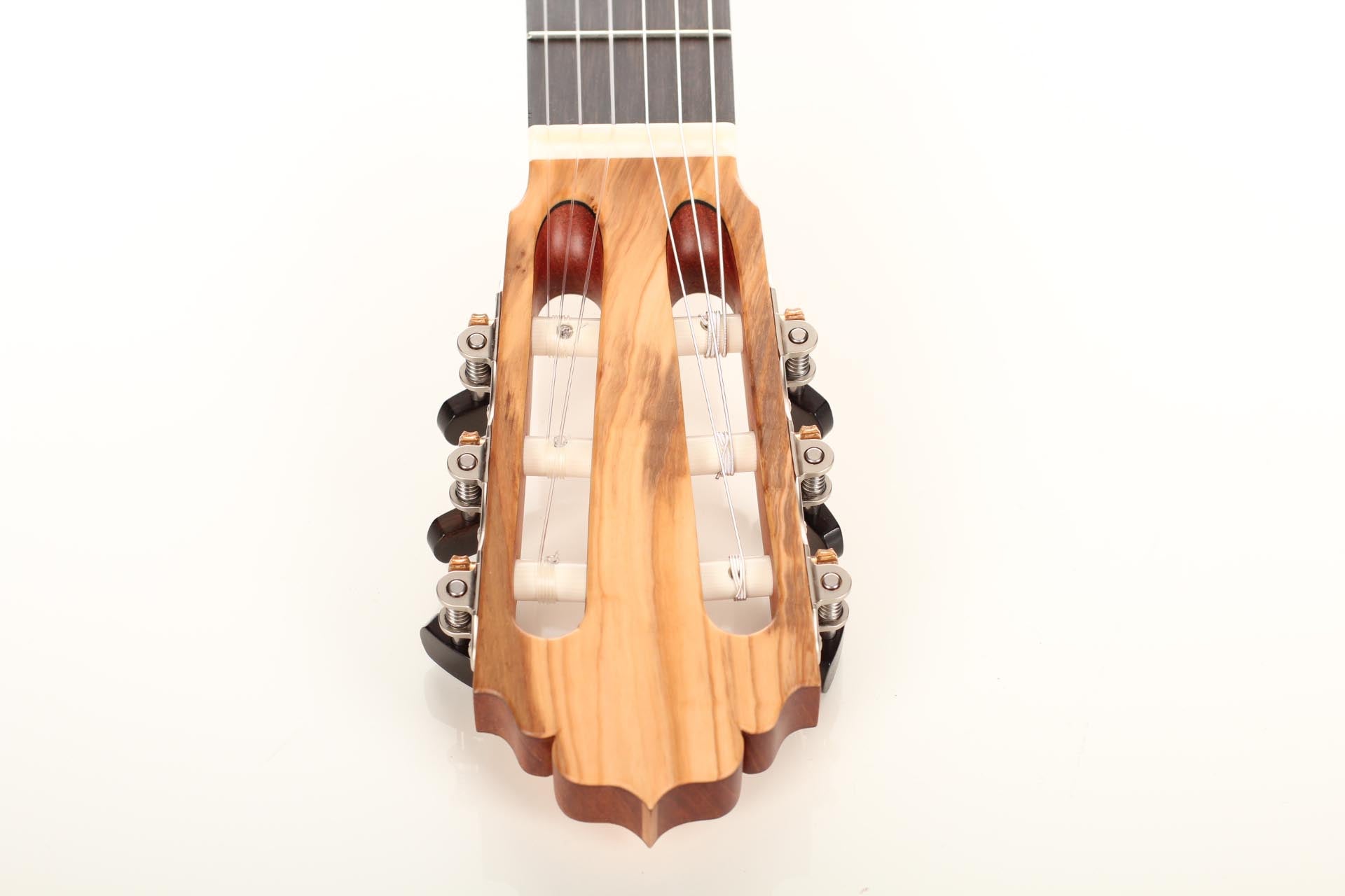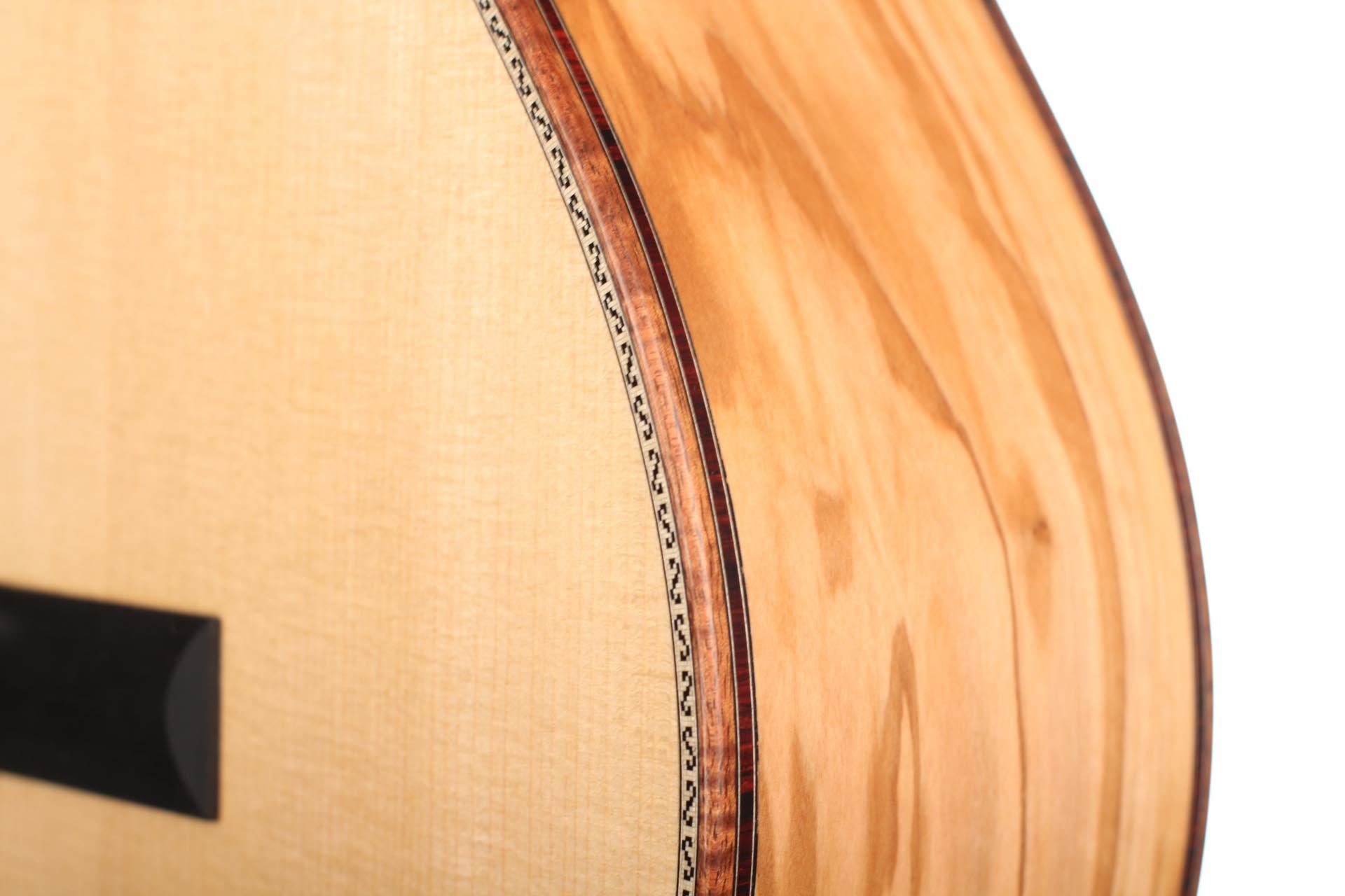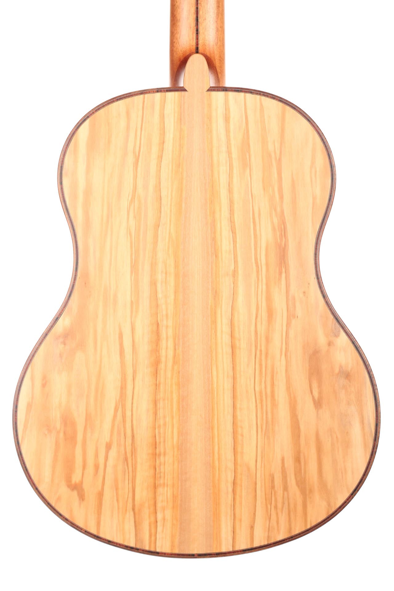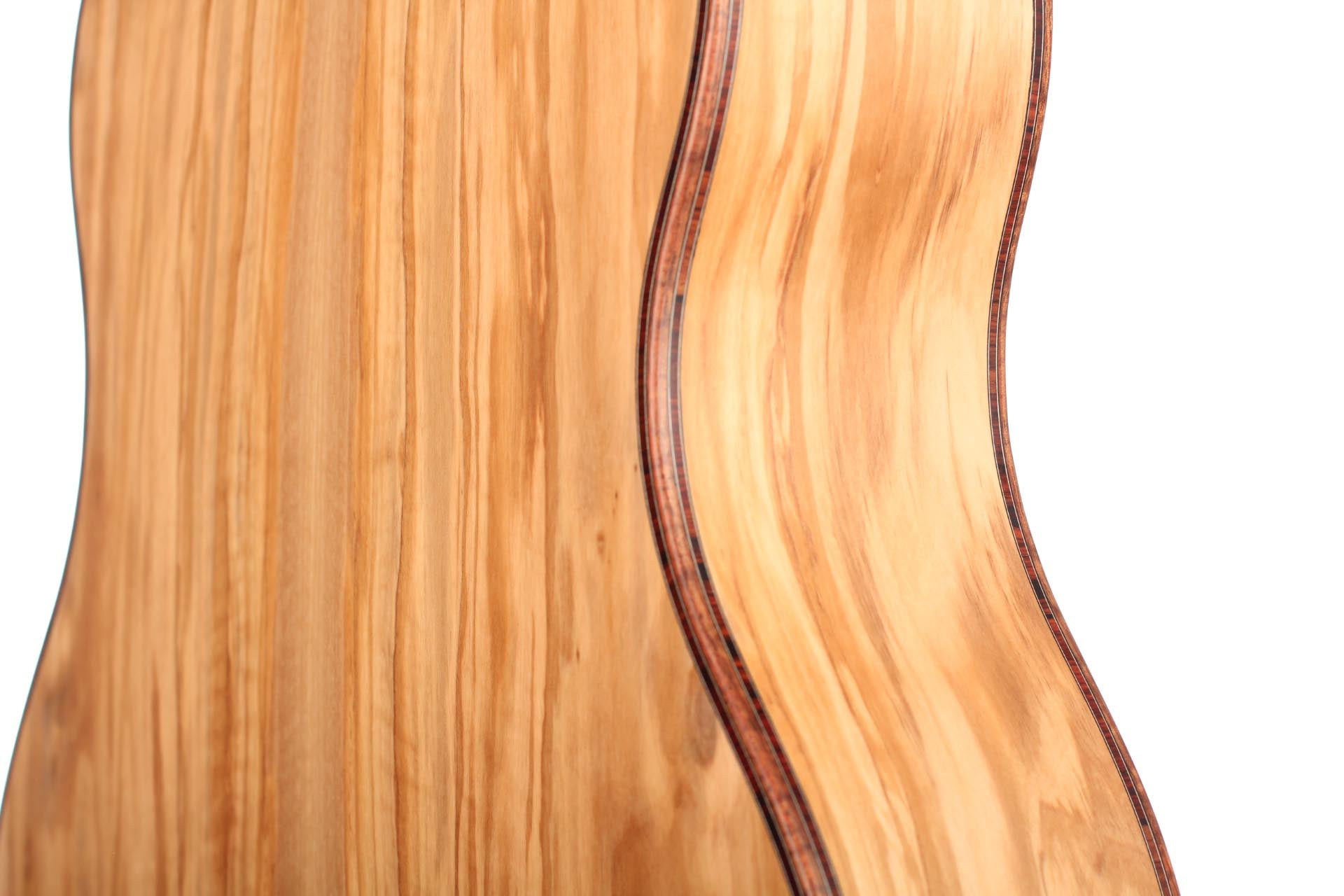 This new guitar, freshly build by Tobias Straßer and just going out from the workshop, is a beautiful example of Tobias‘ style and craftmanship. This unique guitar has exceptional olive-wood back and sides and a fine spruce top. Back and sides have a matt laquer finish while the top is French polished. The result of this ambitious combination is just stunning. The basses are full and warm, and the treble are lively singing. The body air resonance frequency lay between F# and G. It is a striking guitar in appearance and sound, and a great value for money! The tuners are made by Schaller. A Hiscox Pro II case is included.