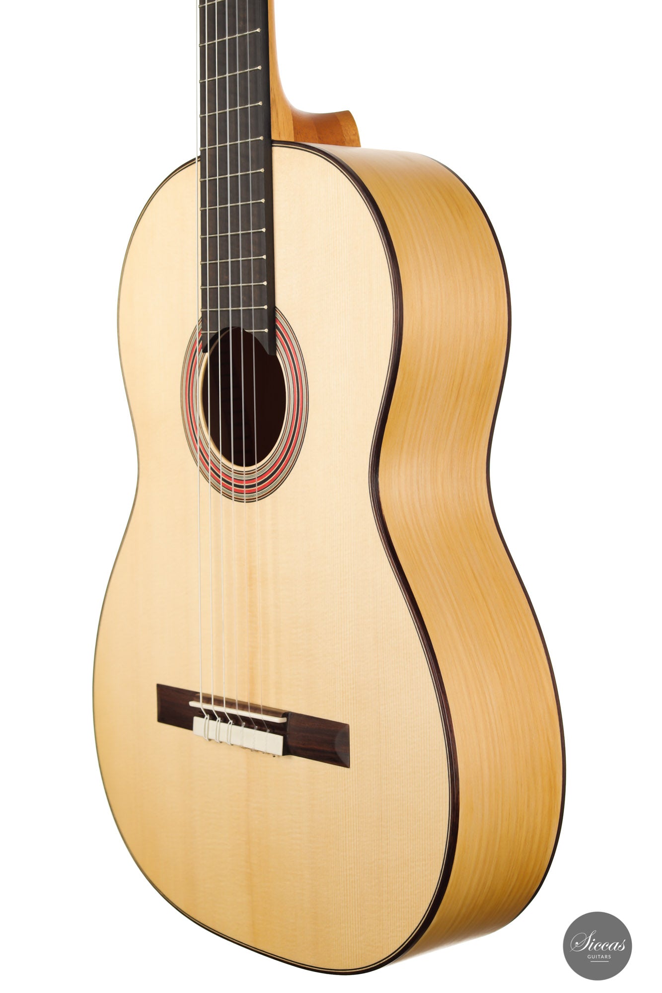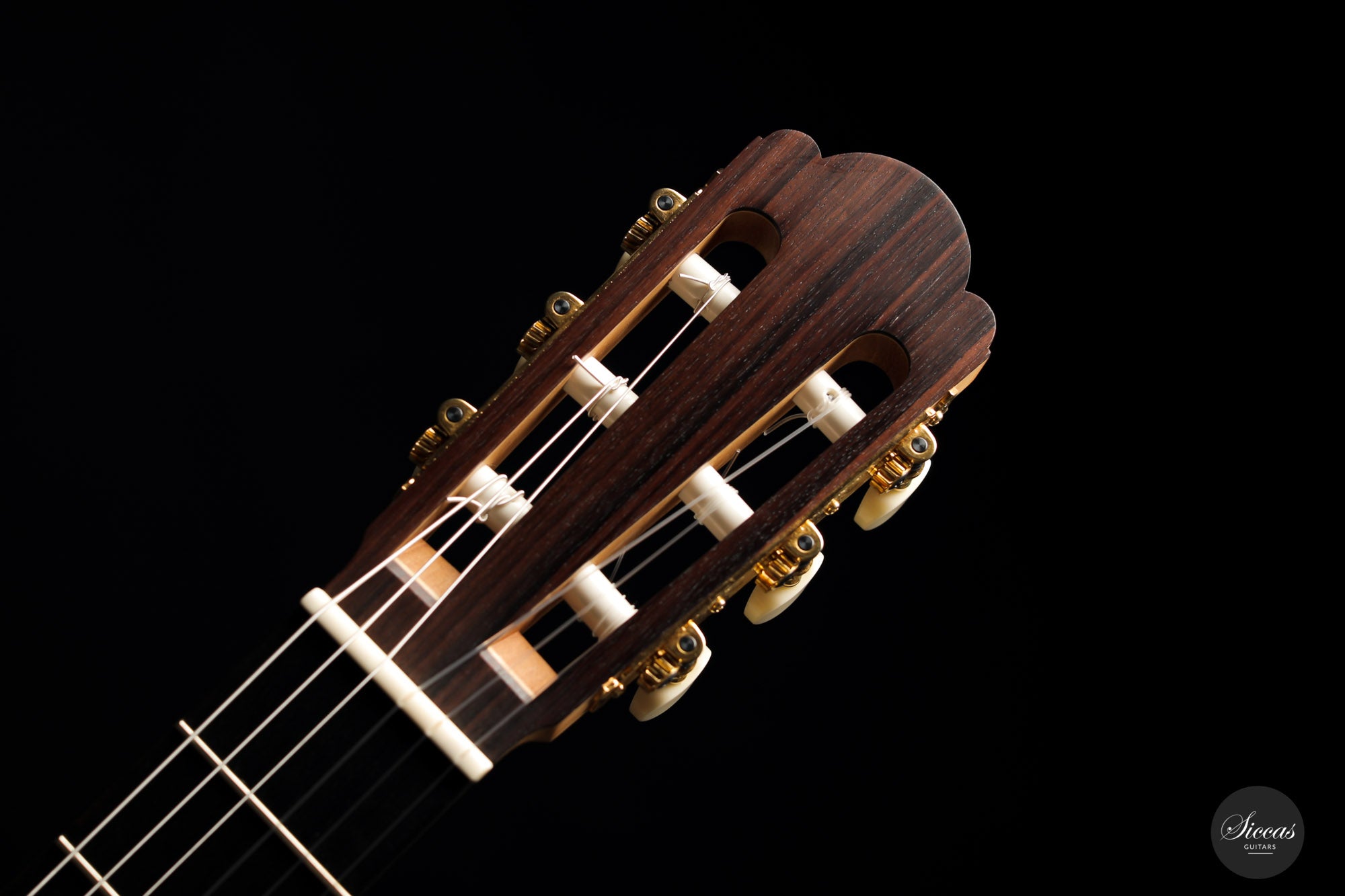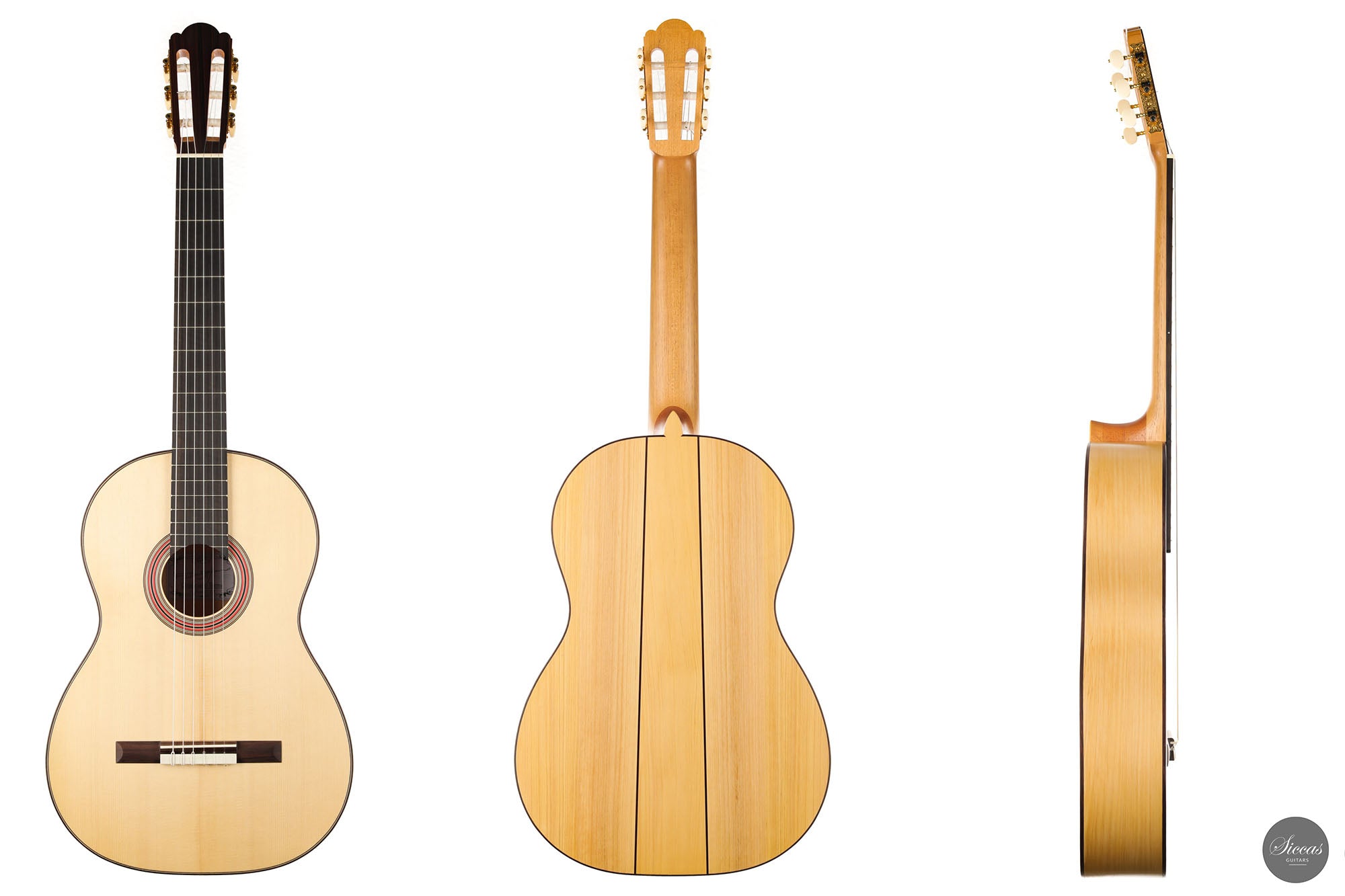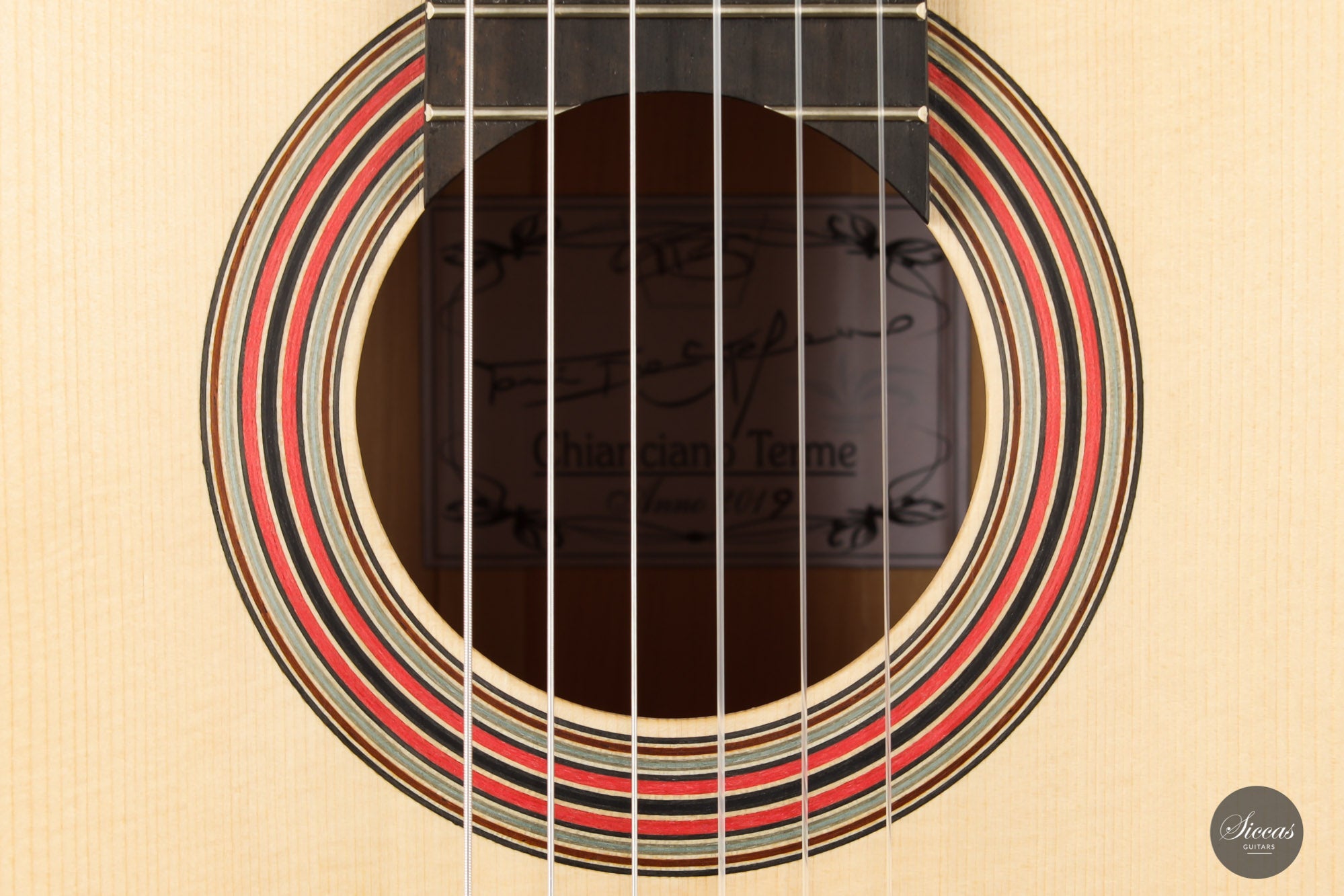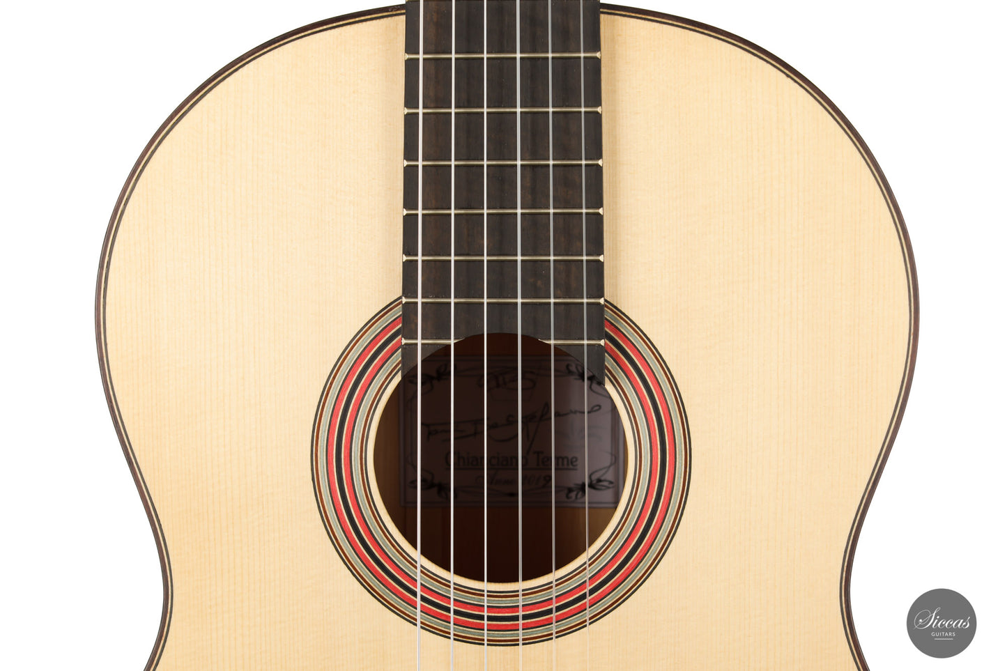 "This guitar combines simplicity and elegance in its purest form. With its floral cypress scent, it is a real nose catcher. In addition, the matte finish creates a direct connection between the guitarist and the instrument. The attractive Torres design, colorful rosette, and featherweight construction make this guitar exceedingly lovely. The construction of this guitar was completed by Toni De Stefano in 2019. Since then, this instrument has been in his workshop as a reference guitar and is therefore new with only a few fine, superficial playing marks.