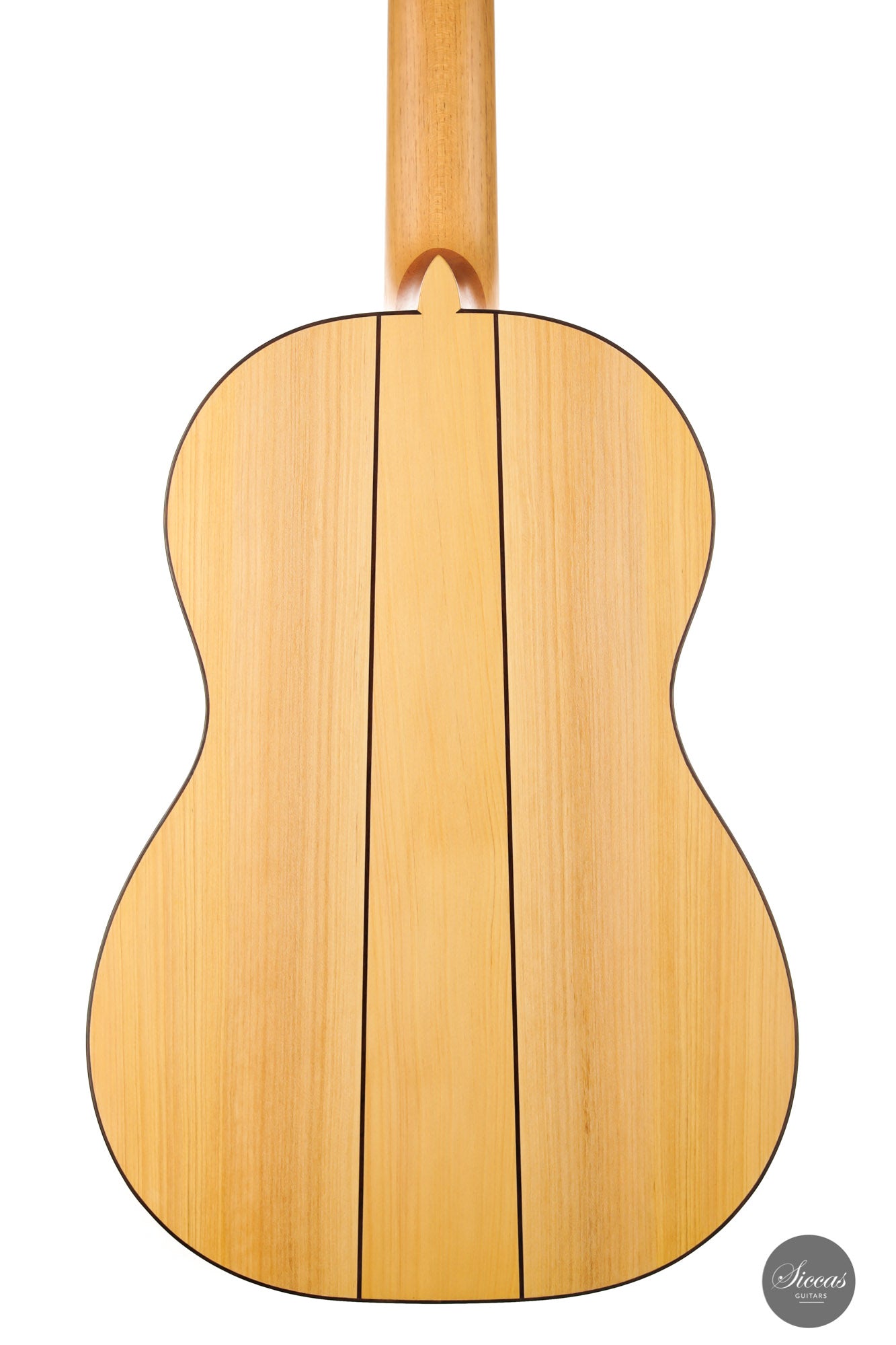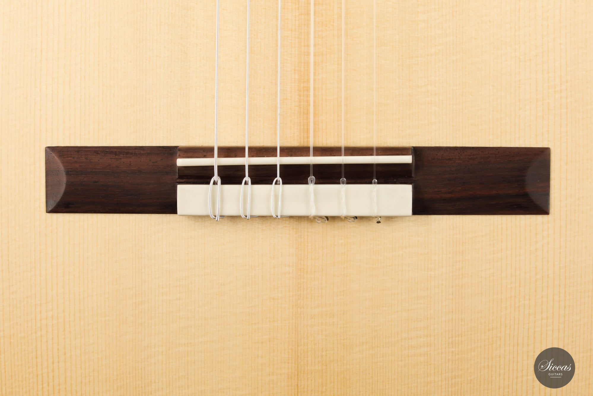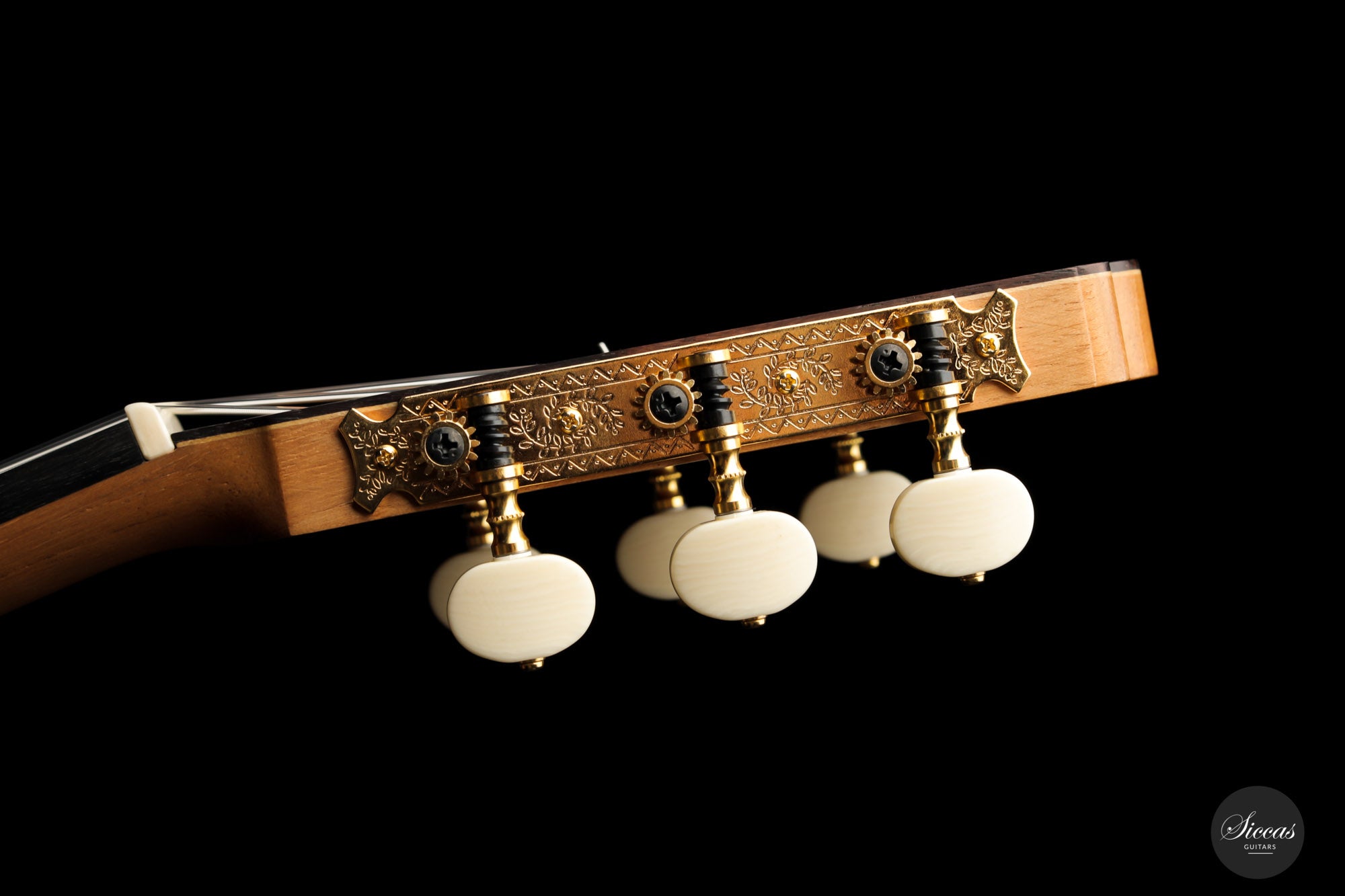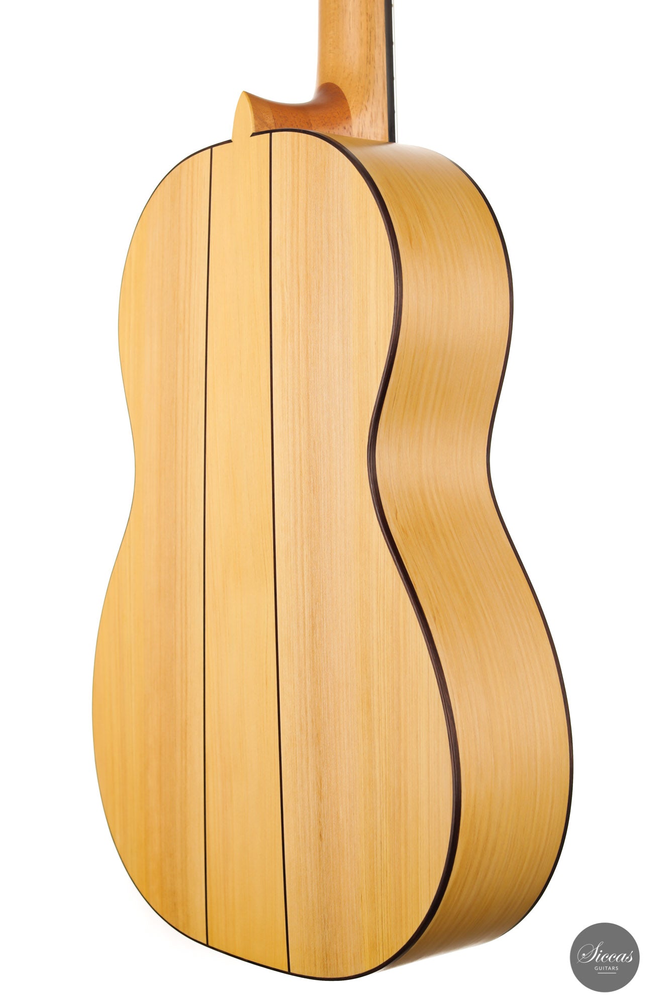 "This guitar combines simplicity and elegance in its purest form. With its floral cypress scent, it is a real nose catcher. In addition, the matte finish creates a direct connection between the guitarist and the instrument. The attractive Torres design, colorful rosette, and featherweight construction make this guitar exceedingly lovely. The construction of this guitar was completed by Toni De Stefano in 2019. Since then, this instrument has been in his workshop as a reference guitar and is therefore new with only a few fine, superficial playing marks.