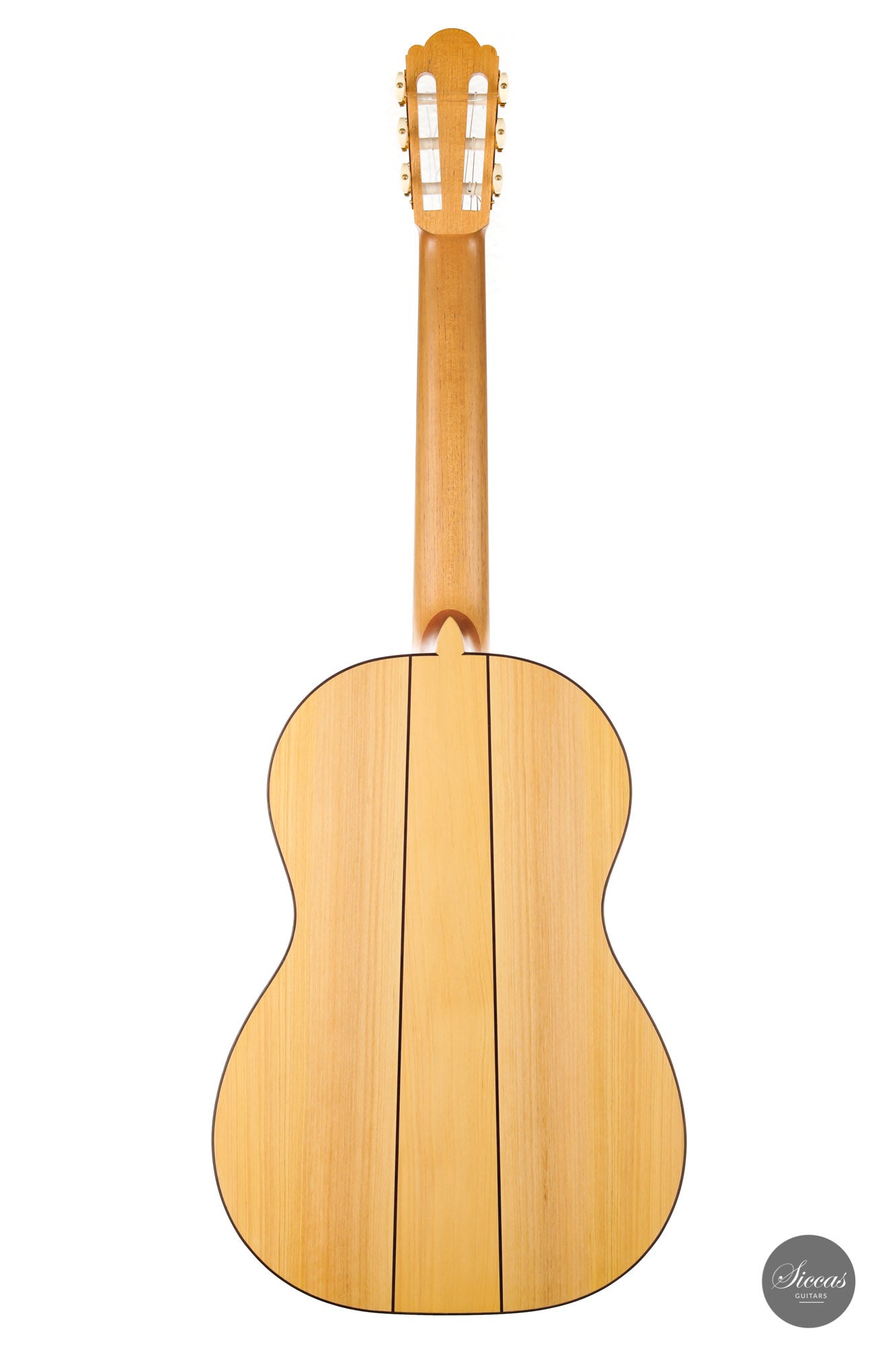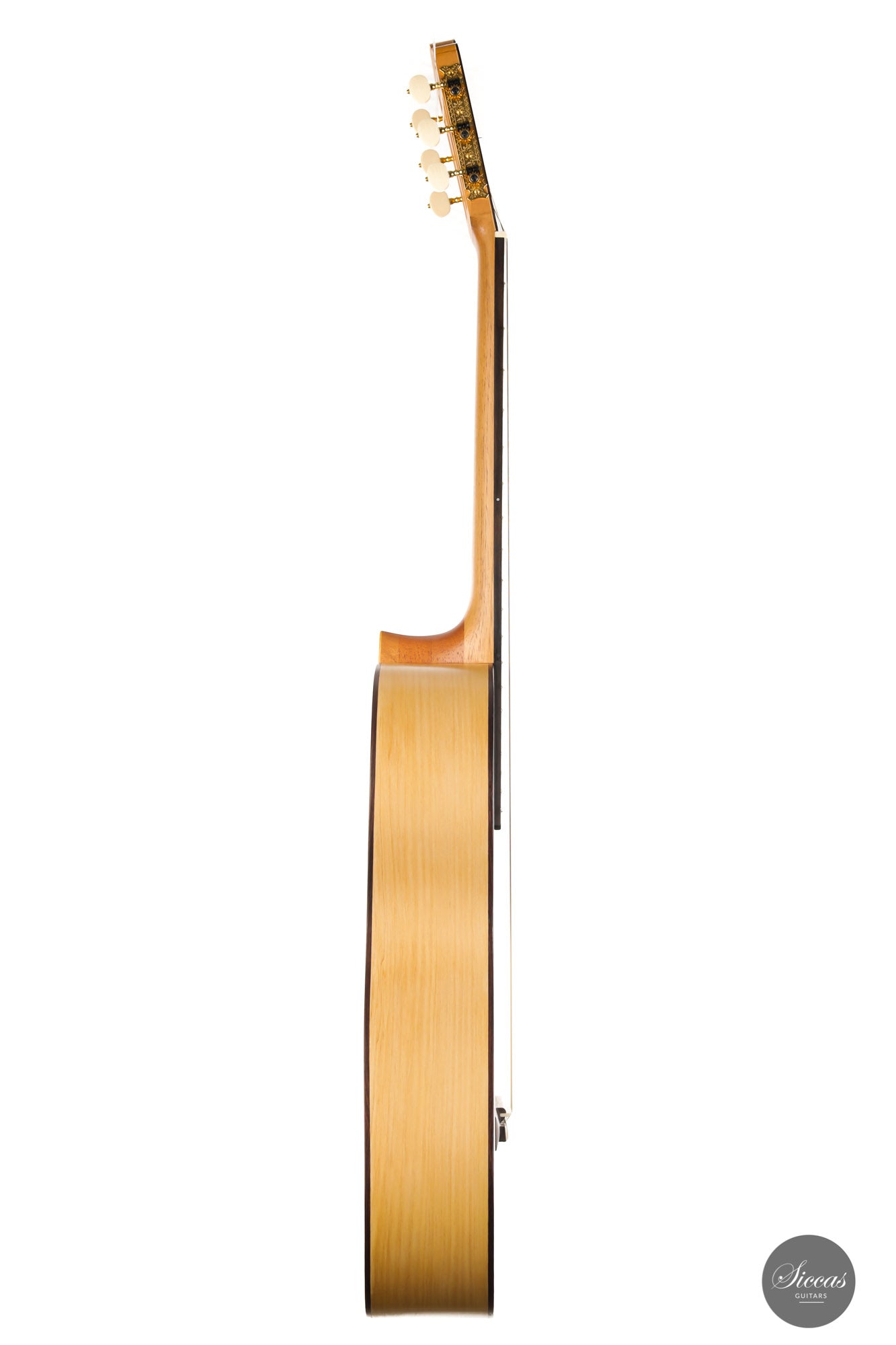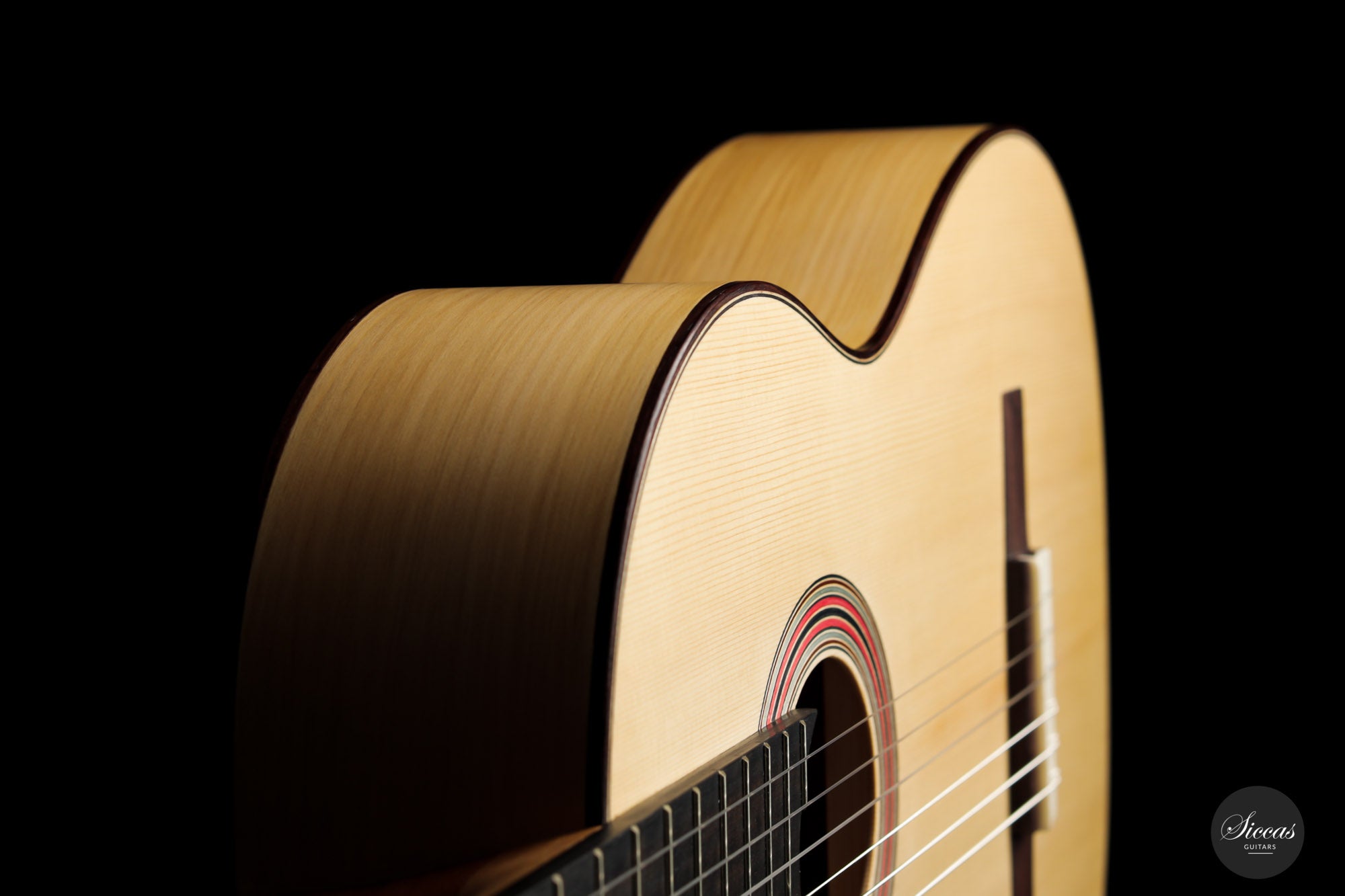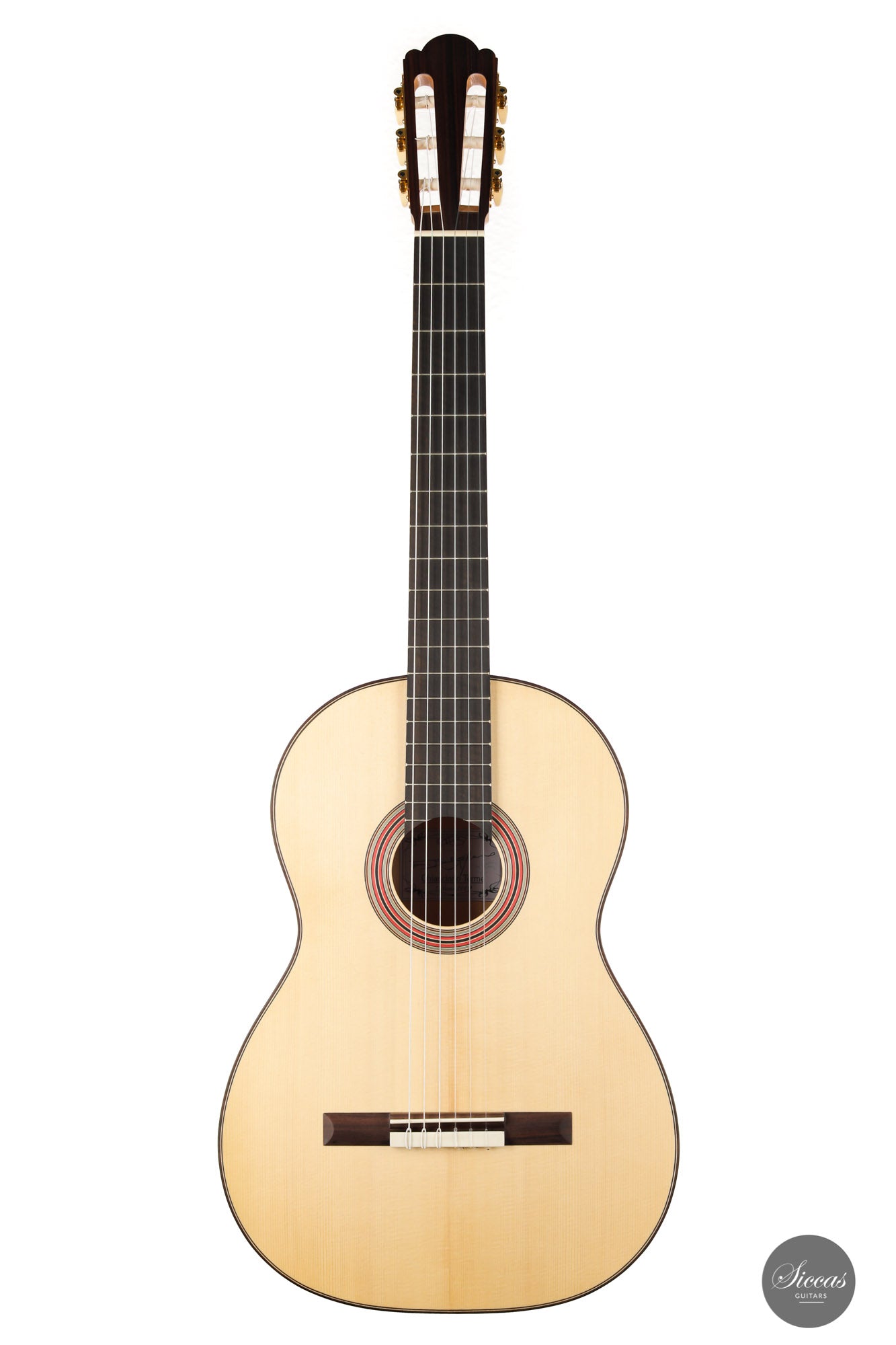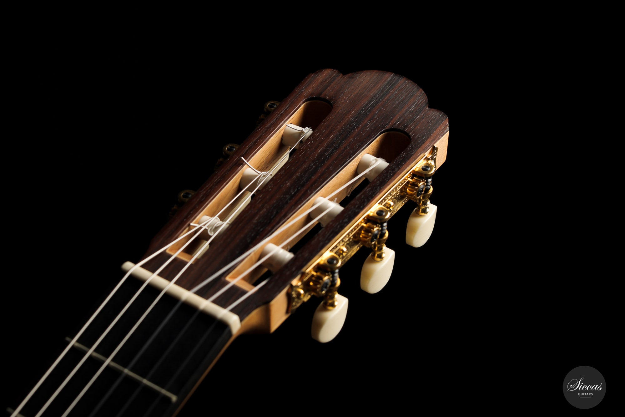 "This guitar combines simplicity and elegance in its purest form. With its floral cypress scent, it is a real nose catcher. In addition, the matte finish creates a direct connection between the guitarist and the instrument. The attractive Torres design, colorful rosette, and featherweight construction make this guitar exceedingly lovely. The construction of this guitar was completed by Toni De Stefano in 2019. Since then, this instrument has been in his workshop as a reference guitar and is therefore new with only a few fine, superficial playing marks.