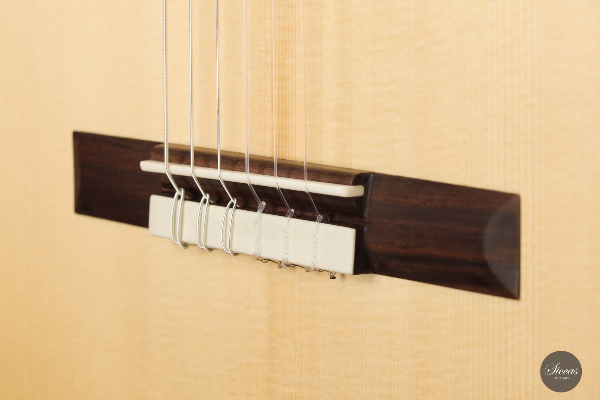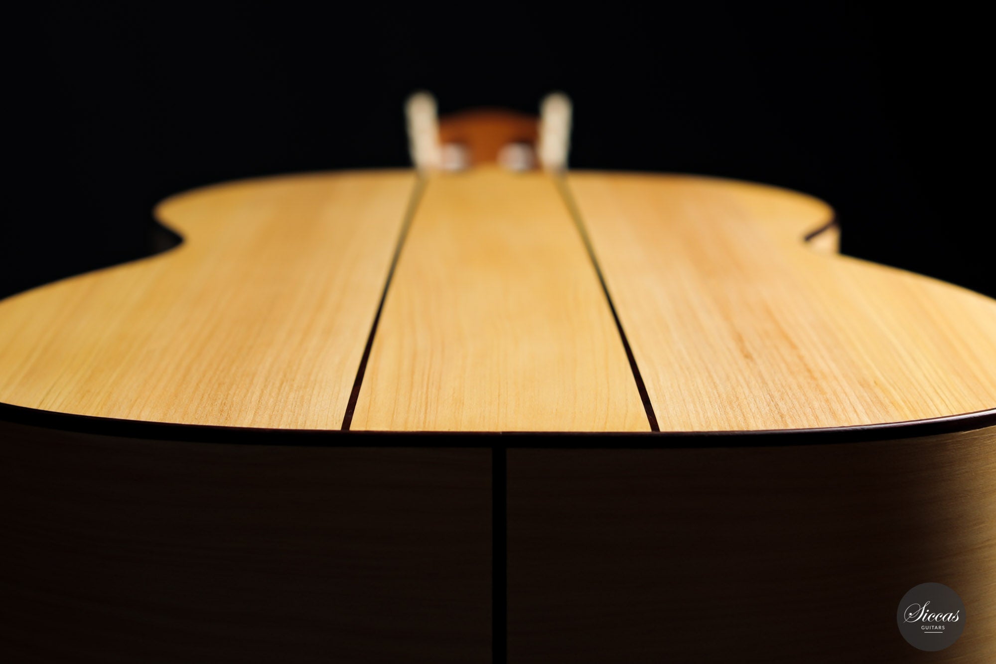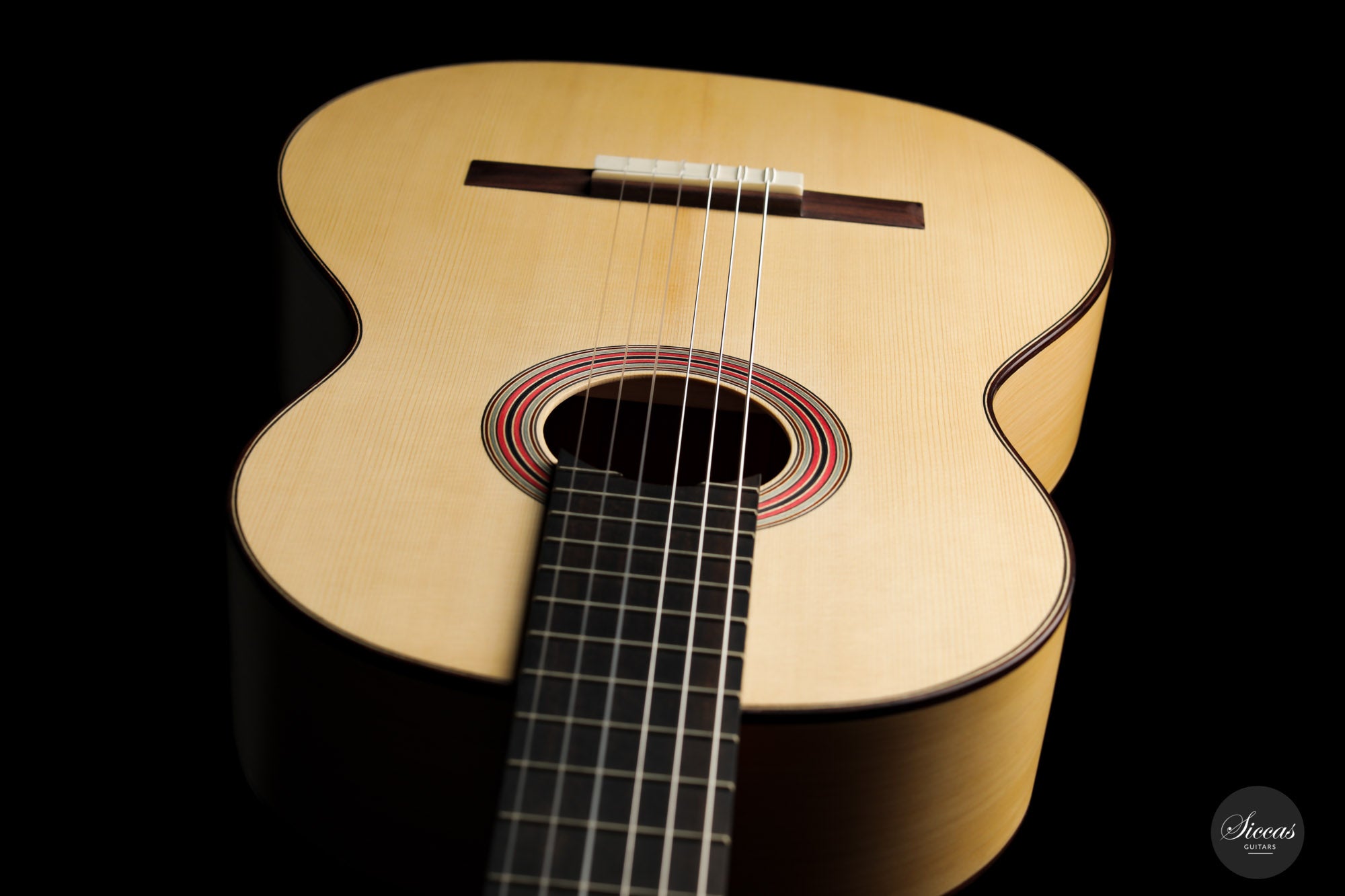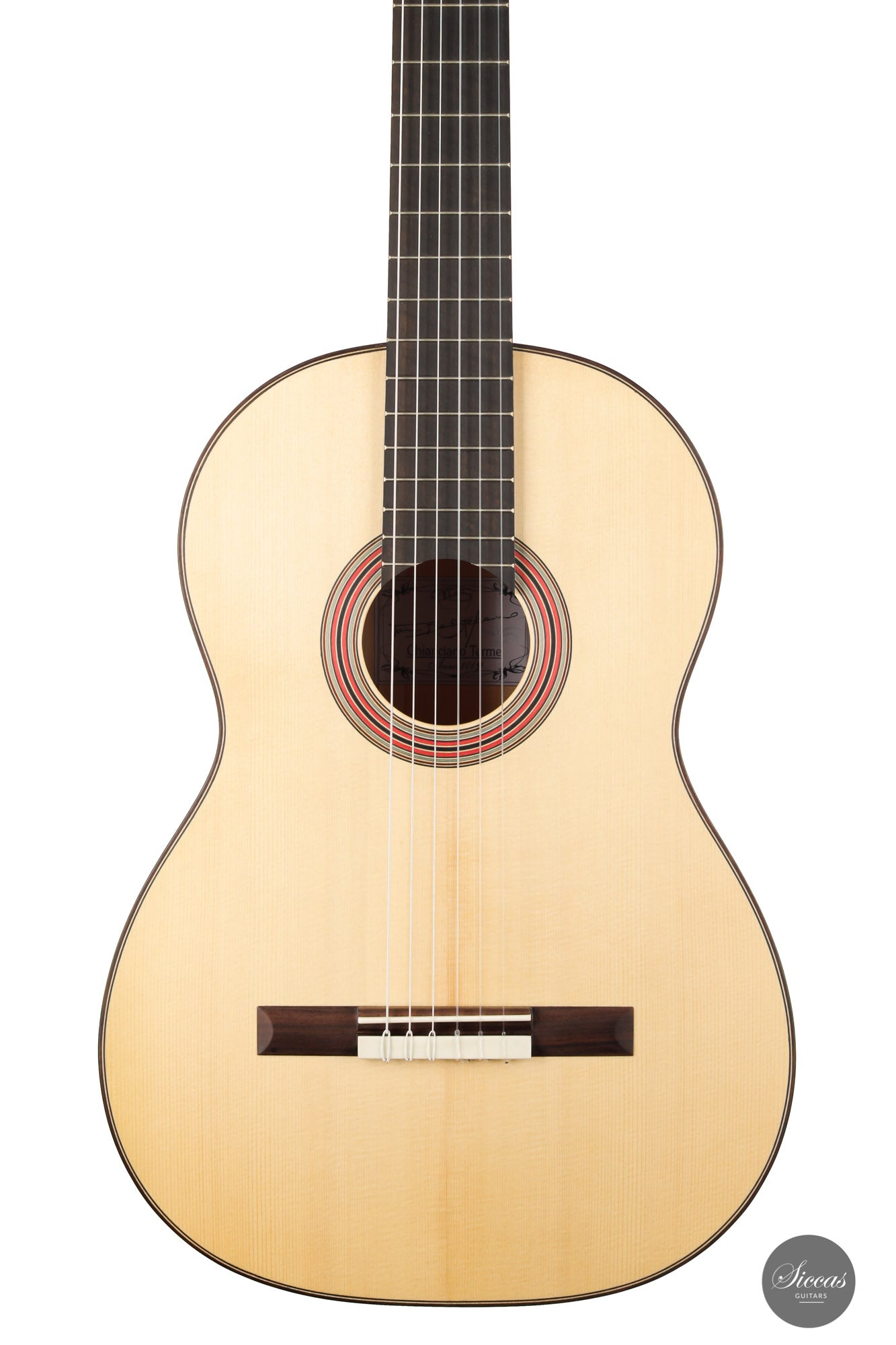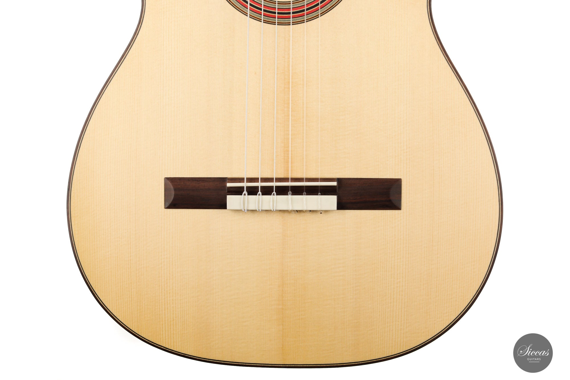 "This guitar combines simplicity and elegance in its purest form. With its floral cypress scent, it is a real nose catcher. In addition, the matte finish creates a direct connection between the guitarist and the instrument. The attractive Torres design, colorful rosette, and featherweight construction make this guitar exceedingly lovely. The construction of this guitar was completed by Toni De Stefano in 2019. Since then, this instrument has been in his workshop as a reference guitar and is therefore new with only a few fine, superficial playing marks.