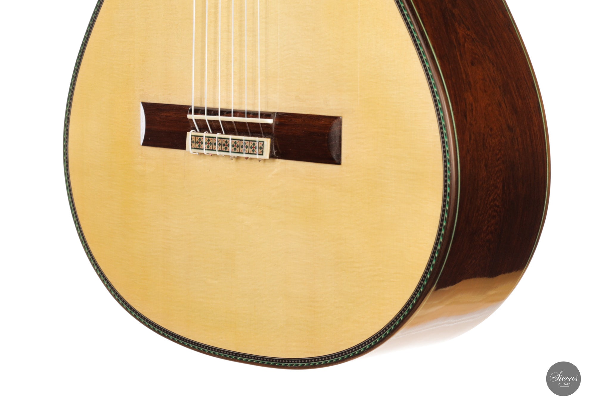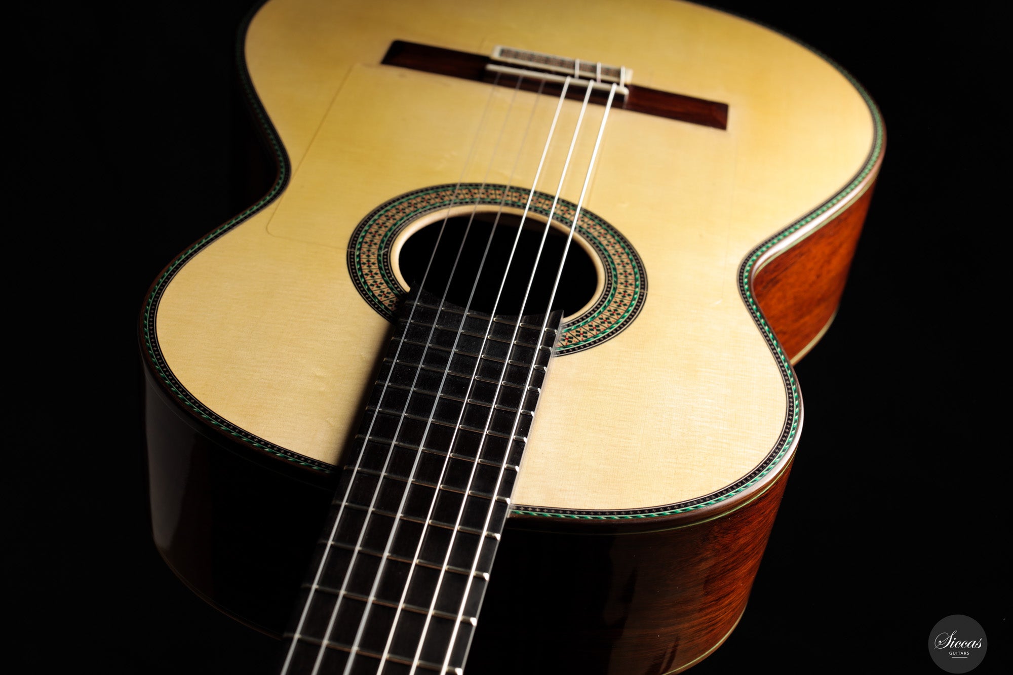 The Maestro N.X. model, developed in collaboration with Gernot Wagner, is a double-top guitar with a Nomex honeycomb core sandwiched between outer spruce layers. The back and sides are made from visually striking Madagascar rosewood. This model is designed to deliver high projection, tonal balance, and a wide dynamic range. With a 640 mm scale, the instrument offers a slightly reduced string length for increased comfort without sacrificing response. The French polish finish ensures acoustic transparency. Notably, the instrument is described as reducing finger noise and mechanical interference, favoring tonal purity. Its tonal character is soft and rounded, with immediate response, making it well suited for fluid, technically intricate repertoire.