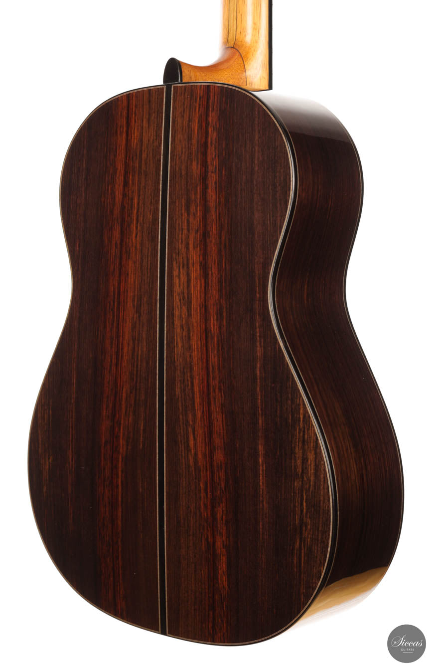 This exceptional instrument is a clear expression of Vincent Engelbrecht’s innovative vision. The standout feature is his proprietary star-woven spruce mesh bracing, combined with a spruce and balsa top. This design not only increases the guitar’s volume but also preserves a richly nuanced tonal palette, making it versatile for both intimate performances and larger concert stages. The top’s carefully controlled tension translates into an effortless right-hand response, allowing for refined dynamics and expressive playing with ease. The instrument’s dynamic range and balance are truly remarkable, with singing trebles and a robust, articulate bass response. It’s no surprise that acclaimed guitarist Cassie Martin performs with a Vincent Engelbrecht guitar. This guitar offers both technical ease and musical inspiration, meeting the highest expectations of demanding players.