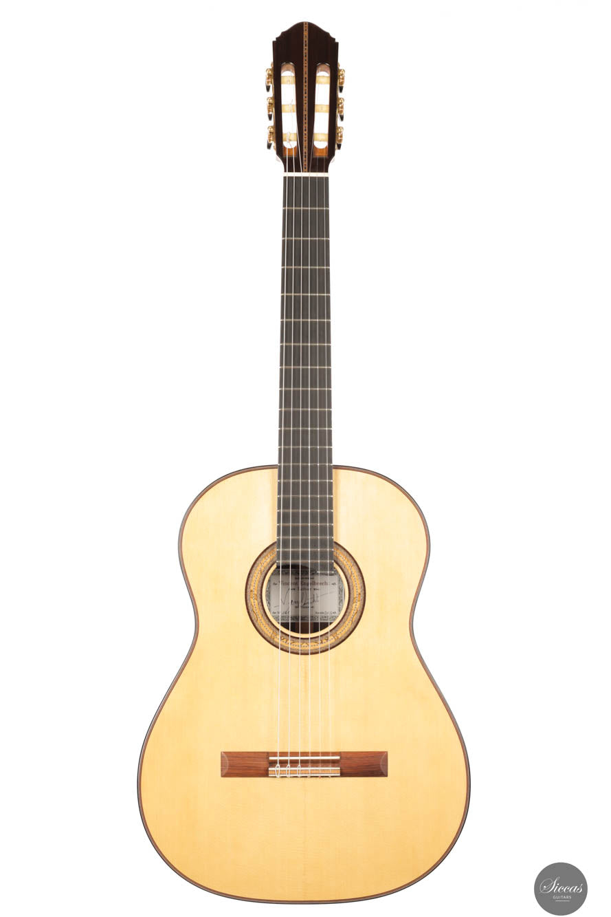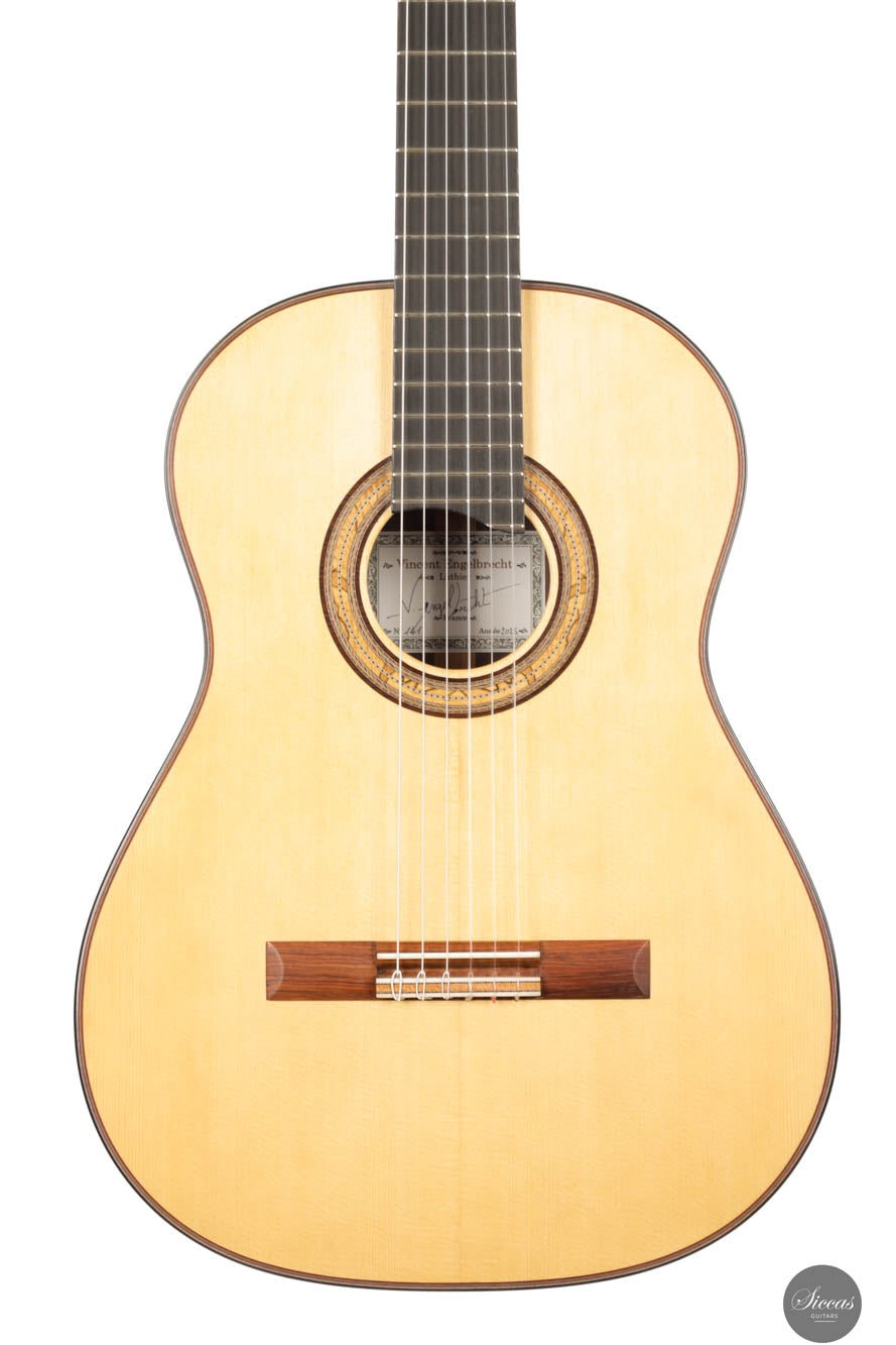 Vincent Engelbrecht is a distinguished classical guitar maker based in Forcalquier, Provence, France. His journey began in 1997 at the age of 17, when he apprenticed under the renowned luthier Christopher Schuetz for three years. Following his apprenticeship, Vincent deepened his understanding of sound by working as a sound engineer and acoustician for six years. In 2006, he returned fully to guitar making, applying his acoustic expertise to develop a unique bracing system. This innovative design features a star-woven spruce mesh integrated into a spruce and balsa top, dramatically enhancing both tonal depth and responsiveness.