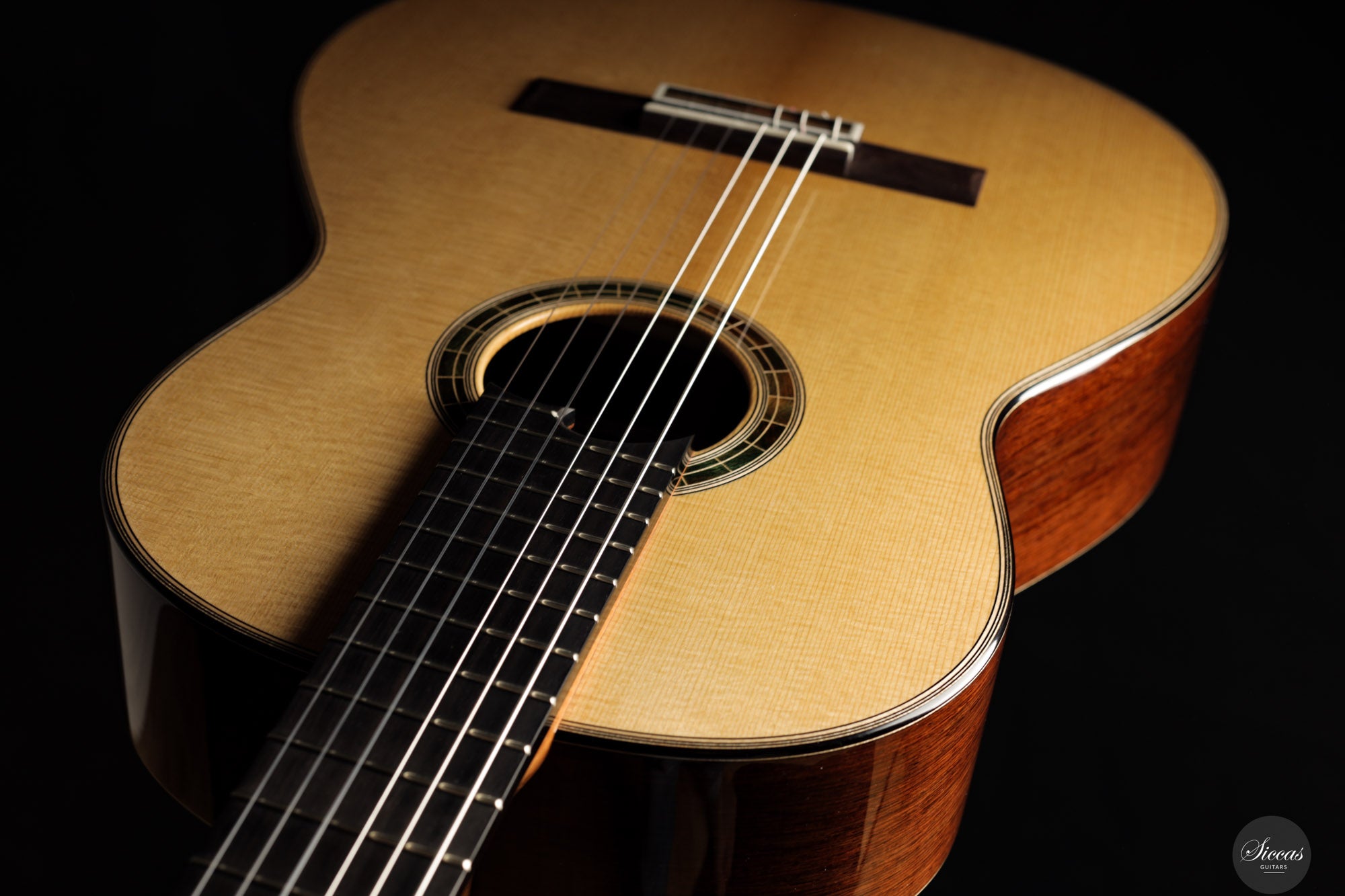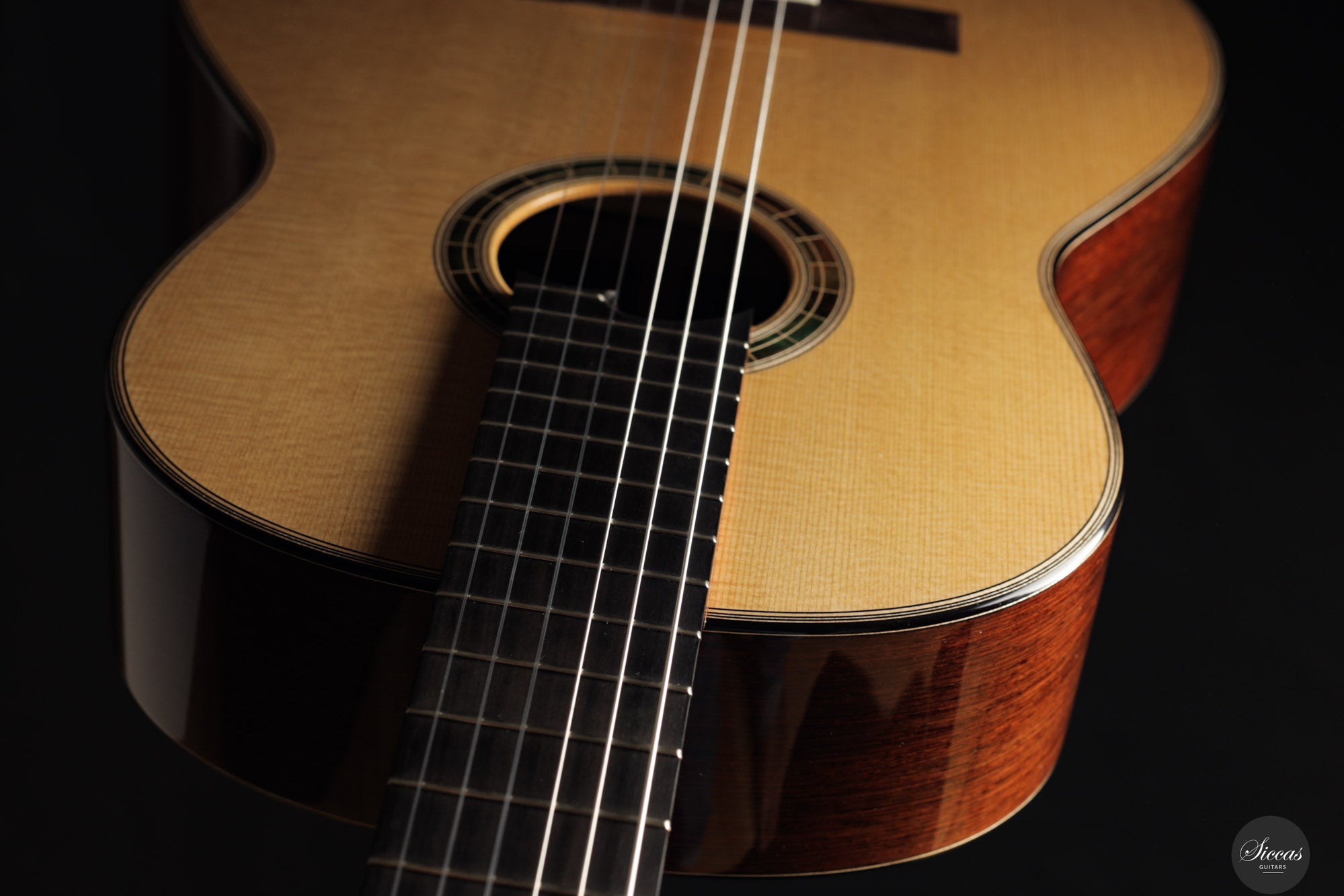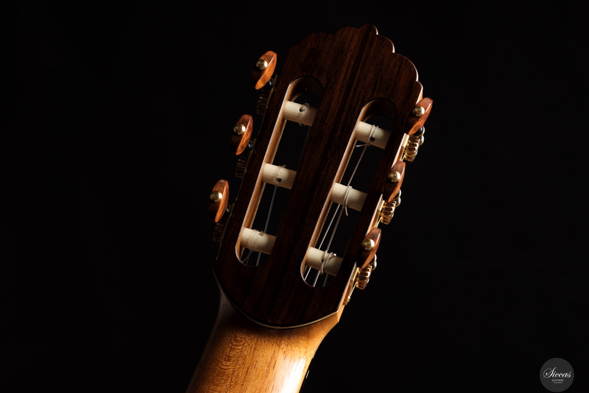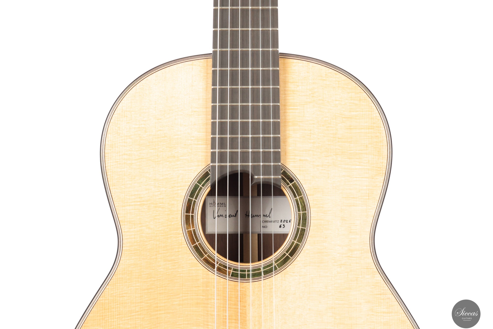 This guitar, completed in 2025 and numbered 63, is a doubletop instrument with a spruce top and Madagascar rosewood back and sides, finished with French polish. At 1675 grams it retains a moderate weight while offering the projection and dynamic range characteristic of Humml’s doubletop design. The scale length of 640 mm, paired with a 52 mm nut, makes the guitar especially comfortable for players seeking shorter scale ergonomics without sacrificing string spacing. The tonal response is highly balanced: the trebles are smooth and round with clarity and sustain, the basses are powerful and forward, and the midrange is full, ensuring evenness across the registers. The guitar has excellent sensitivity and responds readily to subtle variations of attack, providing both a wide dynamic range and precise tonal color. The shorter scale enhances comfort and reduces left-hand fatigue, making it particularly suitable for long playing sessions while maintaining projection suited for the concert stage. With its carefully voiced spruce doubletop, premium Madagascar rosewood body, and refined playability, this guitar reflects Humml’s modern approach to lutherie while preserving the tonal depth that concert players value. It is fitted with Klaus Scheller tuners and supplied in a Hiscox Pro II case.Regular care extends the life of the instrument