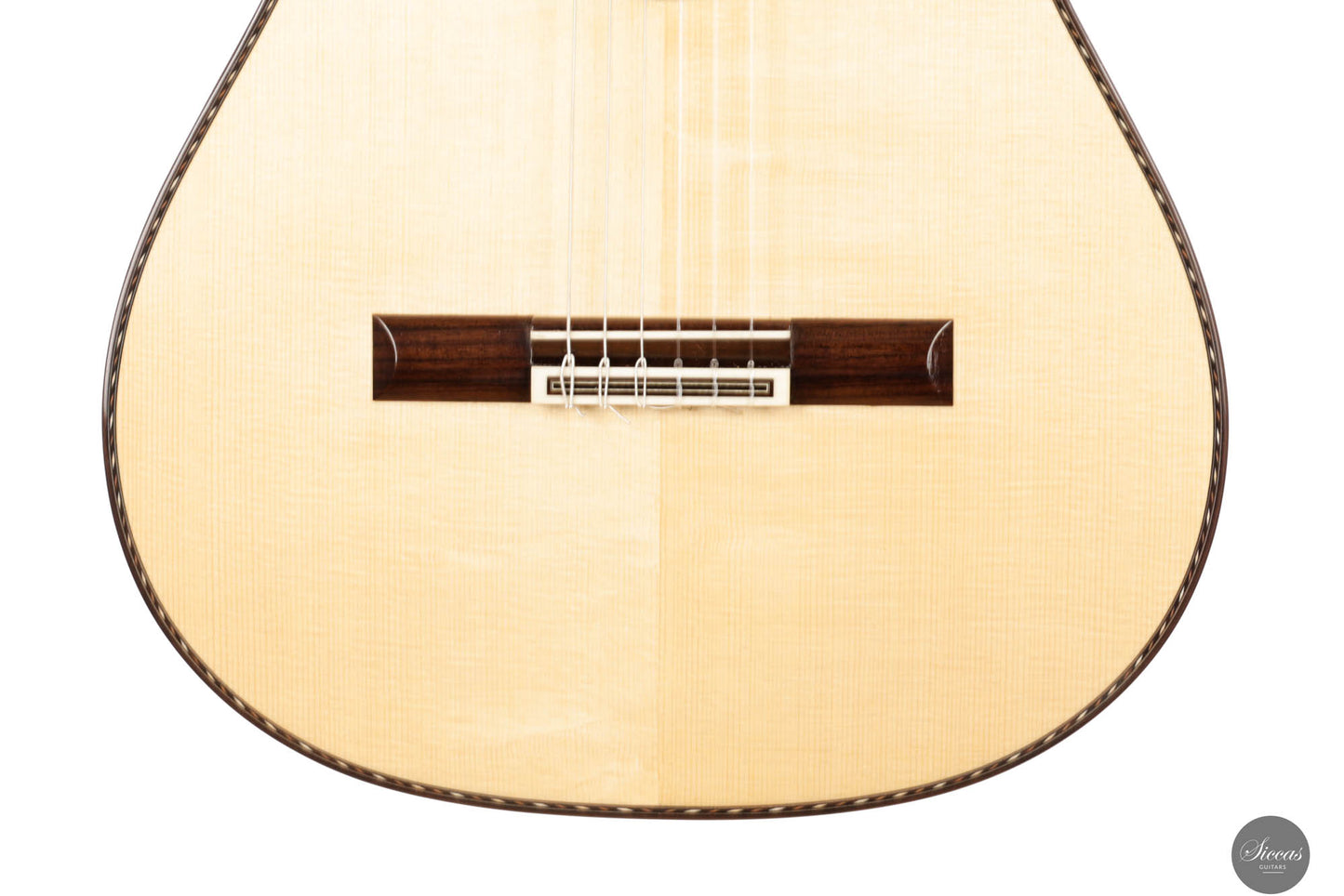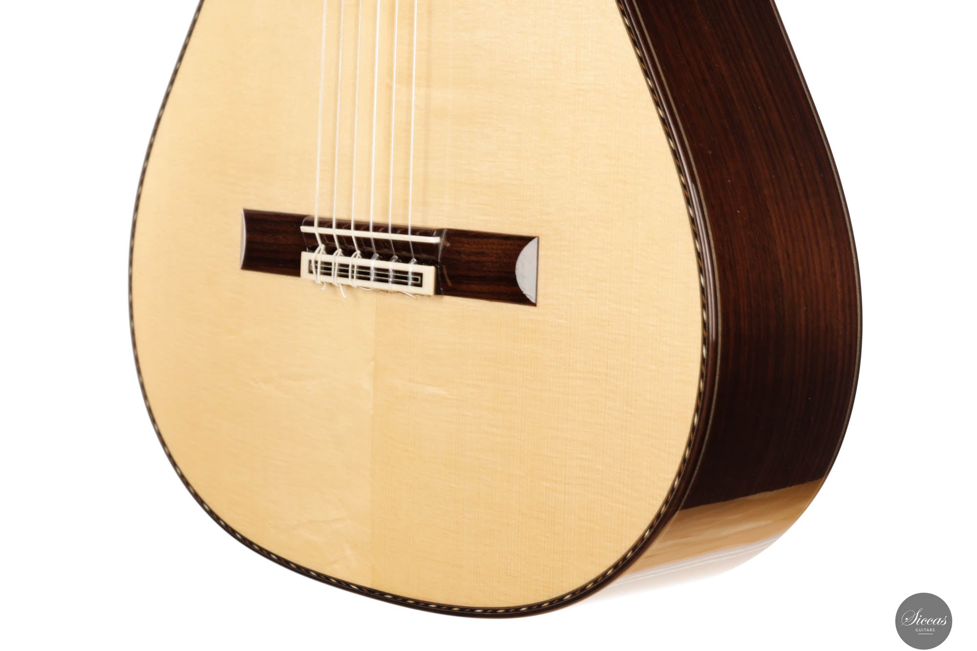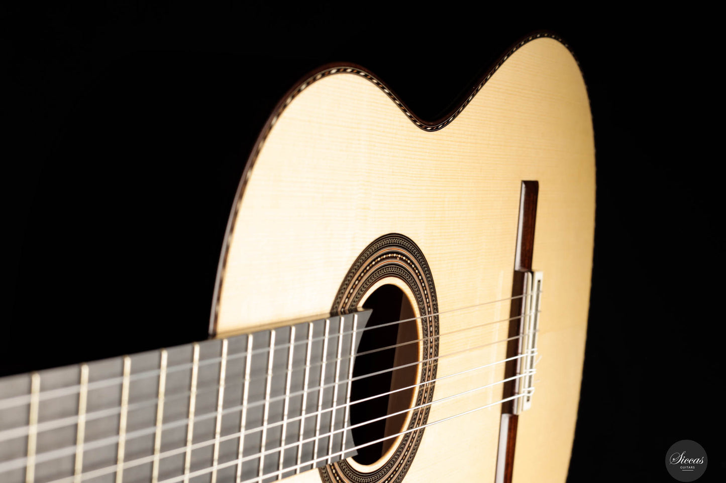 This Walter Verreydt guitar, with its lattice bracing, stands as a grandiose achievement in the realm of concert instruments, exuding sophistication and completeness in every aspect. The guitar's exceptional sonority and response set it apart, but it's the breadth of tonal colors that truly captivates and inspires. Each note played on this guitar resonates with a unique vibrancy, offering a spectrum of sound that is both vast and nuanced. The first E-string, in particular, is remarkable for its liveliness and freedom, allowing it to express its singing voice with impressive ease. This quality makes the guitar not only a joy to play but also a versatile instrument, capable of handling a wide range of musical styles and expressions with finesse. It should also be emphasized that the sides of this guitar are reinforced with a double layer of cypress, enhancing its structural integrity and significantly boosting its sound projection.